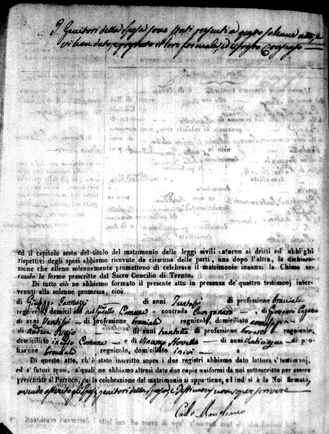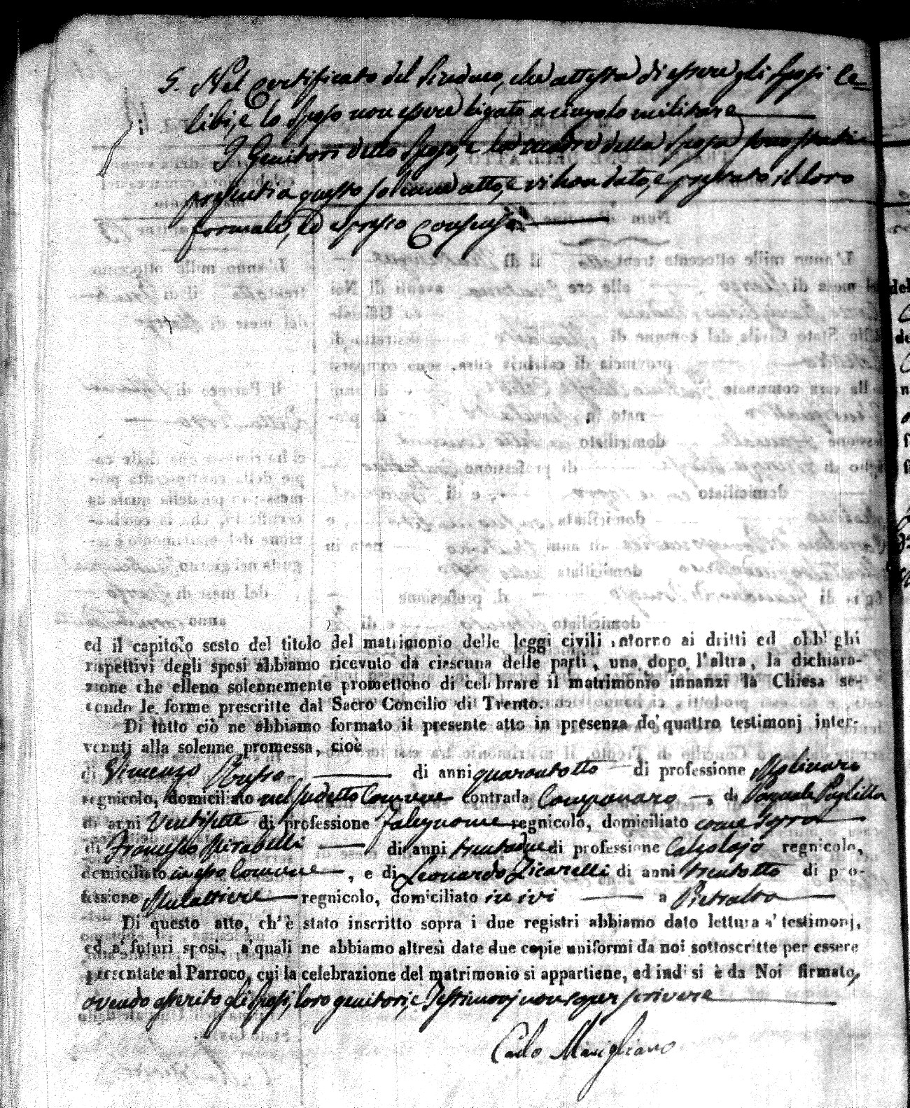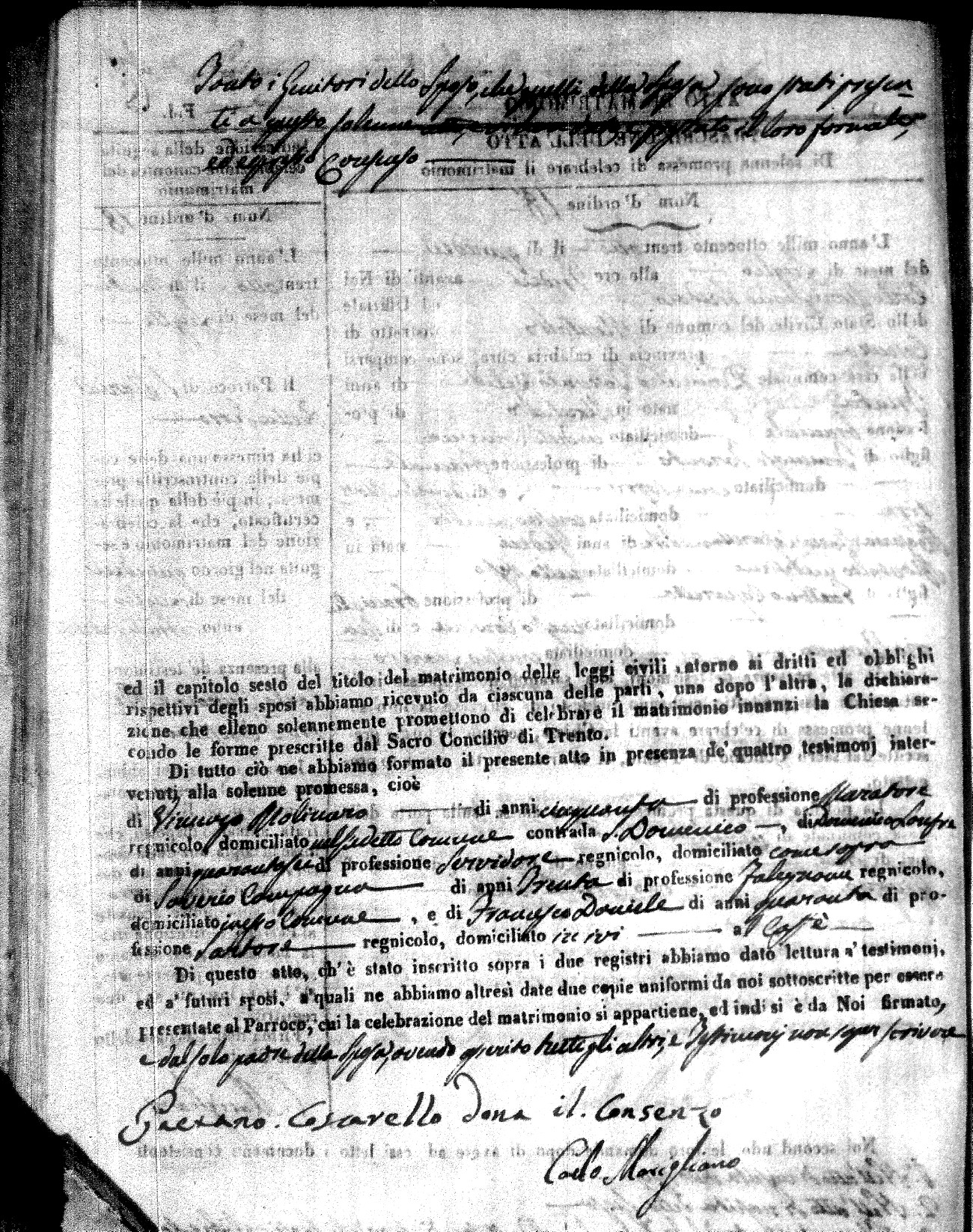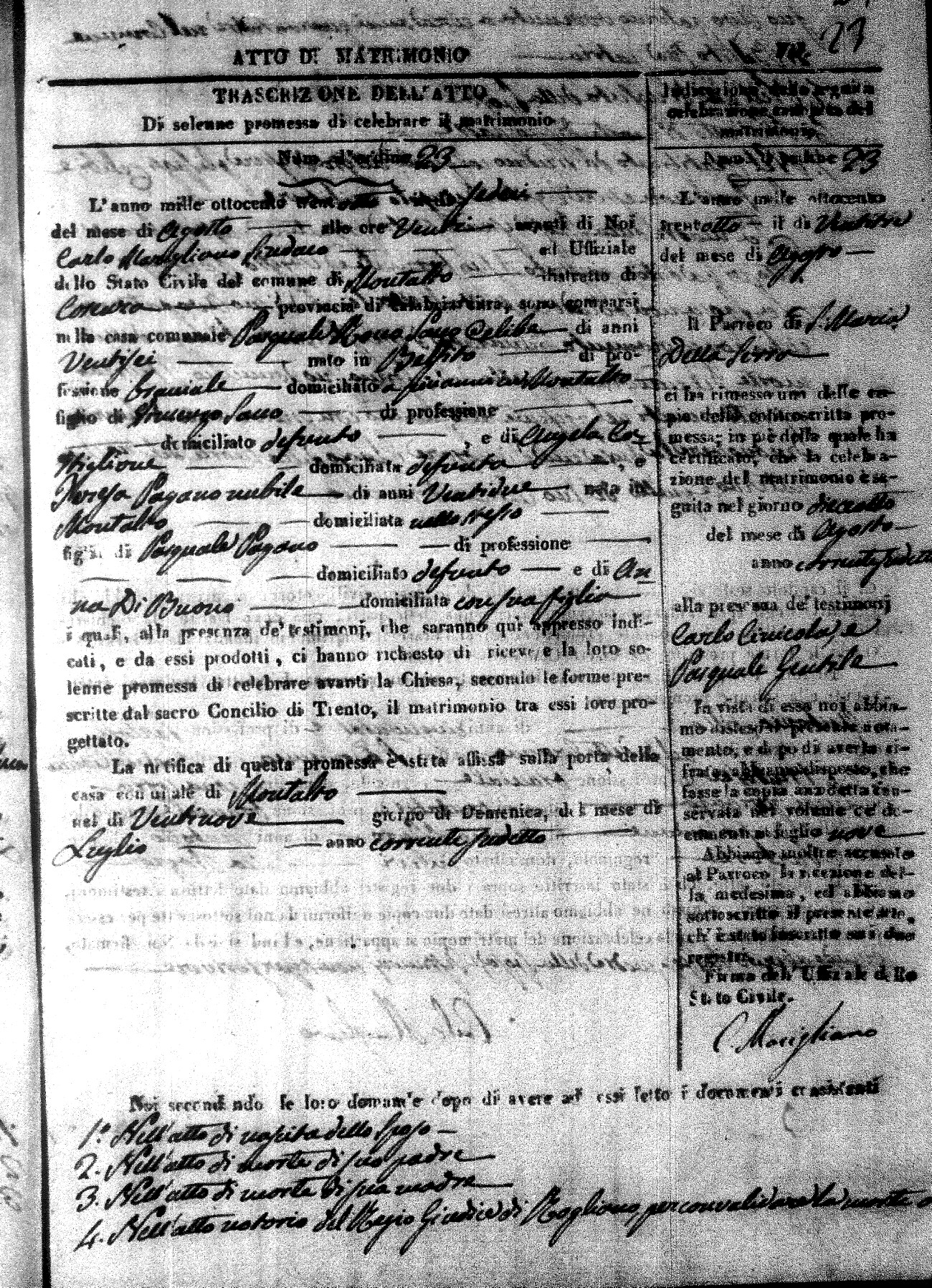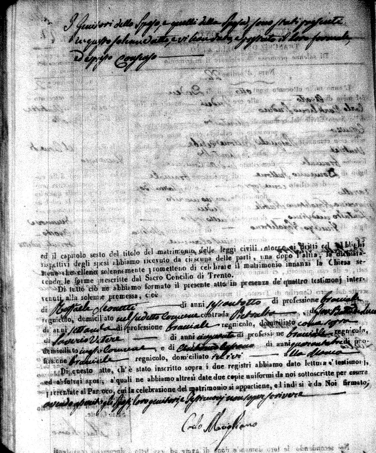 | d'Agostino | Michele Arcangelo | Pasquale (fu) | Benincasa | Chiara | de Stormitius? | Maria Aloisa | Unknown | Unknown | Unknown | Tocci | Tommaso | Giovanni (fu) | Migliano | Rosa | Coscarello | Carlotta | Francesco | Napolitano | Chiara (fu) |