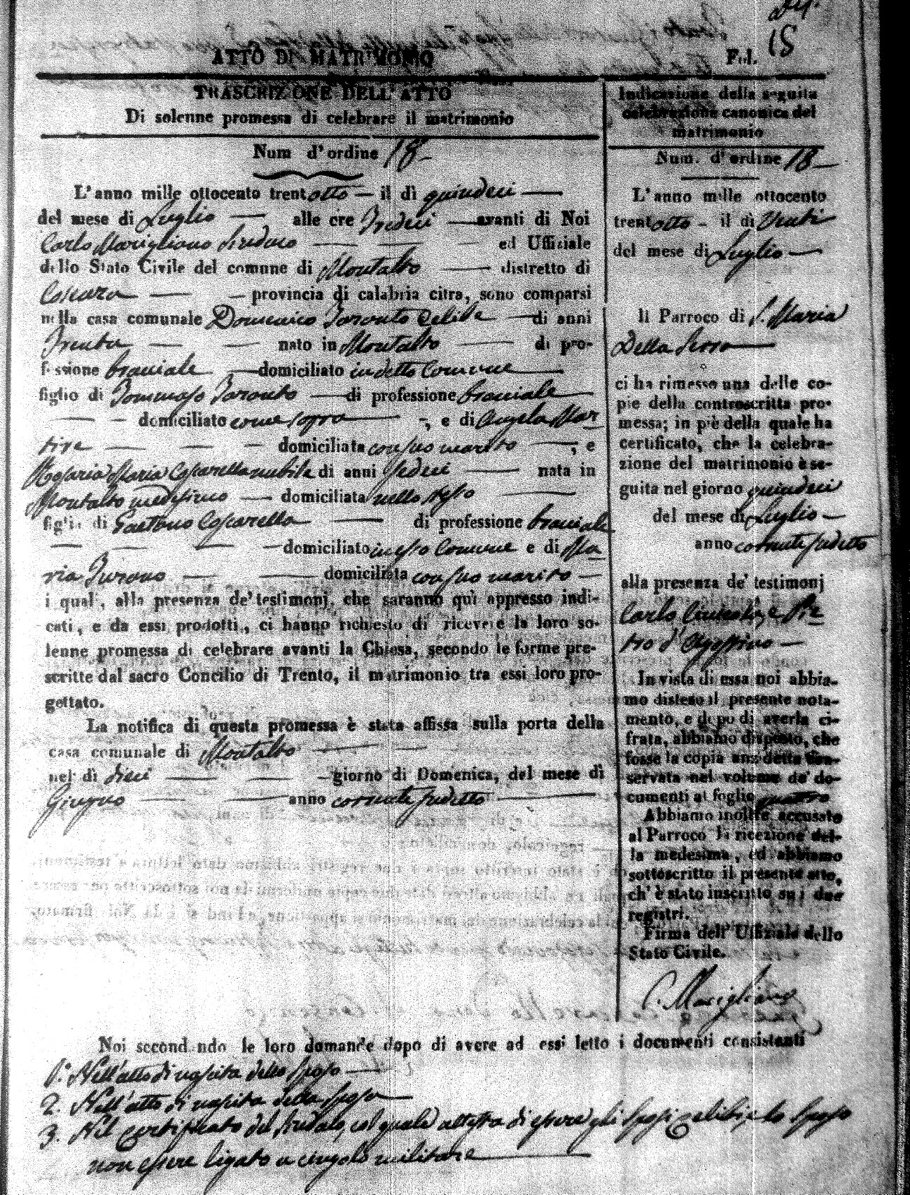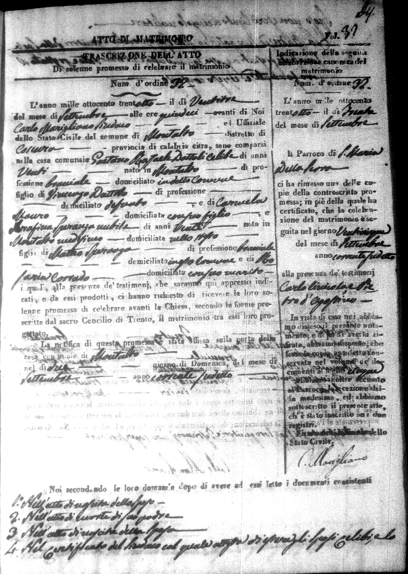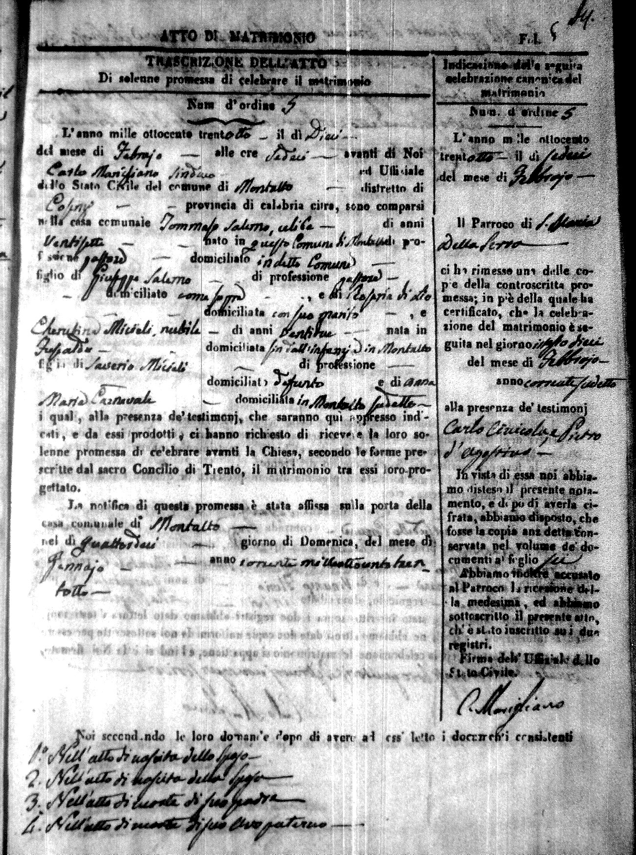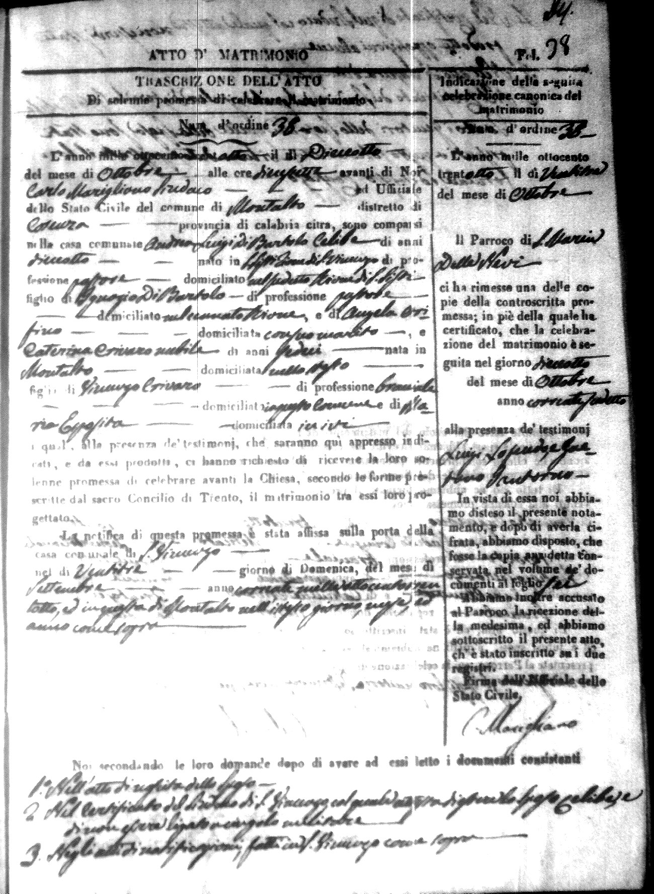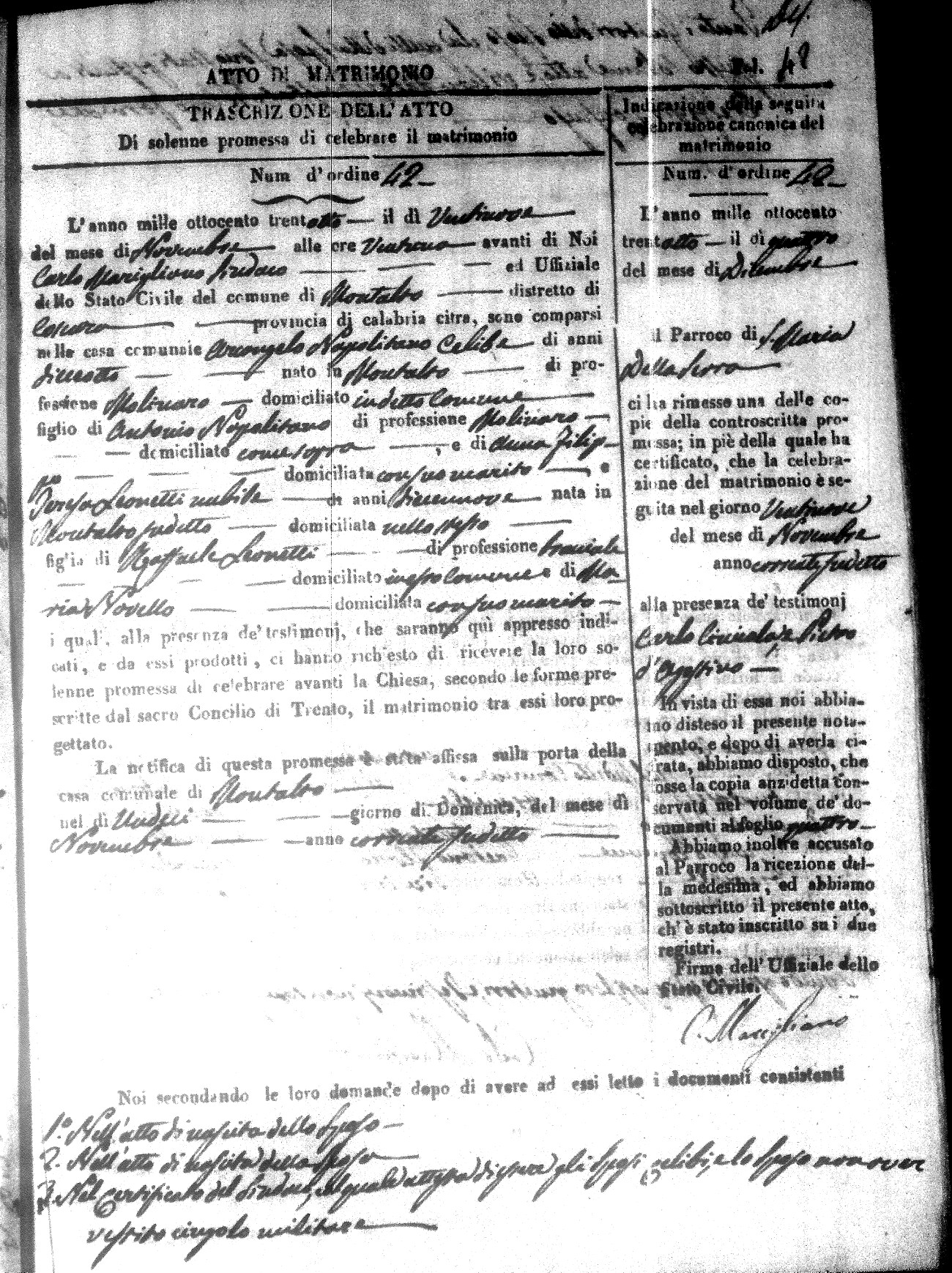 Here are the extractions for the marriage acts in 1838 for Montalto Uffugo. For more information, click on the groom's surname to view page 1 of the copy of the original document and his first name to view page 2. This year is complete.