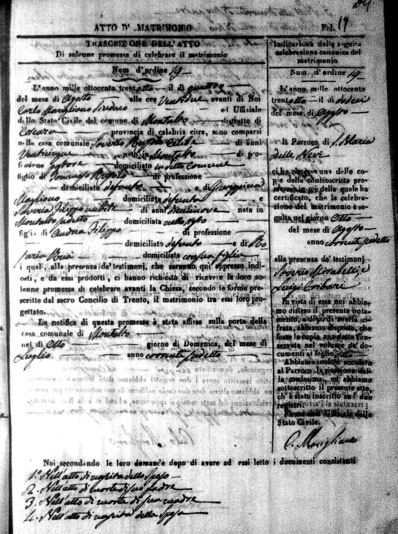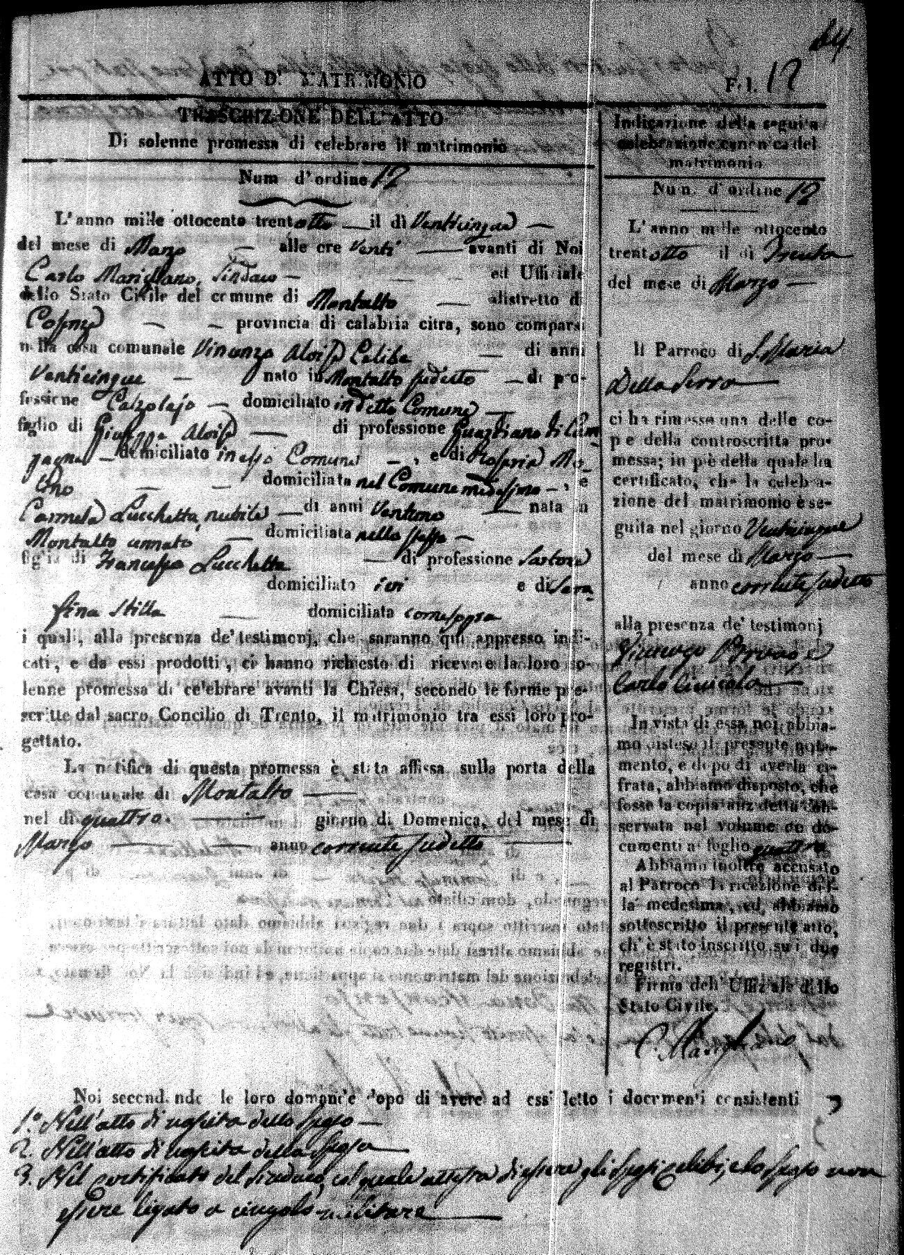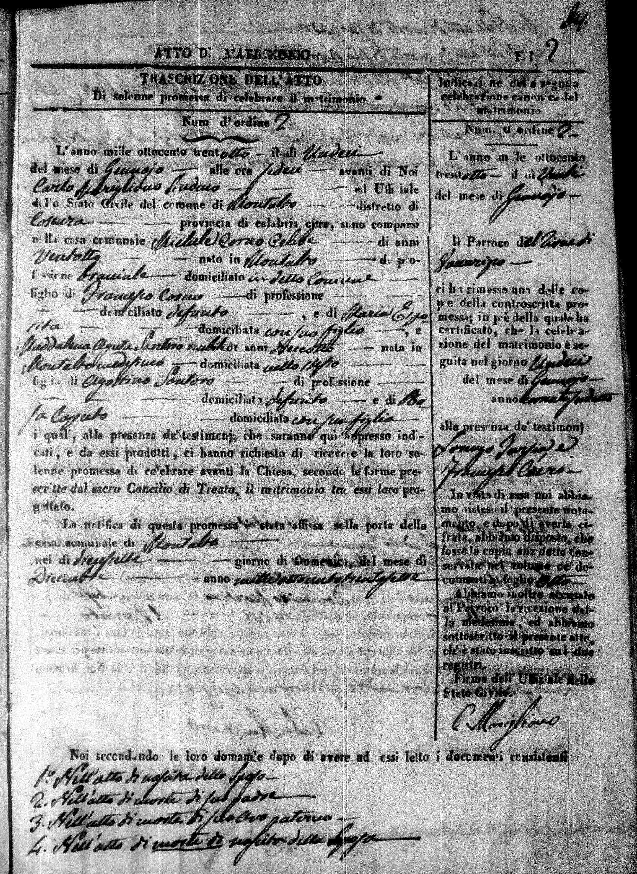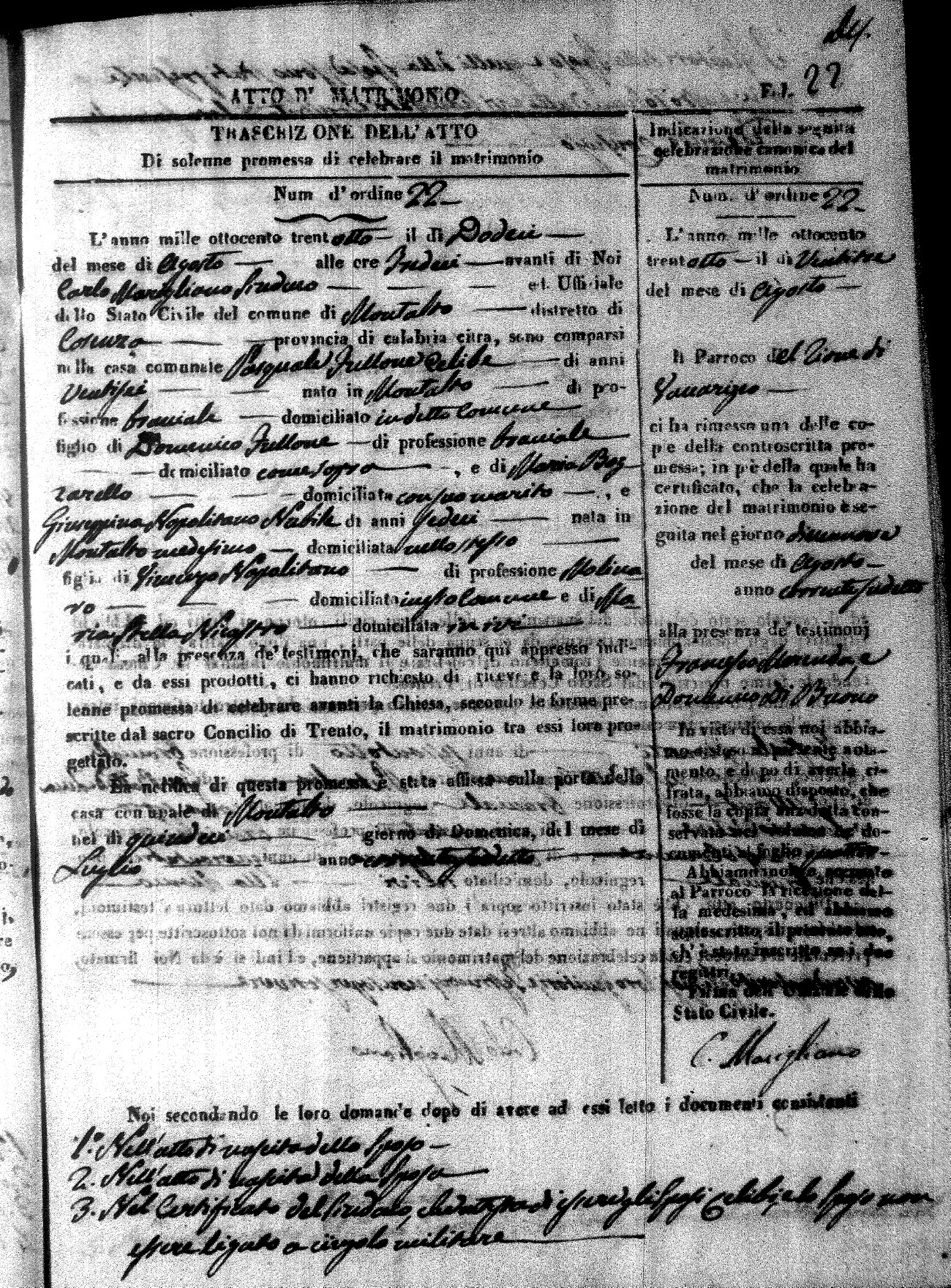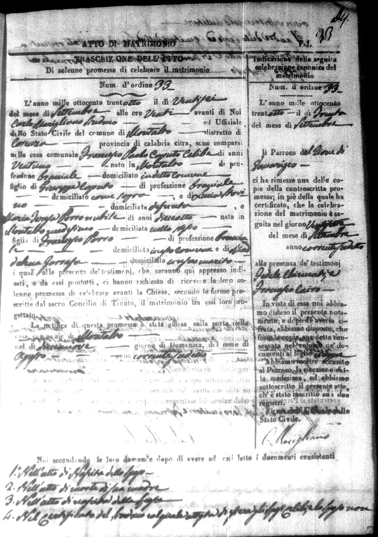 Here are the extractions for the marriage acts in 1838 for Montalto Uffugo. For more information, click on the groom's surname to view page 1 of the copy of the original document and his first name to view page 2. This year is complete.