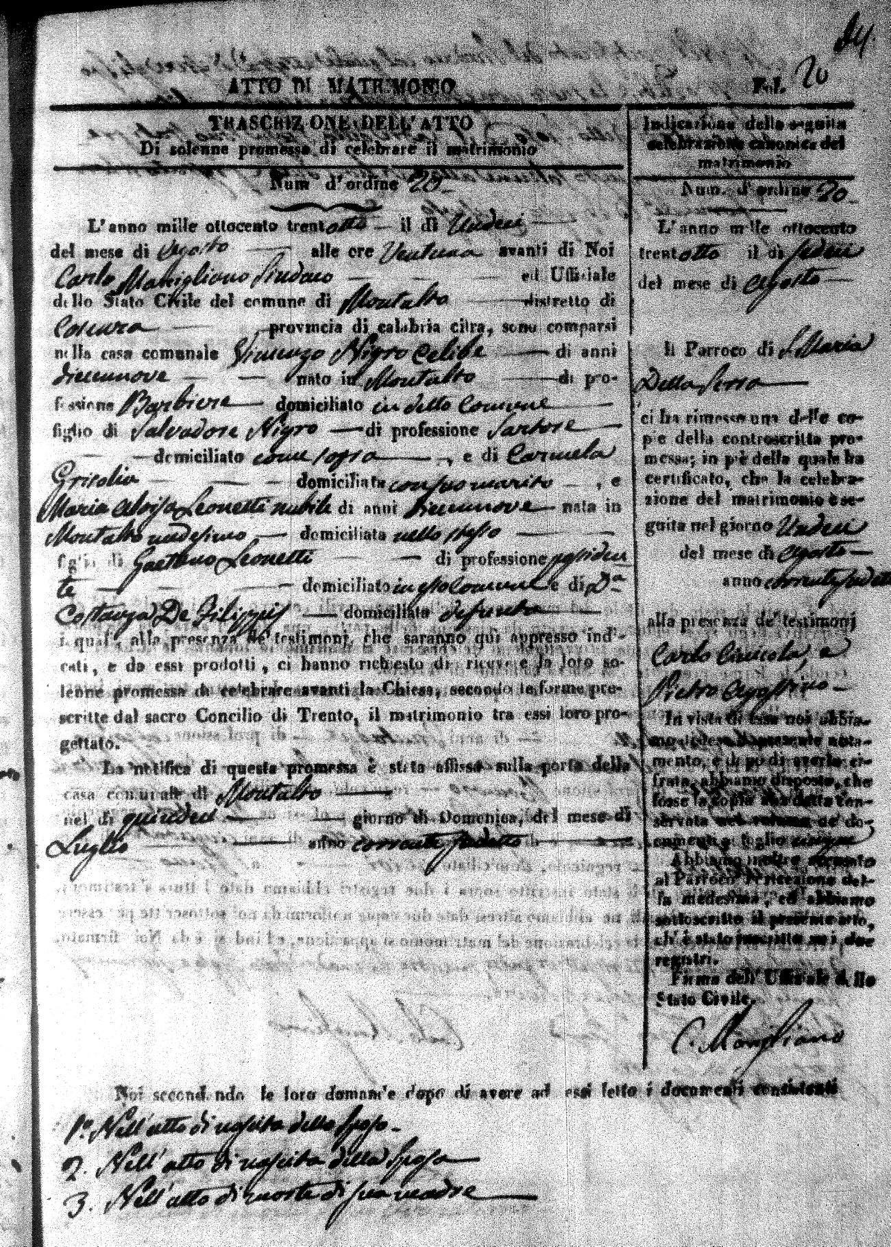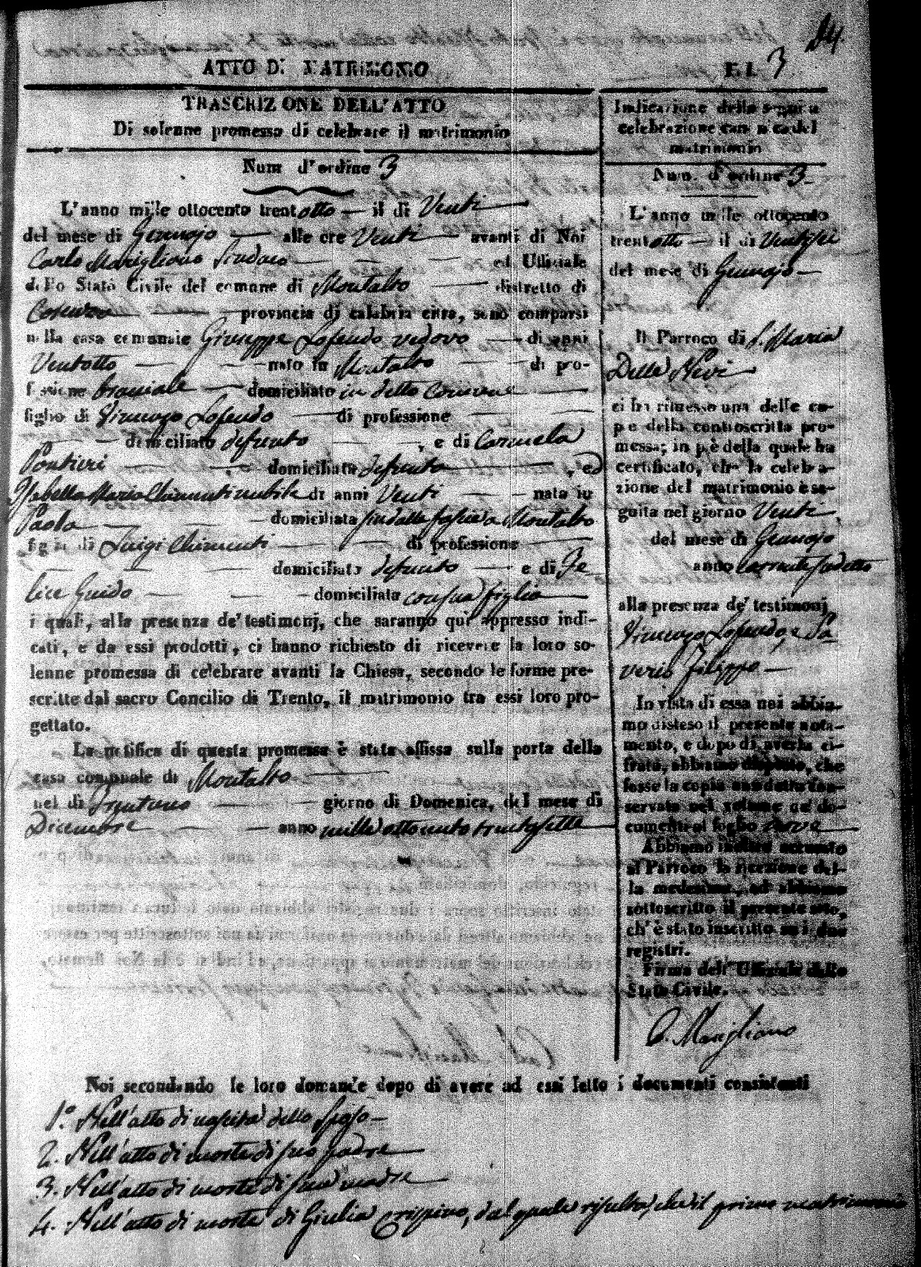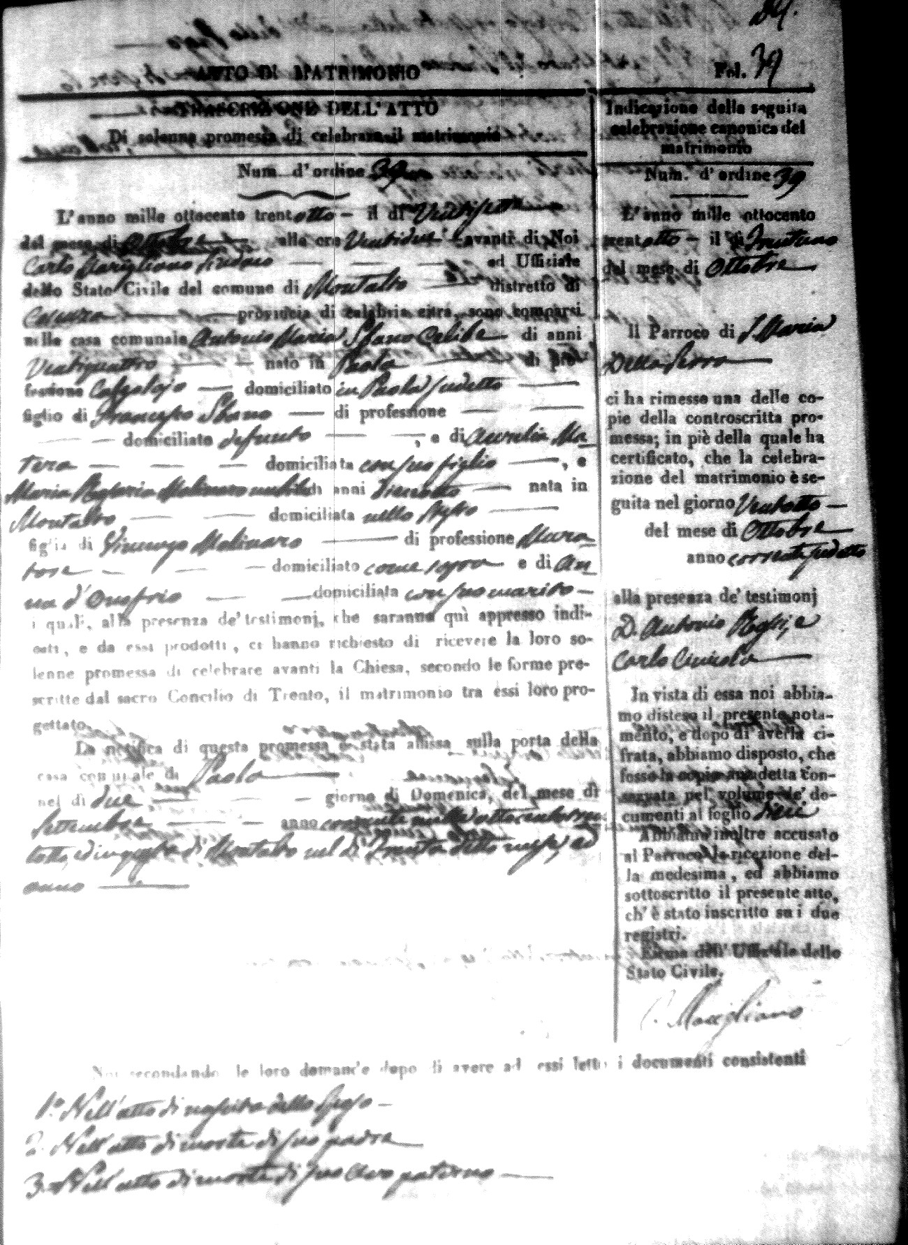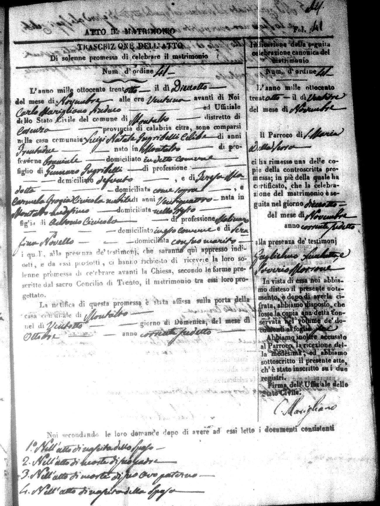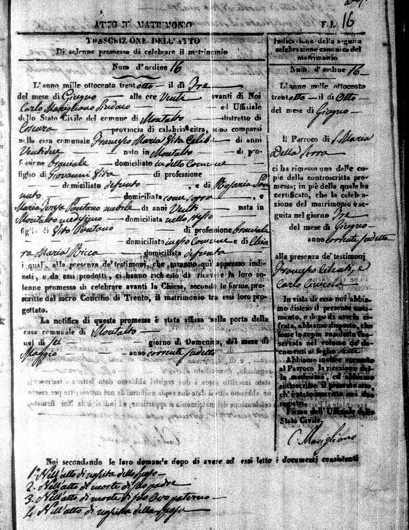 Here are the extractions for the marriage acts in 1838 for Montalto Uffugo. For more information, click on the groom's surname to view page 1 of the copy of the original document and his first name to view page 2. This year is complete.