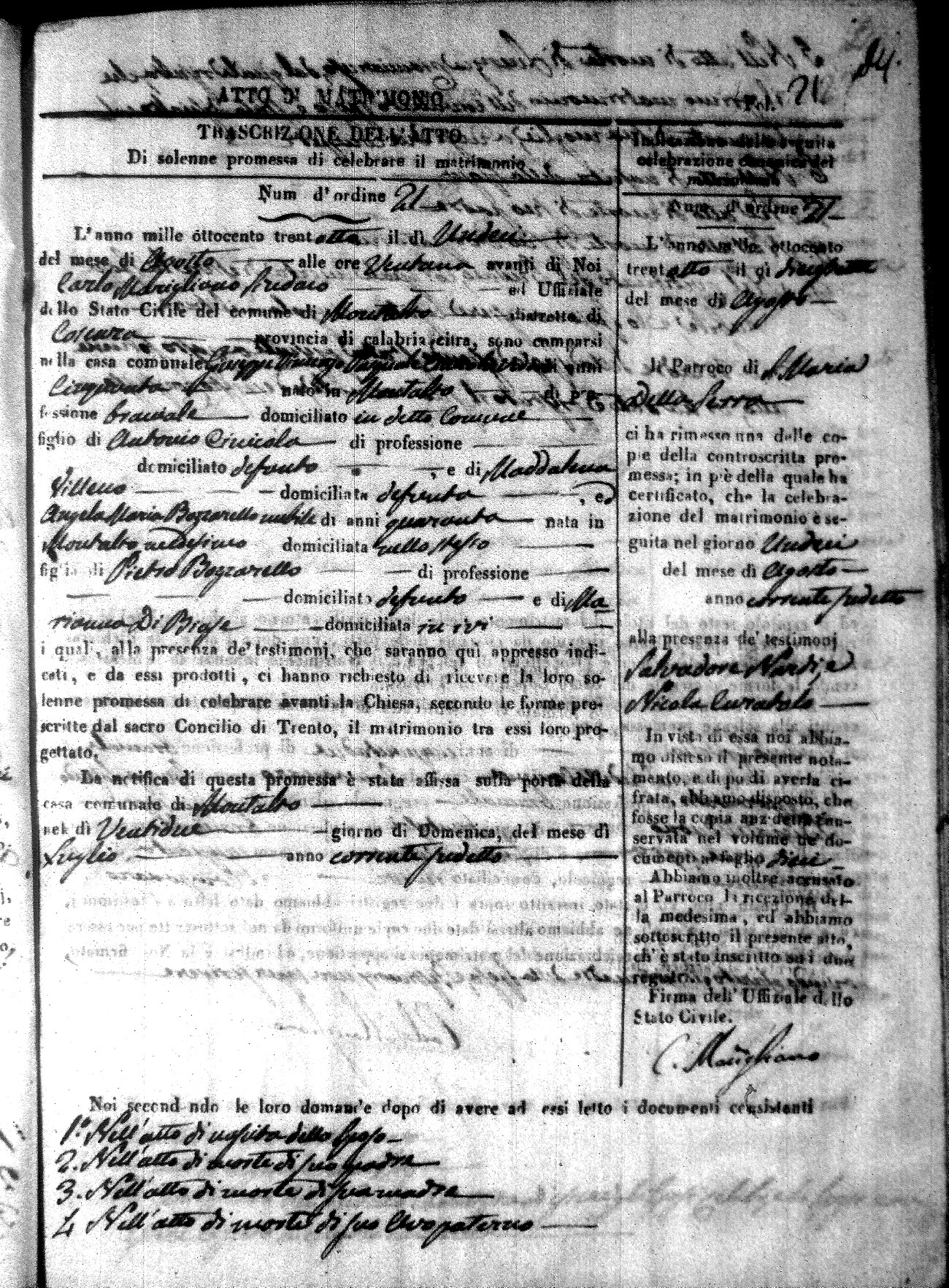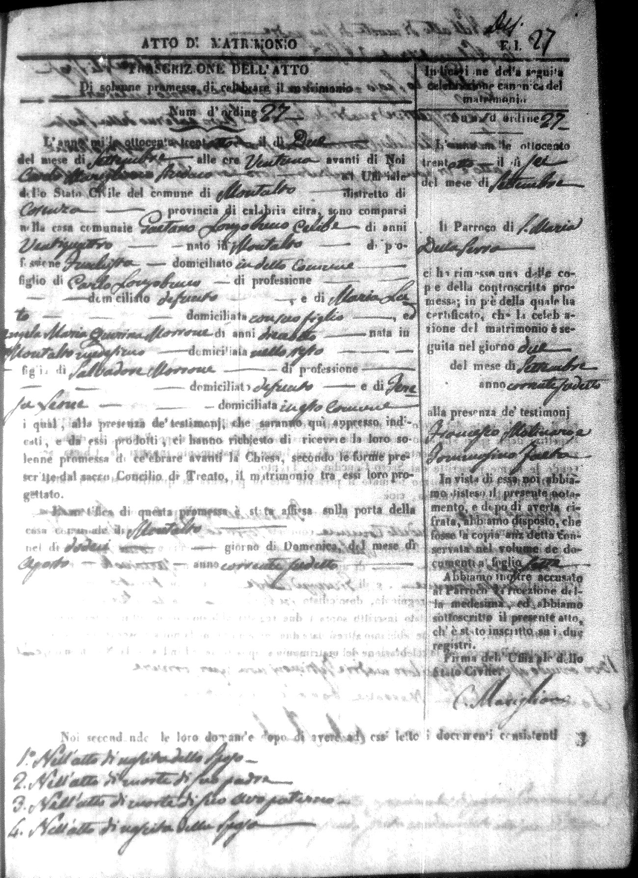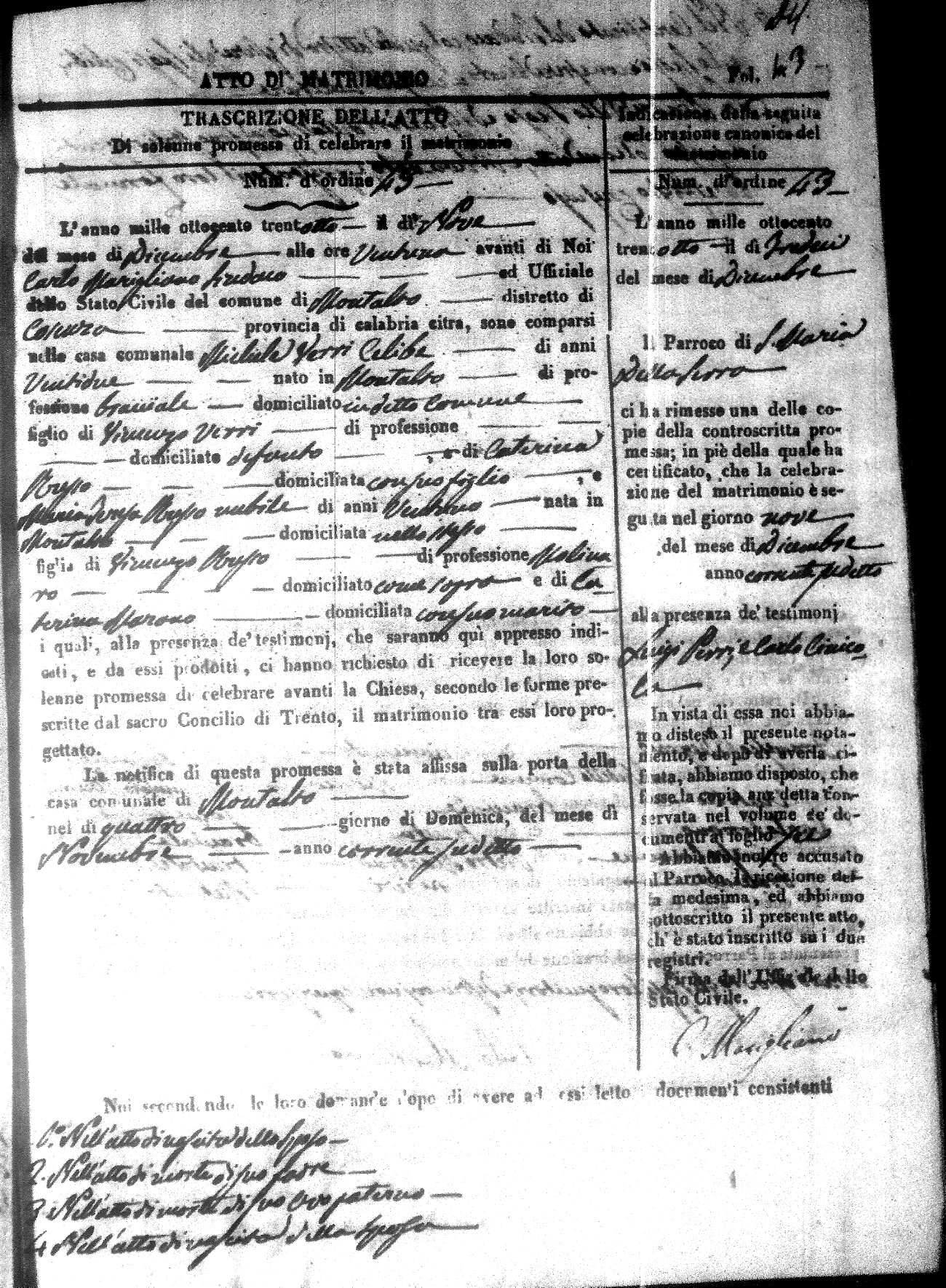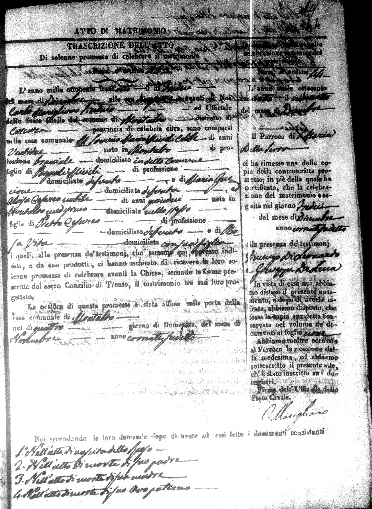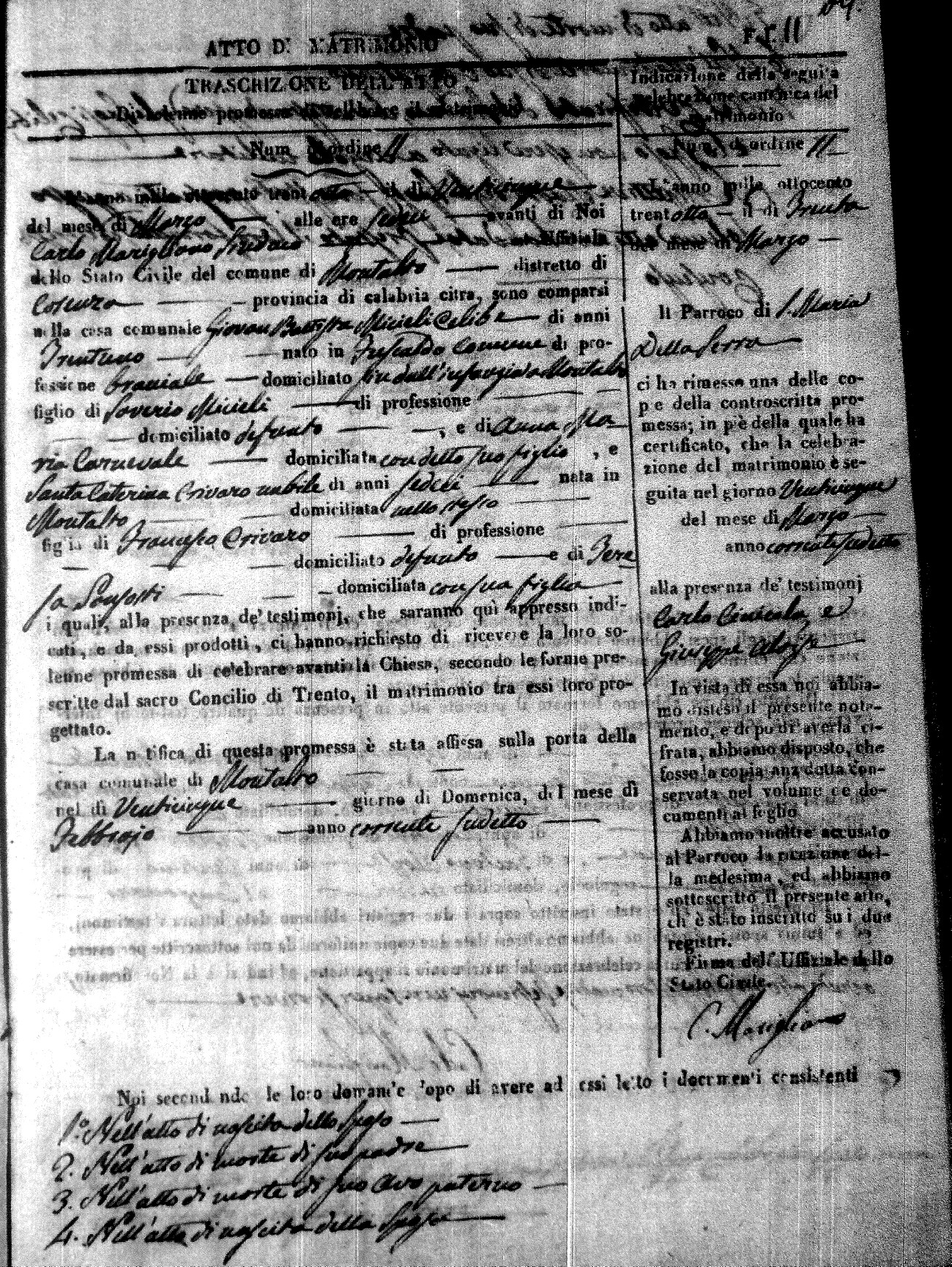 Here are the extractions for the marriage acts in 1838 for Montalto Uffugo. For more information, click on the groom's surname to view page 1 of the copy of the original document and his first name to view page 2. This year is complete.