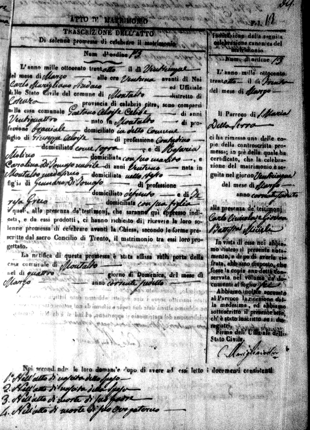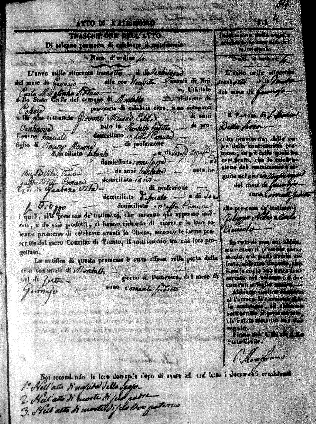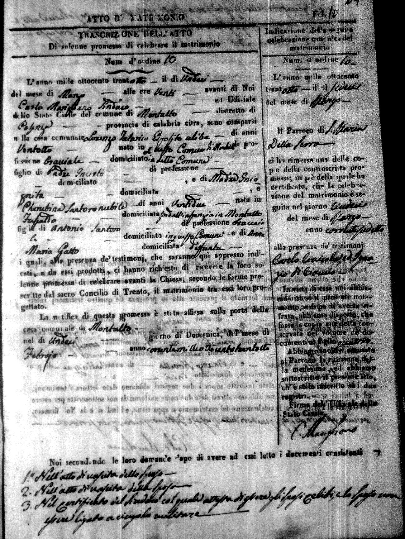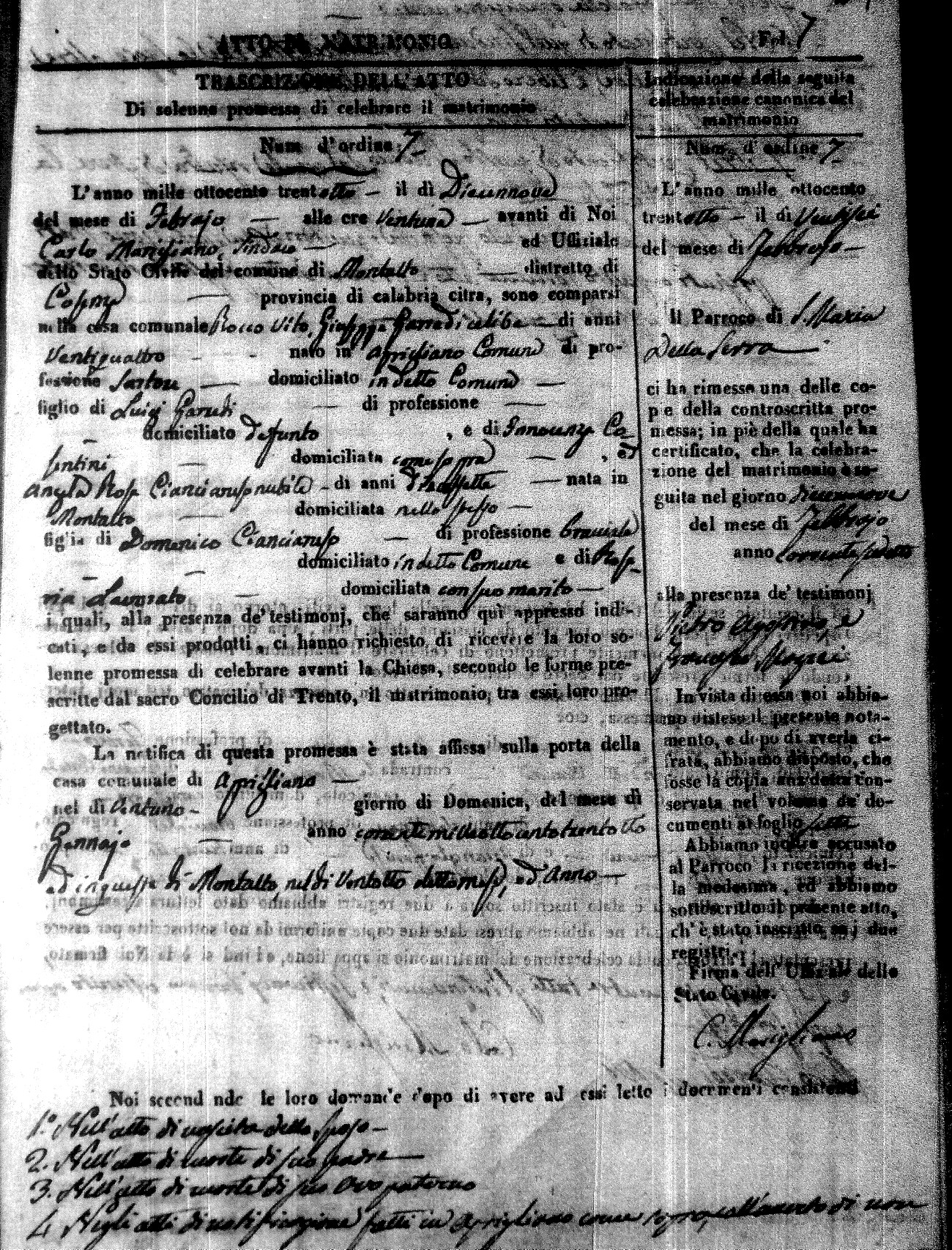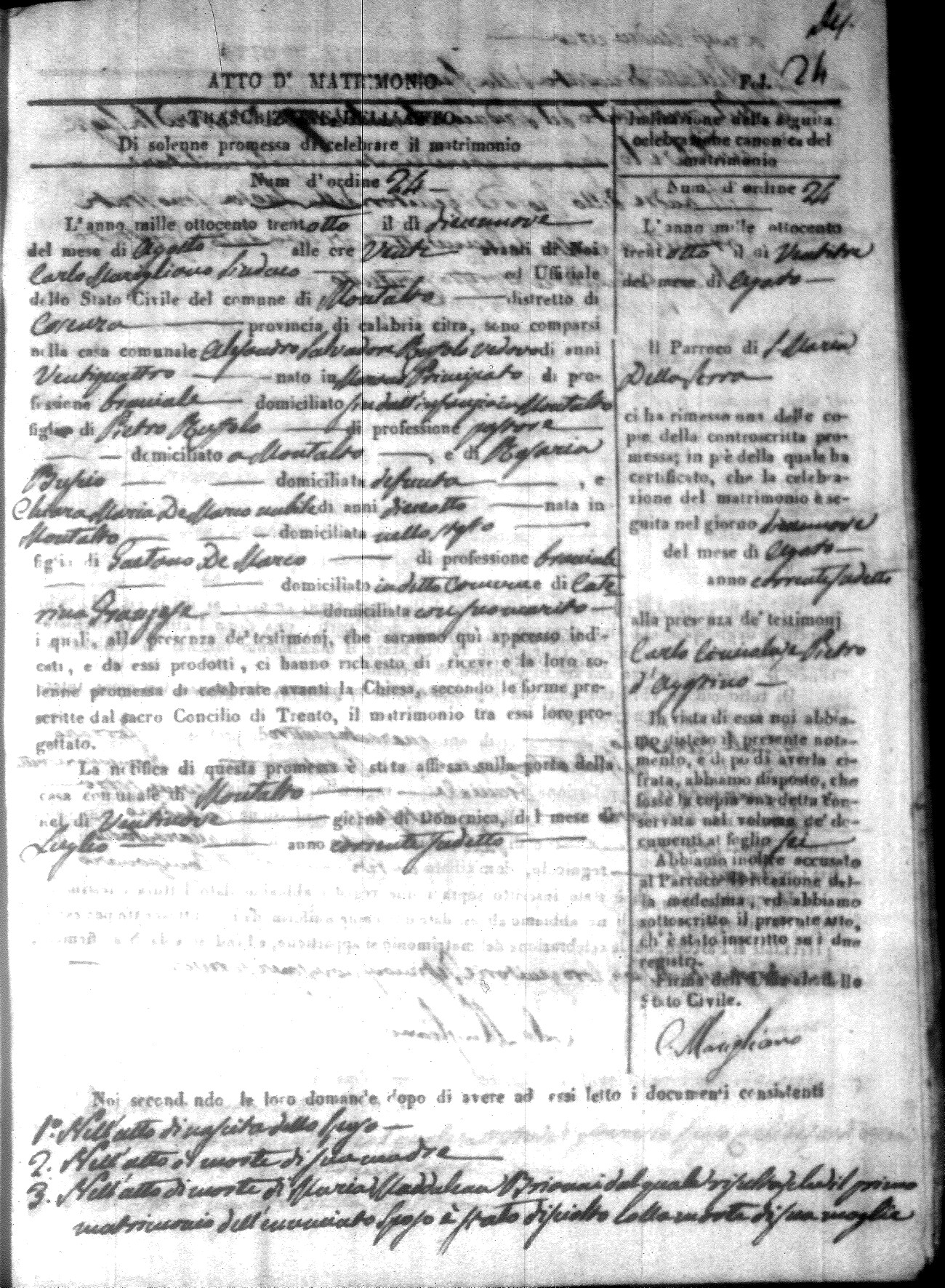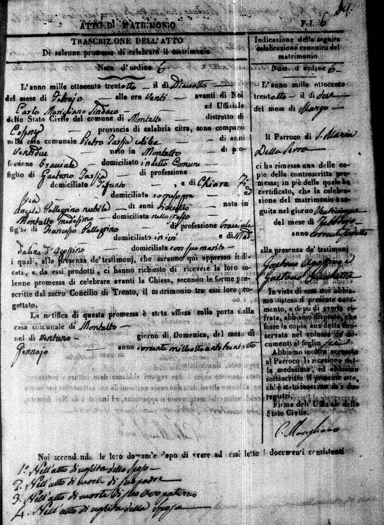 Here are the extractions for the marriage acts in 1838 for Montalto Uffugo. For more information, click on the groom's surname to view page 1 of the copy of the original document and his first name to view page 2. This year is complete.