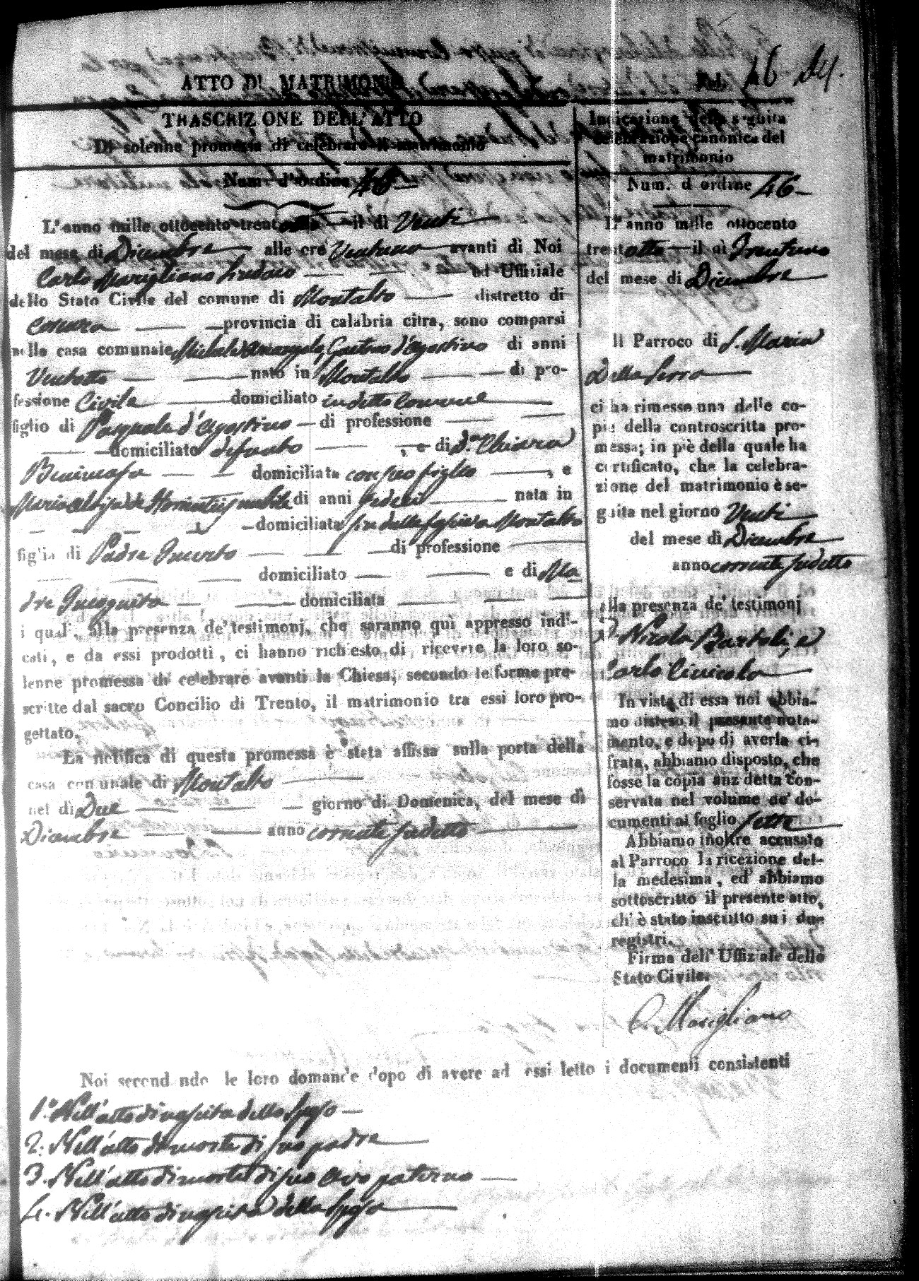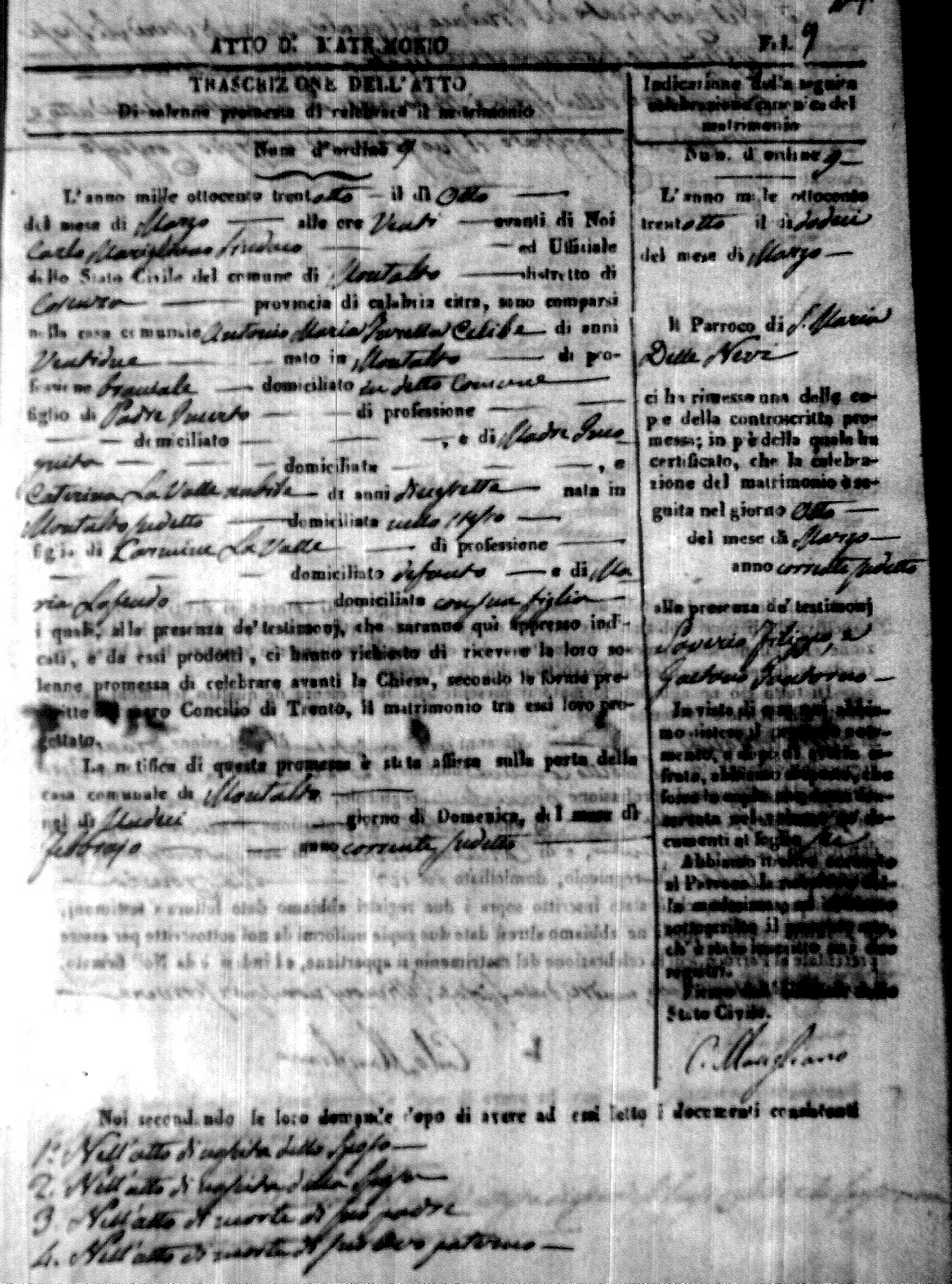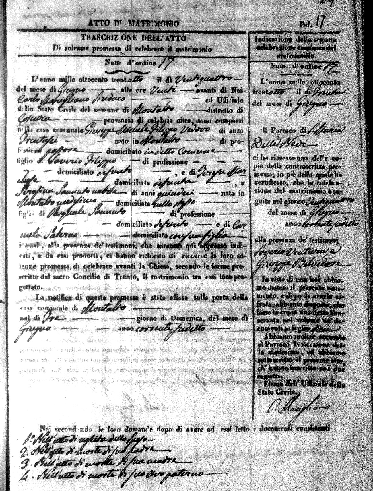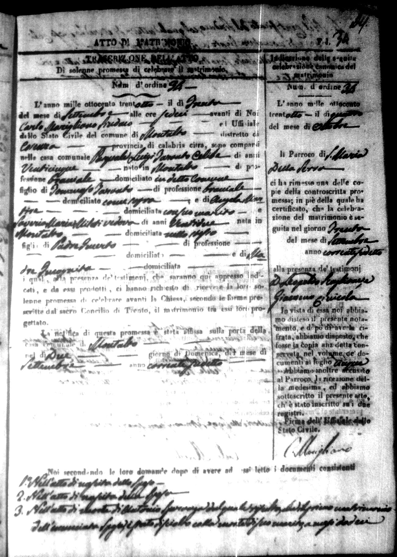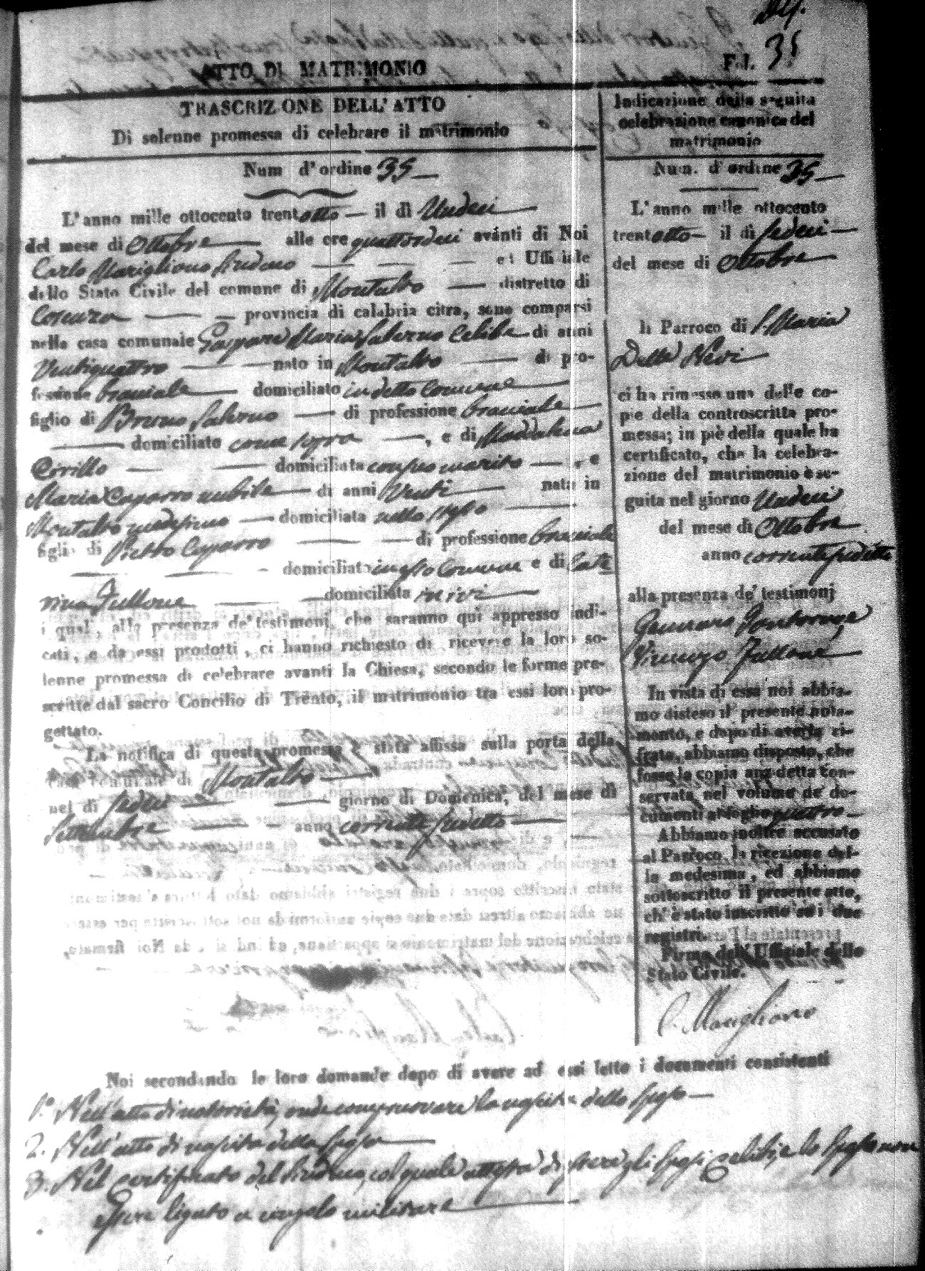 Here are the extractions for the marriage acts in 1838 for Montalto Uffugo. For more information, click on the groom's surname to view page 1 of the copy of the original document and his first name to view page 2. This year is complete.