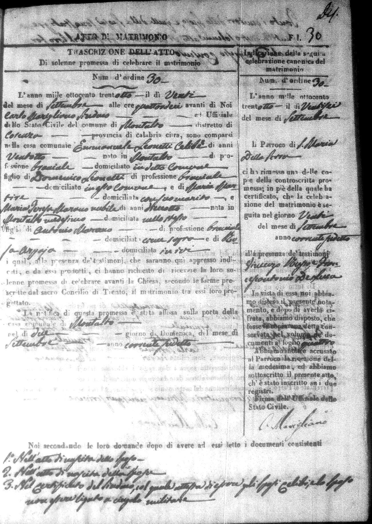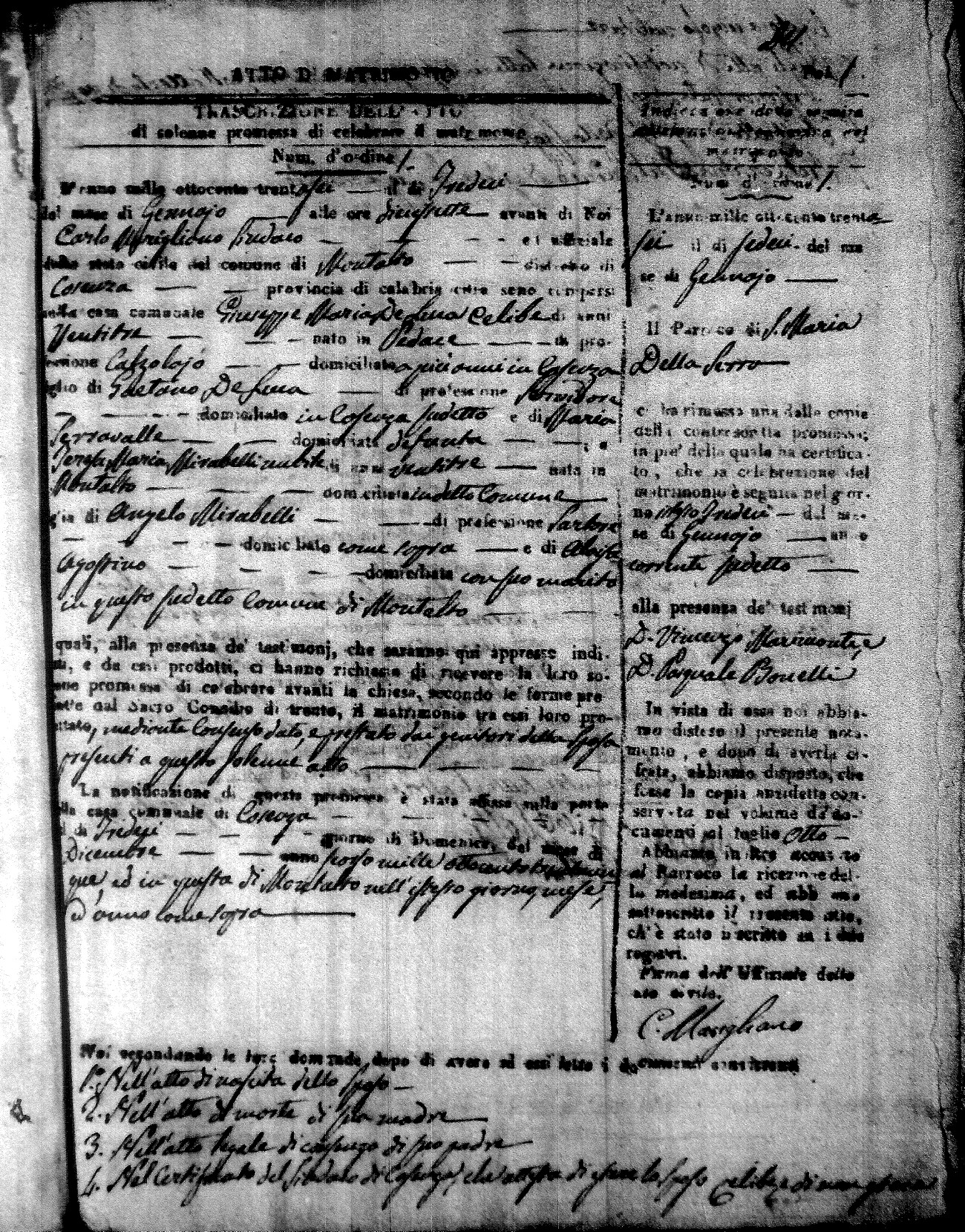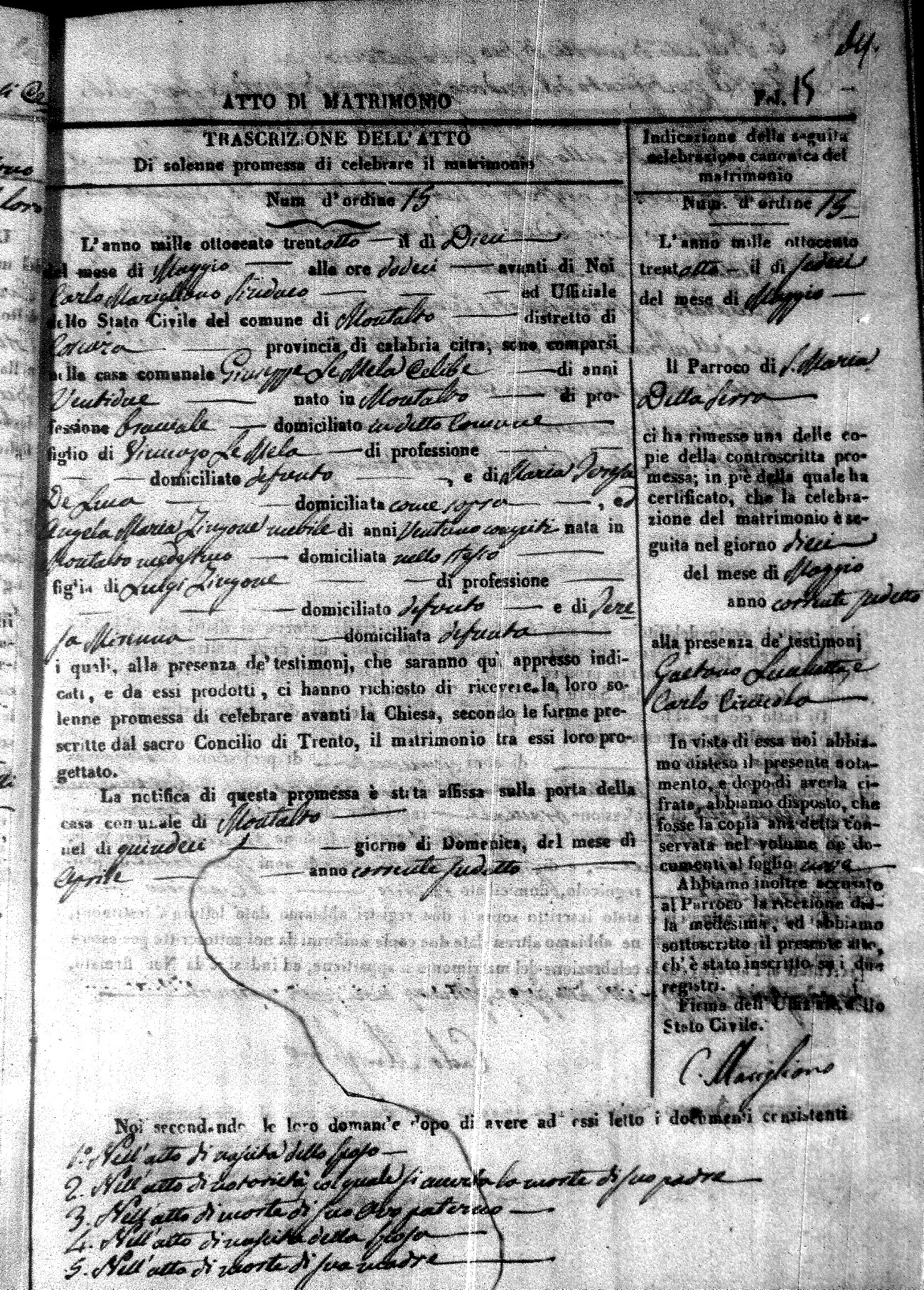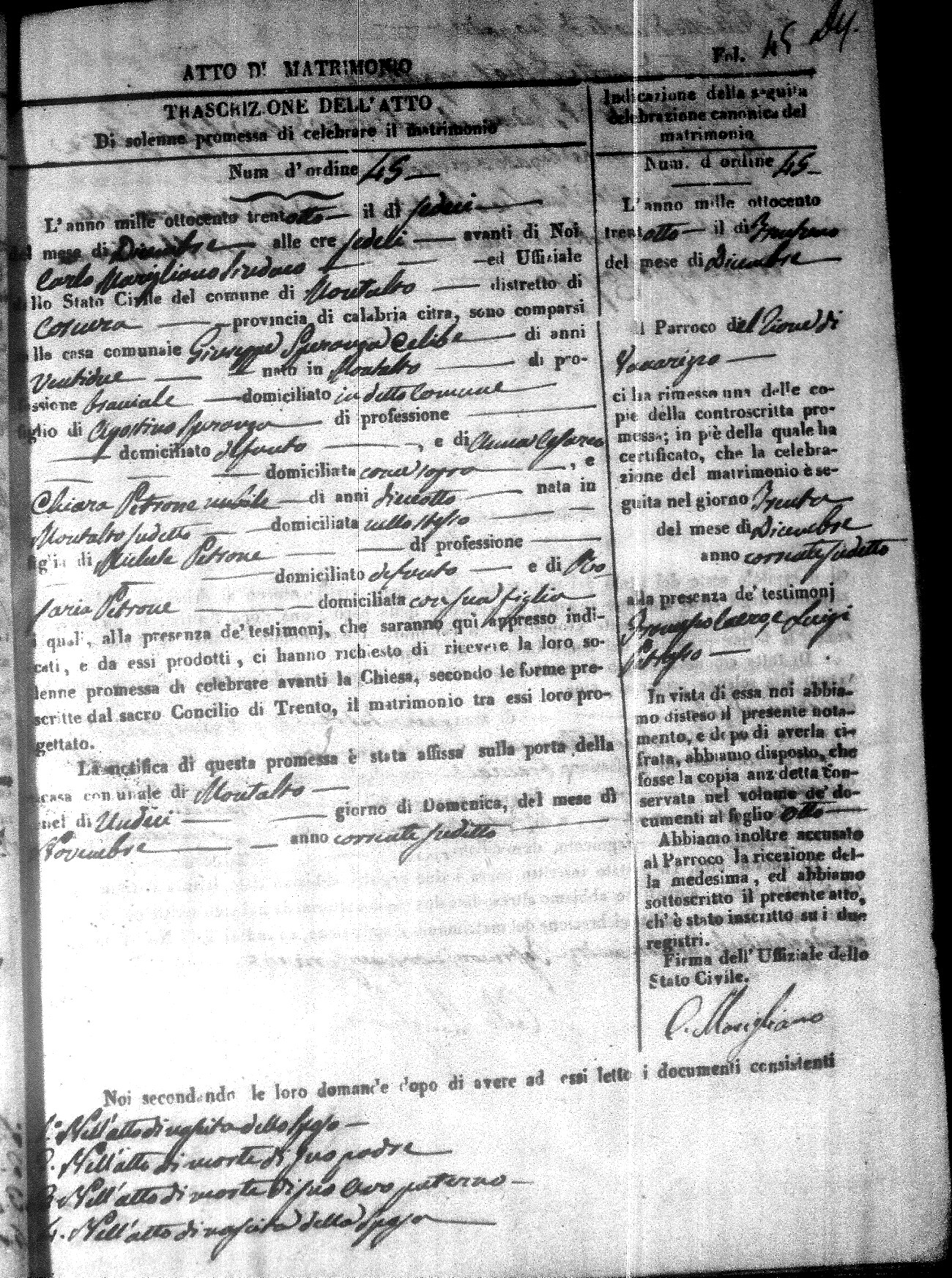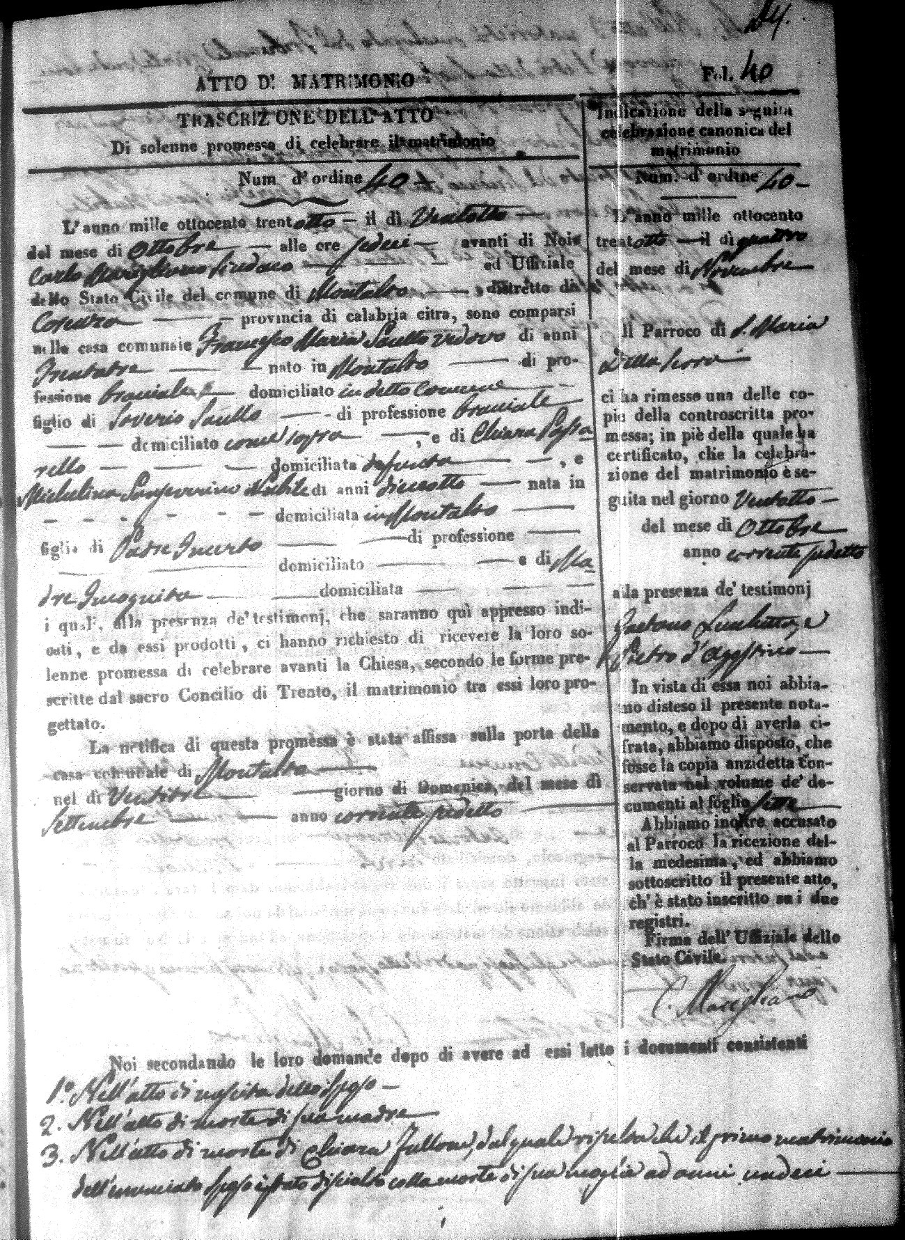 Here are the extractions for the marriage acts in 1838 for Montalto Uffugo. For more information, click on the groom's surname to view page 1 of the copy of the original document and his first name to view page 2. This year is complete.