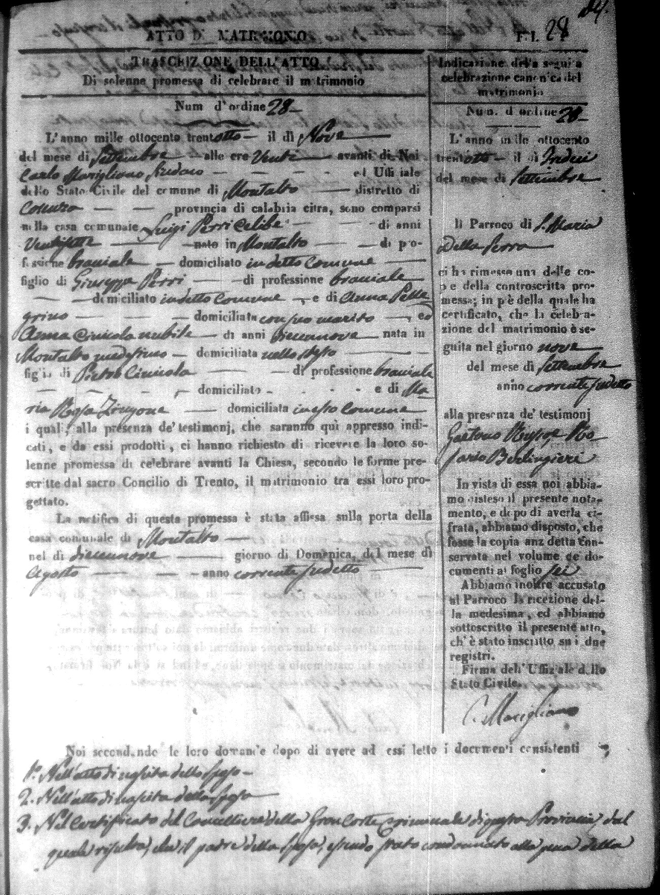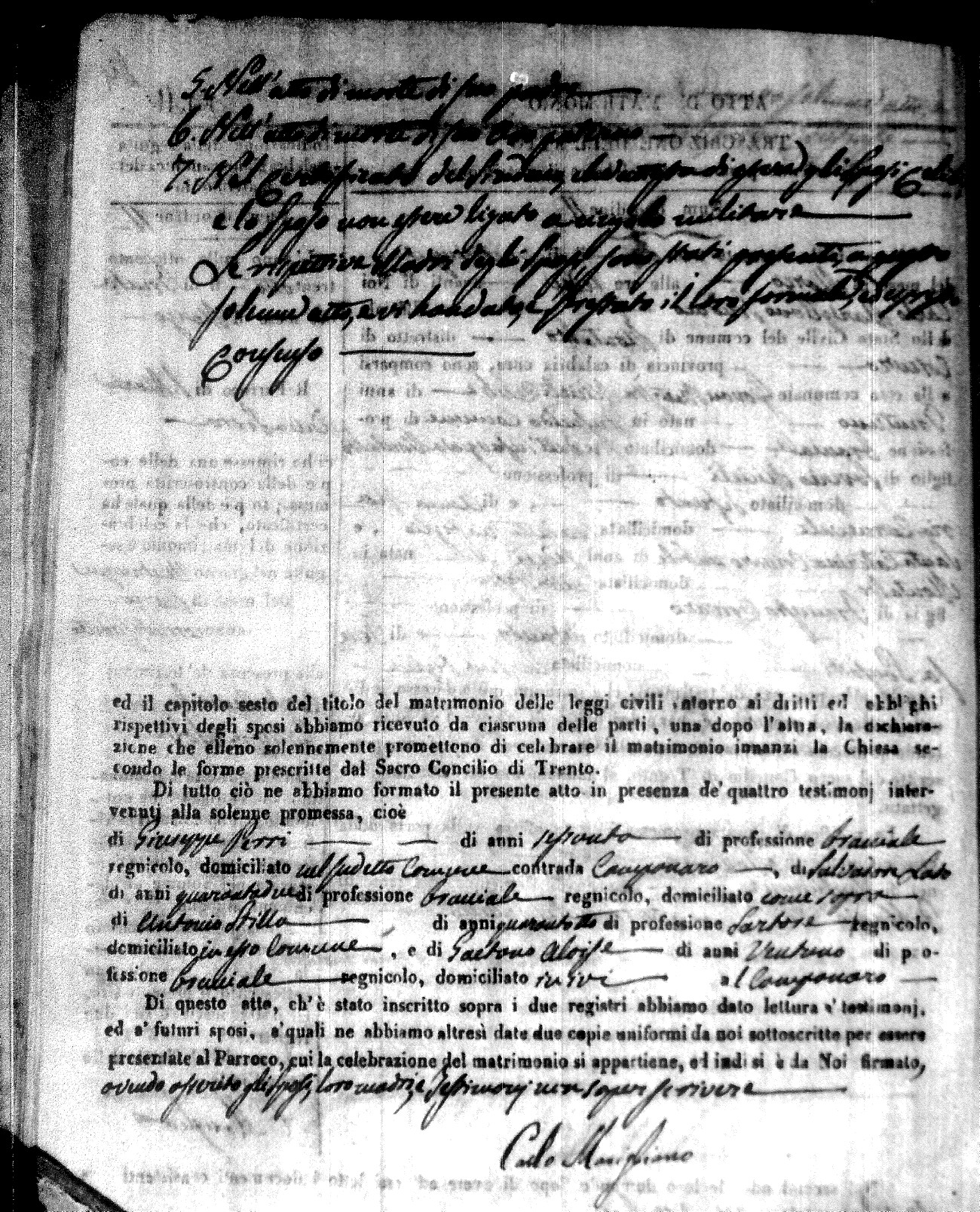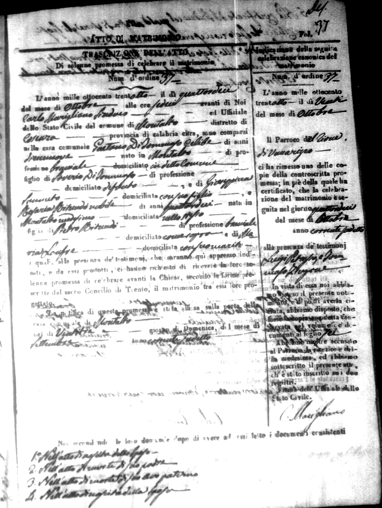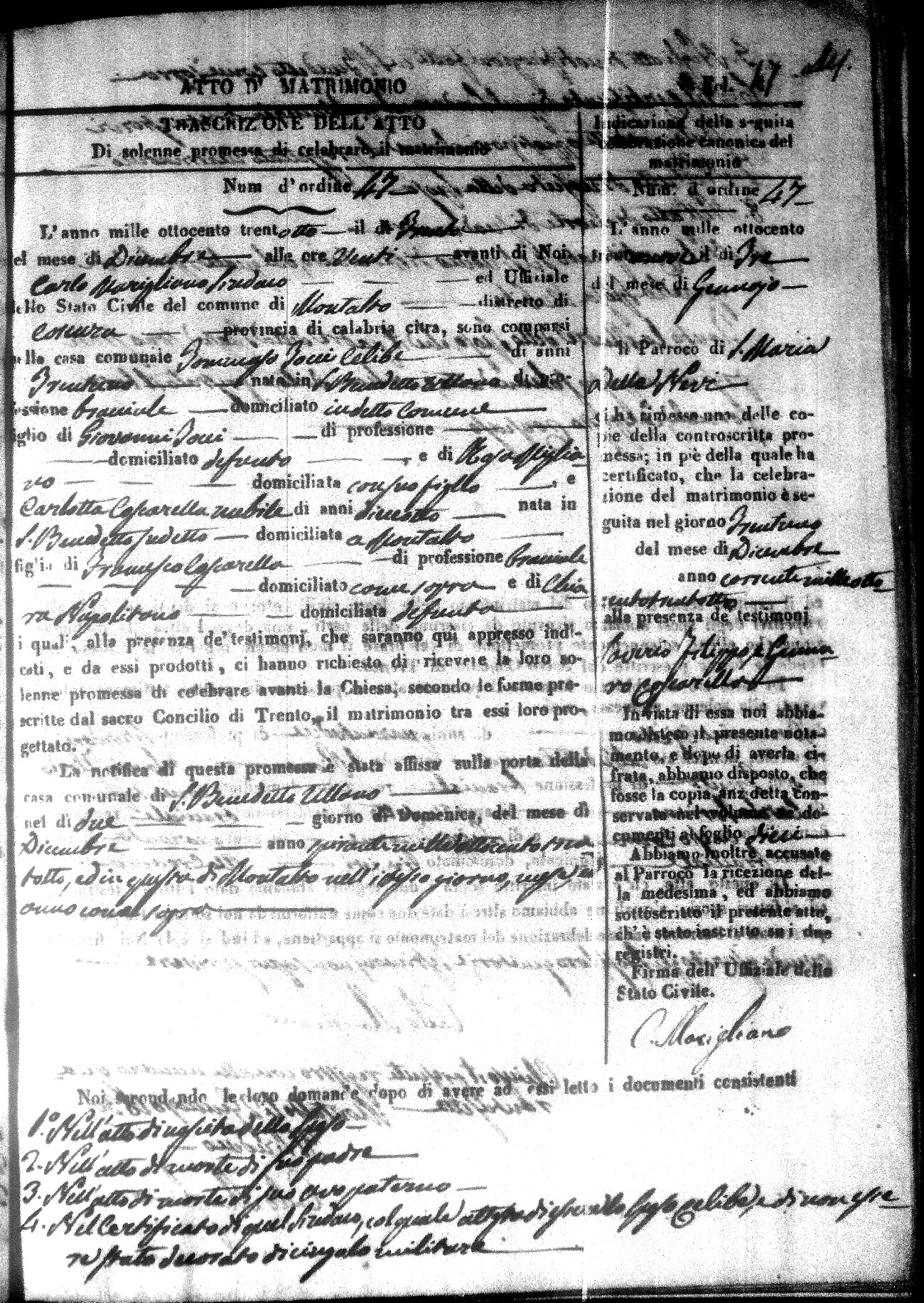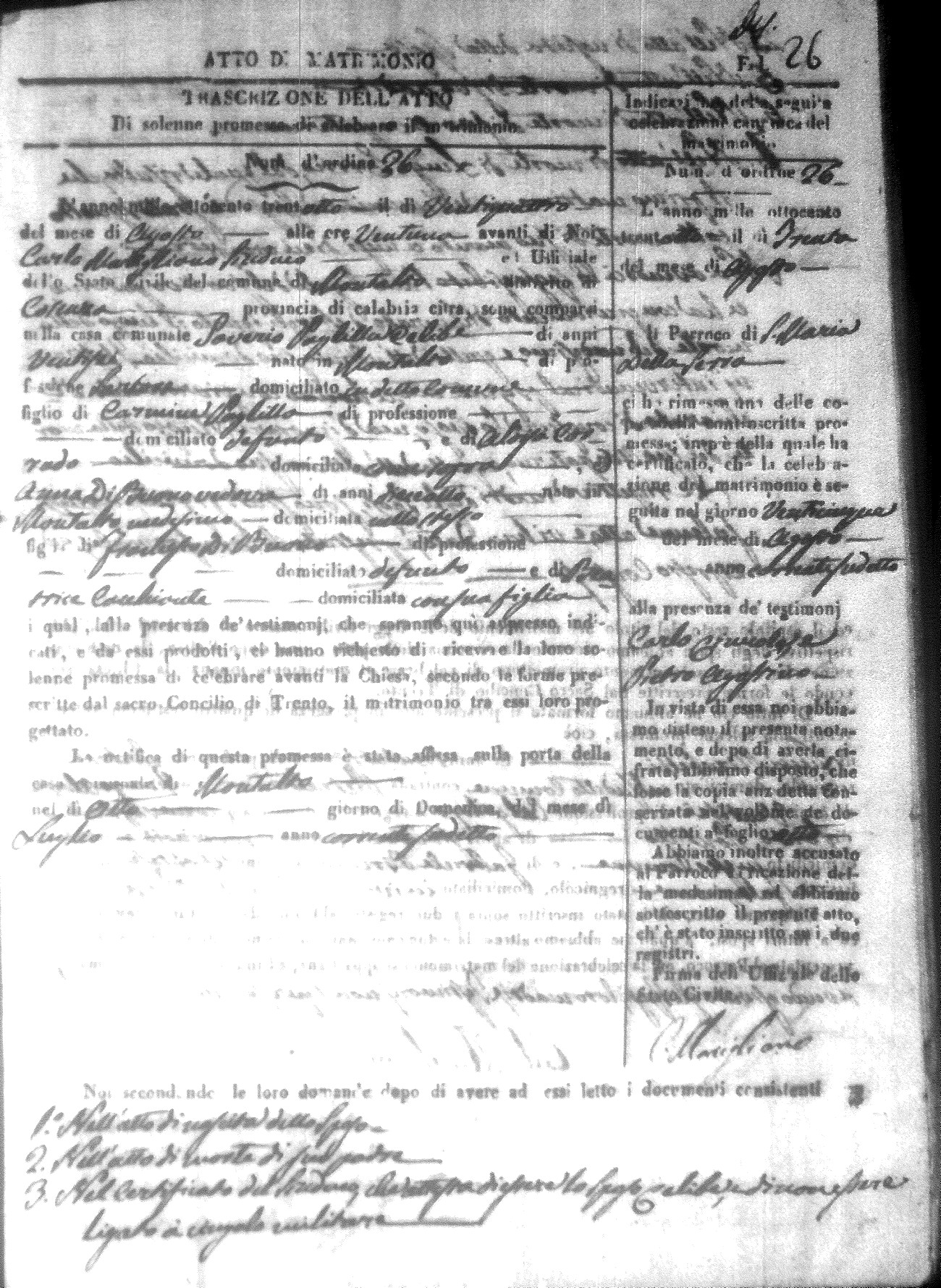 Here are the extractions for the marriage acts in 1838 for Montalto Uffugo. For more information, click on the groom's surname to view page 1 of the copy of the original document and his first name to view page 2. This year is complete.