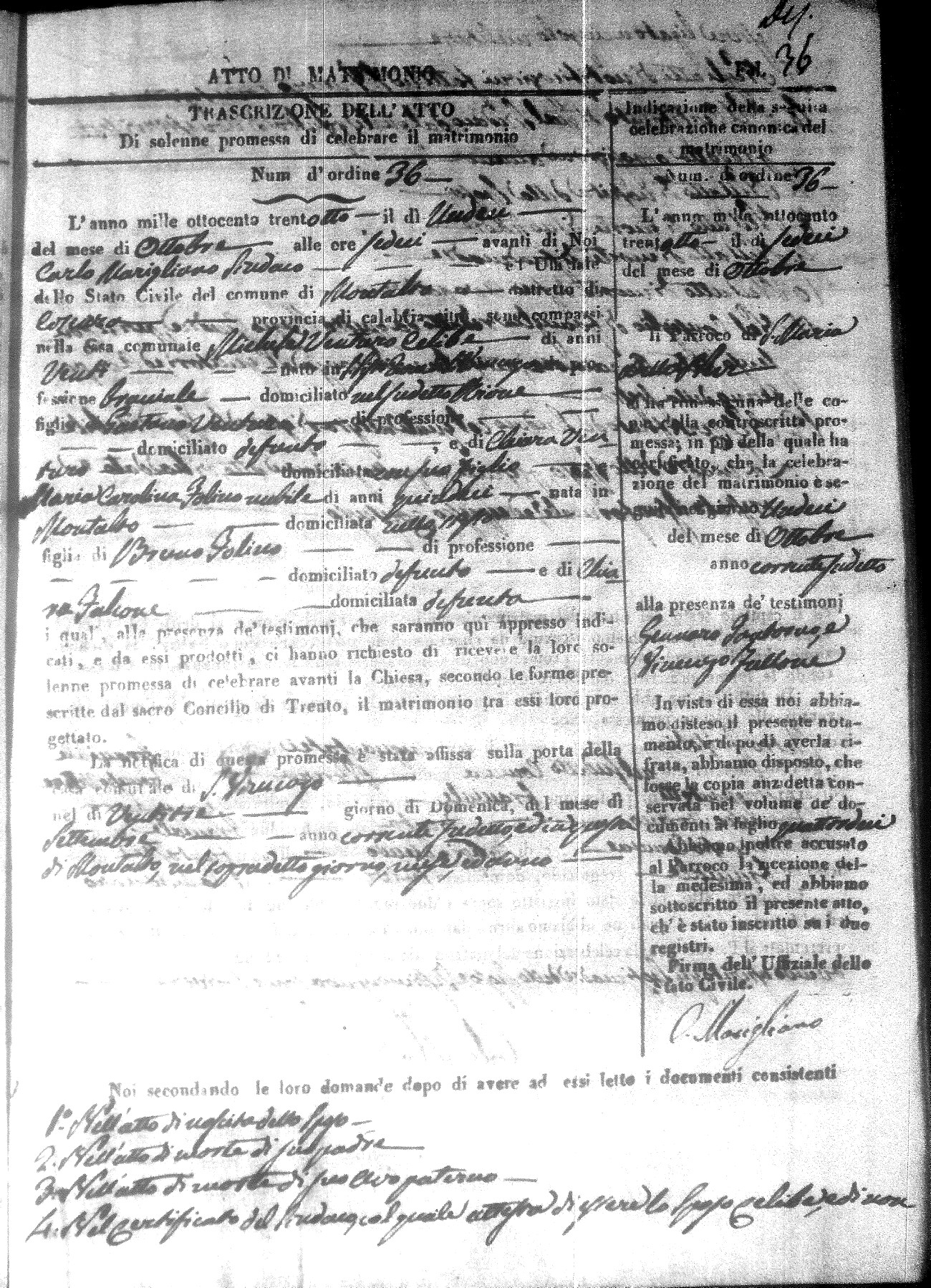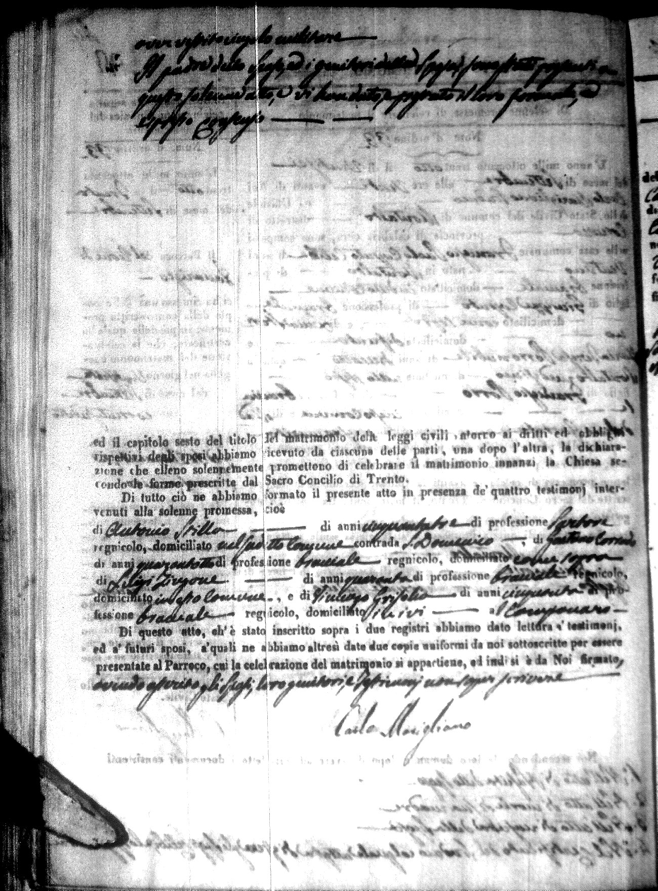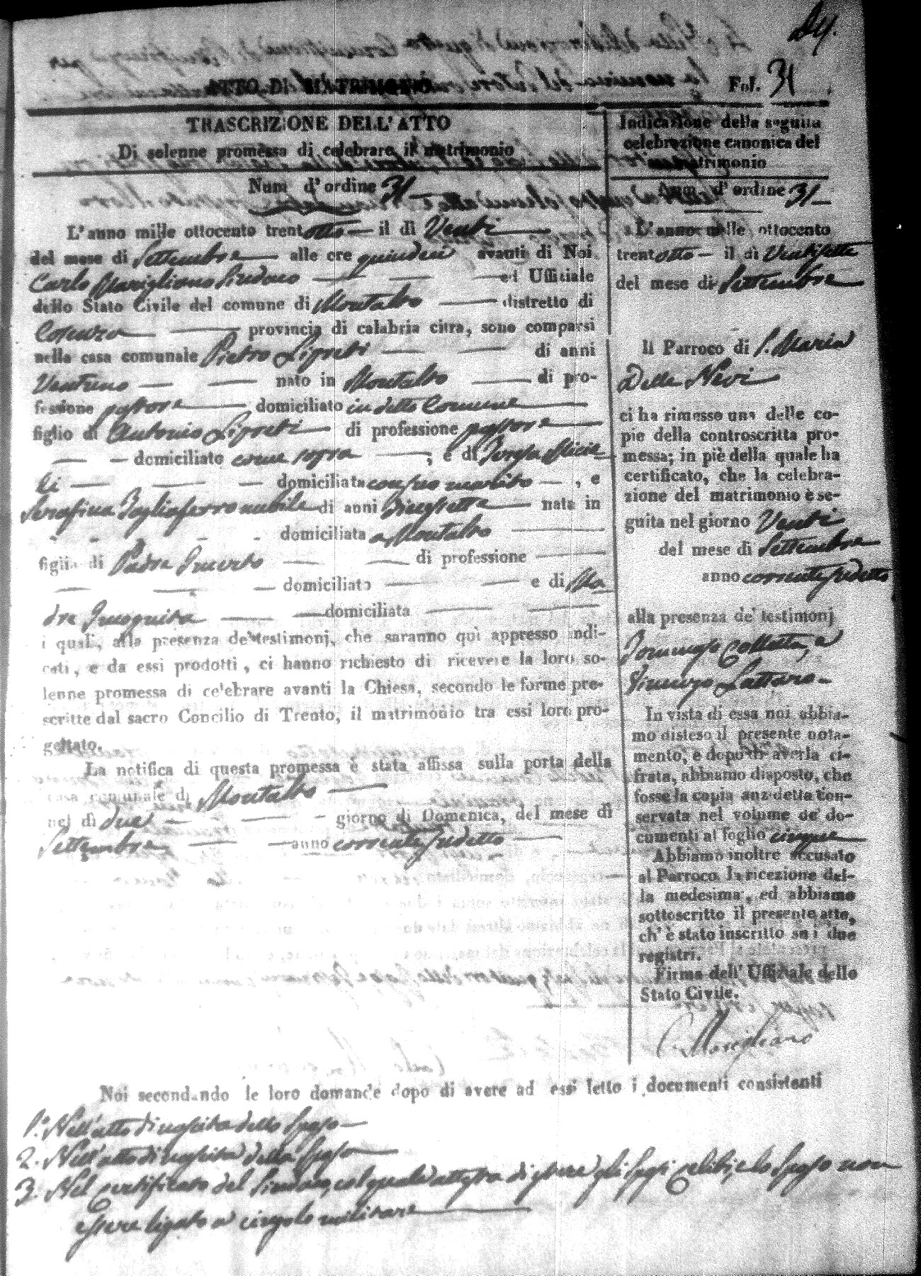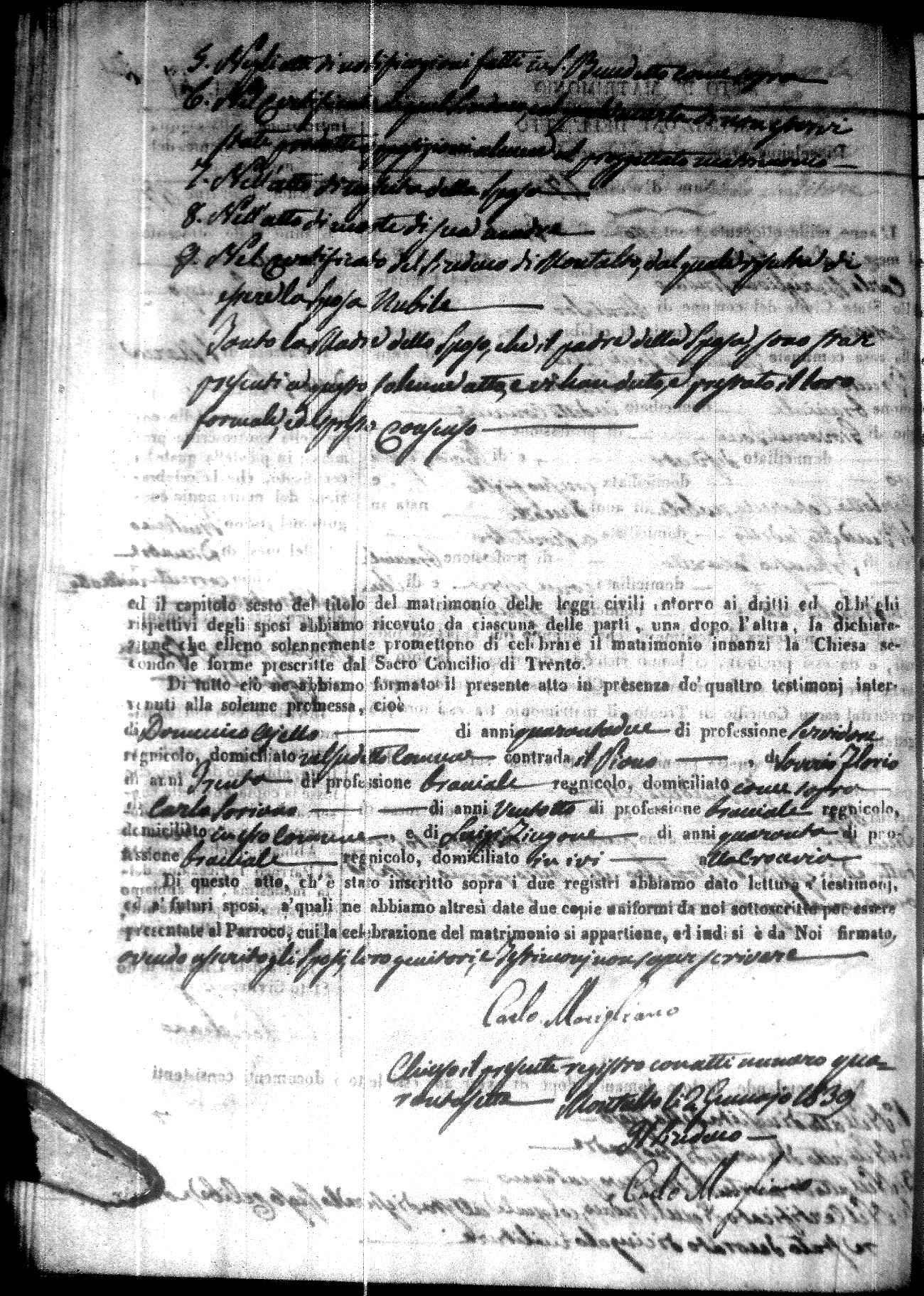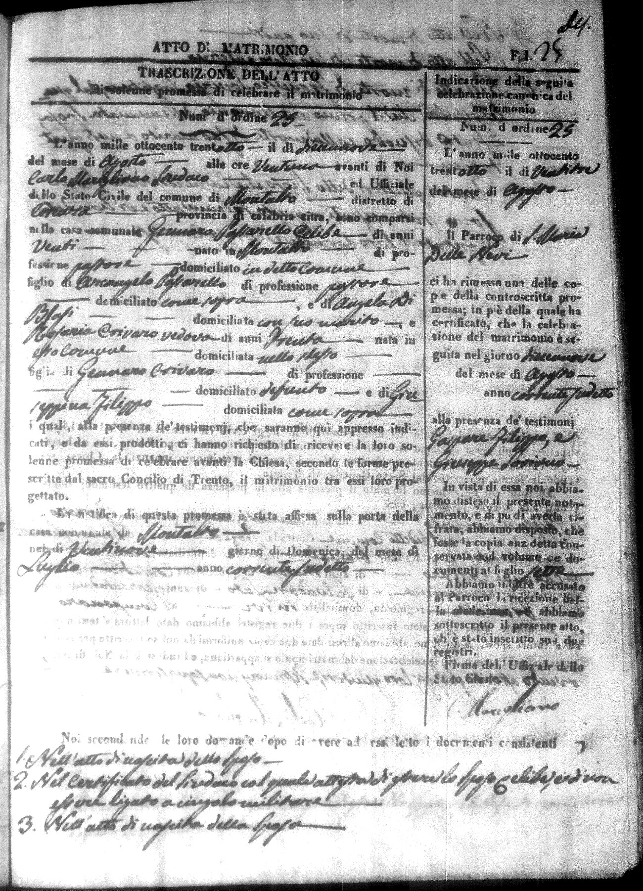 Here are the extractions for the marriage acts in 1838 for Montalto Uffugo. For more information, click on the groom's surname to view page 1 of the copy of the original document and his first name to view page 2. This year is complete.