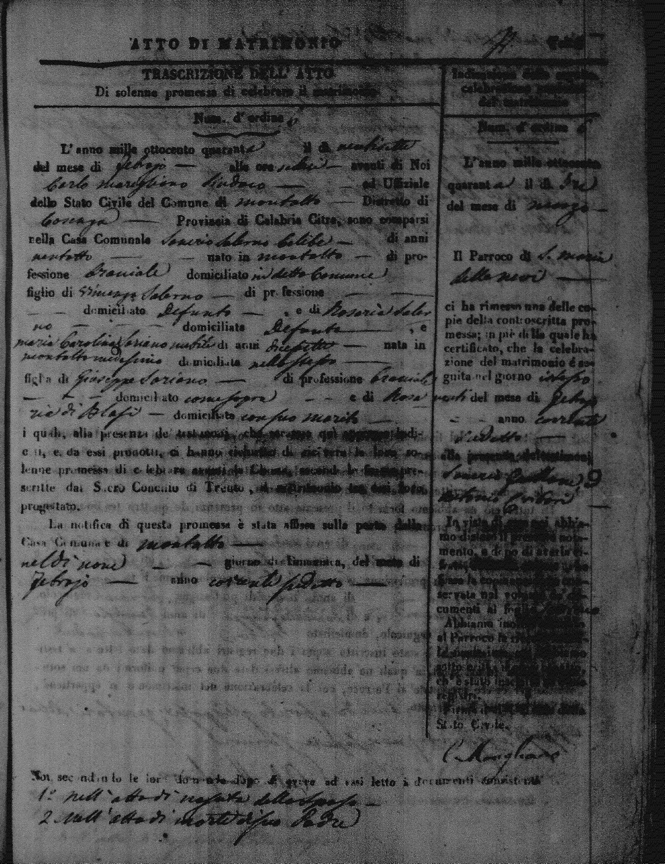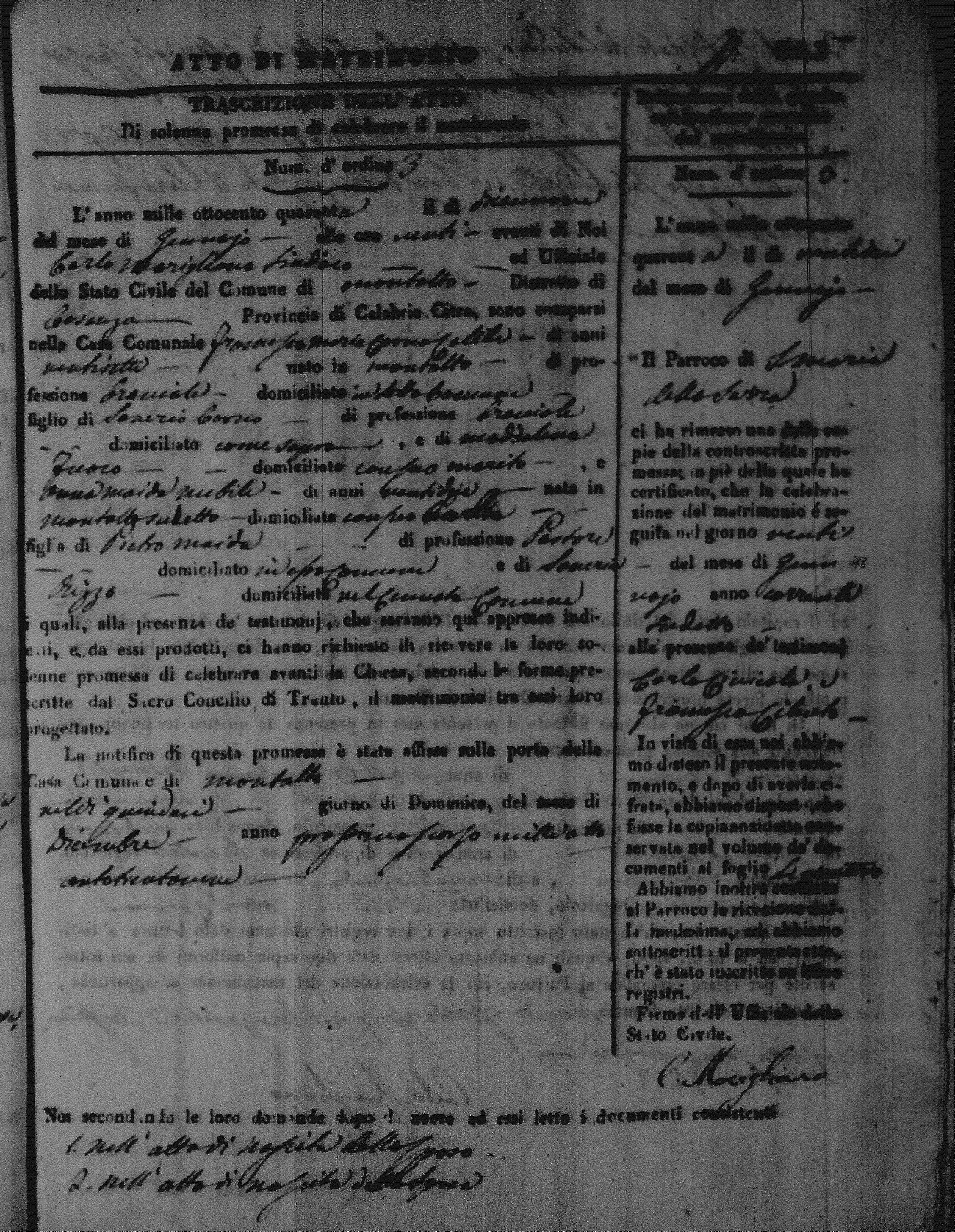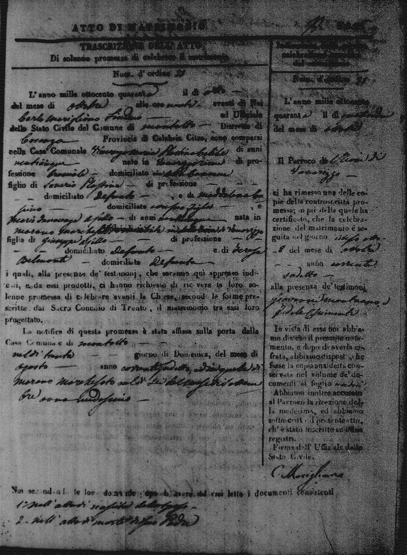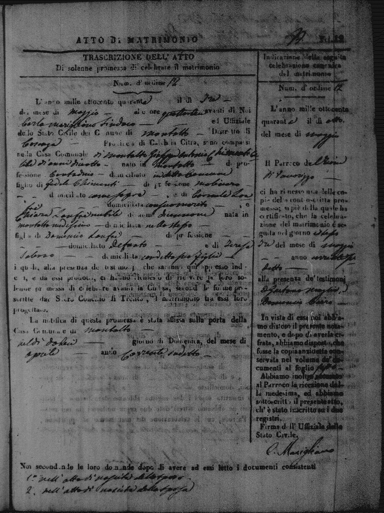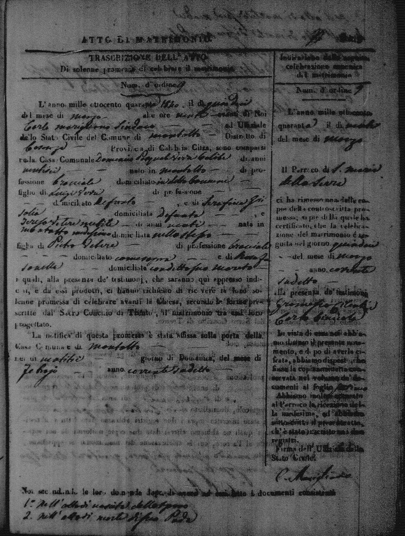 Here are the extractions for all the marriage acts in 1840 for Montalto Uffugo. For more information, click on the groom's surname to view a copy of the original document.
