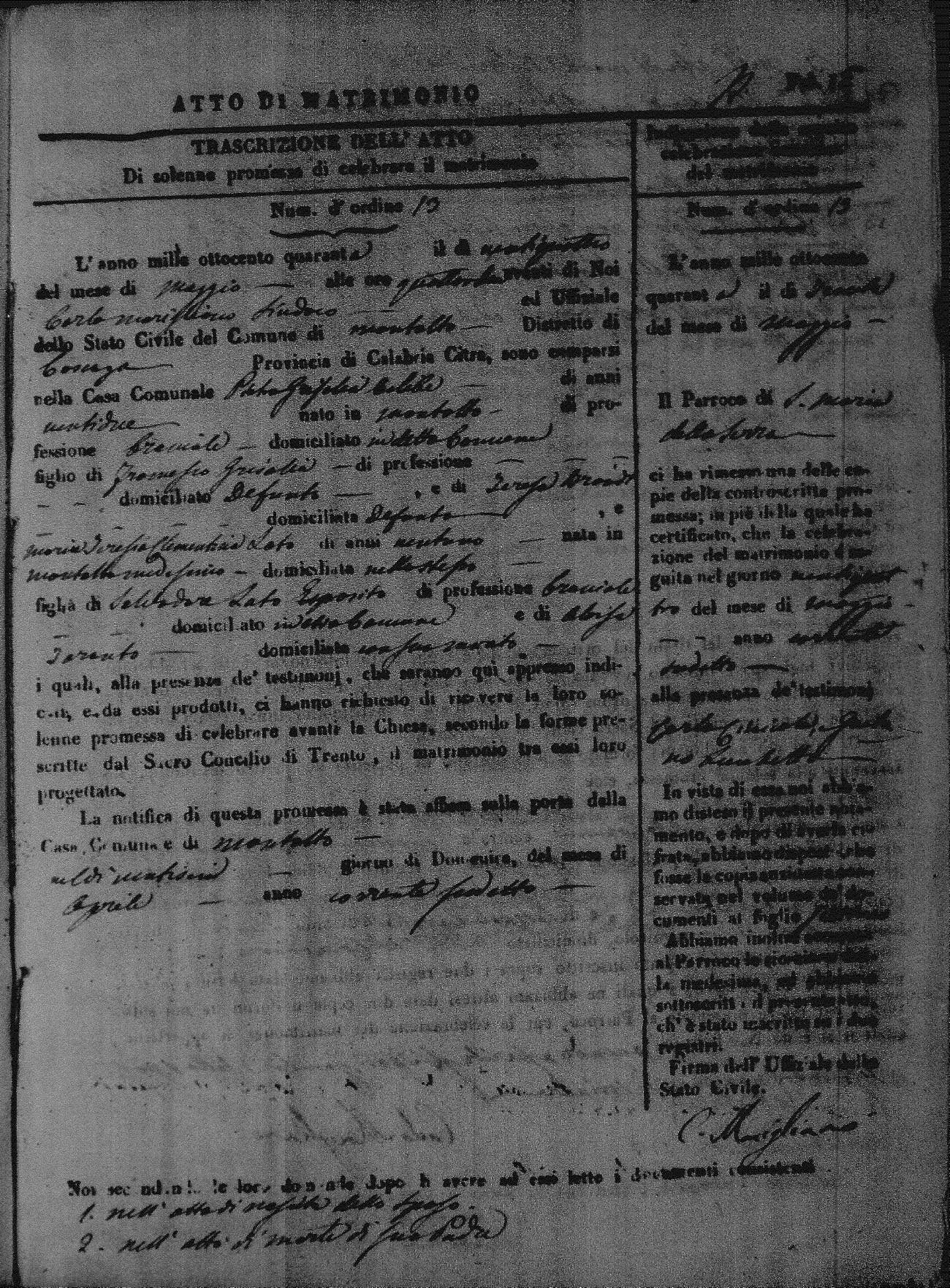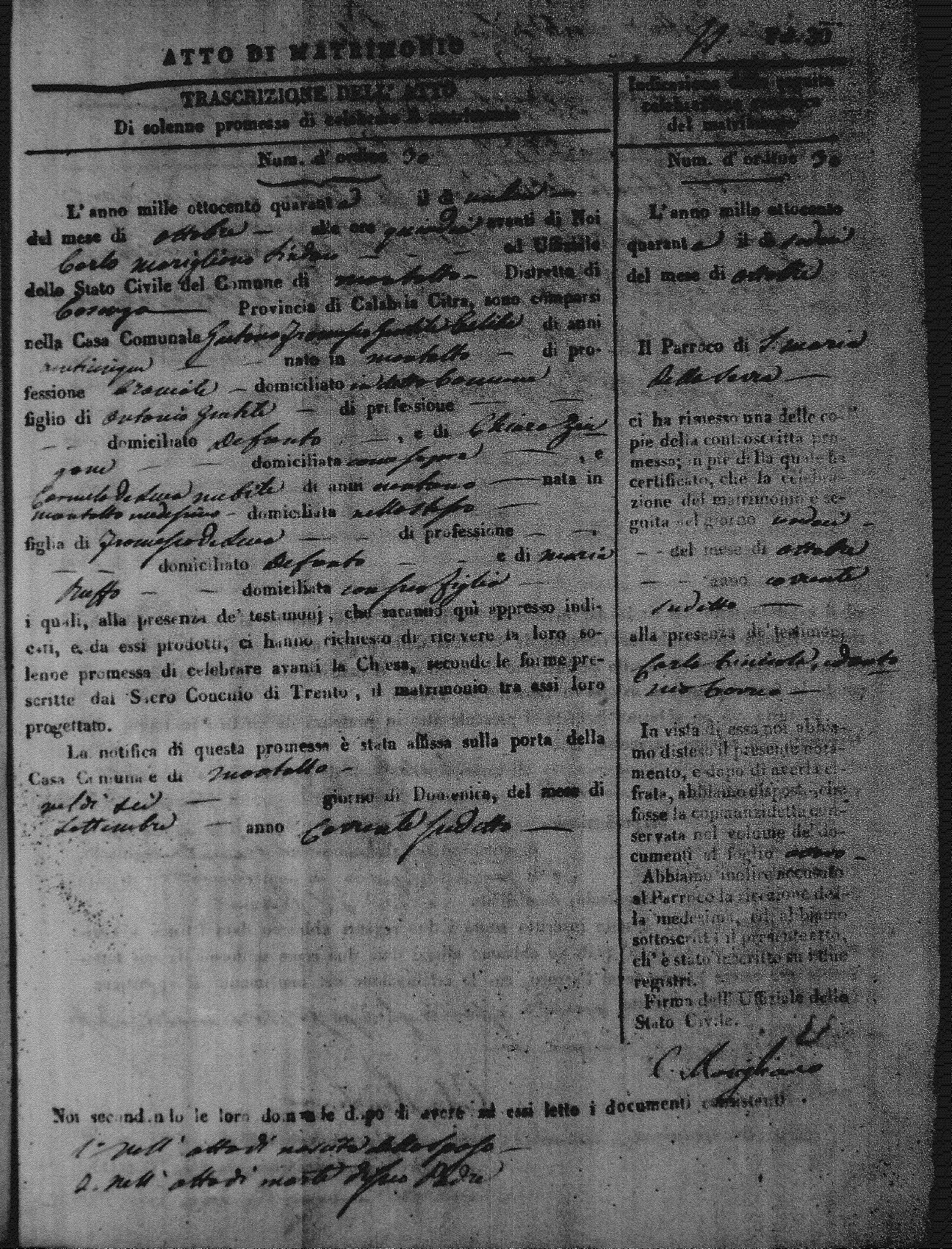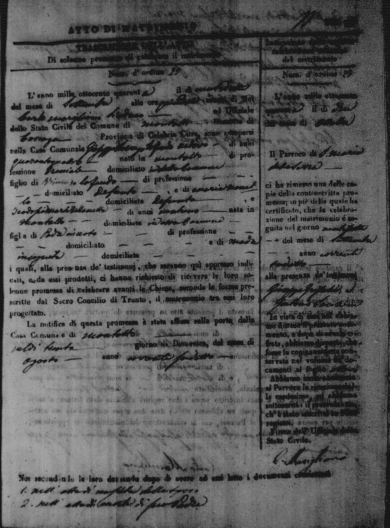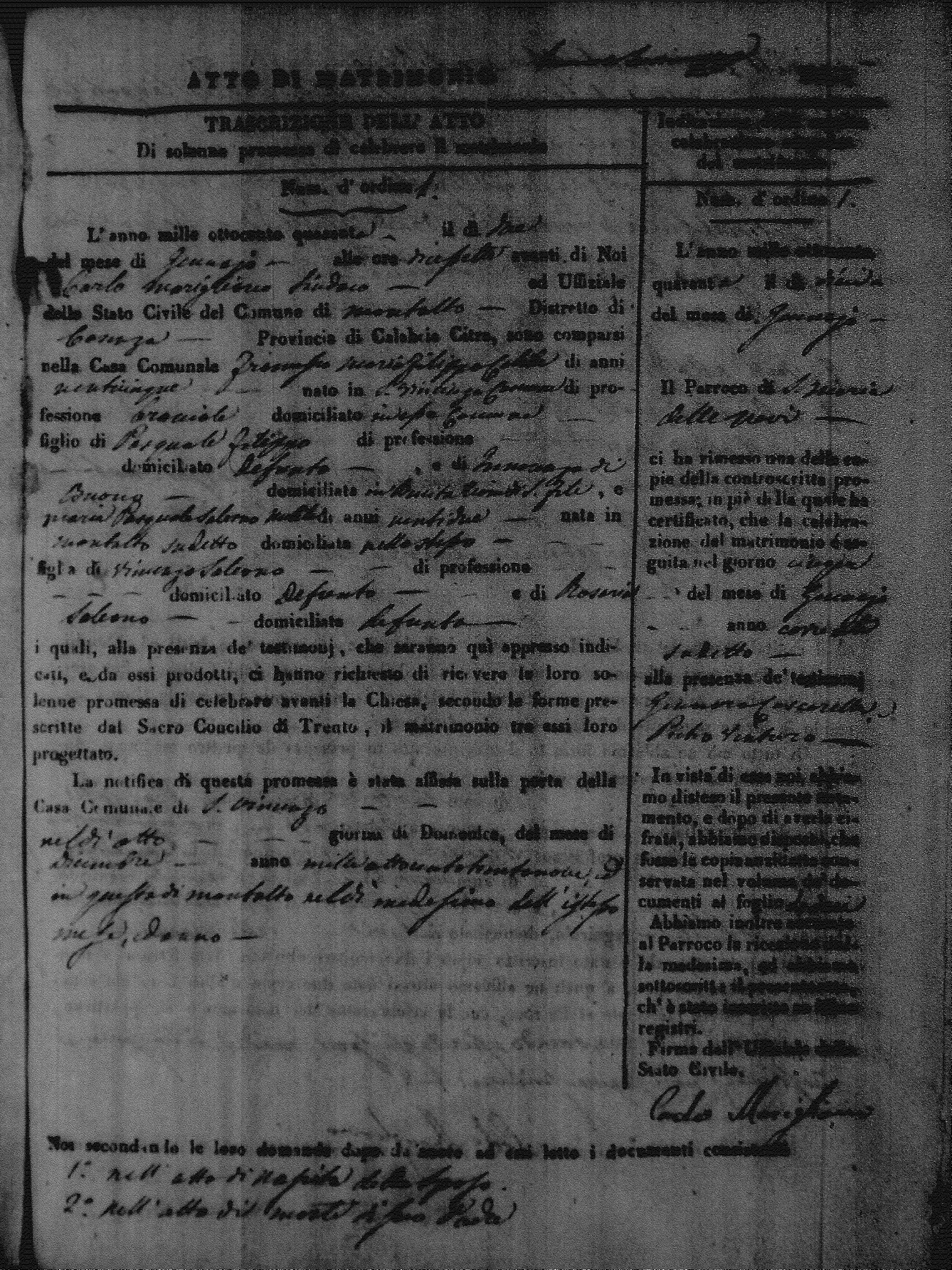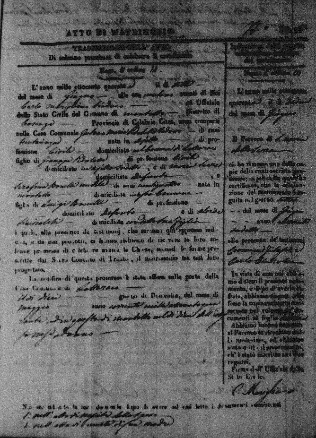 Here are the extractions for all the marriage acts in 1840 for Montalto Uffugo. For more information, click on the groom's surname to view a copy of the original document.