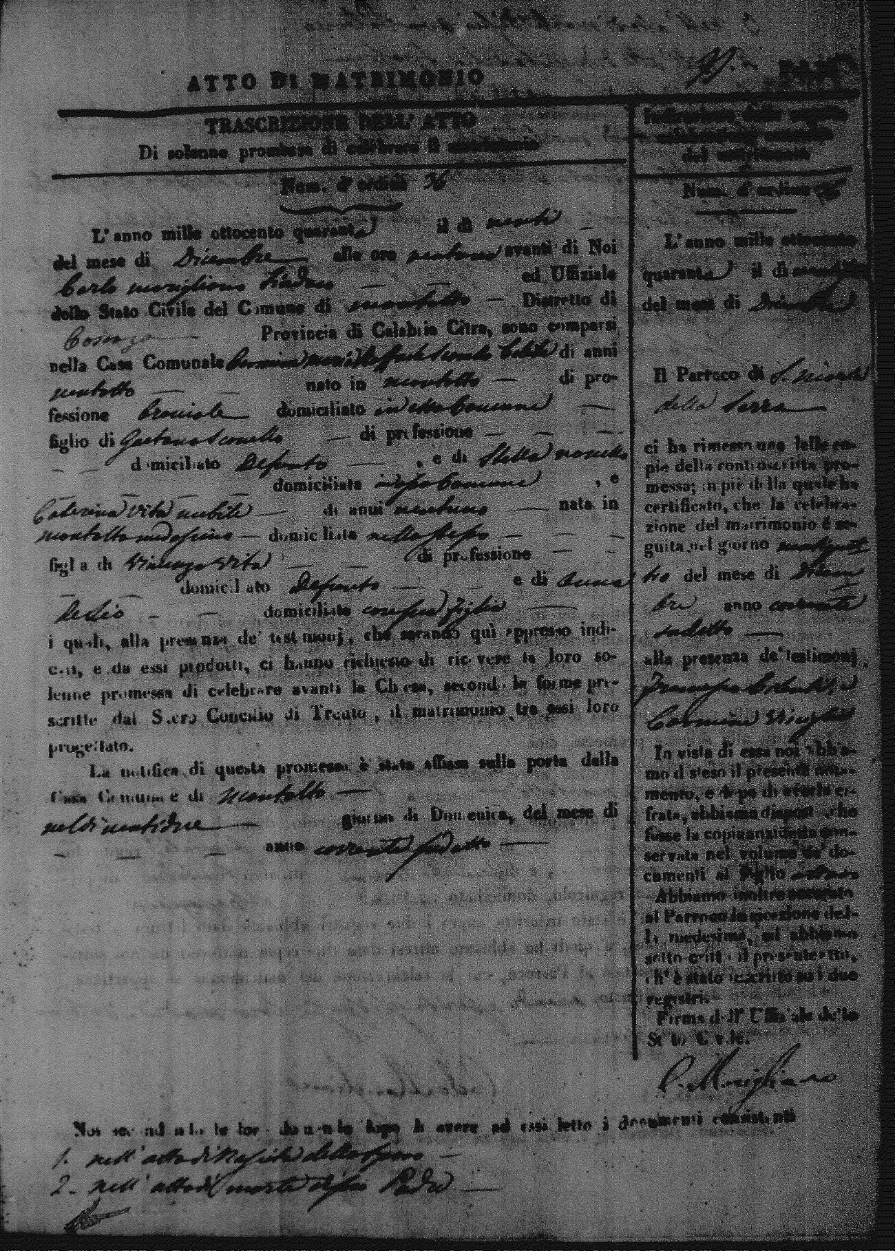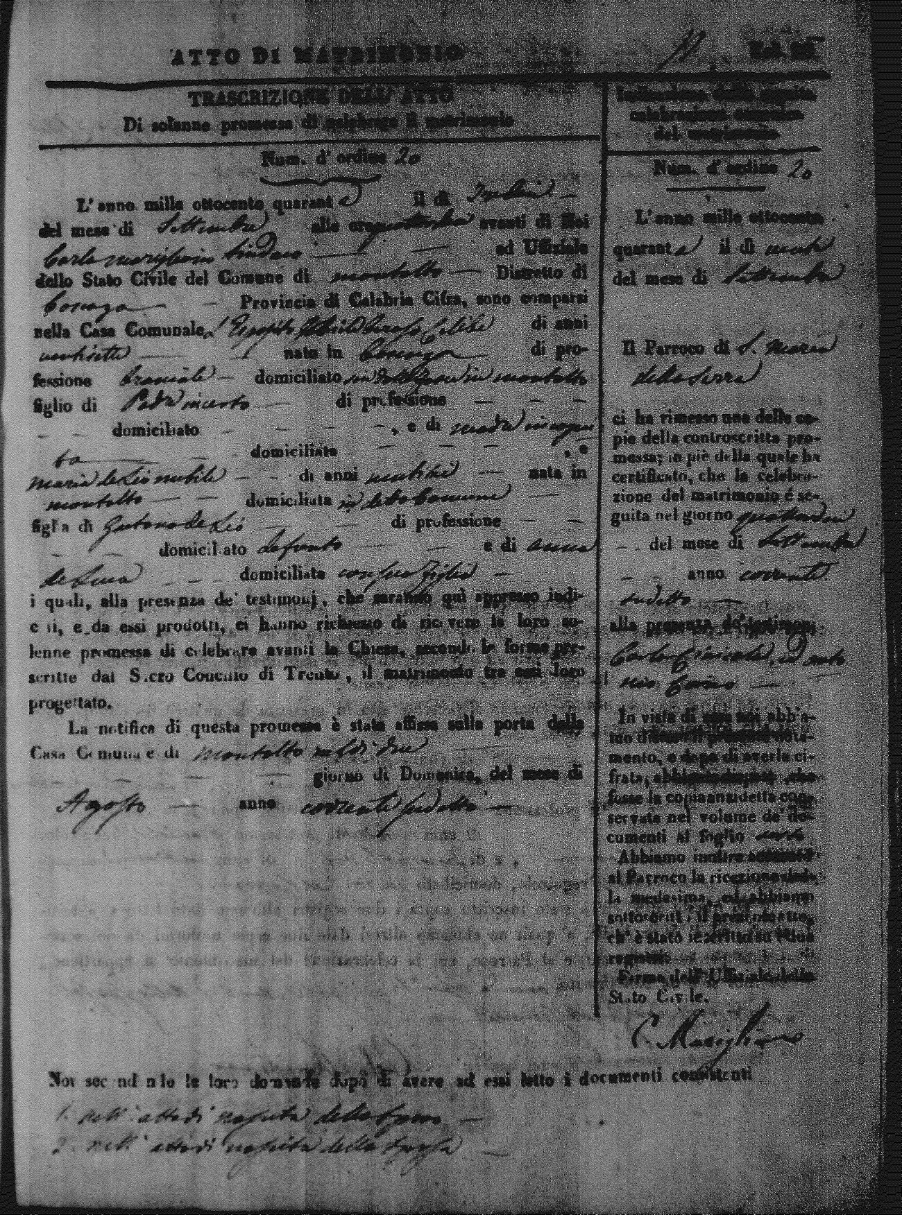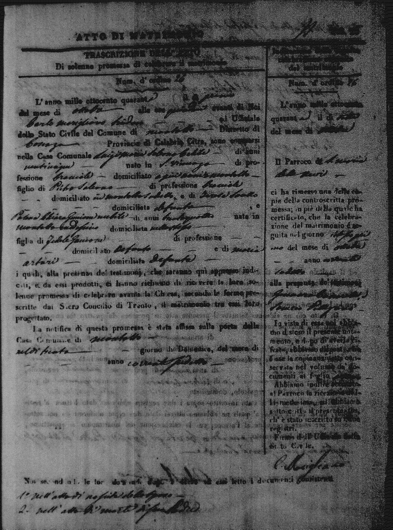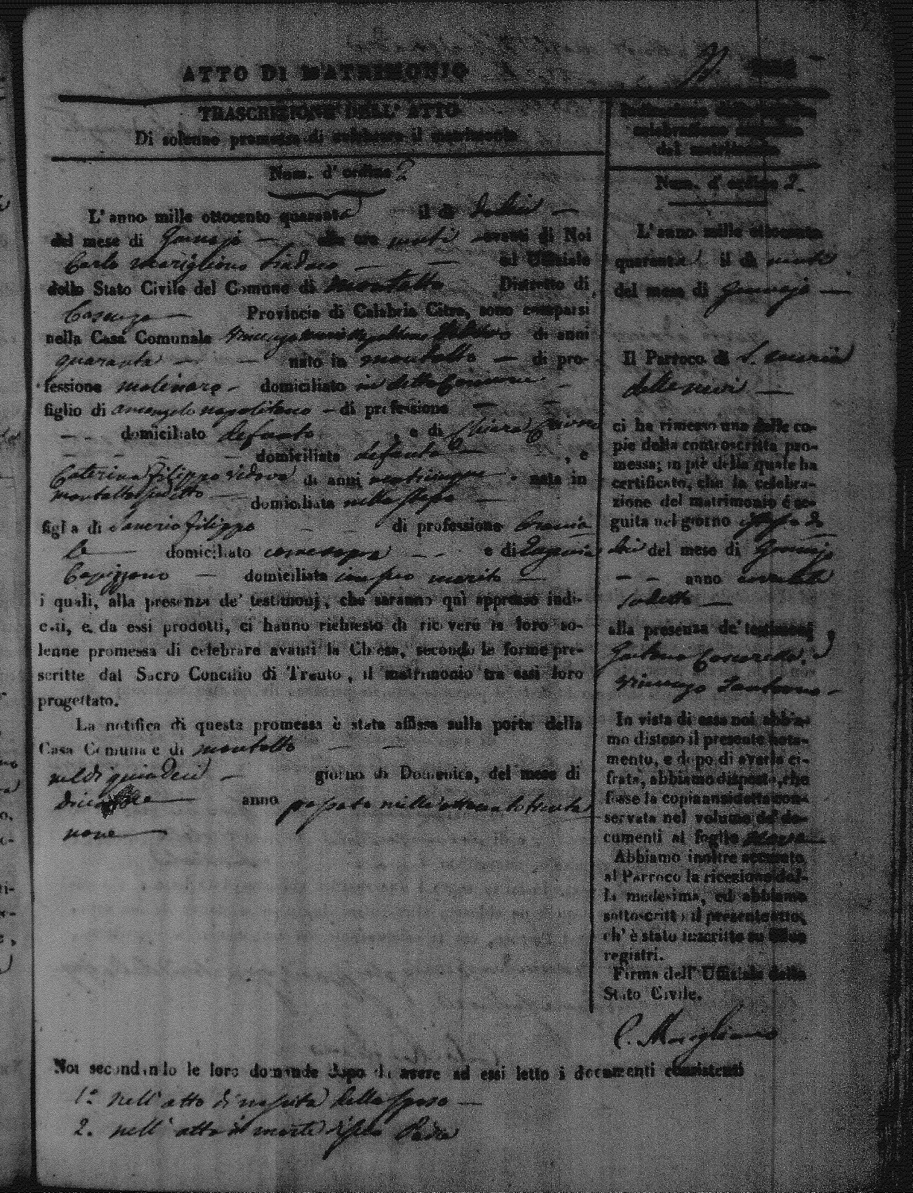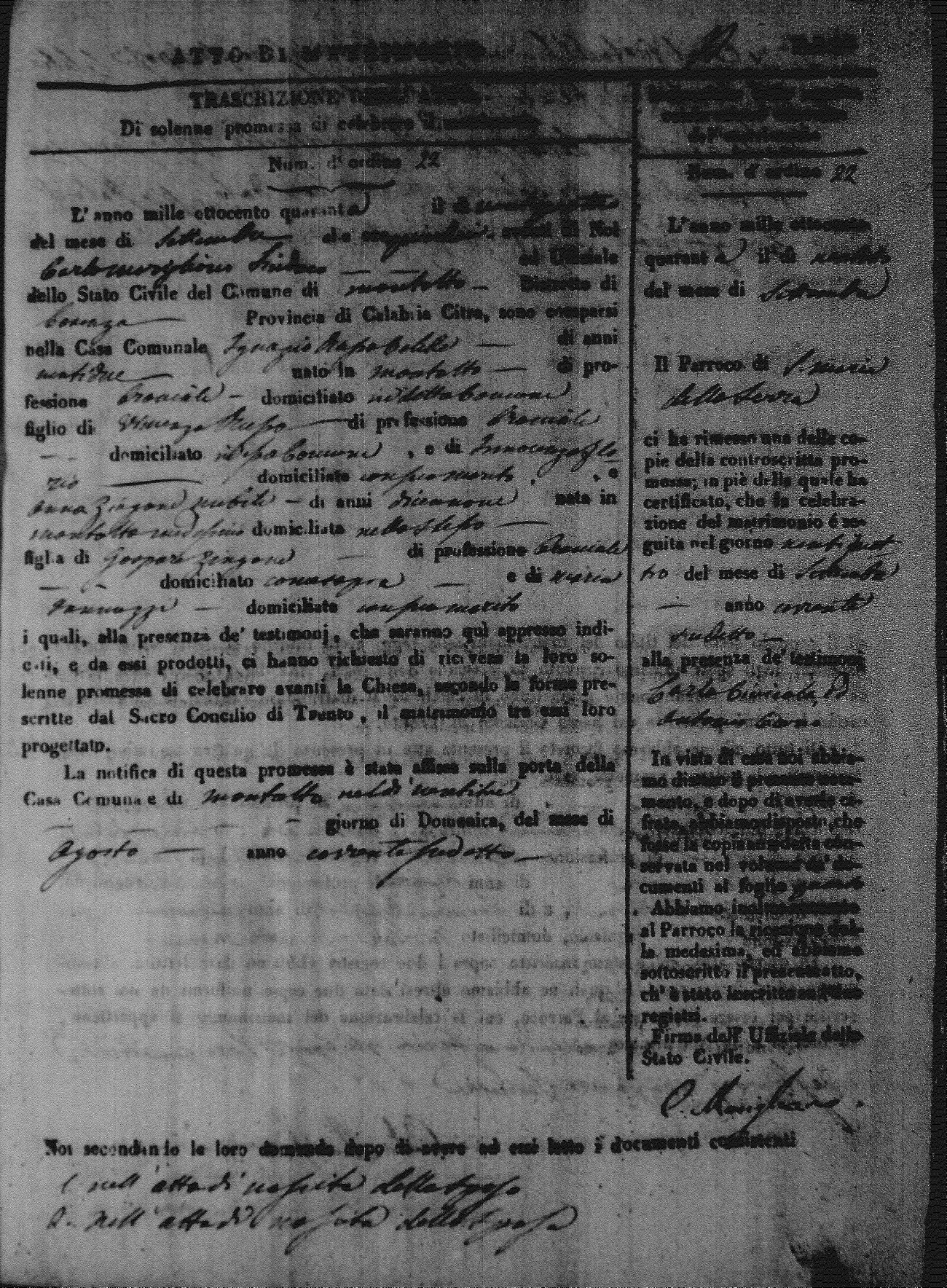 Here are the extractions for all the marriage acts in 1840 for Montalto Uffugo. For more information, click on the groom's surname to view a copy of the original document.