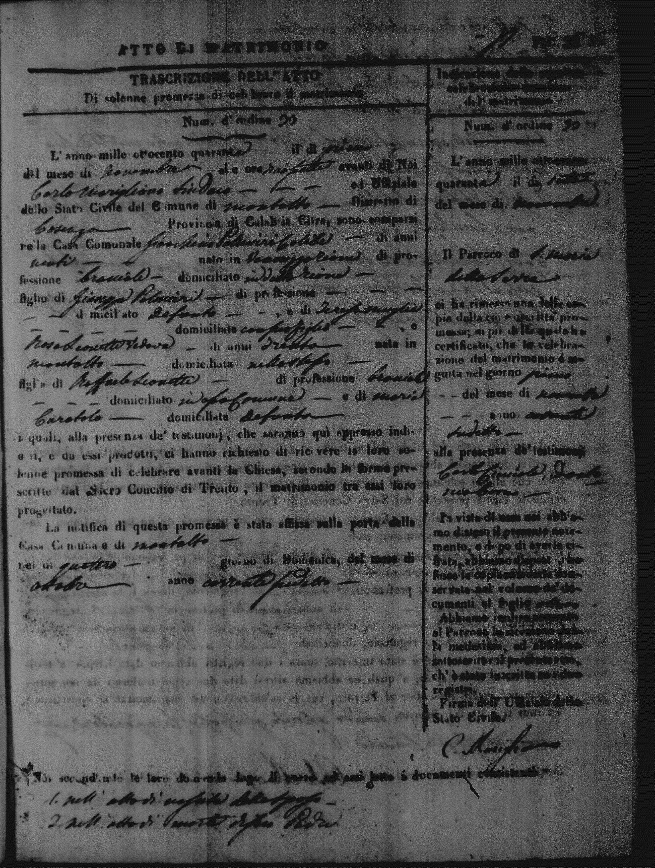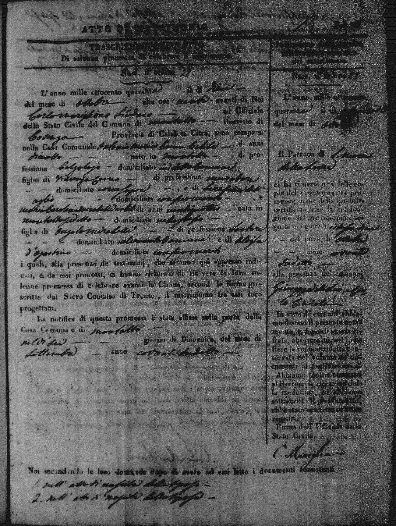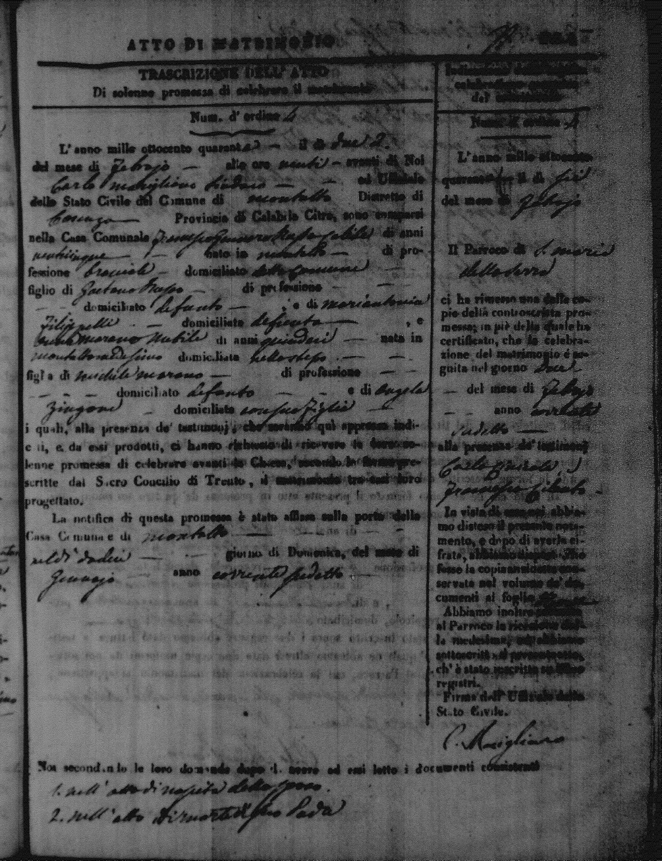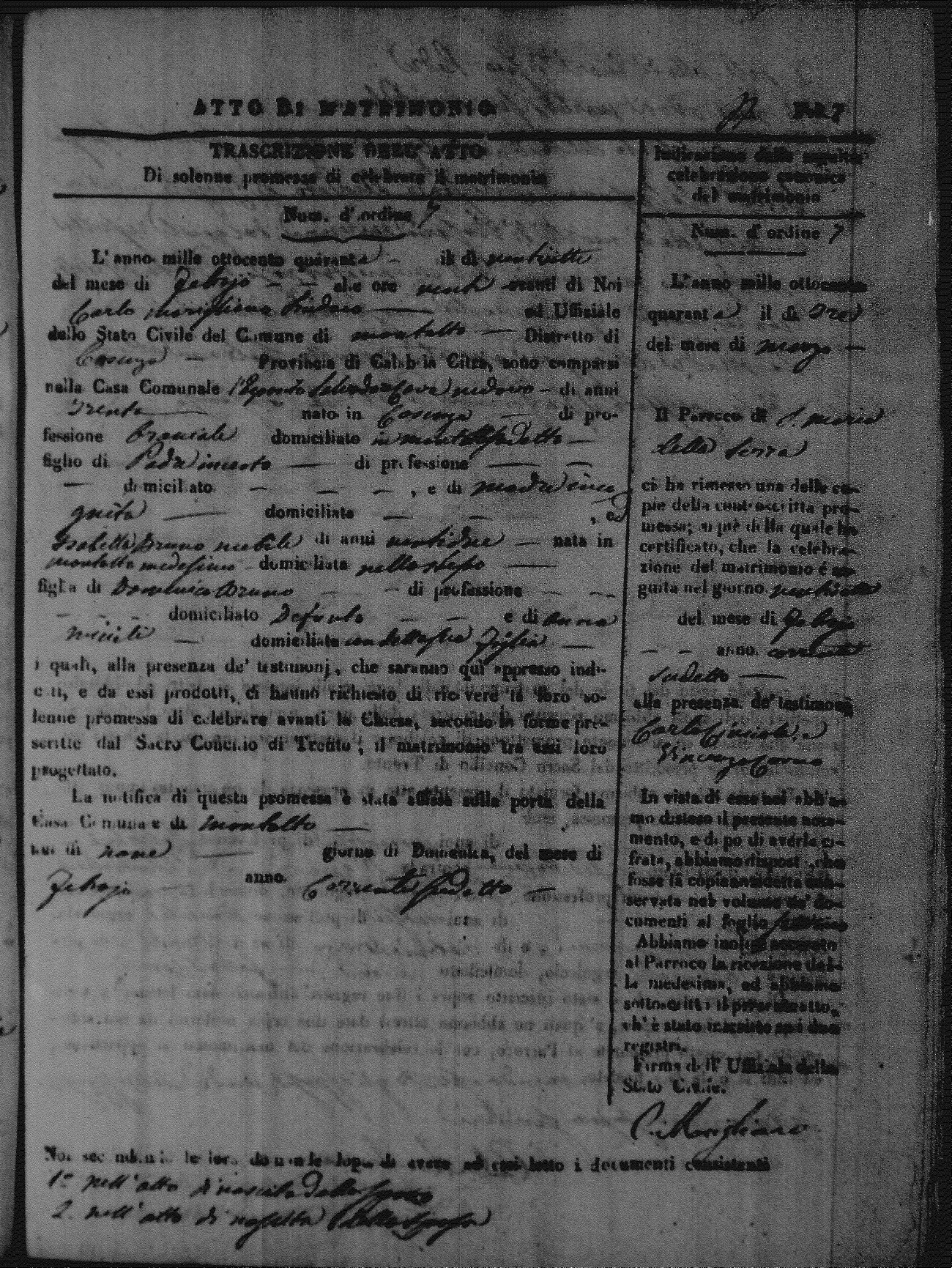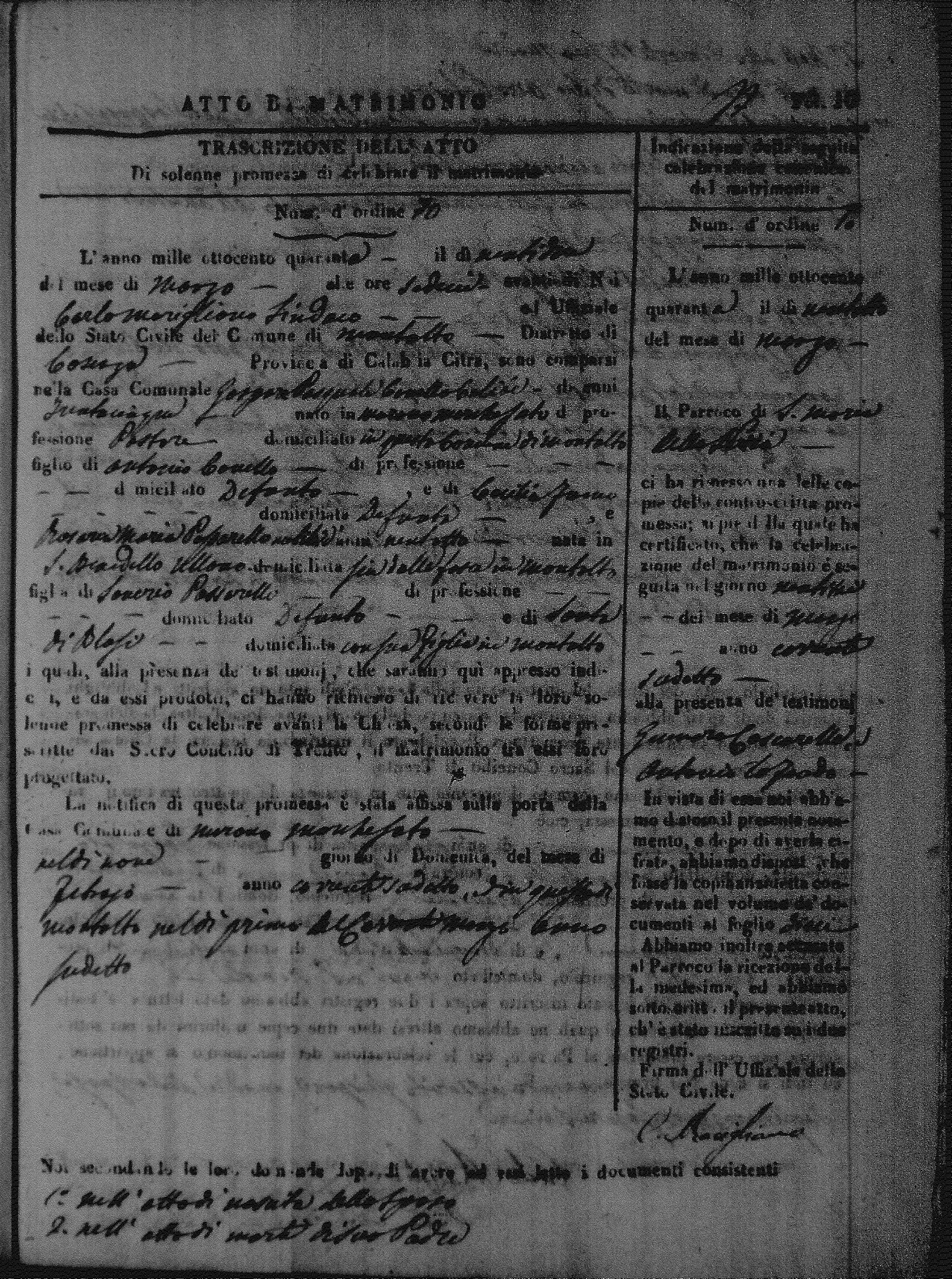 Here are the extractions for all the marriage acts in 1840 for Montalto Uffugo. For more information, click on the groom's surname to view a copy of the original document.