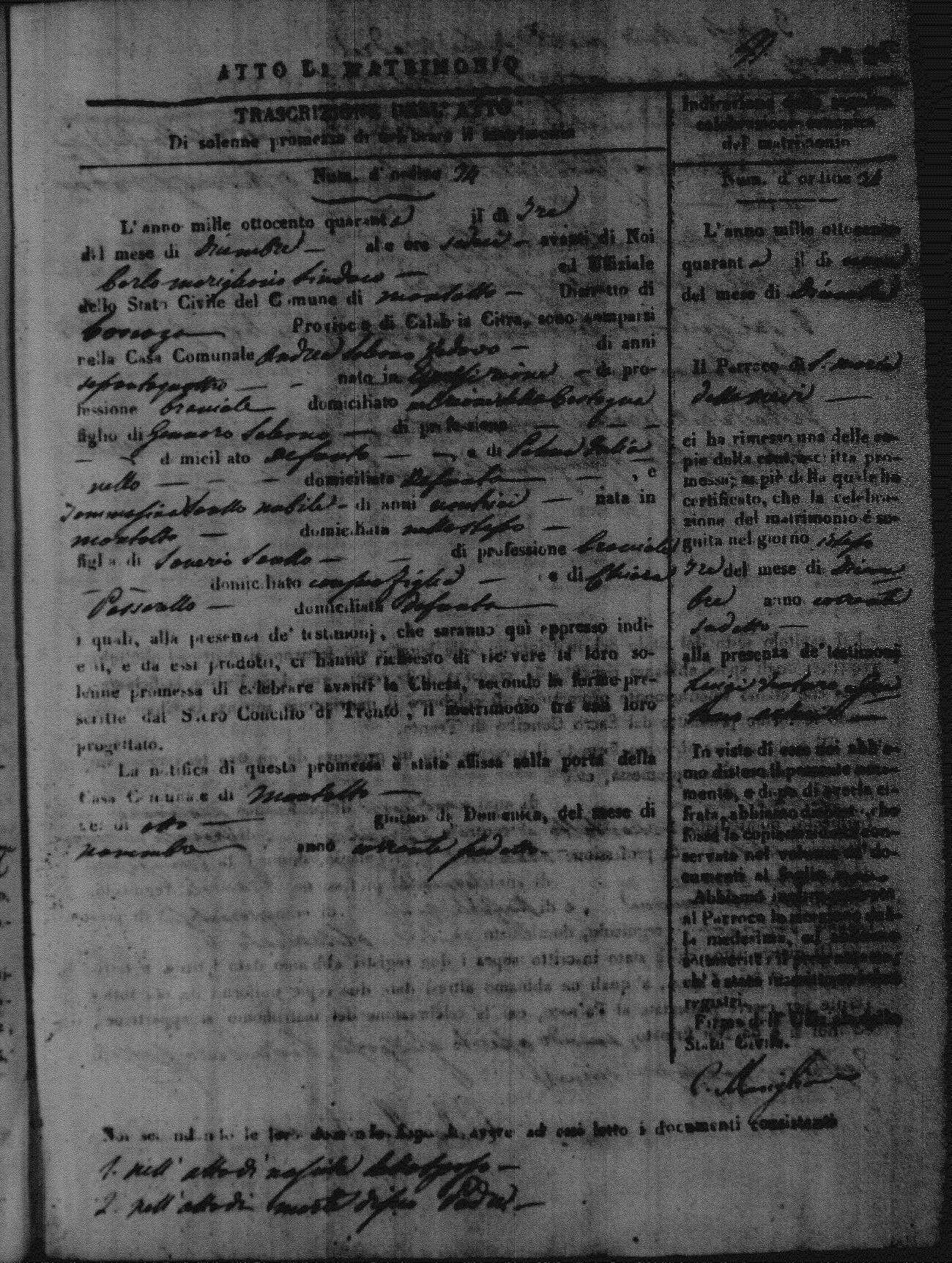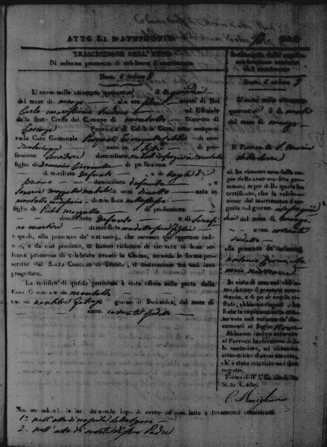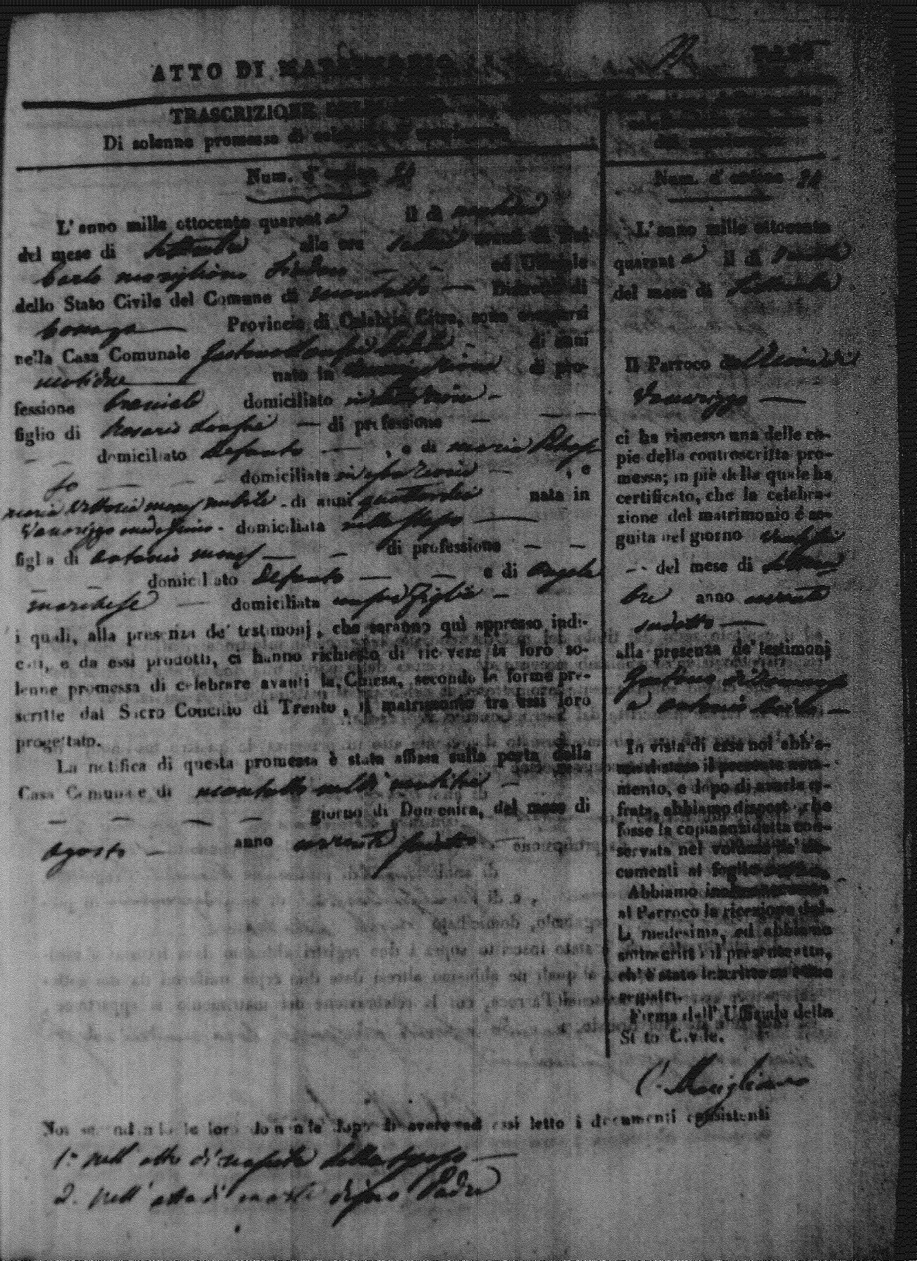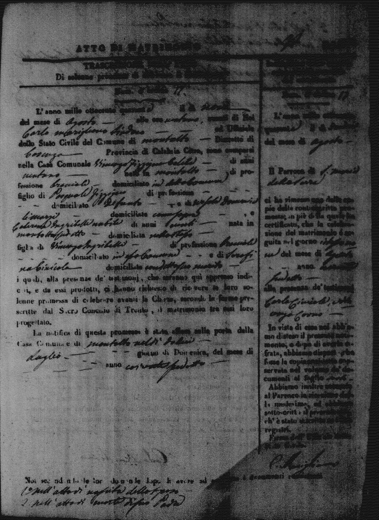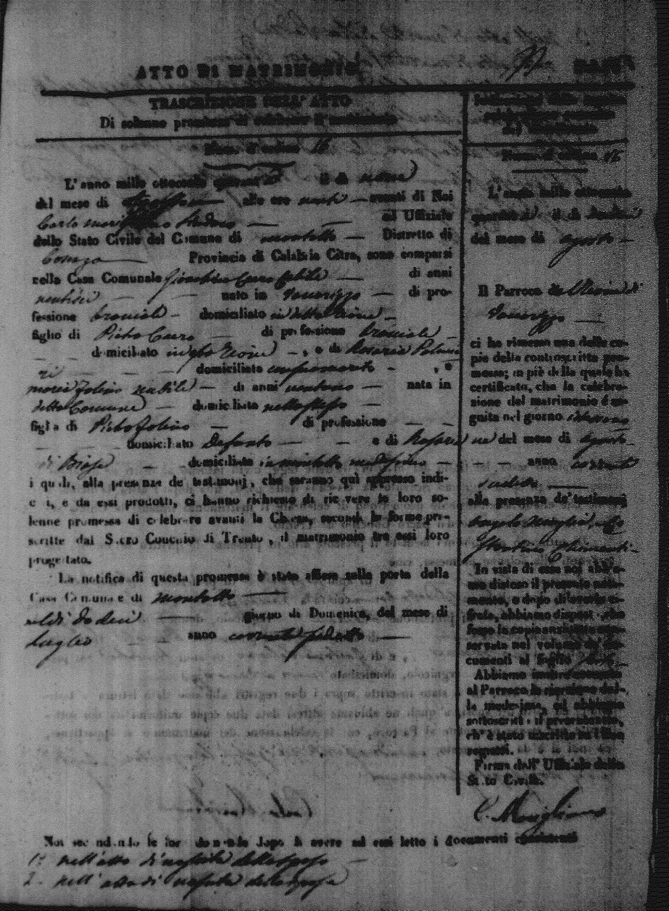 Here are the extractions for all the marriage acts in 1840 for Montalto Uffugo. For more information, click on the groom's surname to view a copy of the original document.
