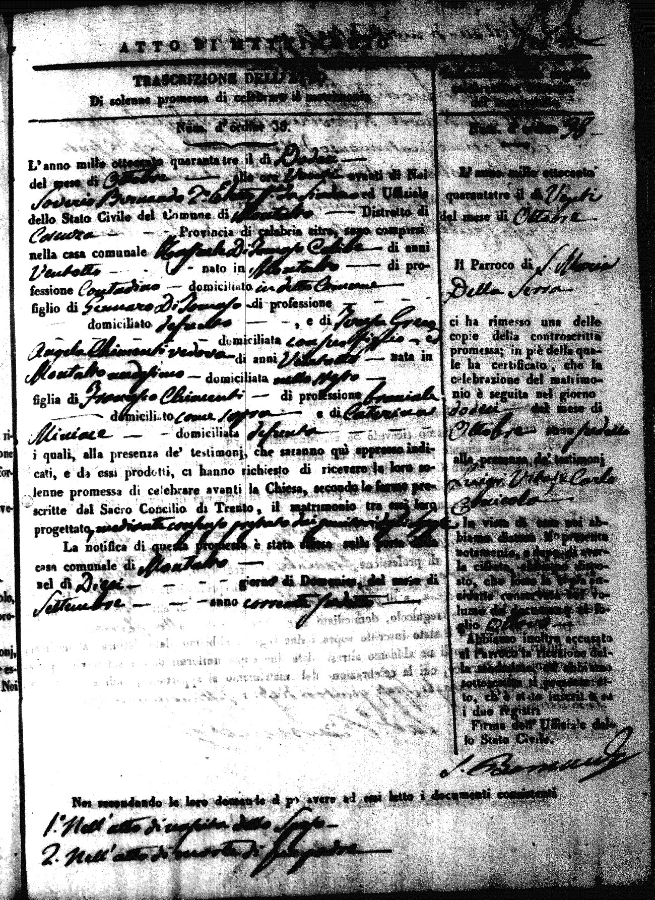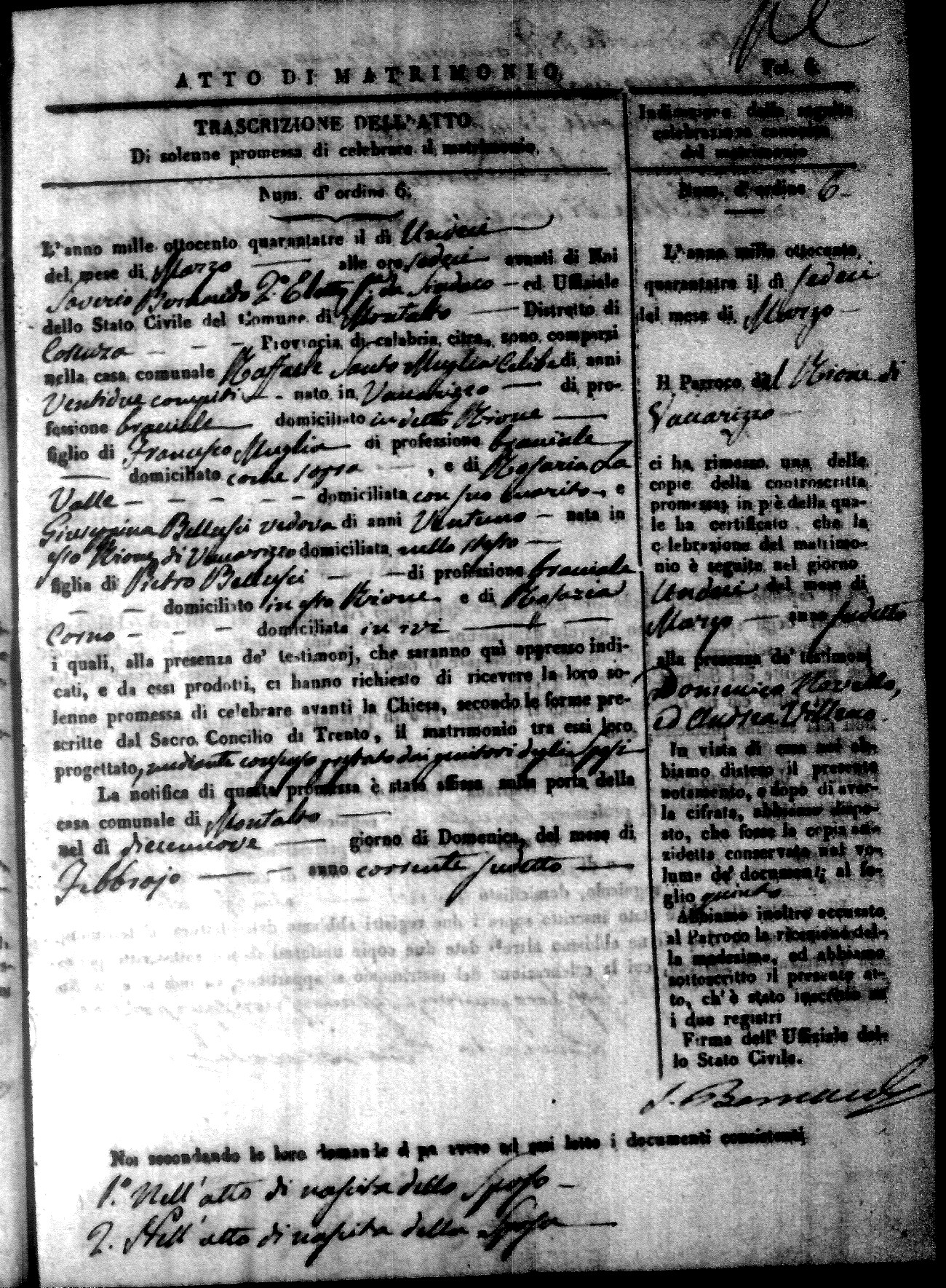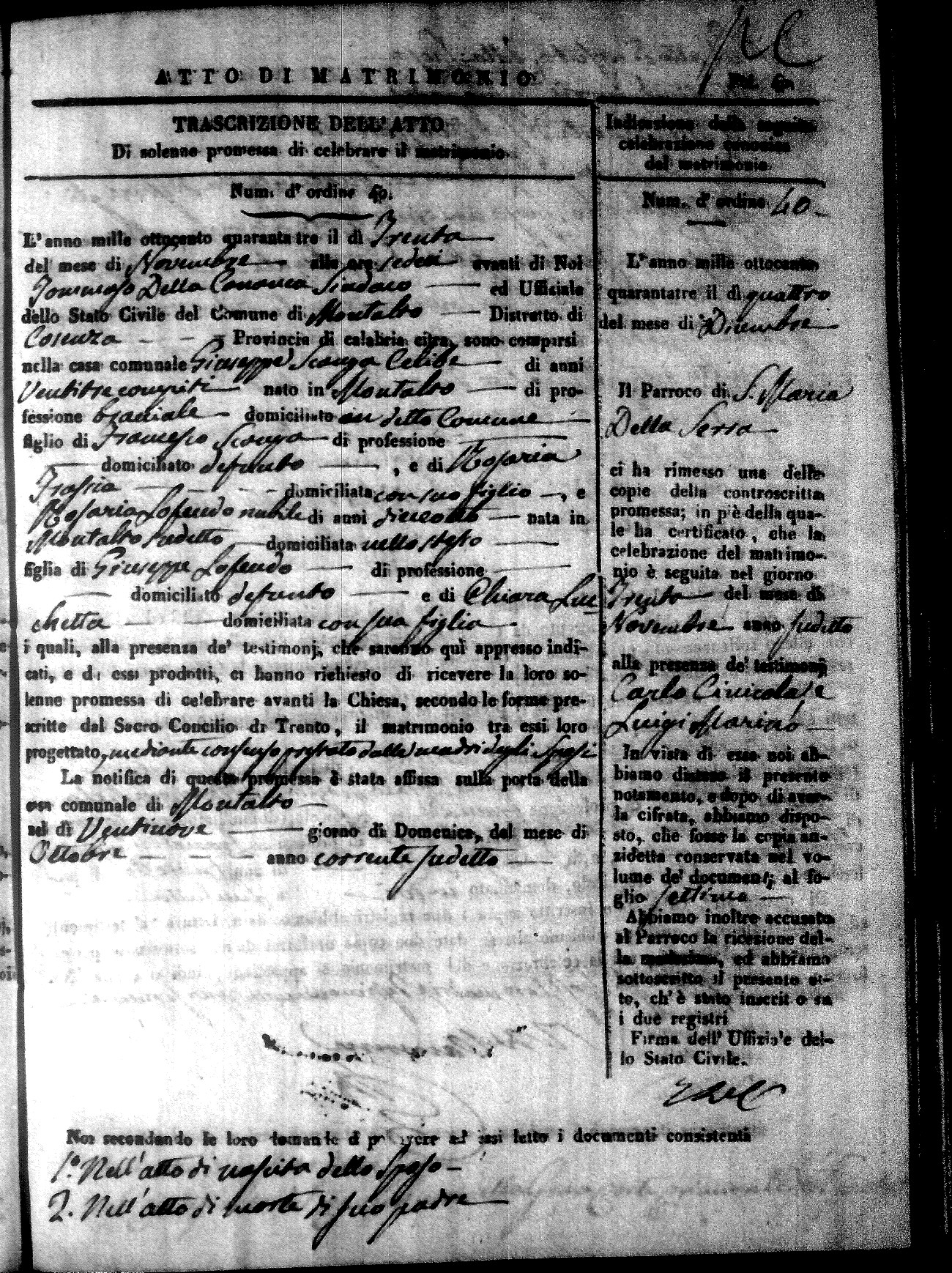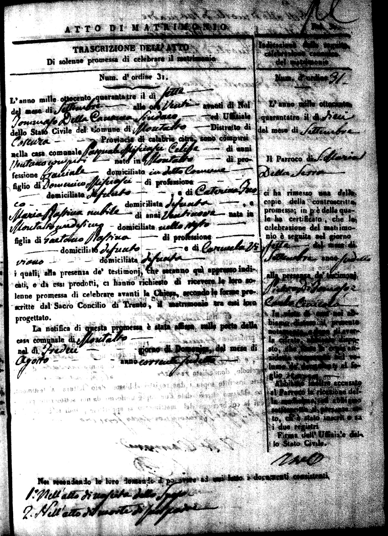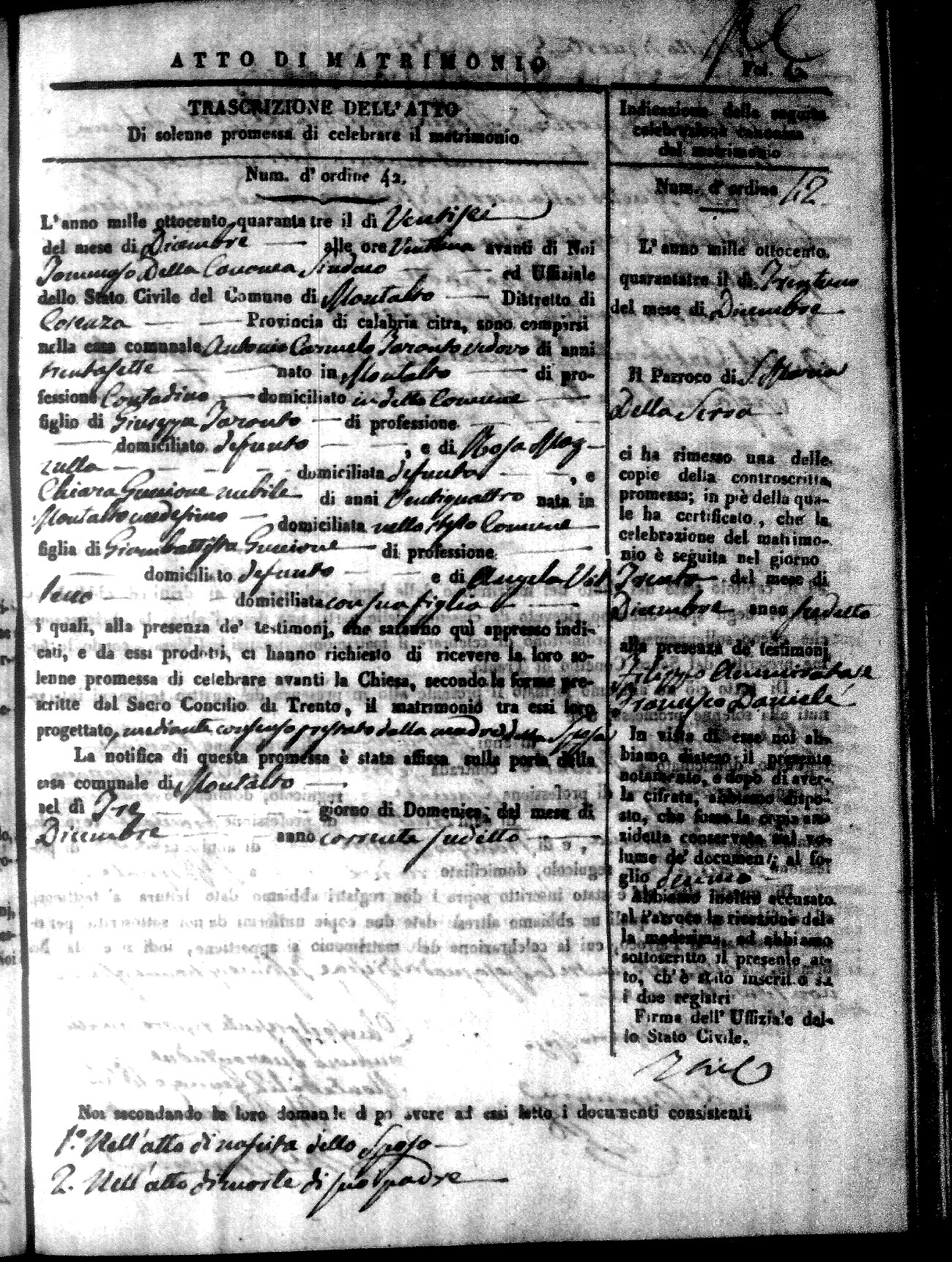 Here are the extractions for all the marriage acts in 1843 for Montalto Uffugo. This year is not complete yet, however it will be complete within a week. For more information, click on the groom's surname to view a copy of the original document.
