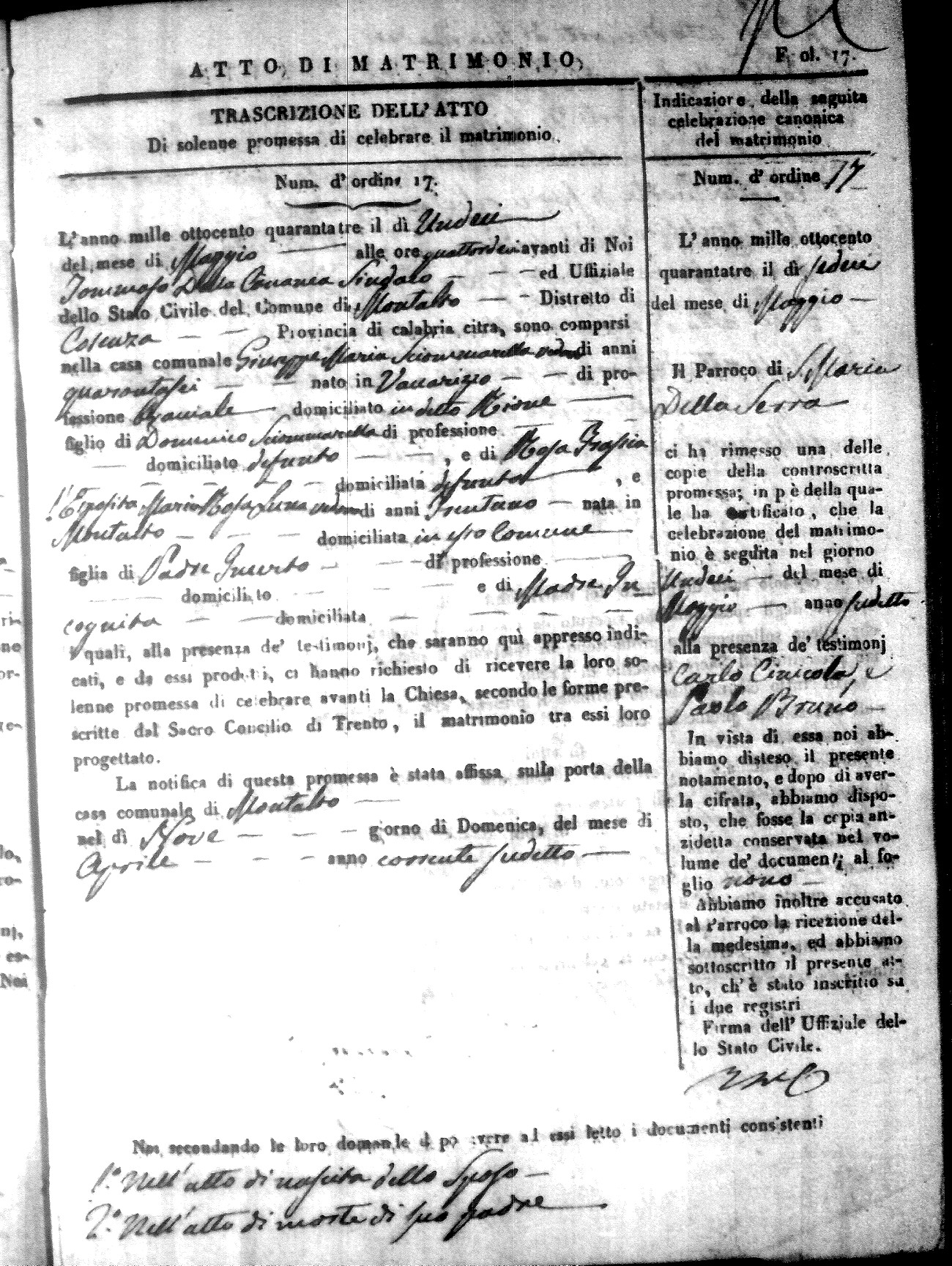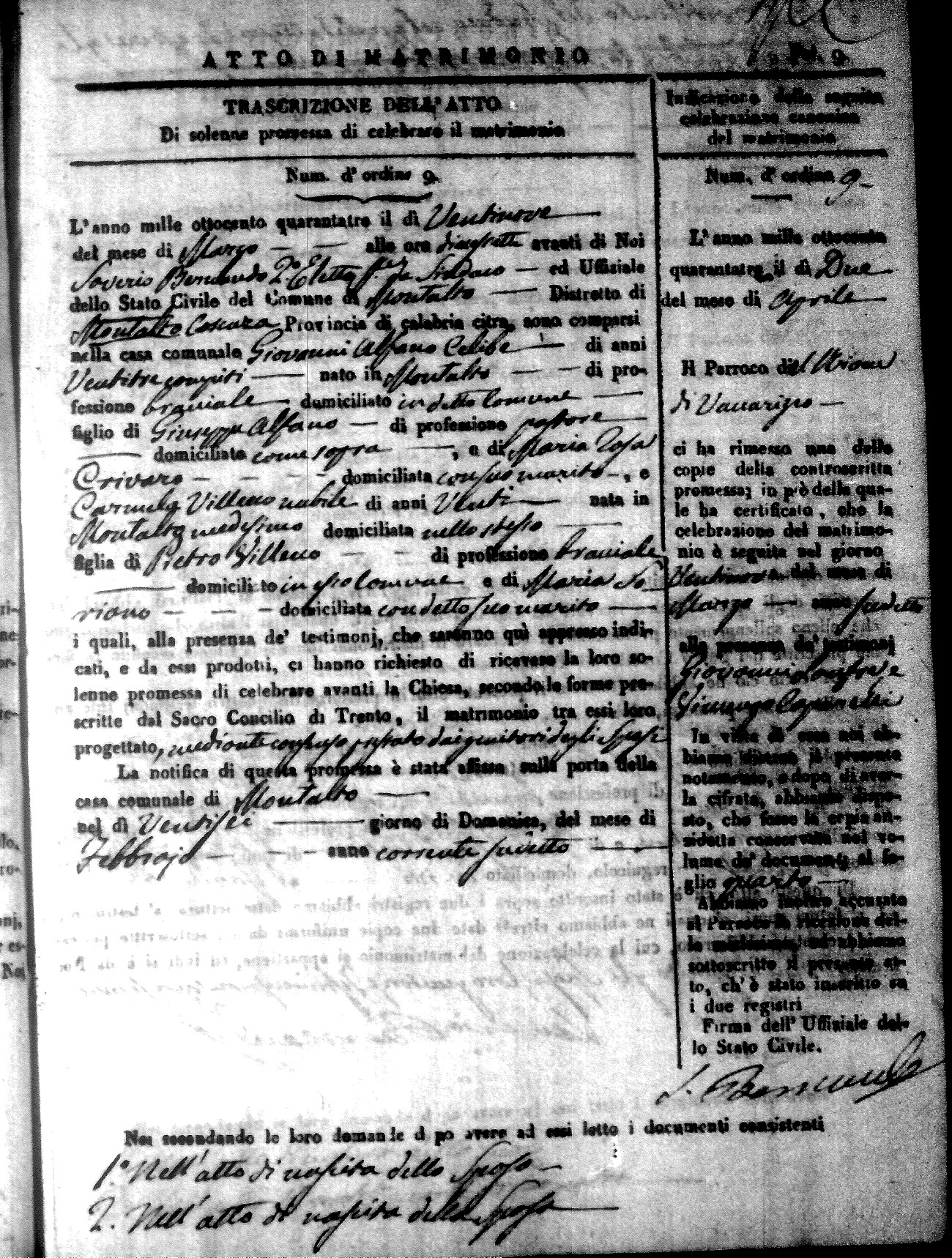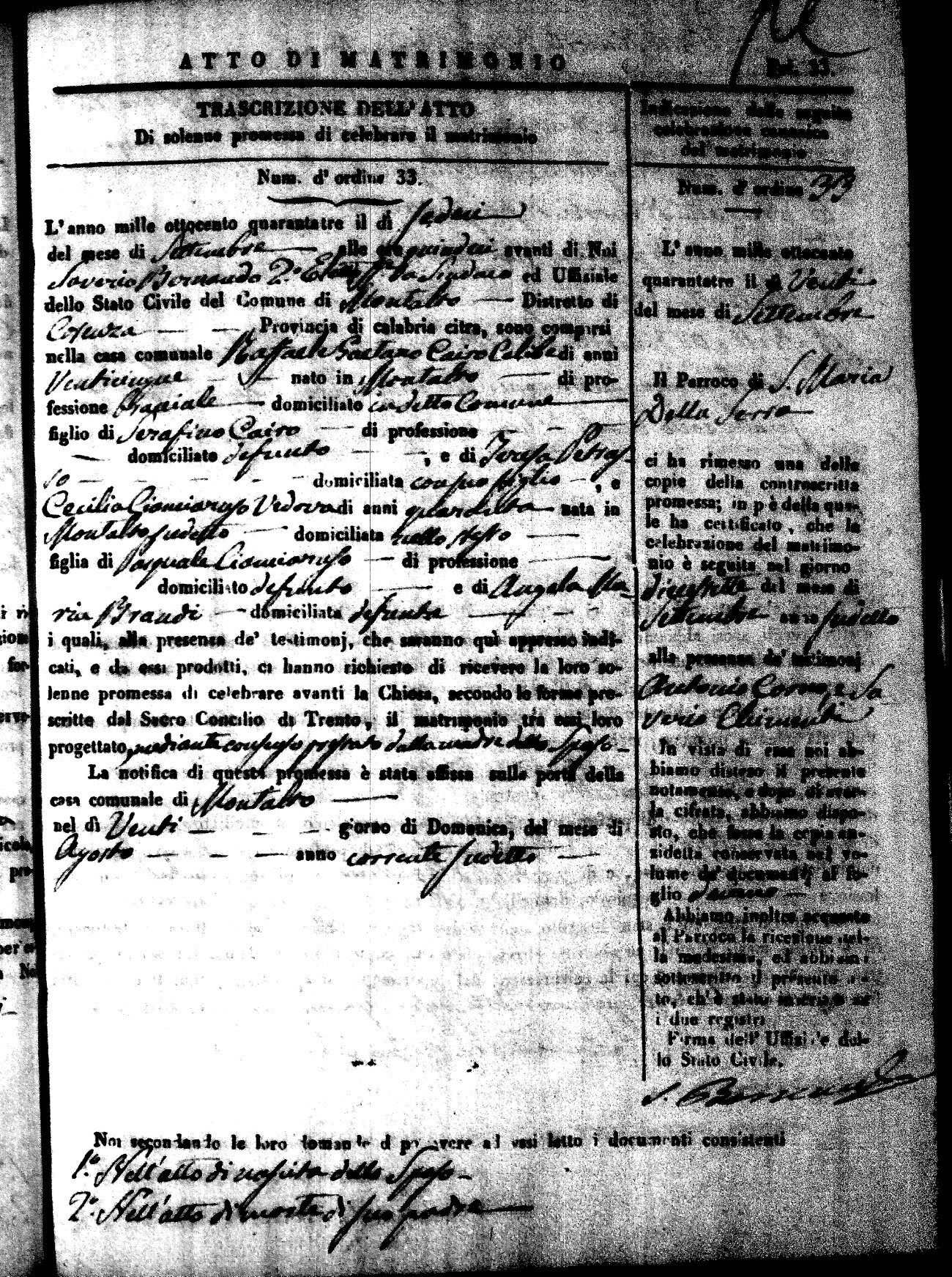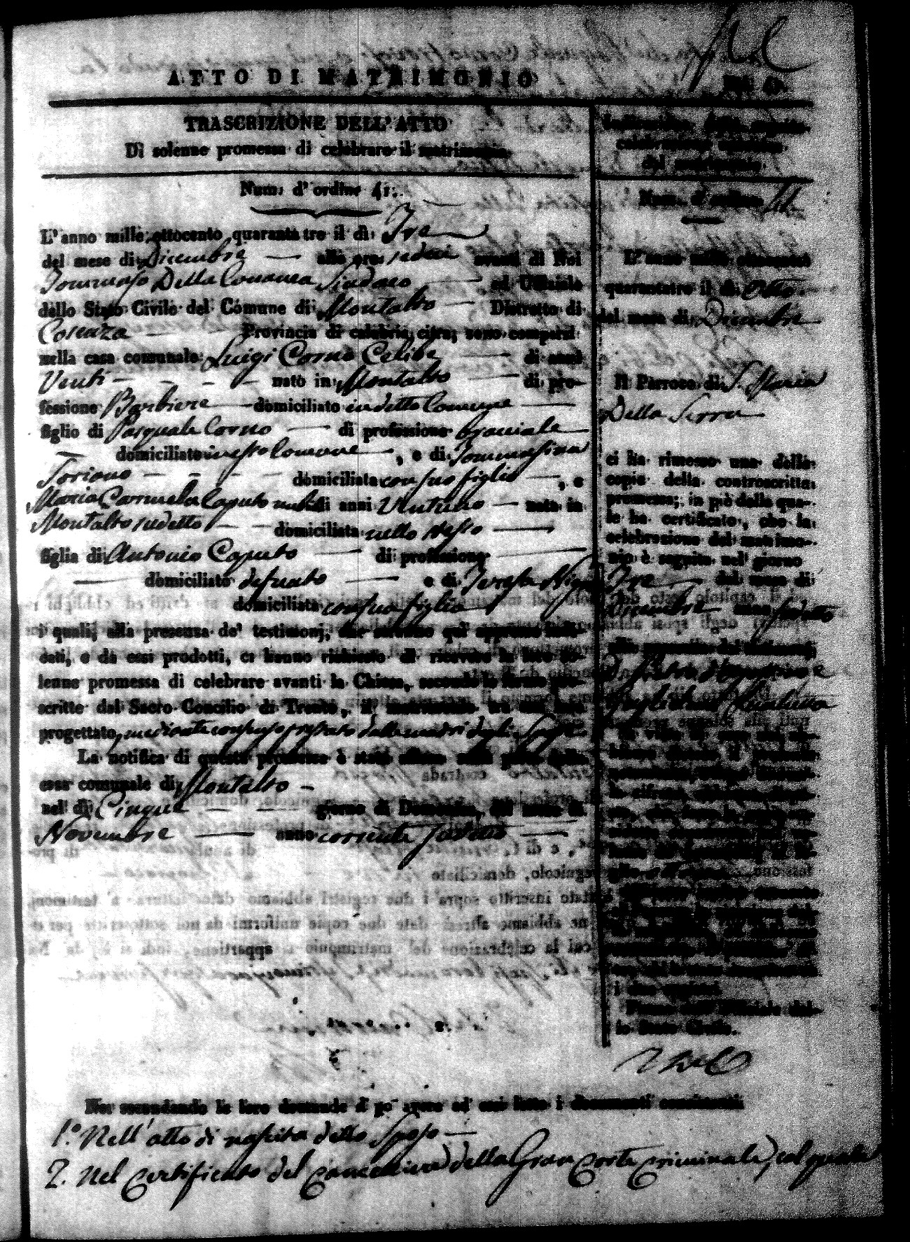 Here are the extractions for all the marriage acts in 1843 for Montalto Uffugo. This year is not complete yet, however it will be complete within a week. For more information, click on the groom's surname to view a copy of the original document.