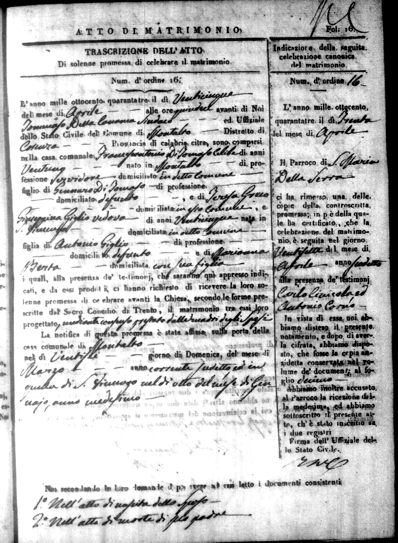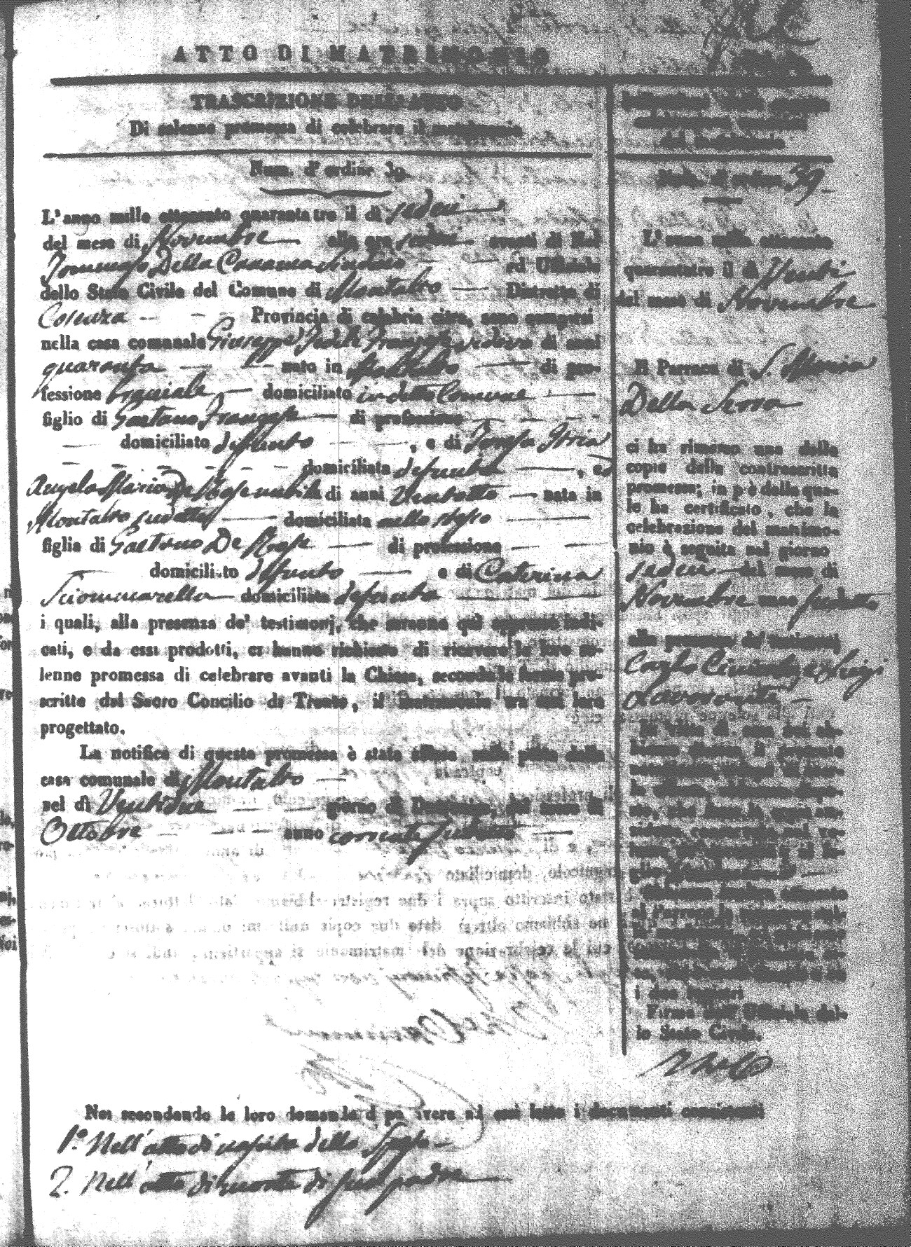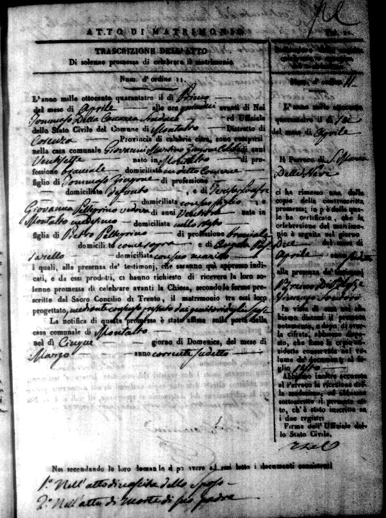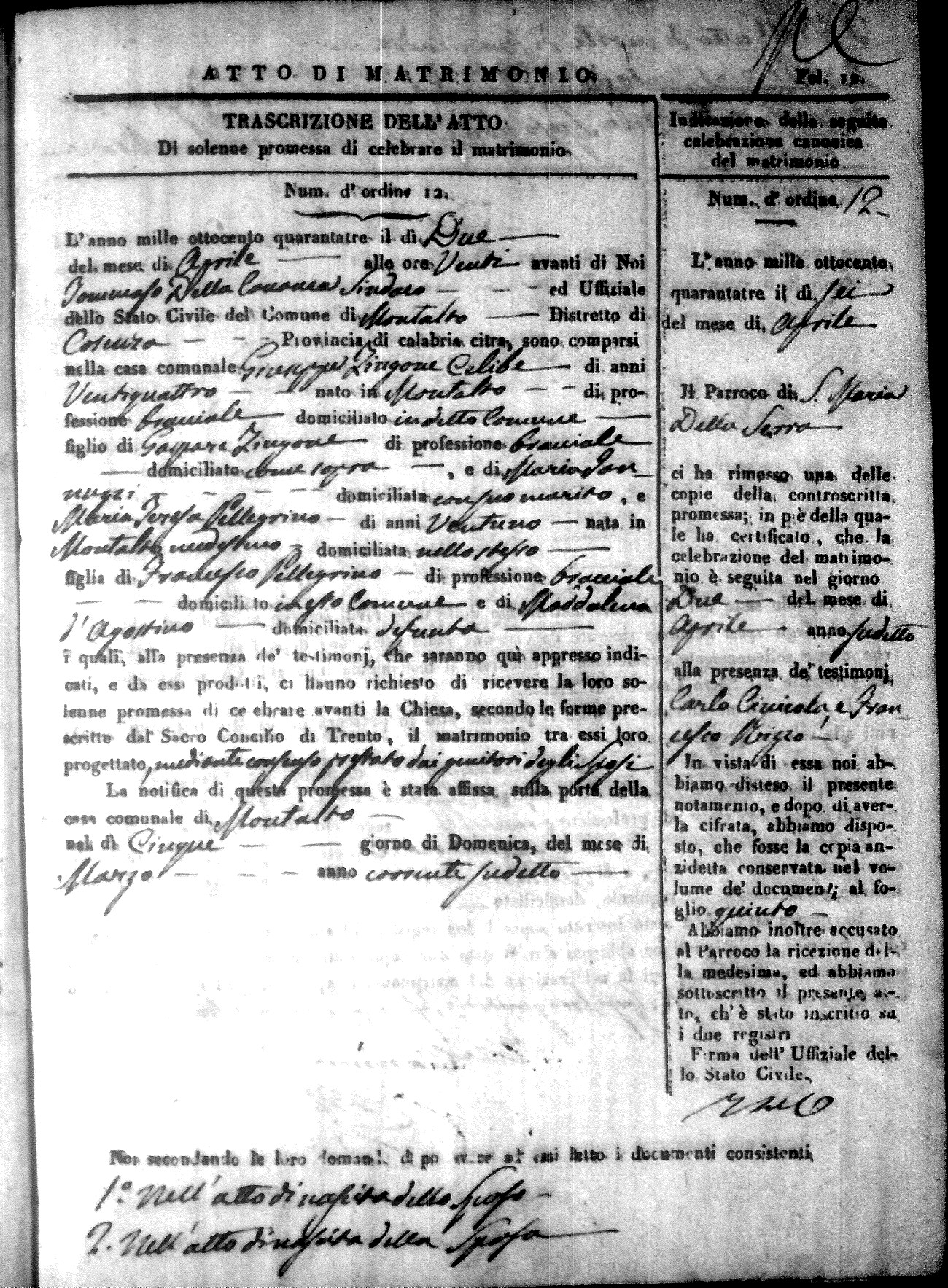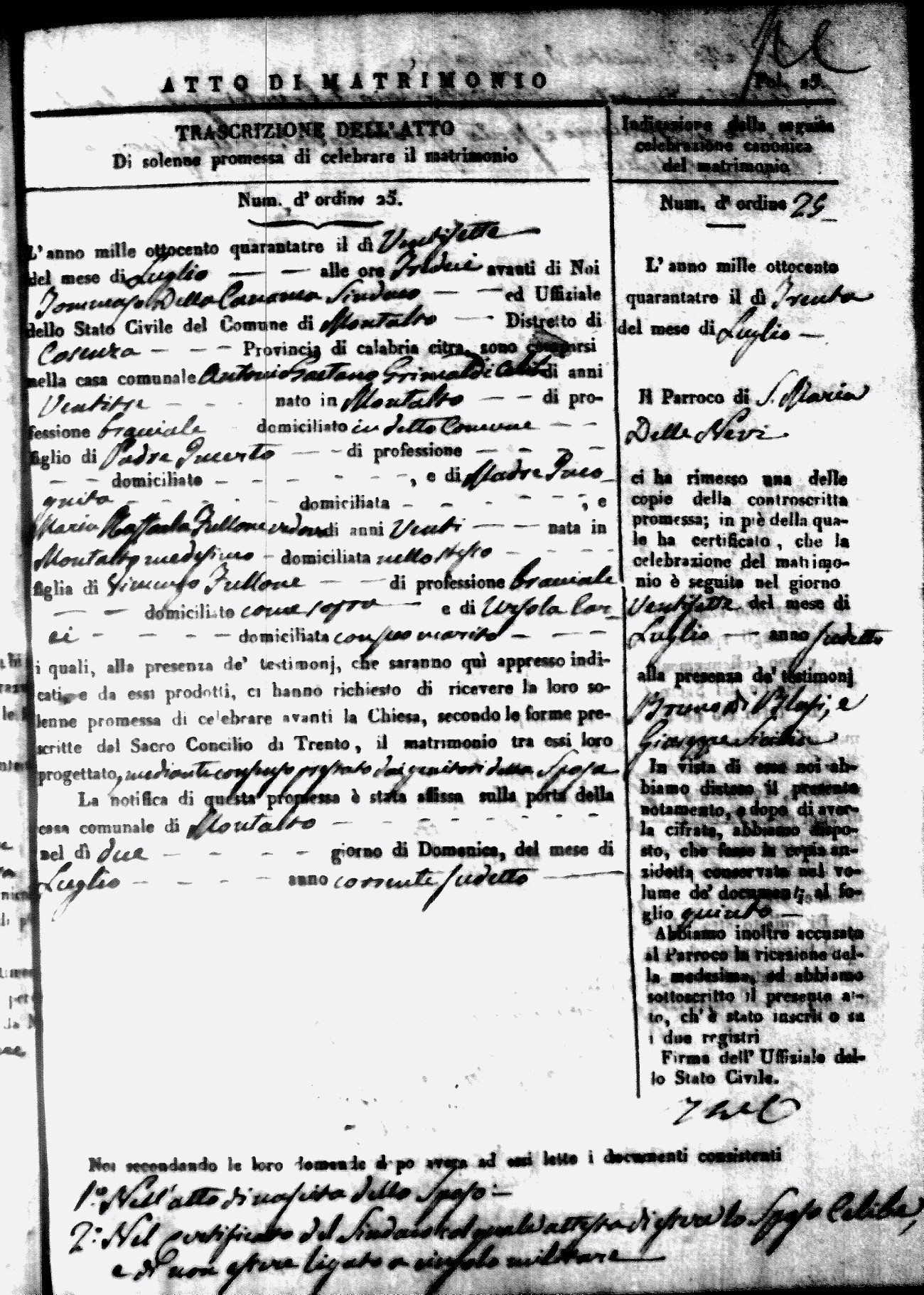 Here are the extractions for all the marriage acts in 1843 for Montalto Uffugo. This year is not complete yet, however it will be complete within a week. For more information, click on the groom's surname to view a copy of the original document.