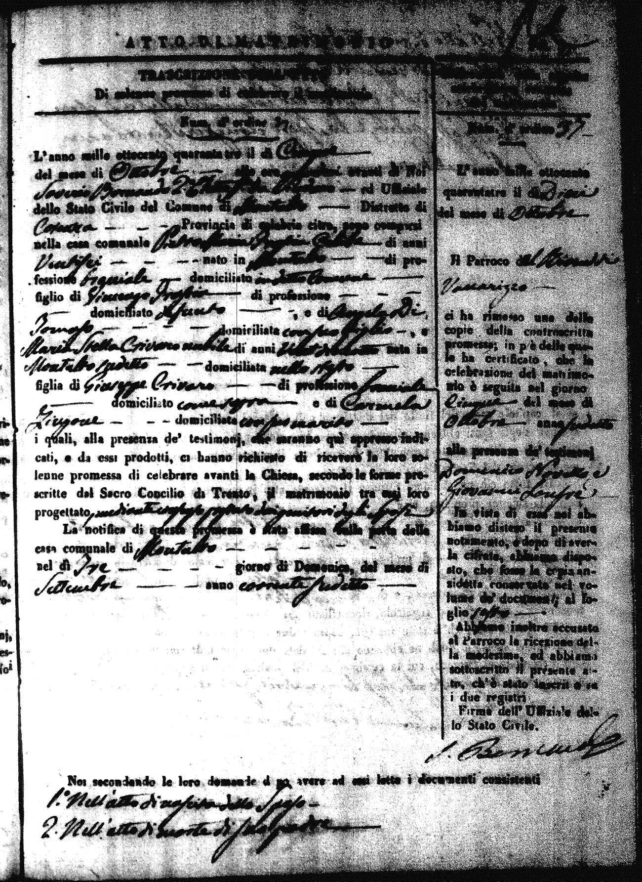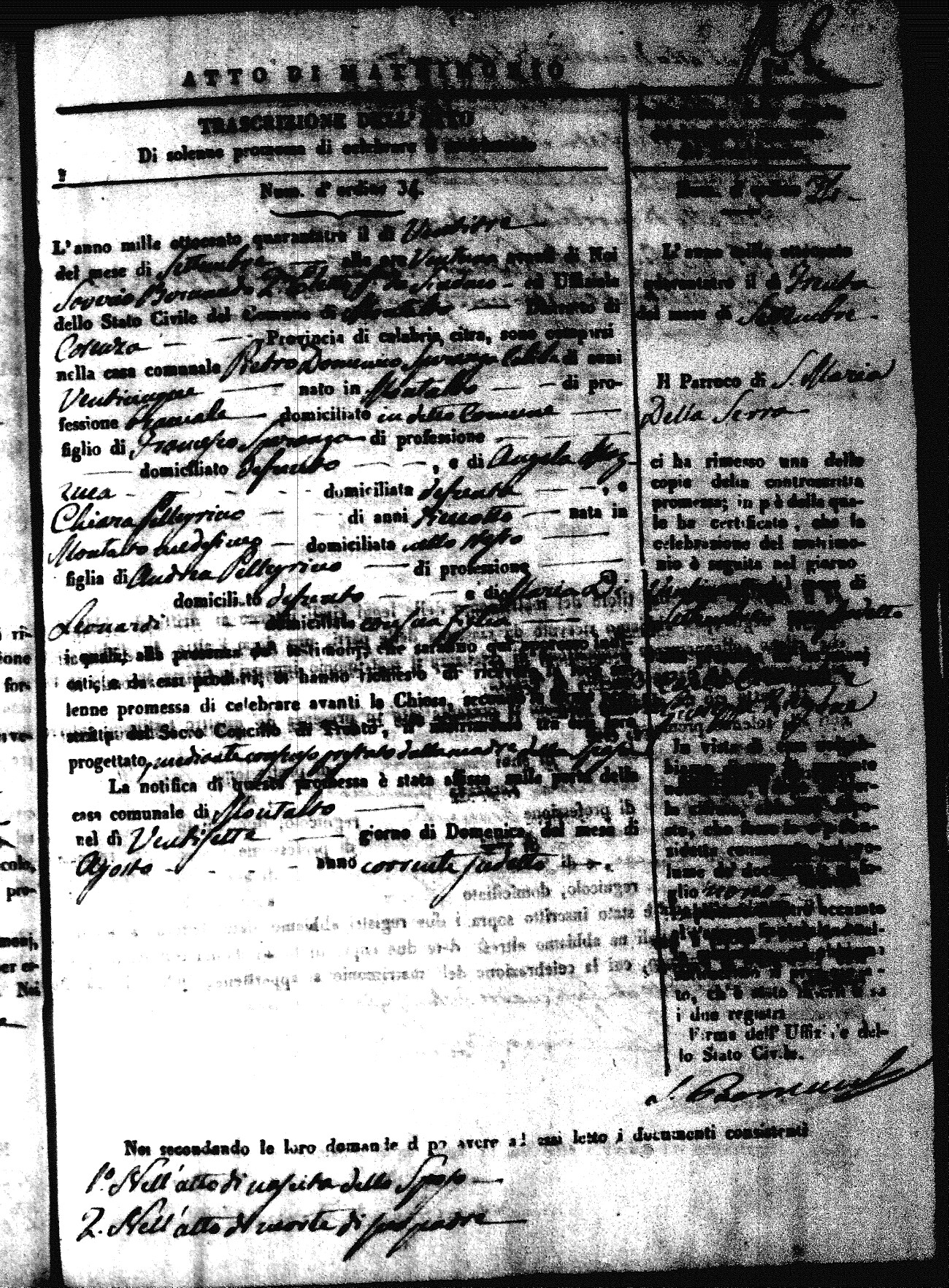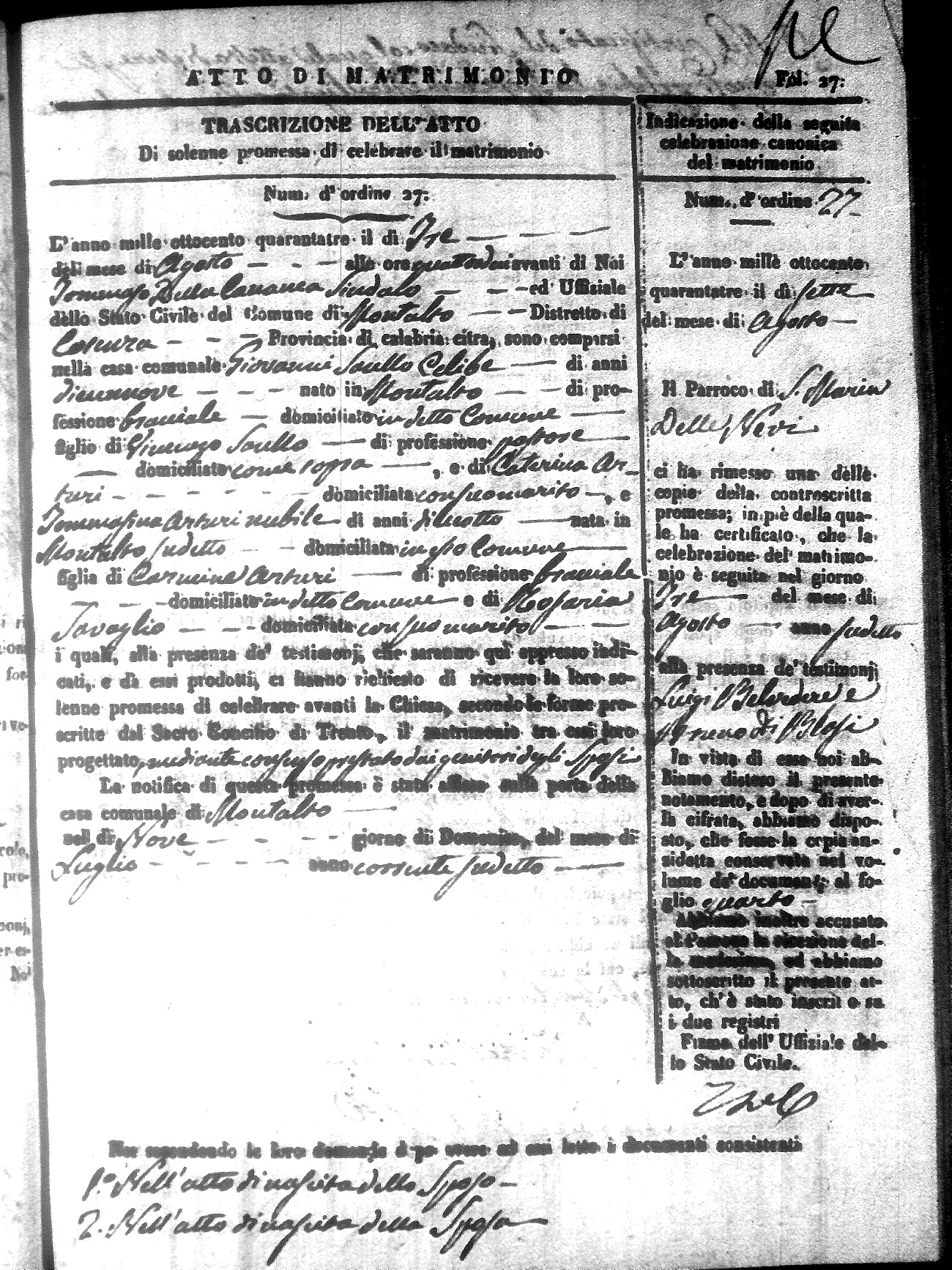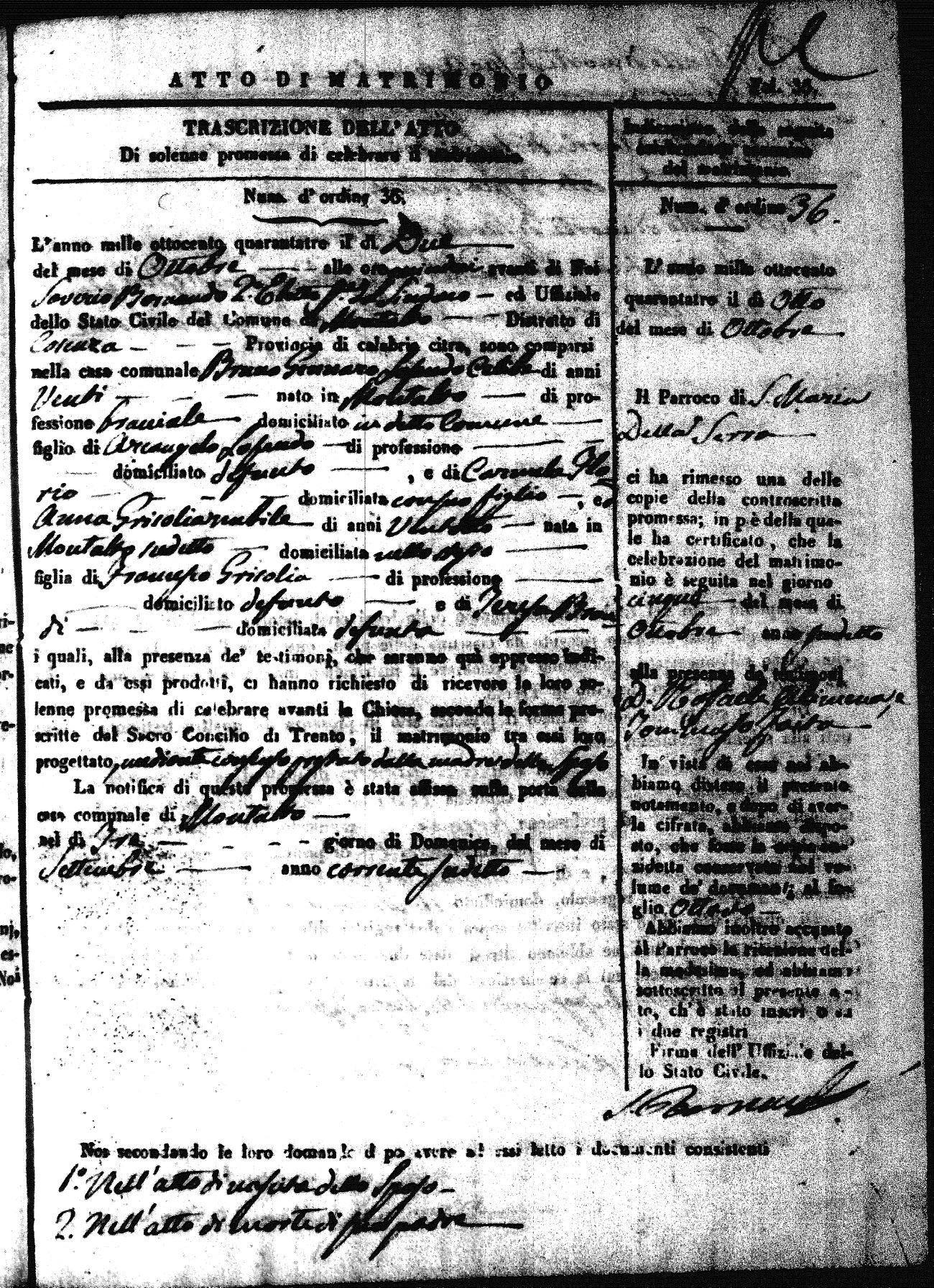 Here are the extractions for all the marriage acts in 1843 for Montalto Uffugo. This year is not complete yet, however it will be complete within a week. For more information, click on the groom's surname to view a copy of the original document.
