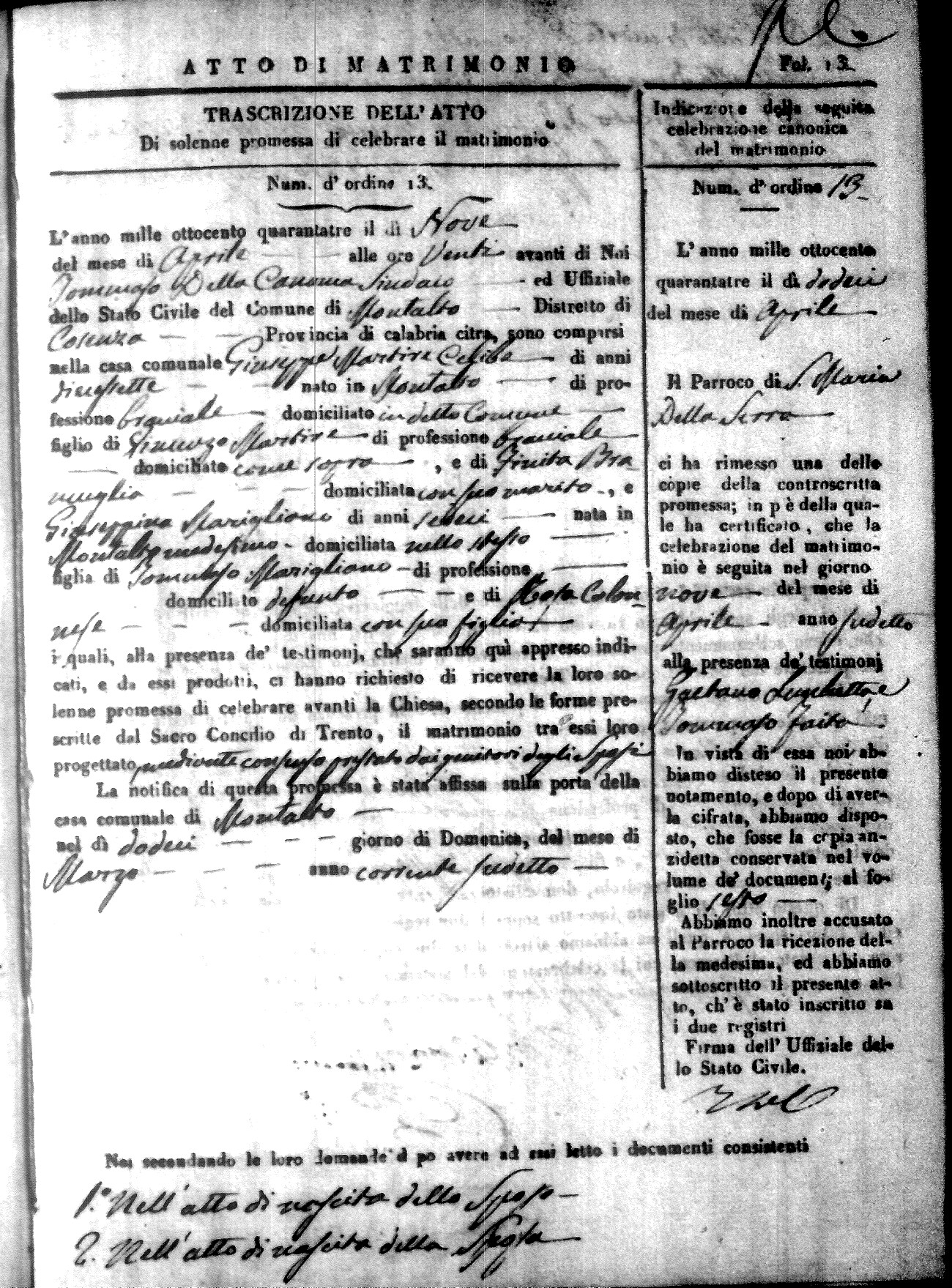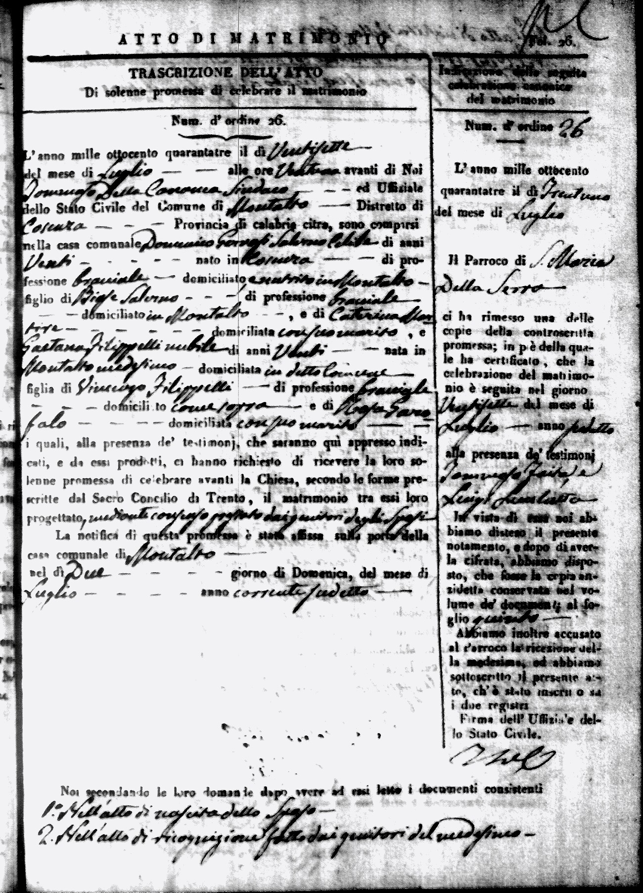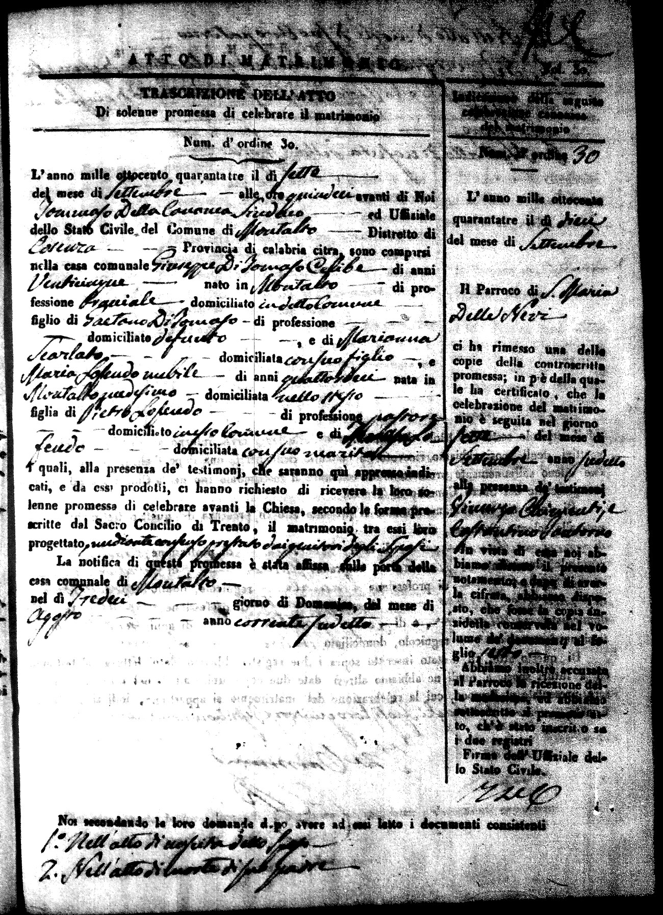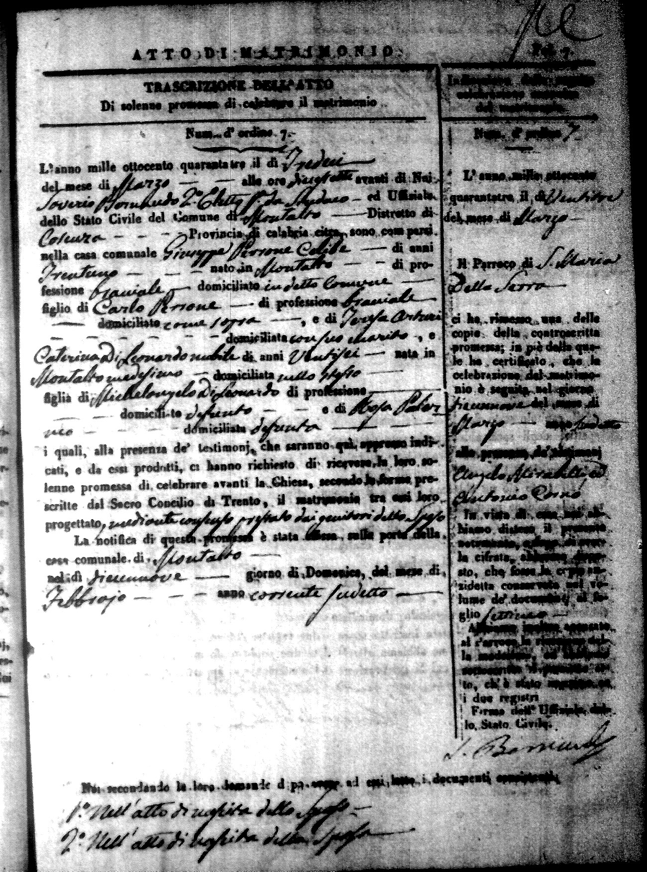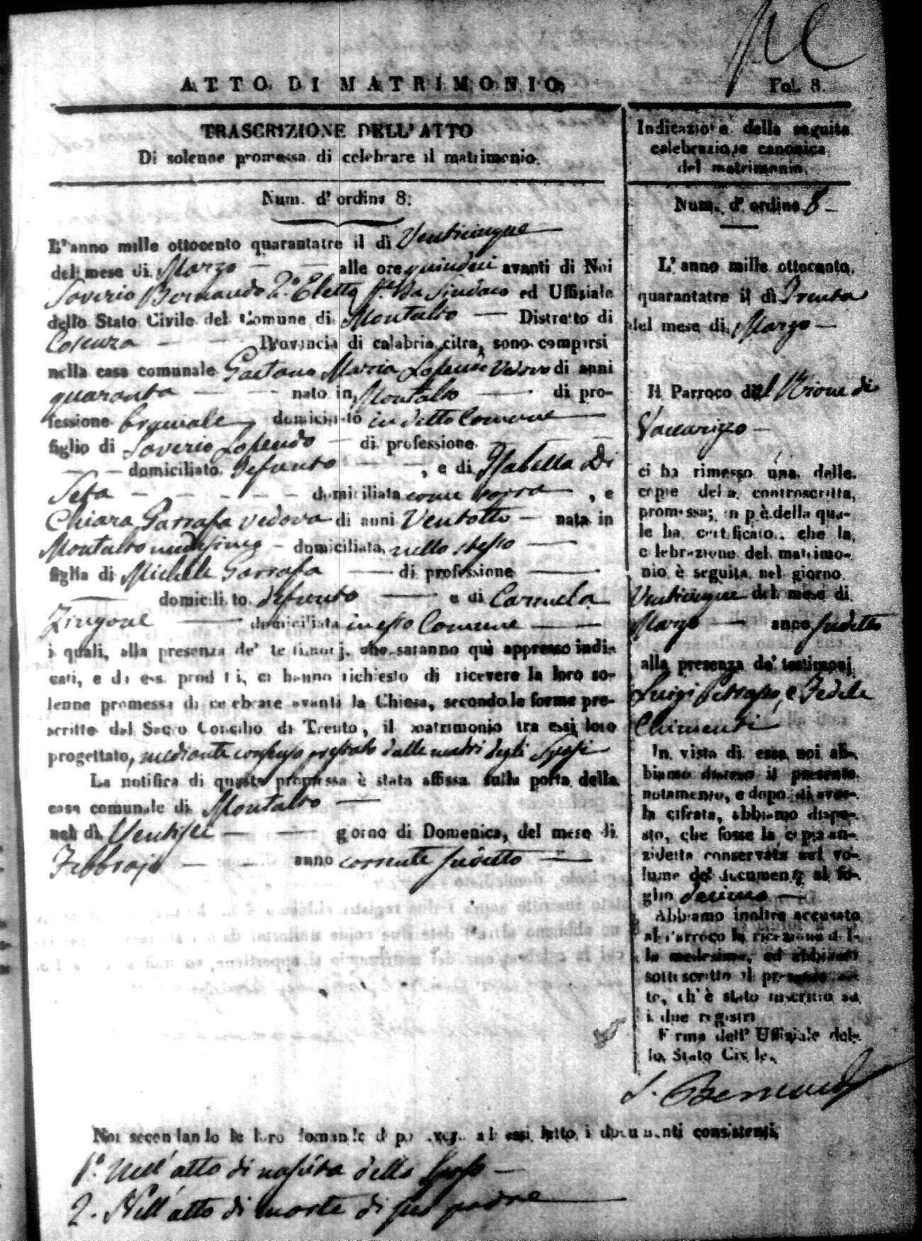 Here are the extractions for all the marriage acts in 1843 for Montalto Uffugo. This year is not complete yet, however it will be complete within a week. For more information, click on the groom's surname to view a copy of the original document.