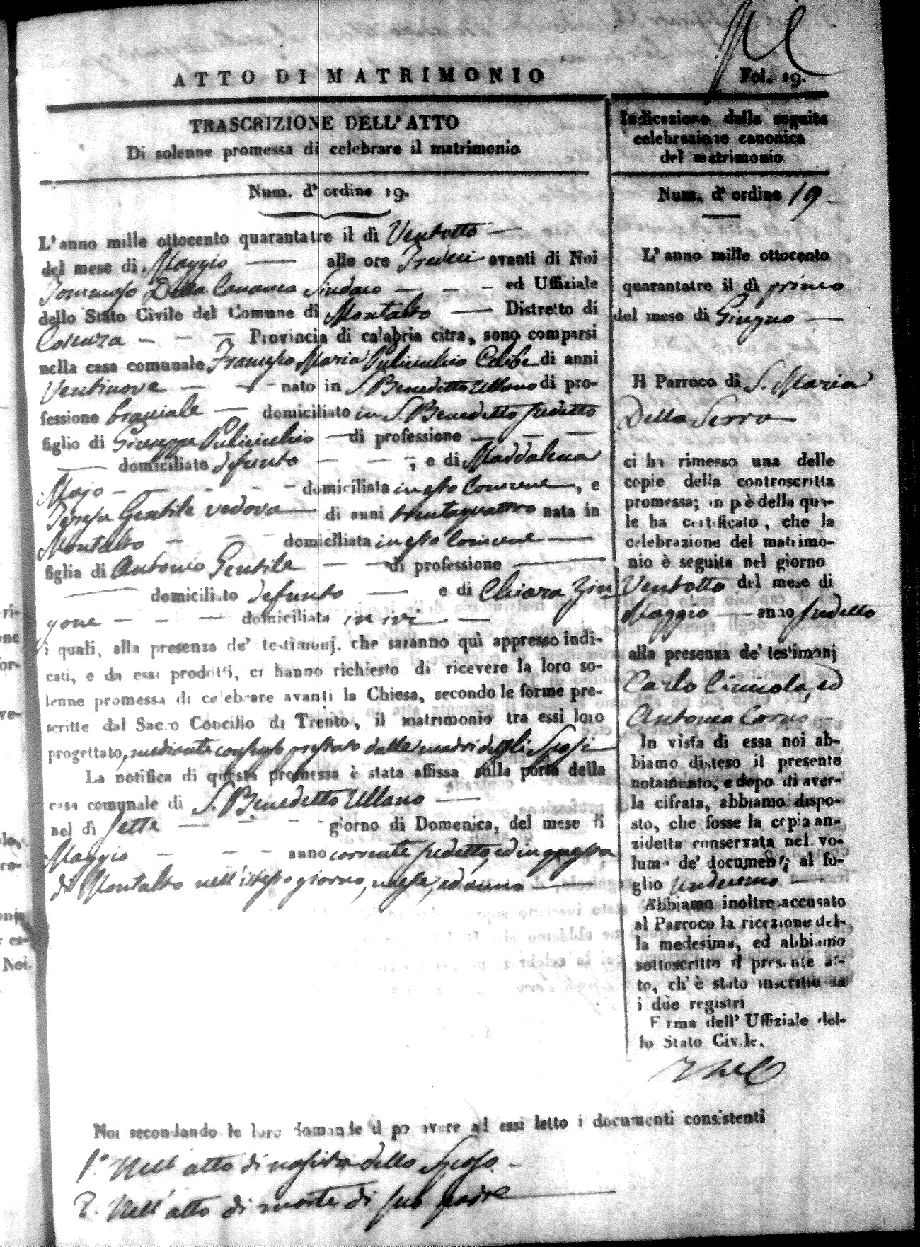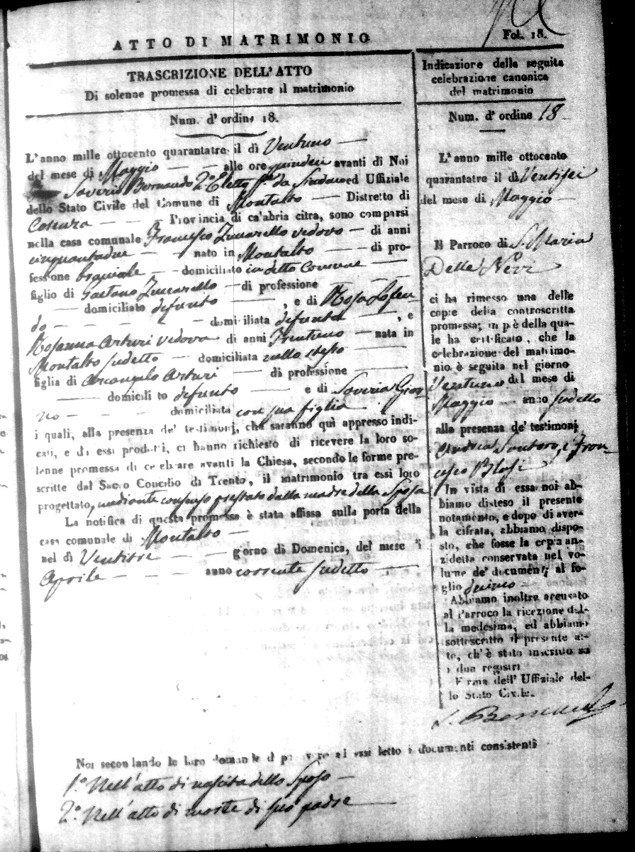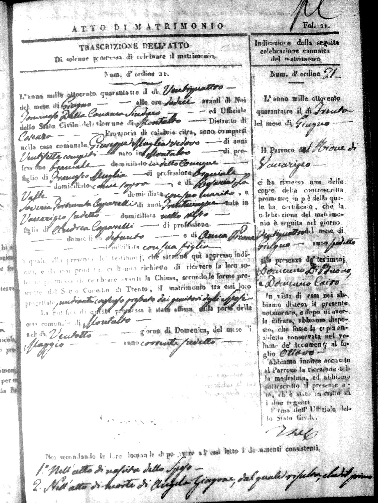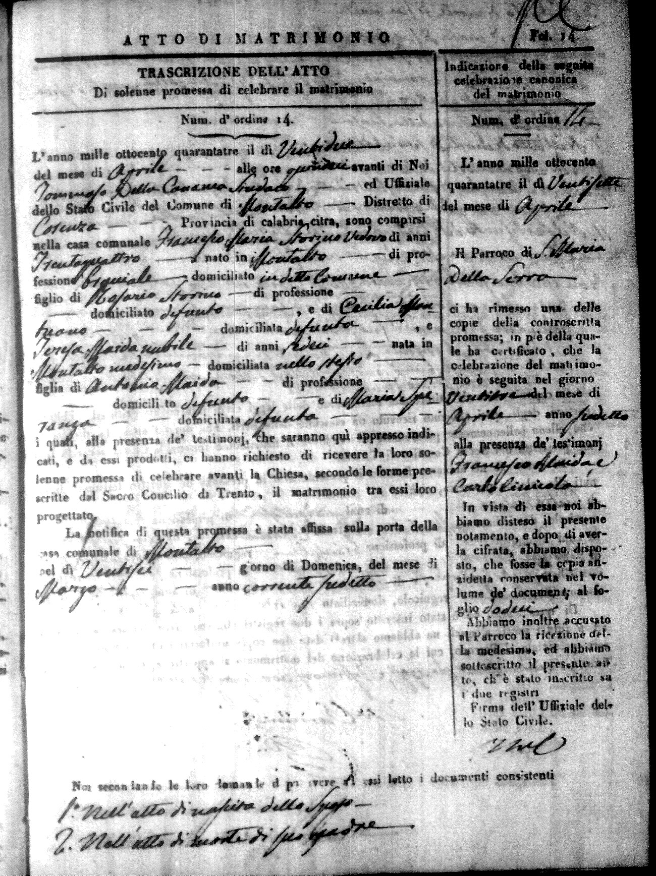 Here are the extractions for all the marriage acts in 1843 for Montalto Uffugo. This year is not complete yet, however it will be complete within a week. For more information, click on the groom's surname to view a copy of the original document.