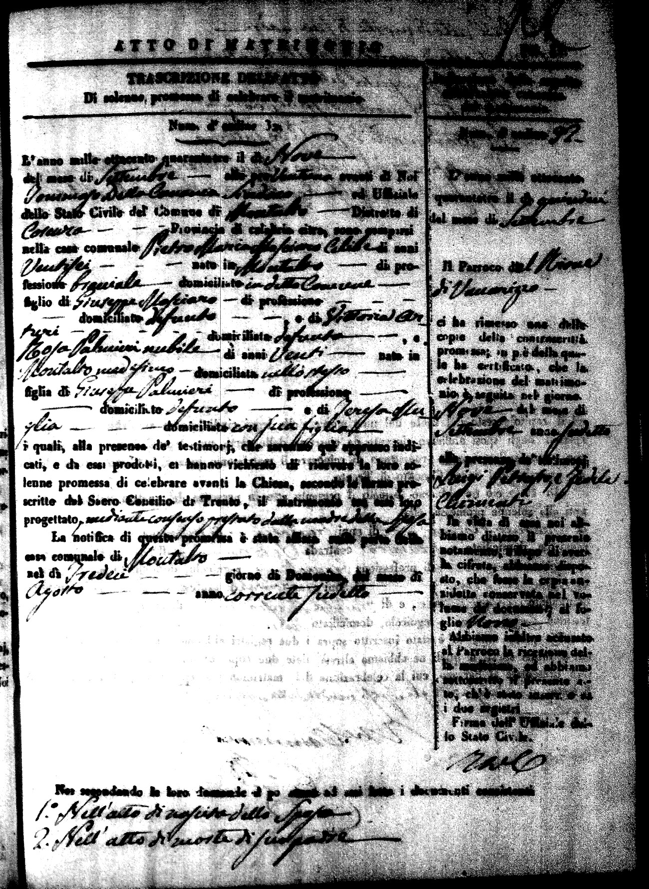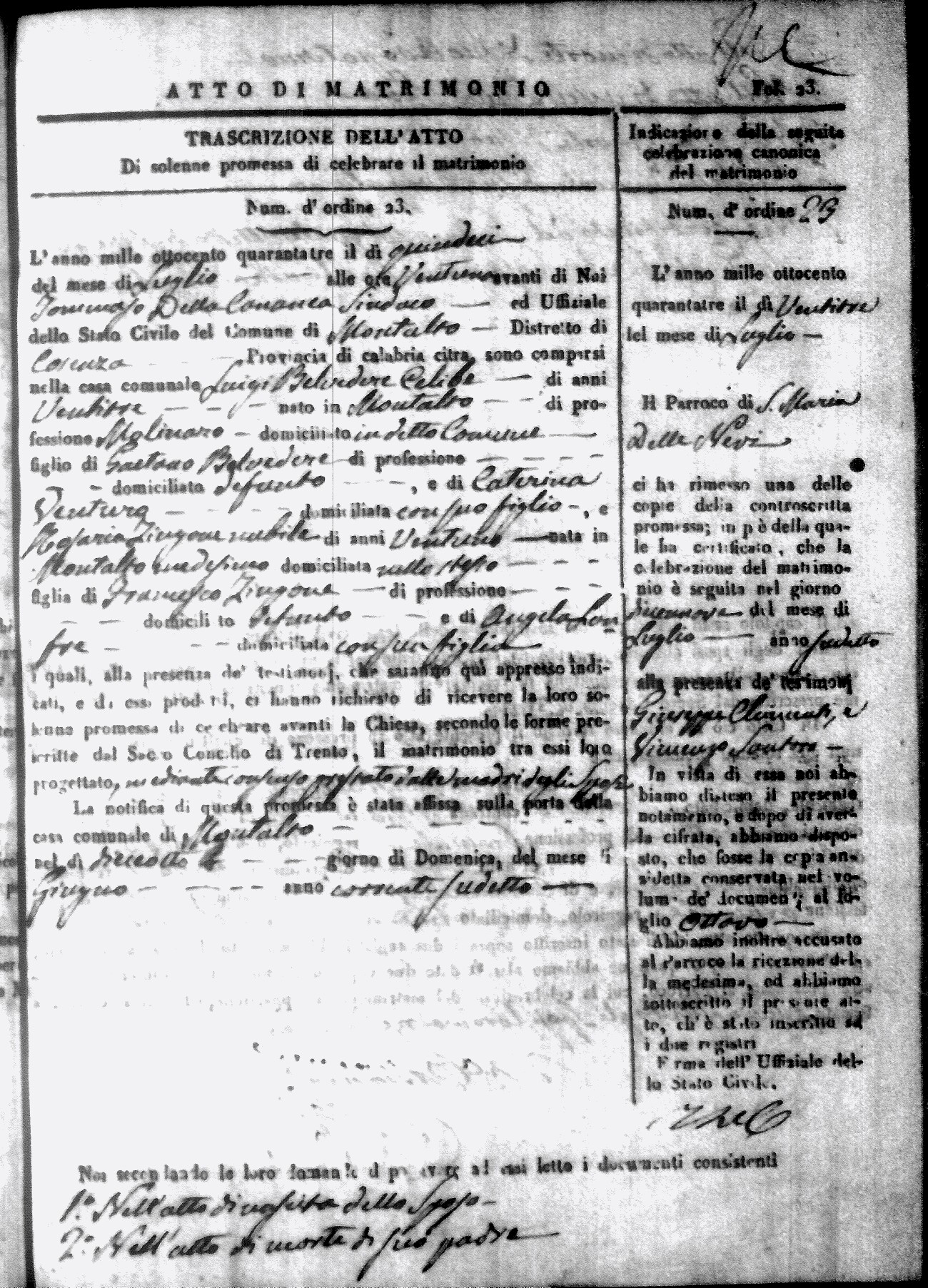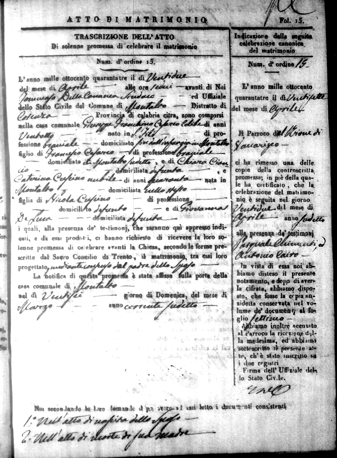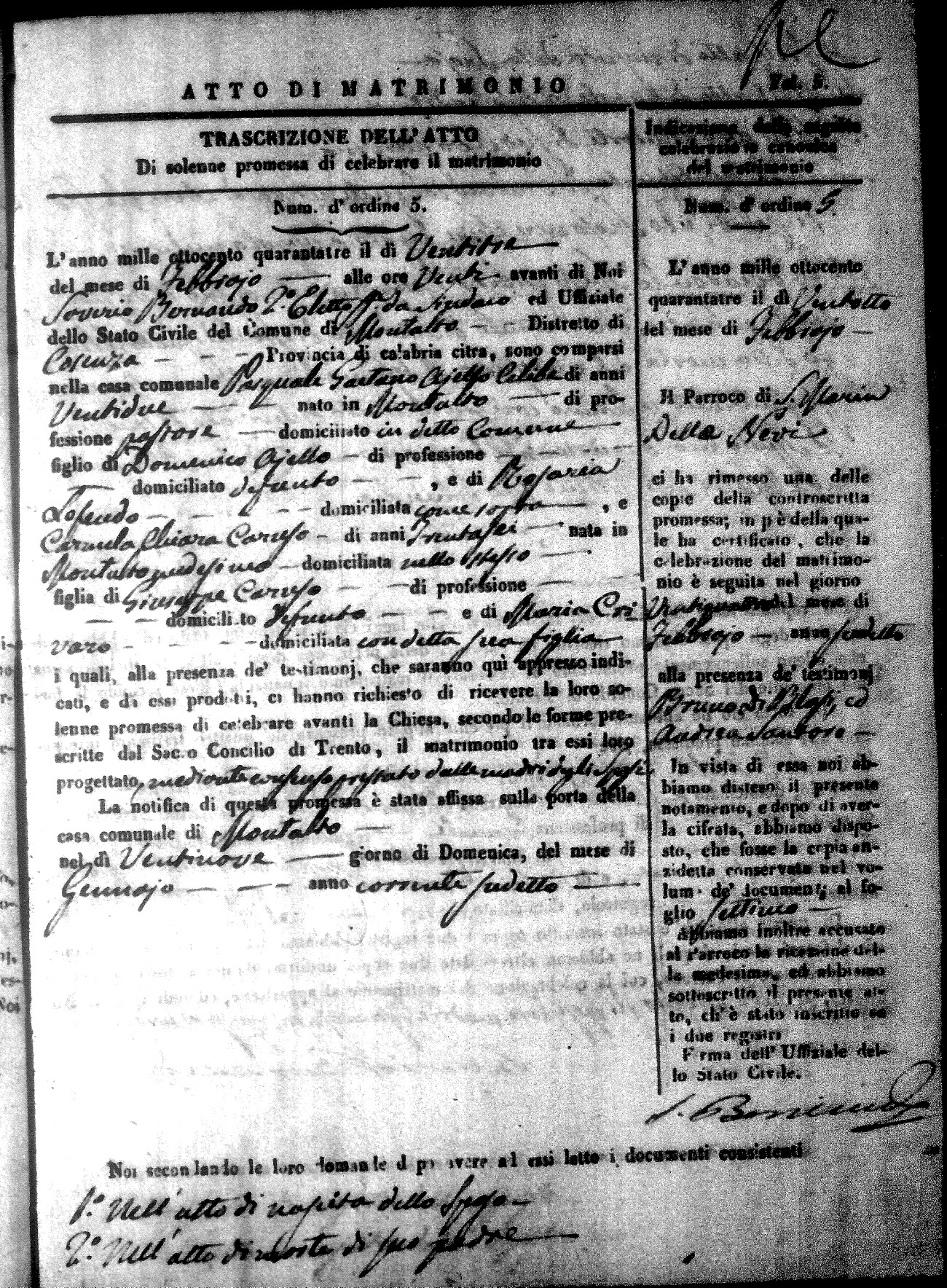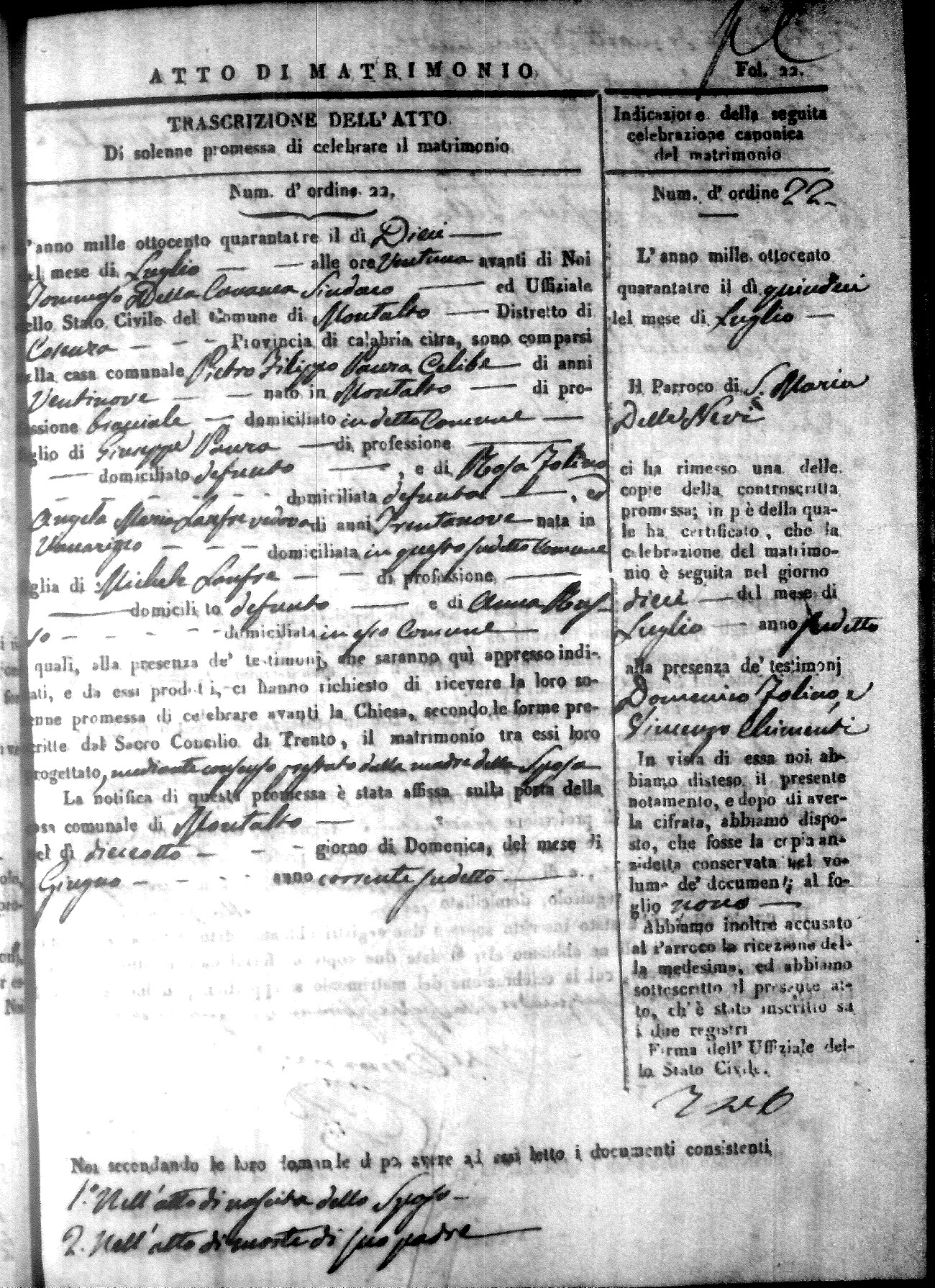 Here are the extractions for all the marriage acts in 1843 for Montalto Uffugo. This year is not complete yet, however it will be complete within a week. For more information, click on the groom's surname to view a copy of the original document.