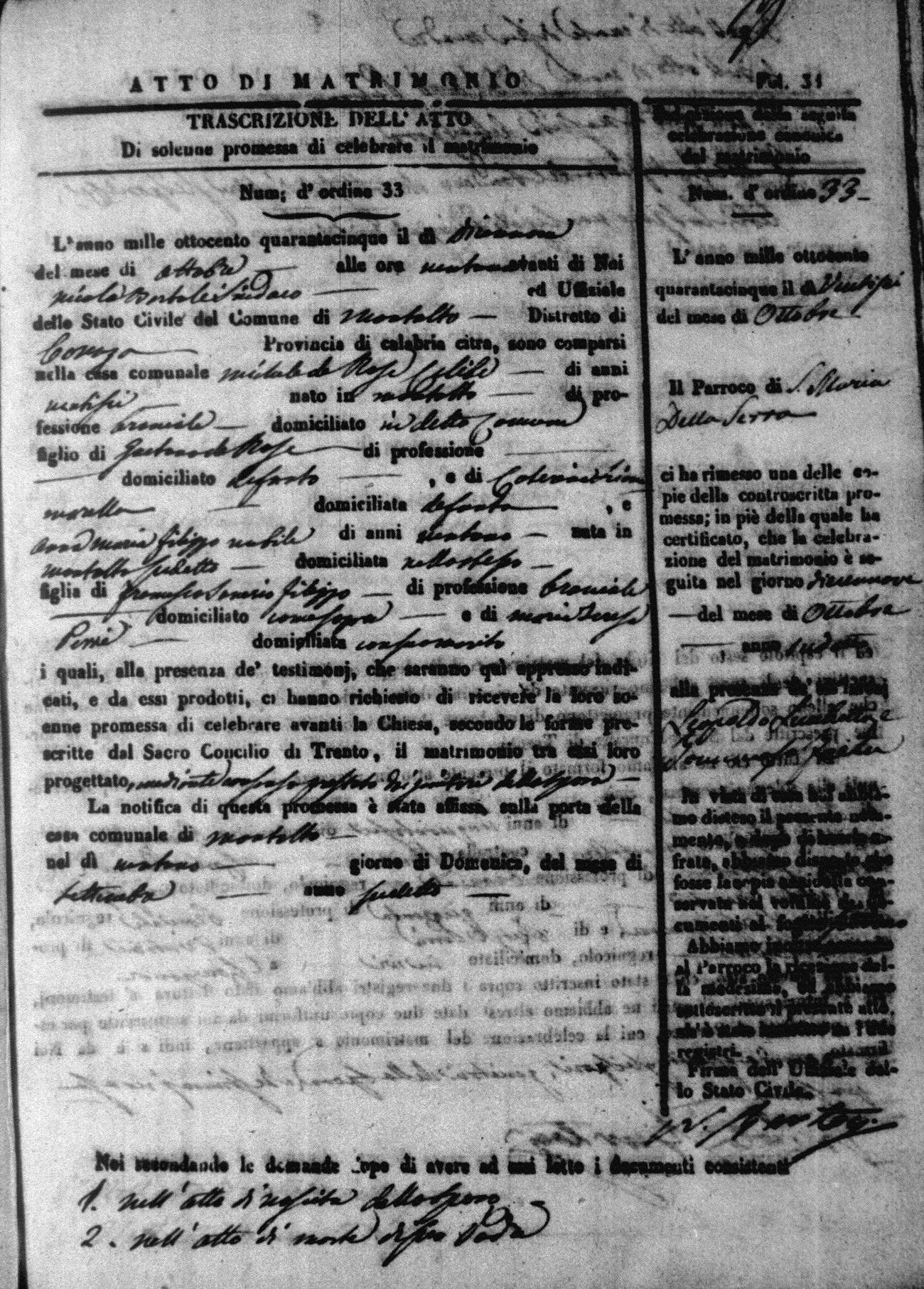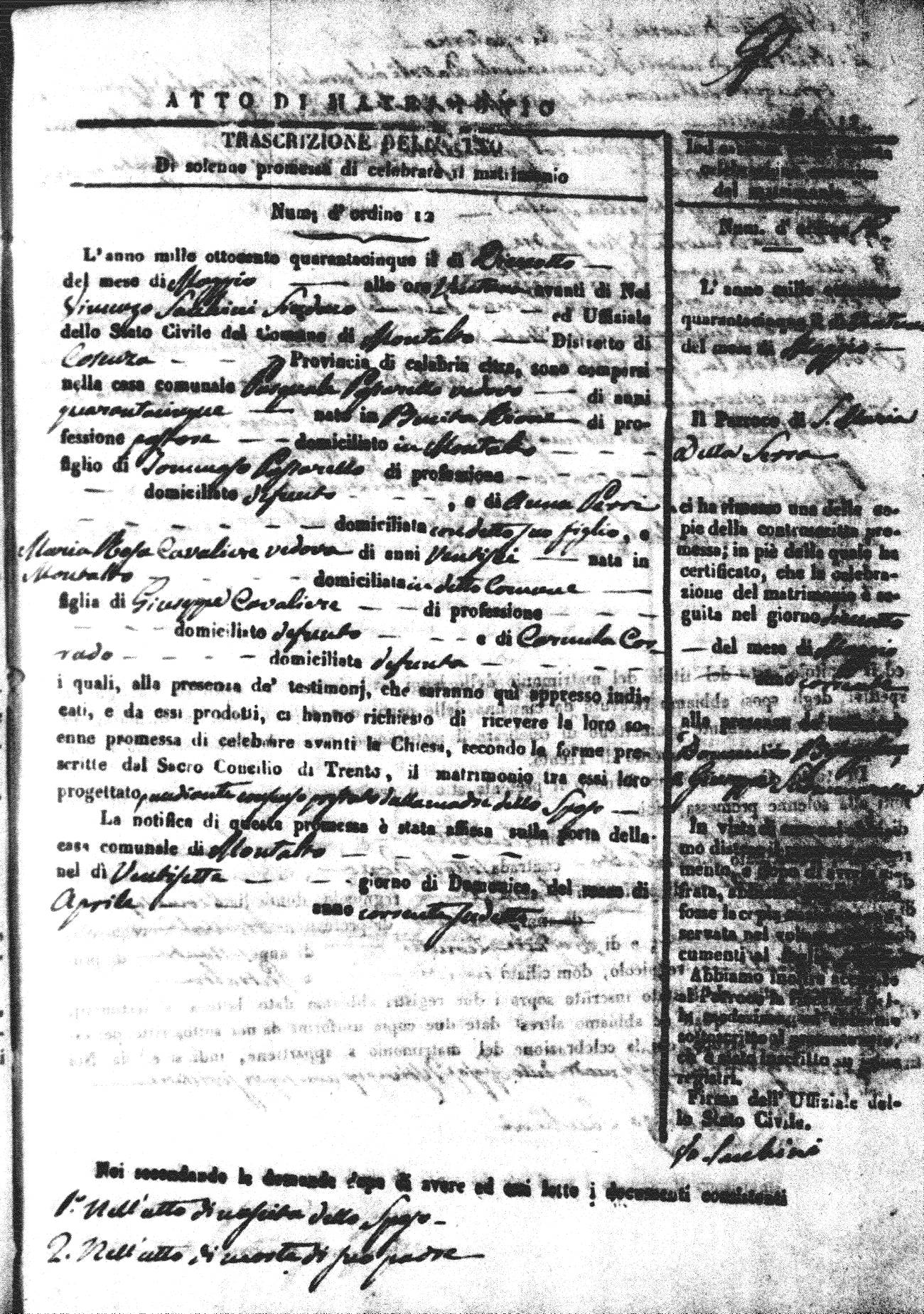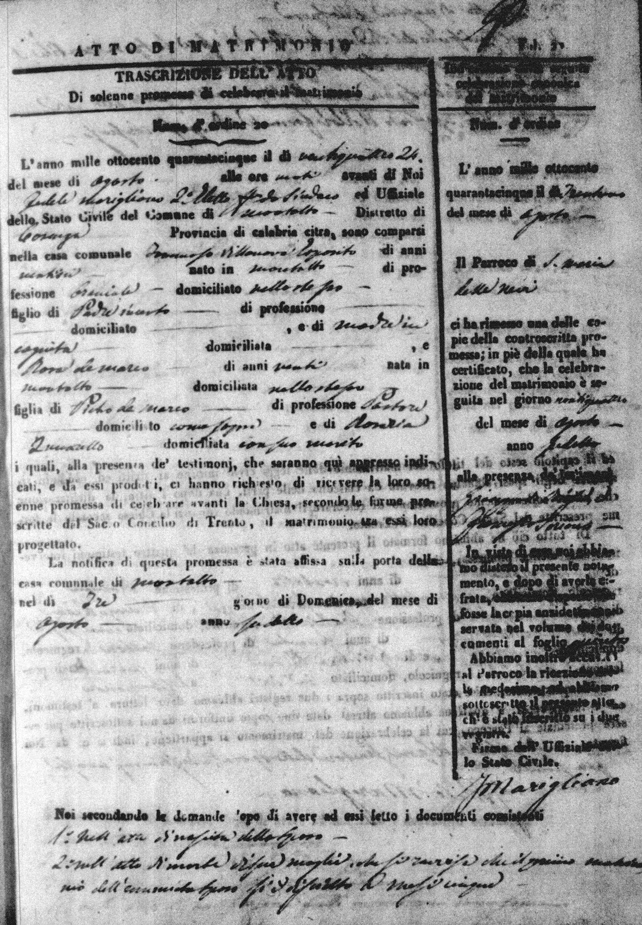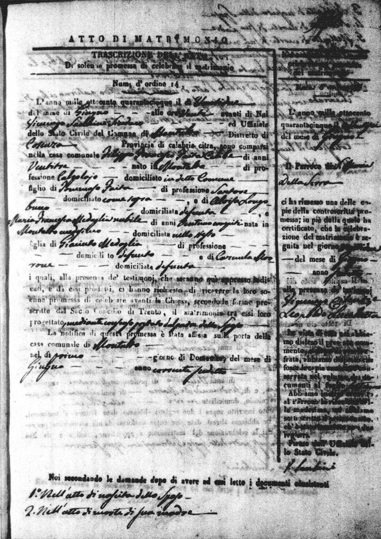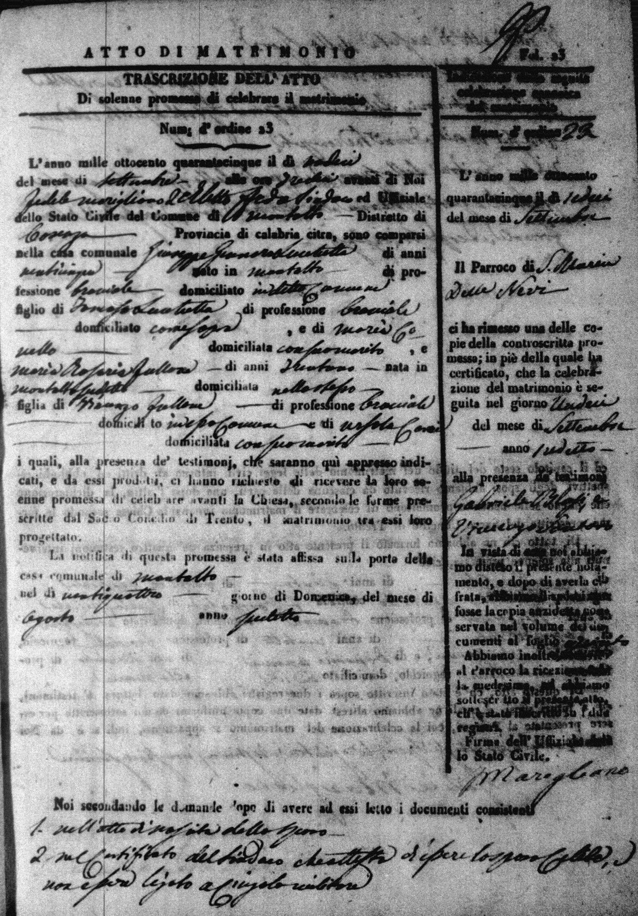 Here are the extractions for all the marriage acts in 1845 for Montalto Uffugo. For more information, click on the groom's surname to view a copy of the original document.