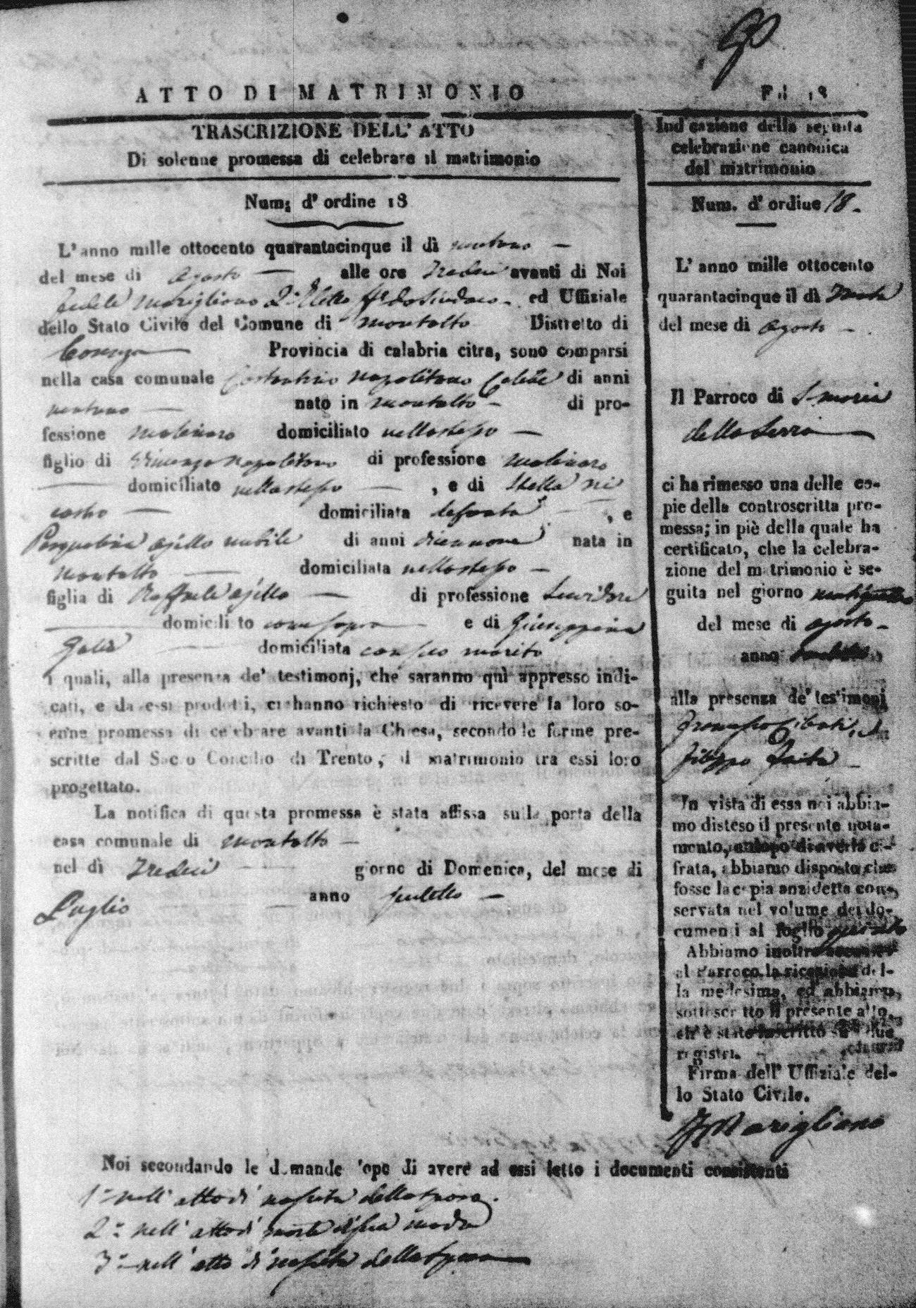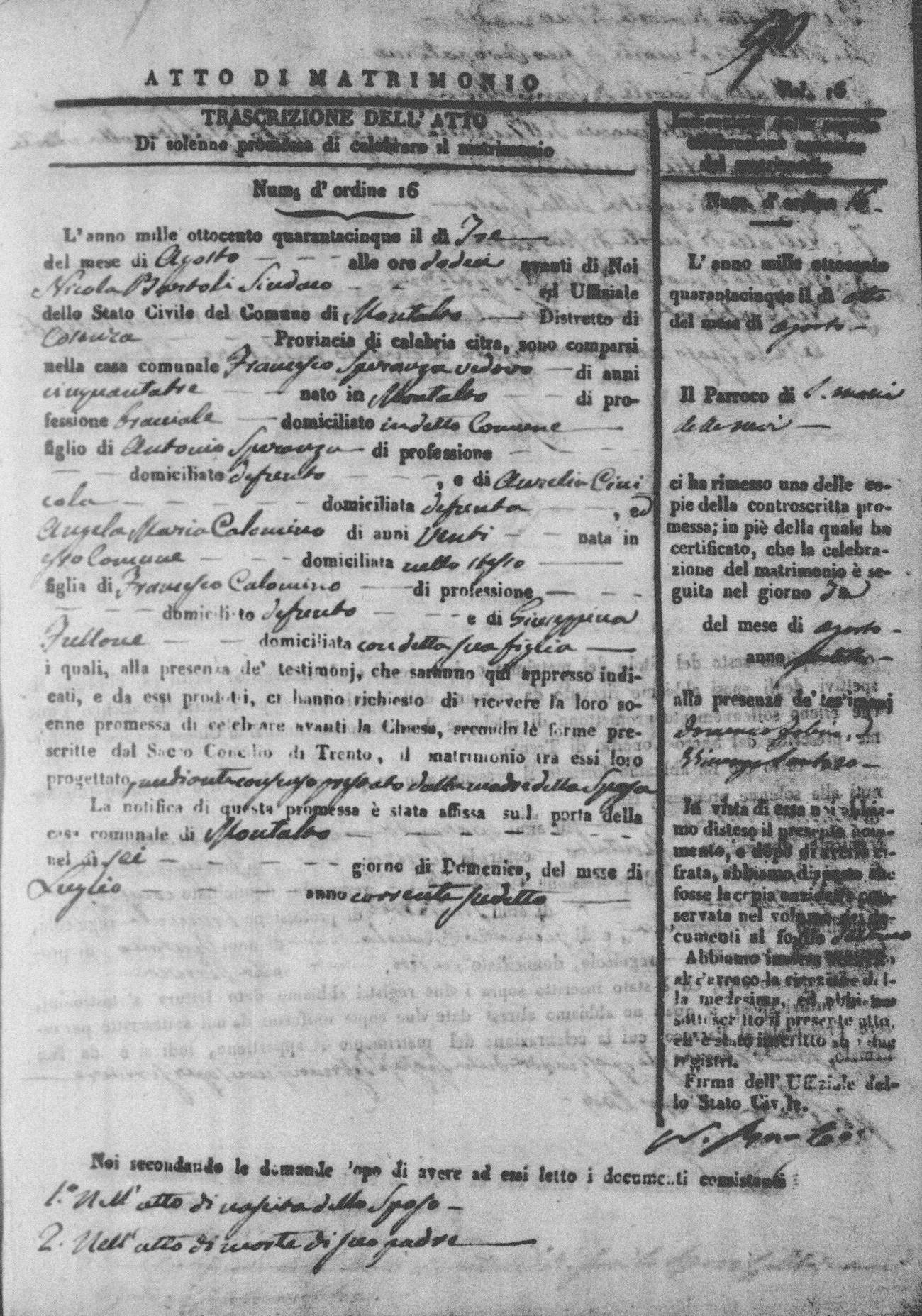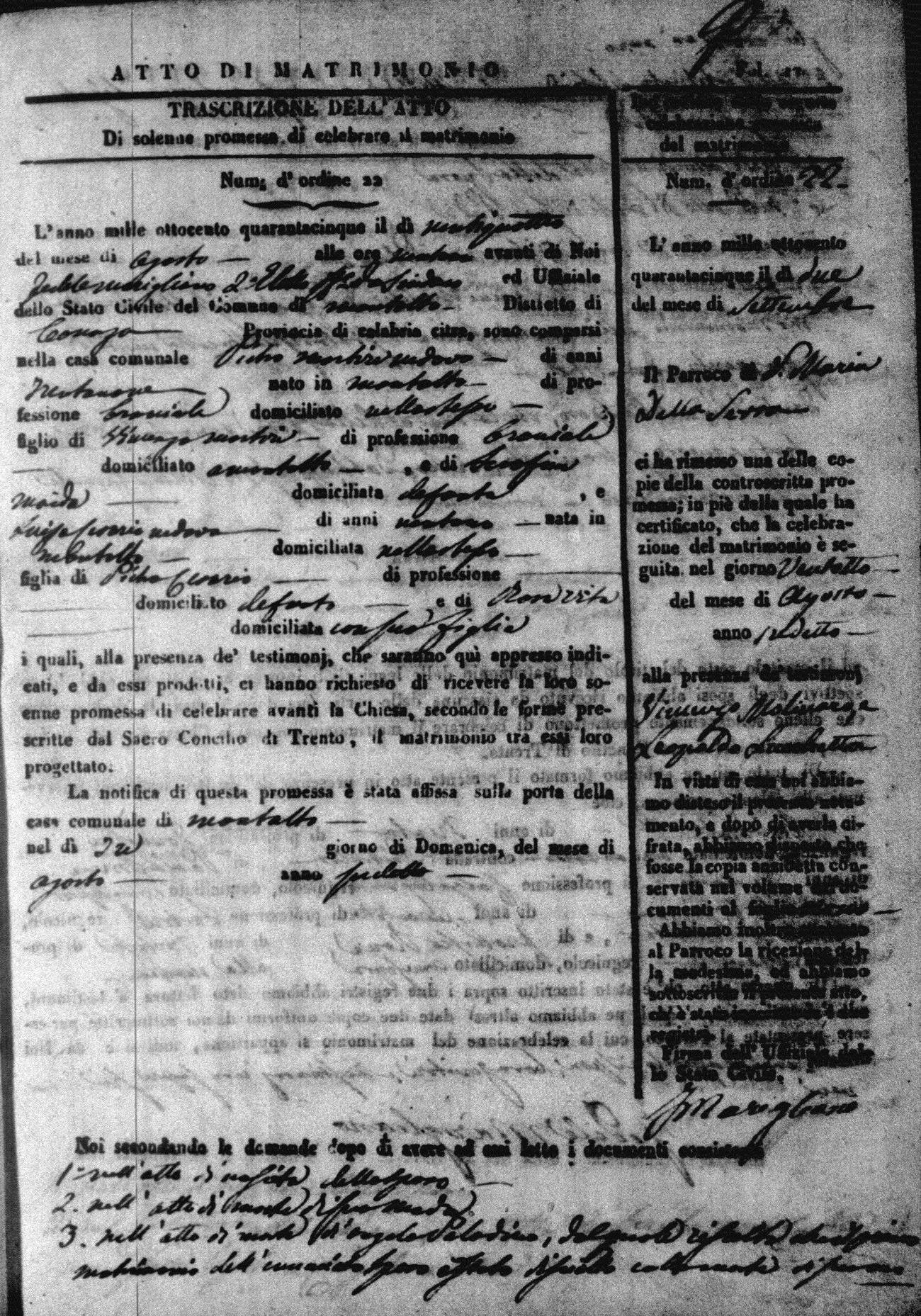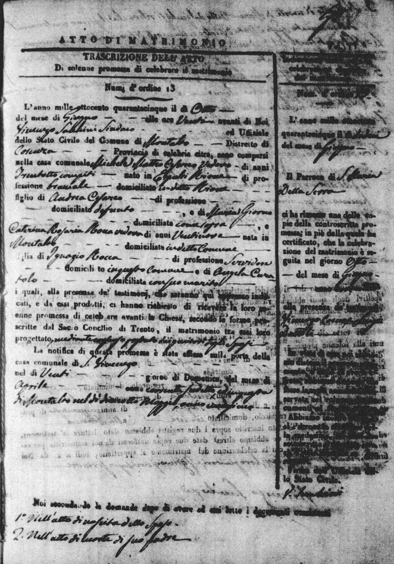 Here are the extractions for all the marriage acts in 1845 for Montalto Uffugo. For more information, click on the groom's surname to view a copy of the original document.