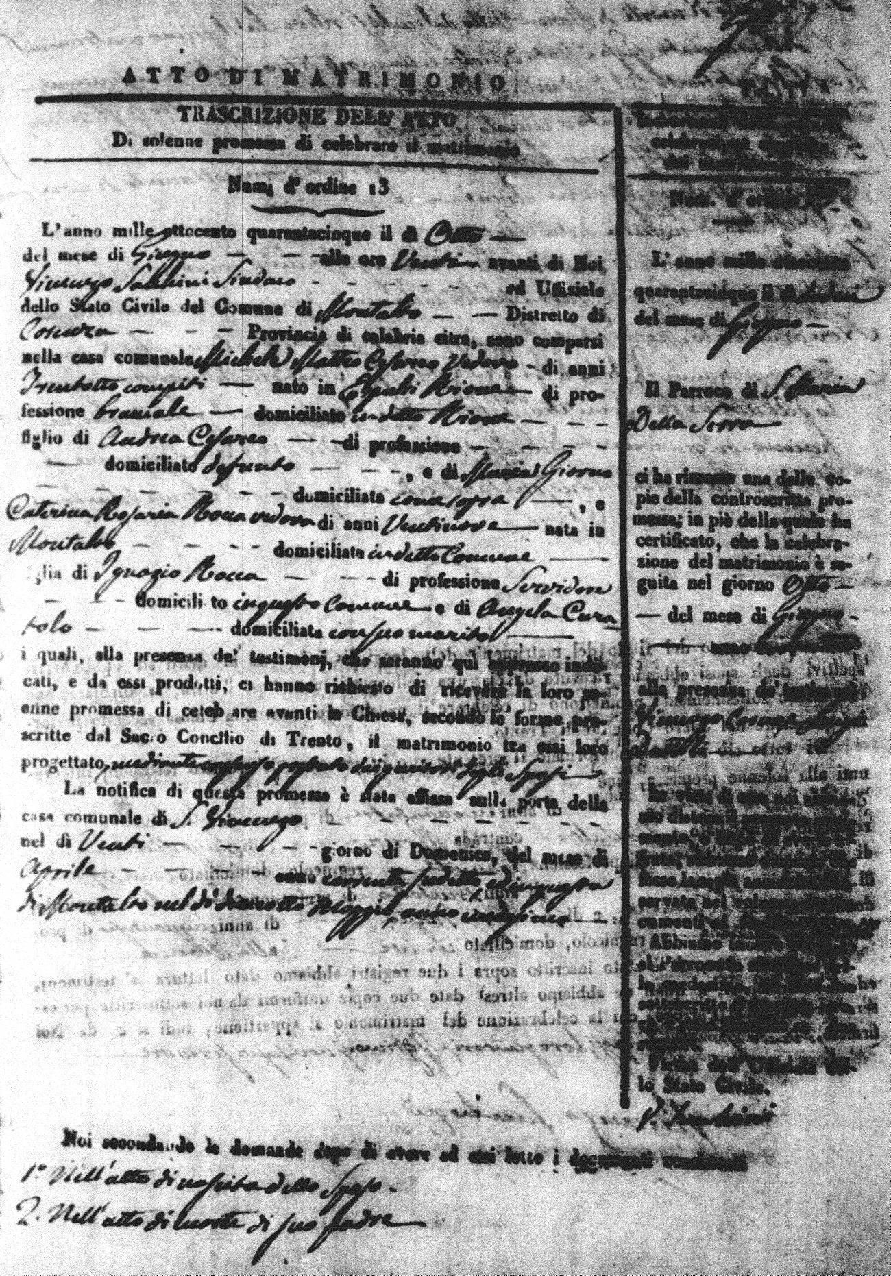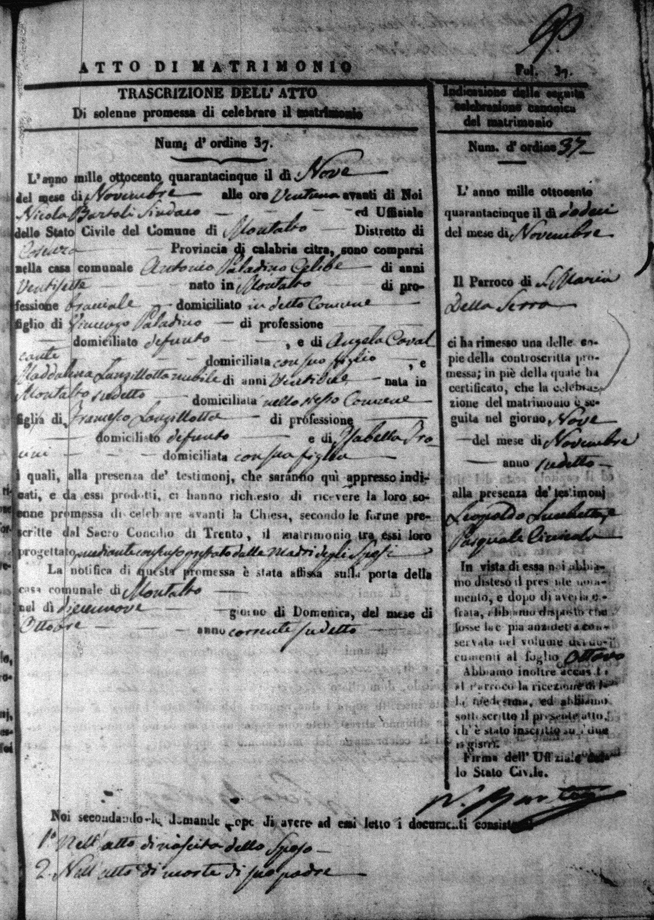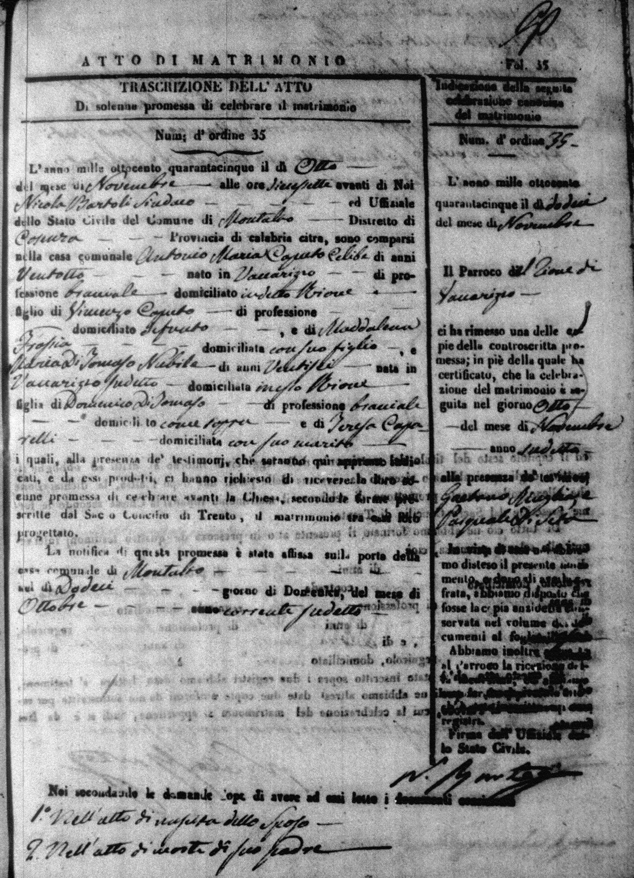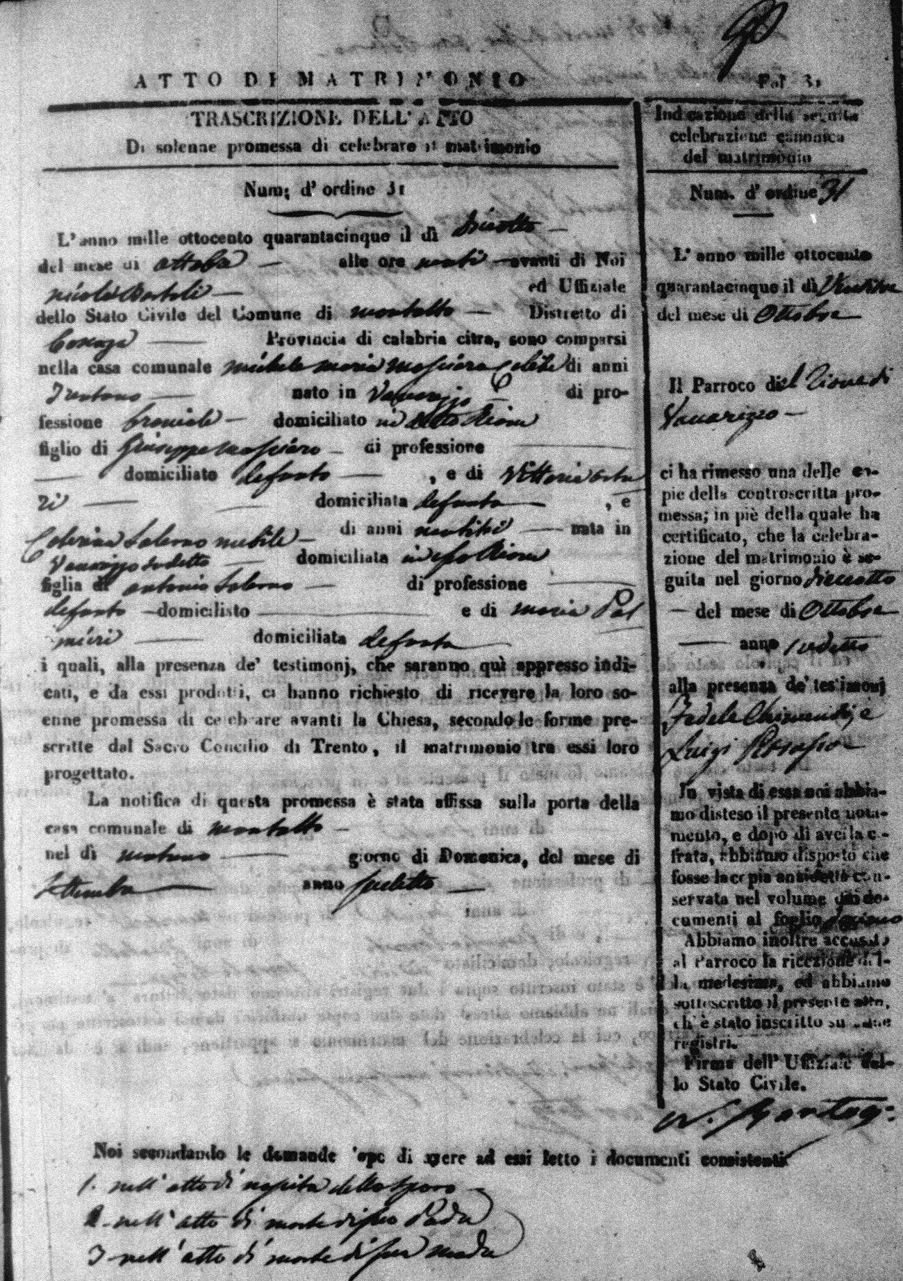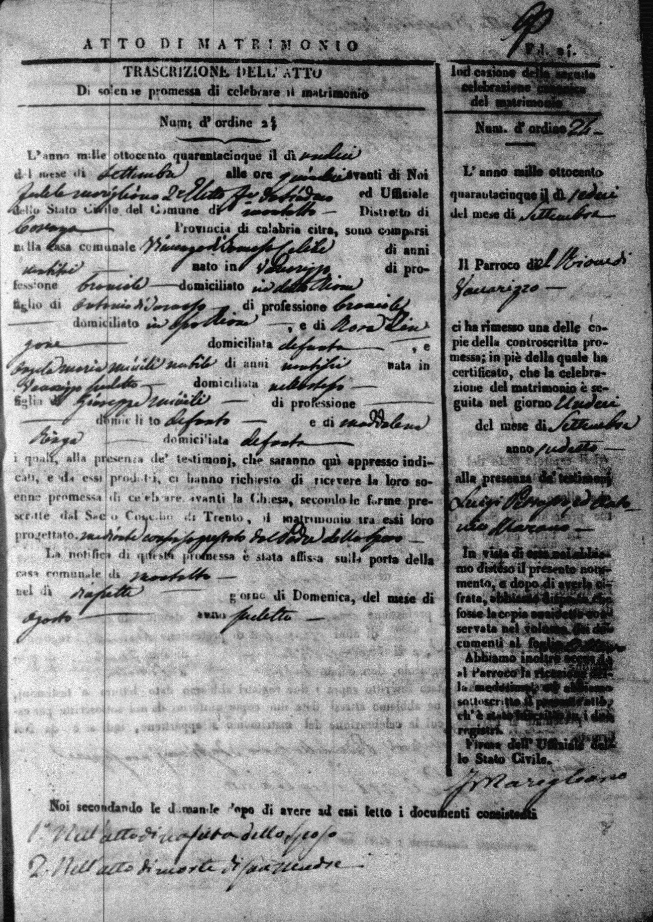 Here are the extractions for all the marriage acts in 1845 for Montalto Uffugo. For more information, click on the groom's surname to view a copy of the original document.