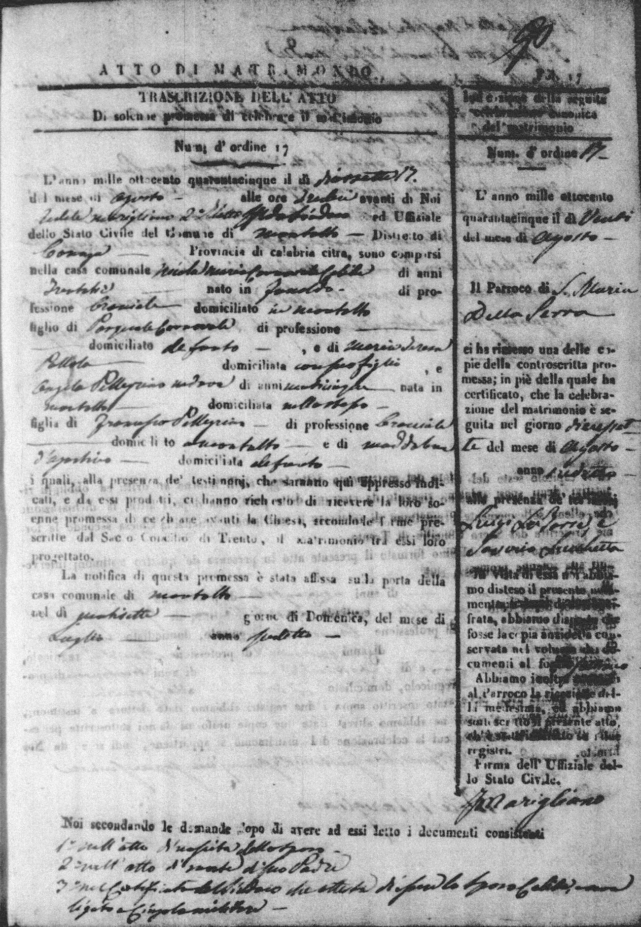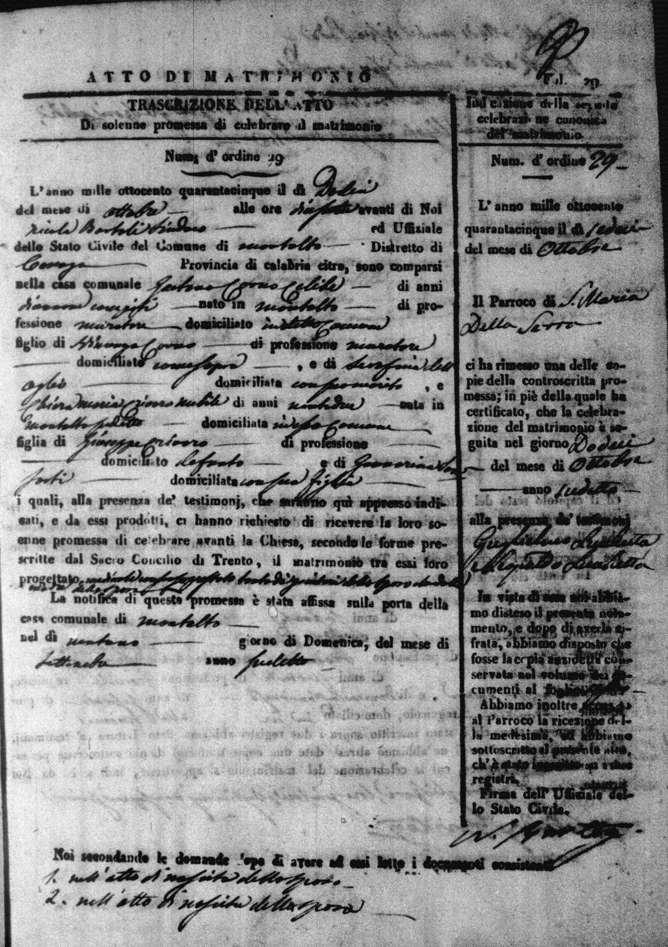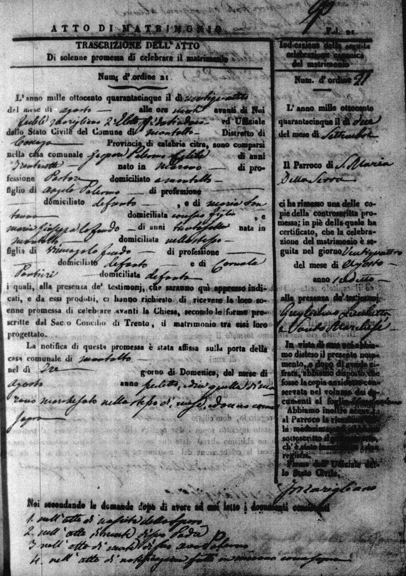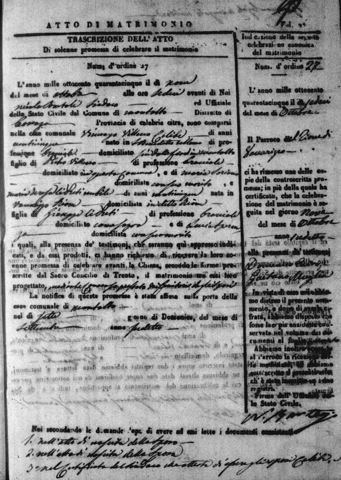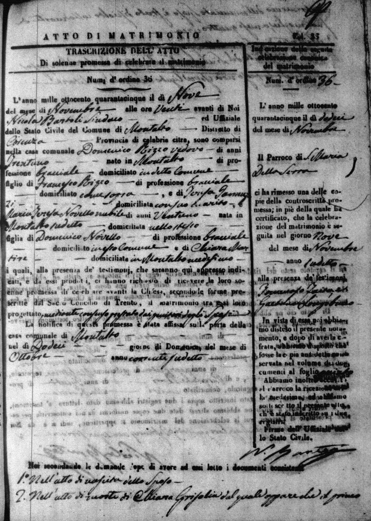Here are the extractions for all the marriage acts in 1845 for Montalto Uffugo. For more information, click on the groom's surname to view a copy of the original document.