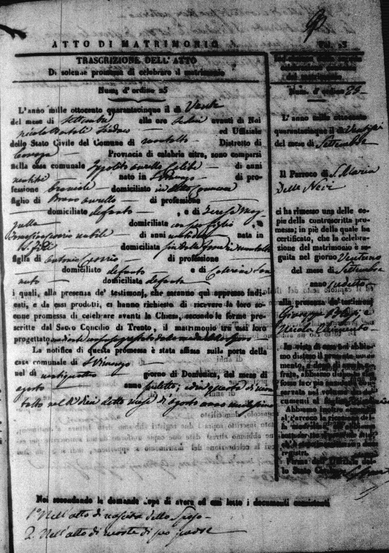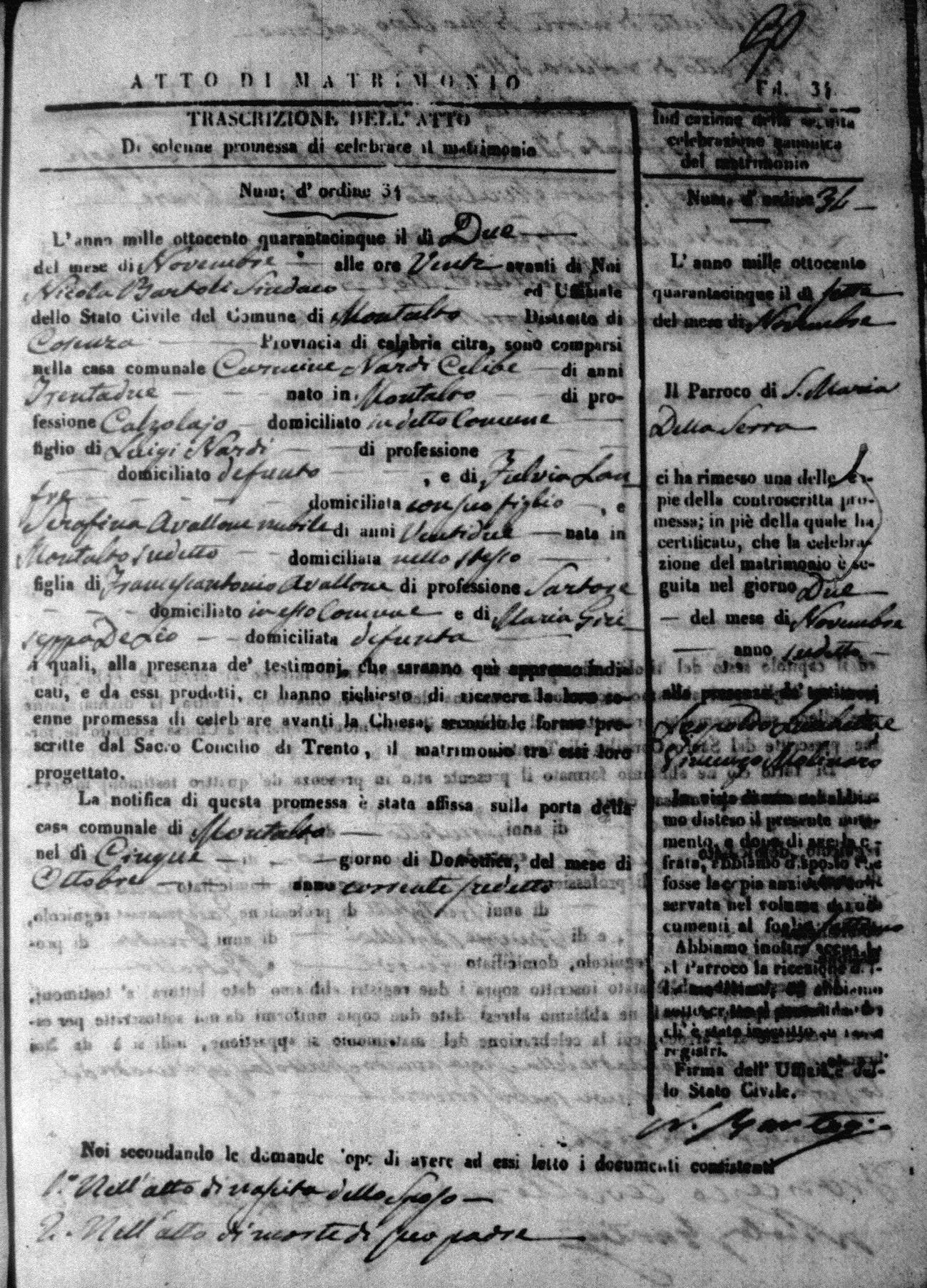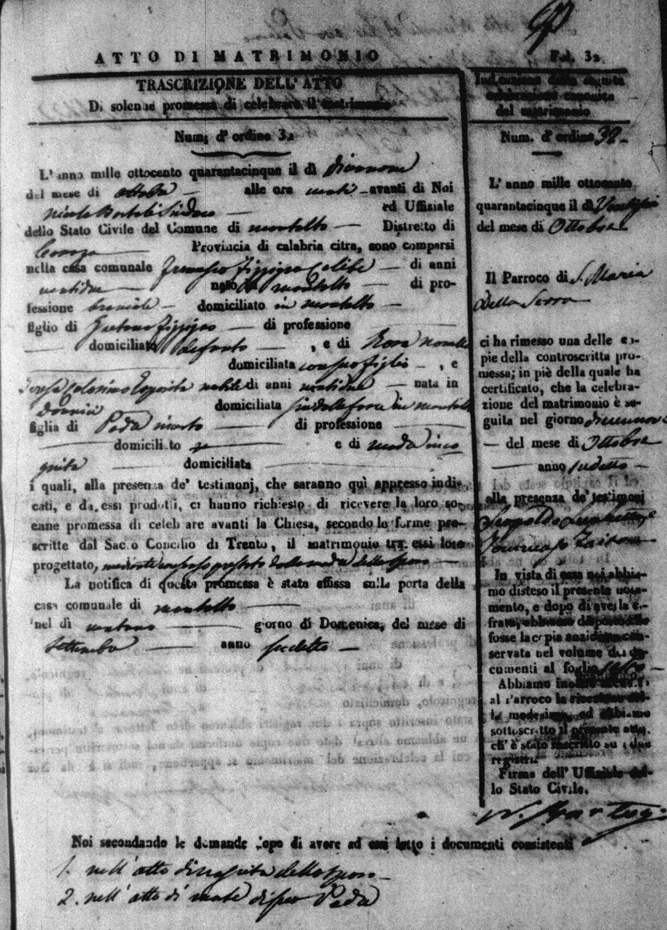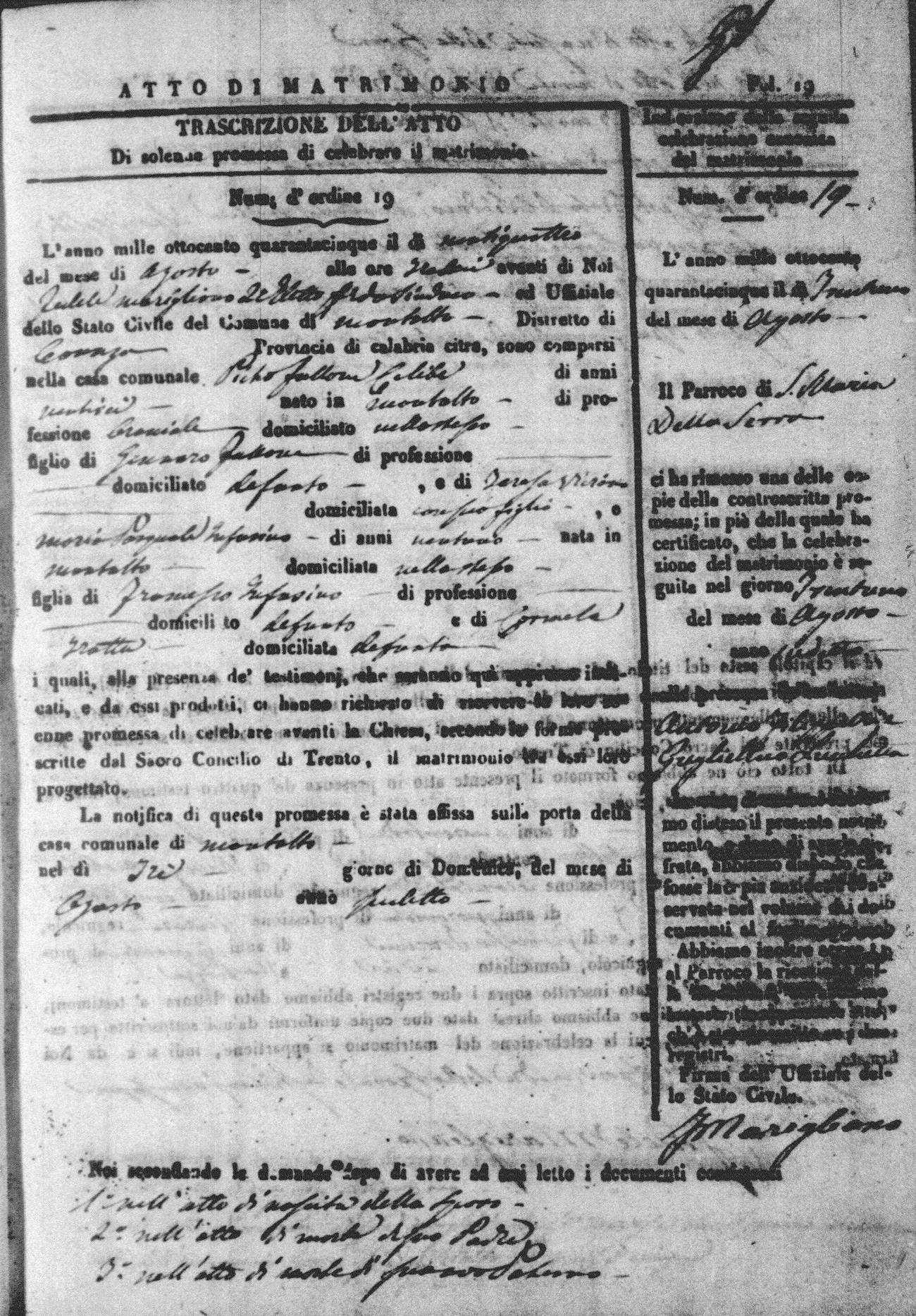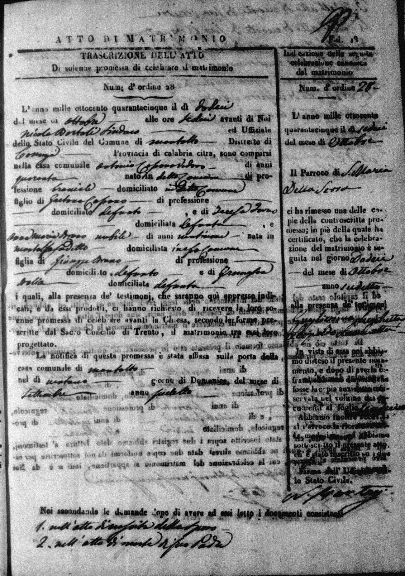 Here are the extractions for all the marriage acts in 1845 for Montalto Uffugo. For more information, click on the groom's surname to view a copy of the original document.