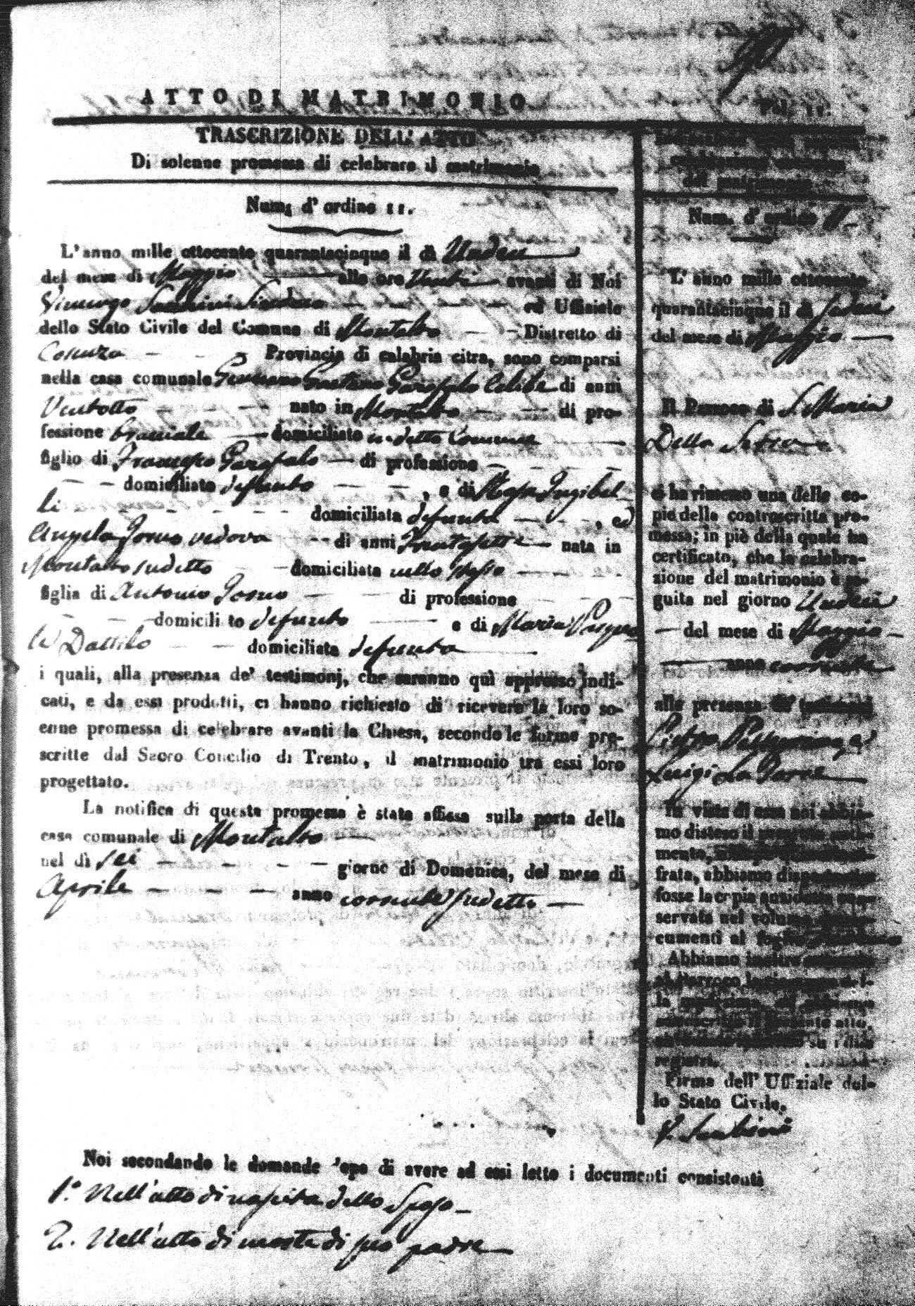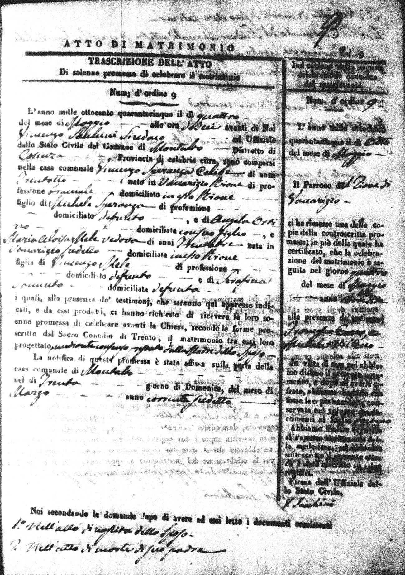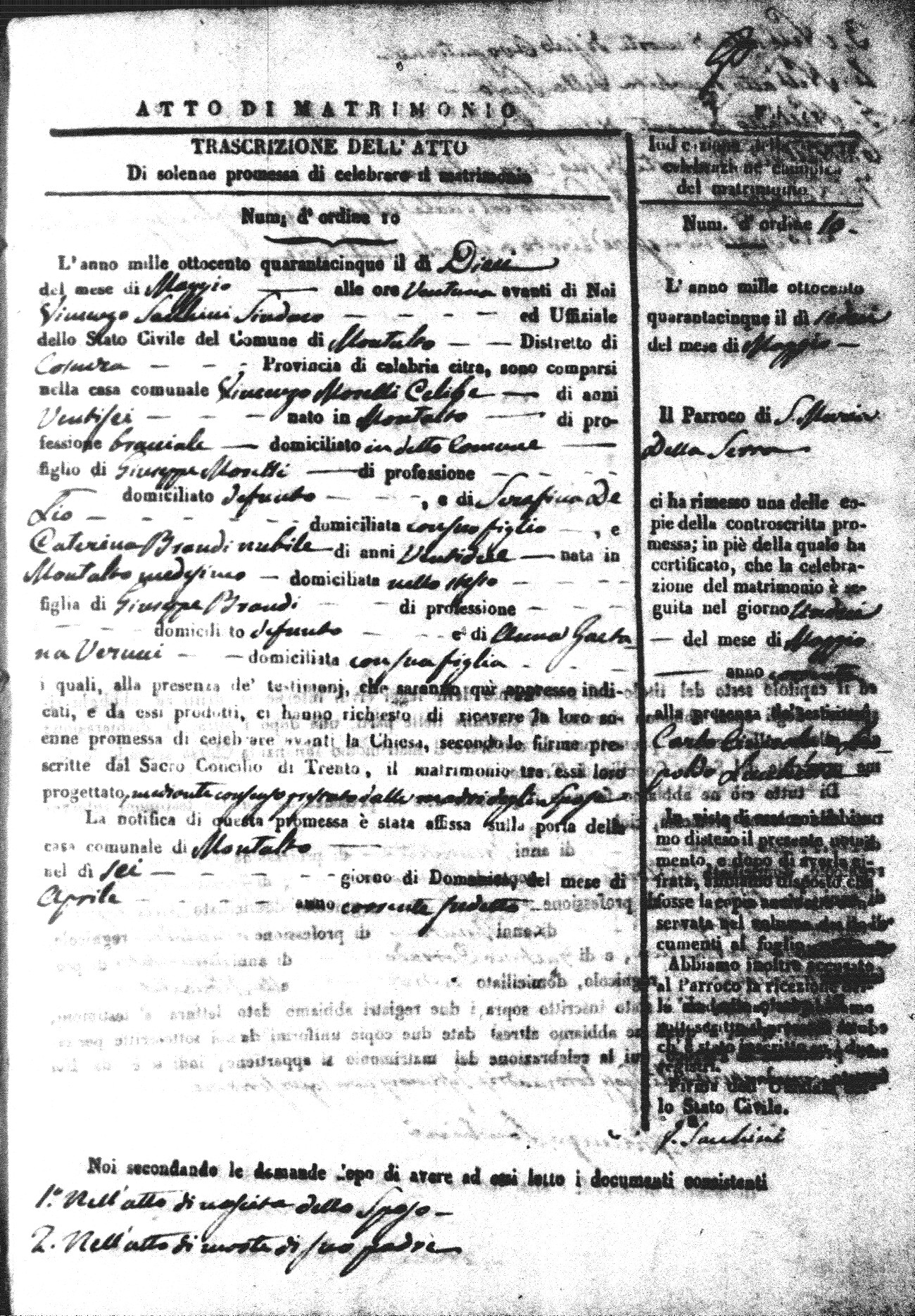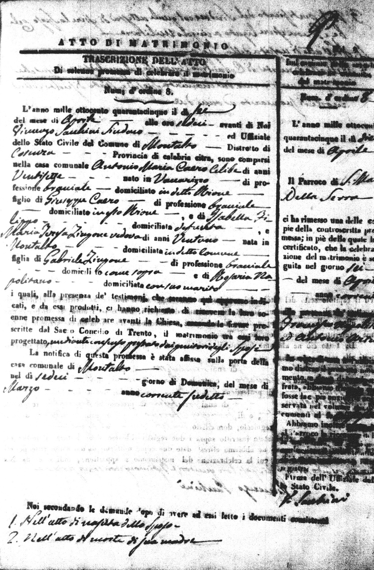 Here are the extractions for all the marriage acts in 1845 for Montalto Uffugo. For more information, click on the groom's surname to view a copy of the original document.