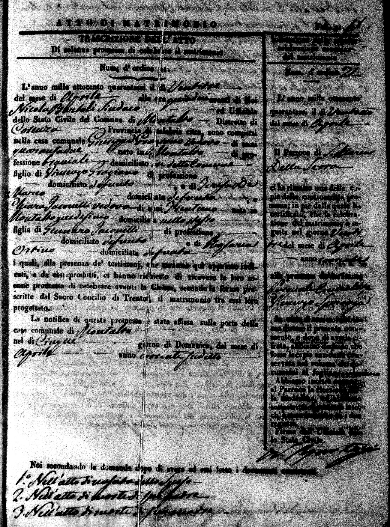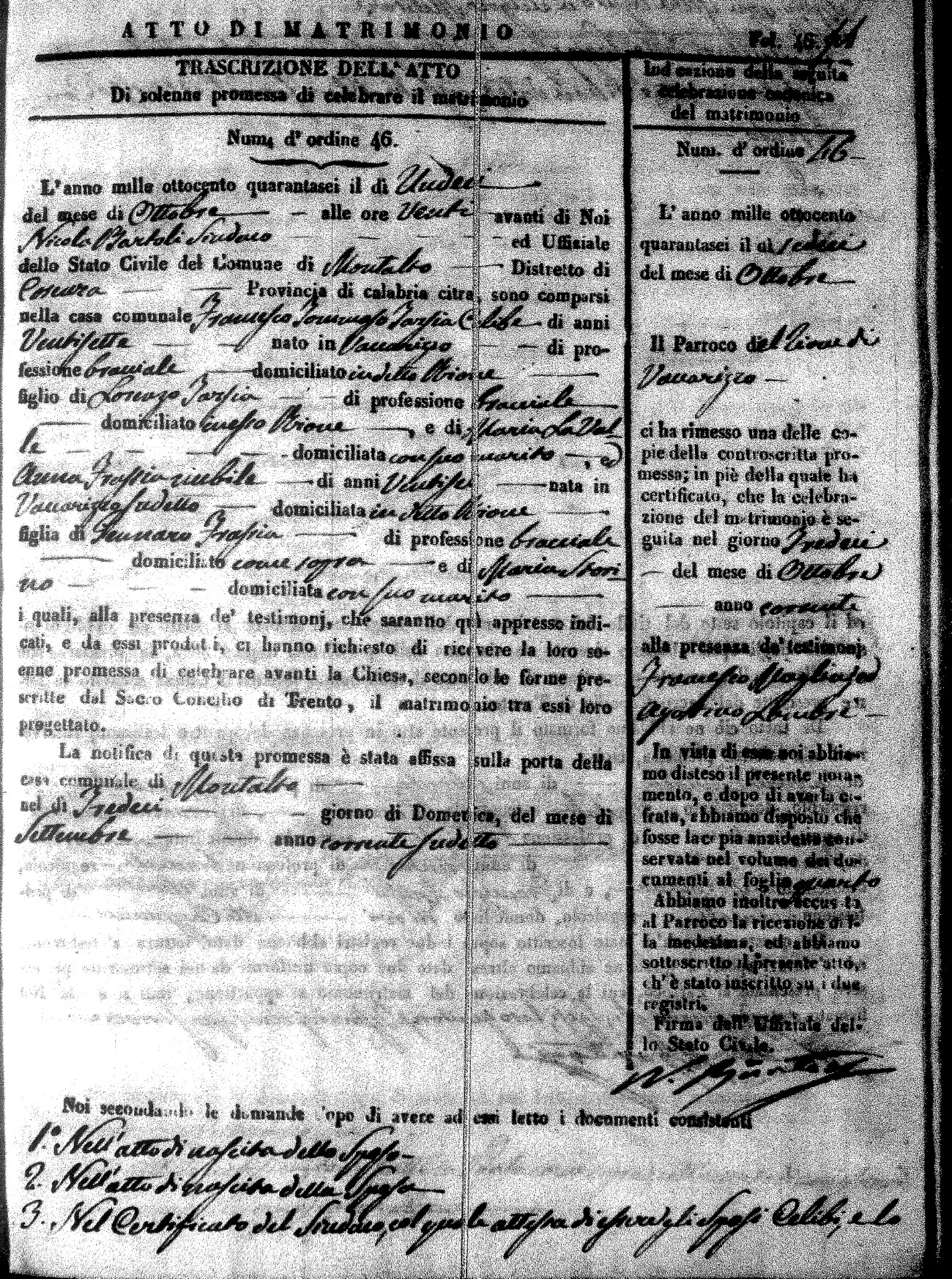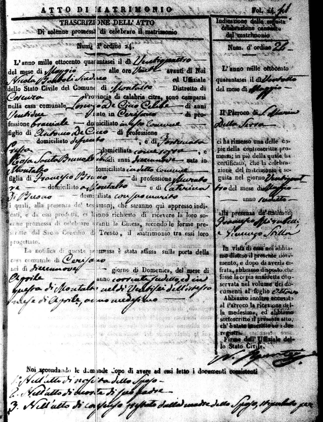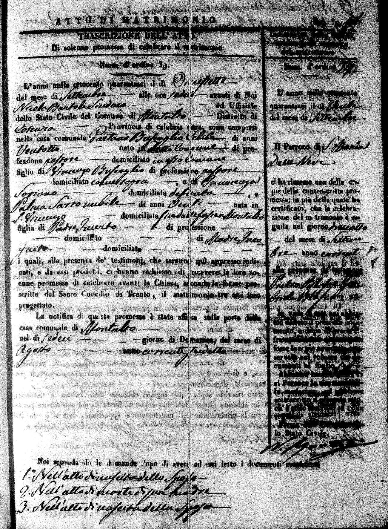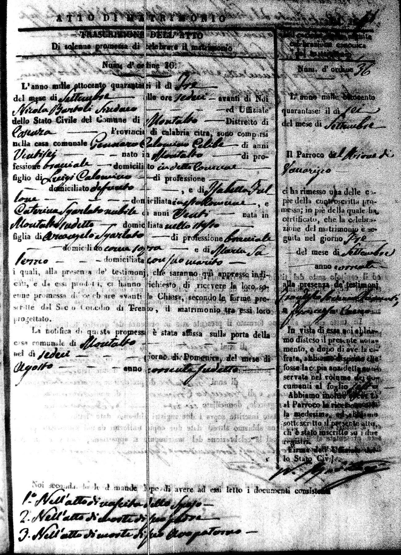 Here are the extractions for the marriage acts in 1846 for Montalto Uffugo. To save time we have only transcribed the names of the groom and bride. For more information, click on the groom's surname to view a copy of the original document.