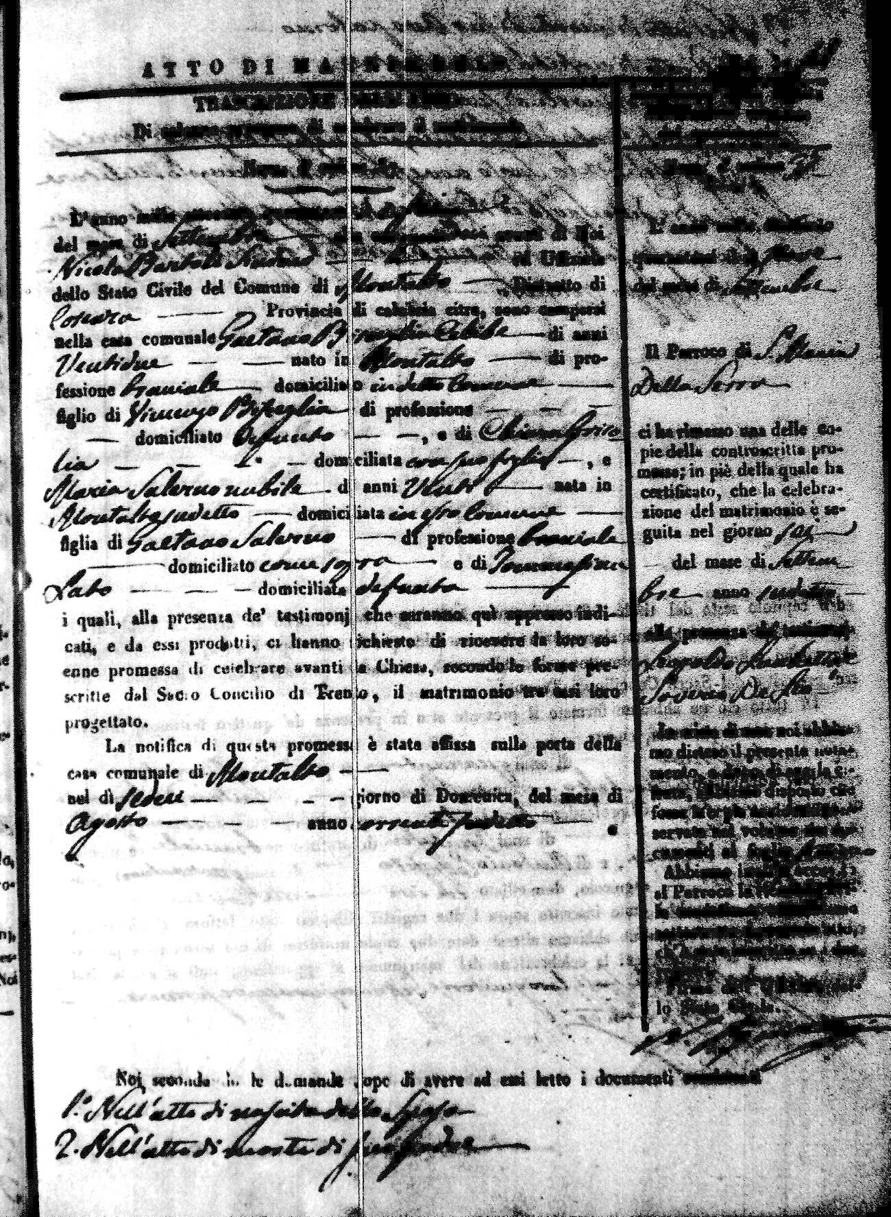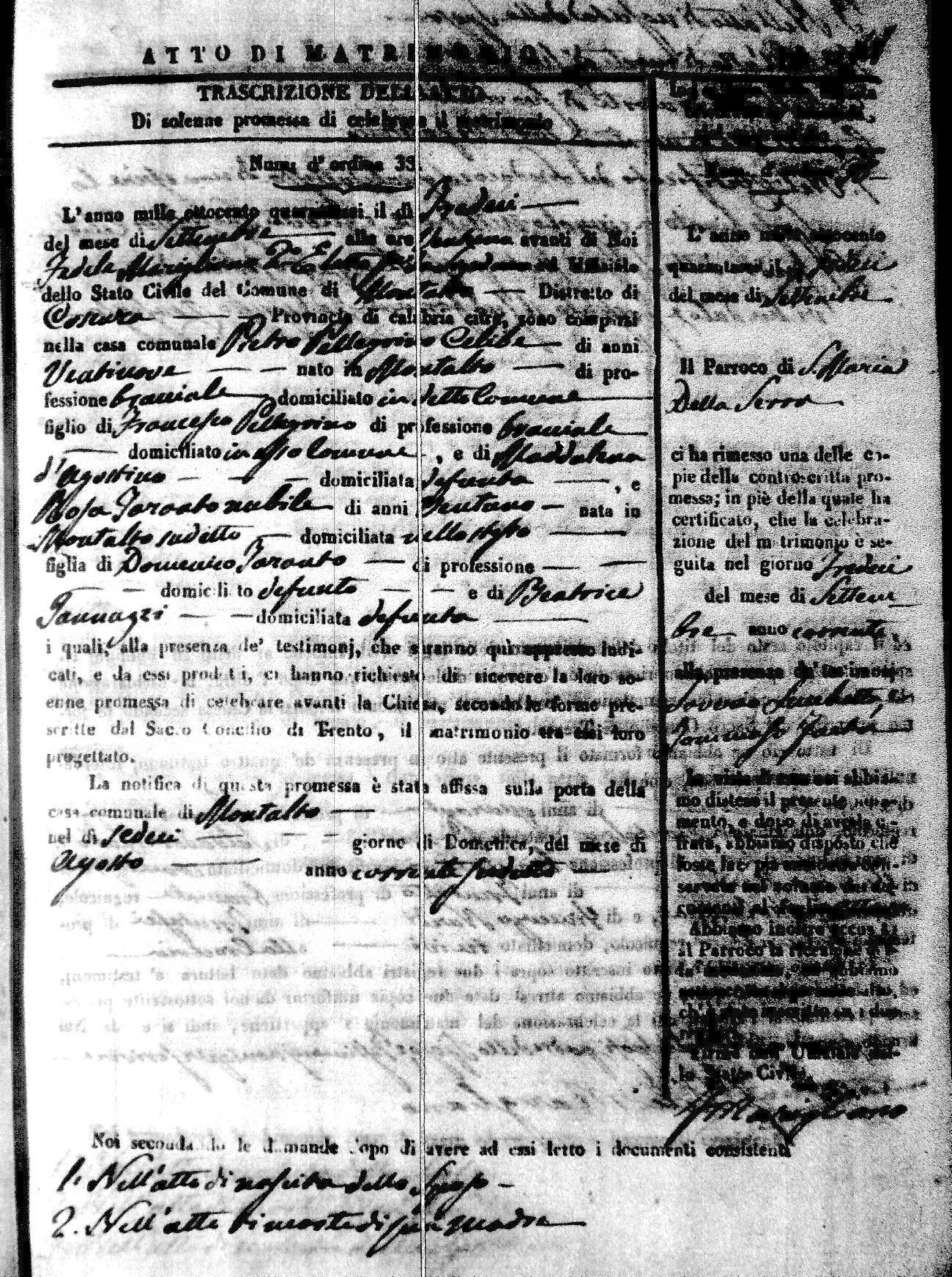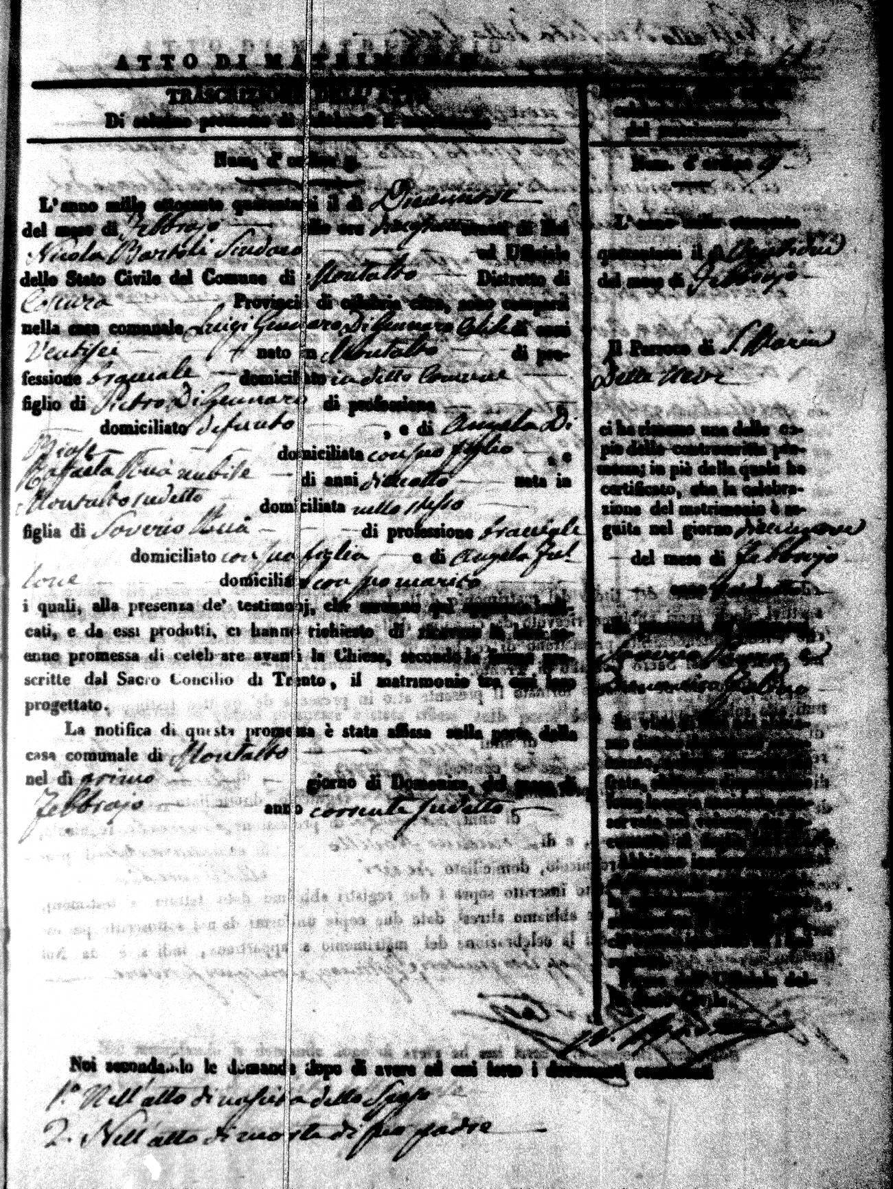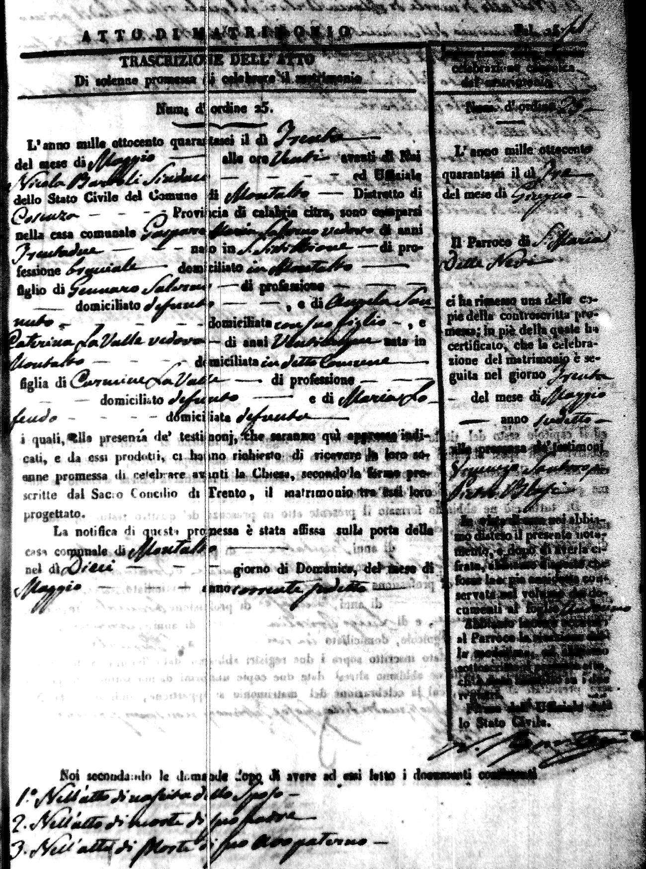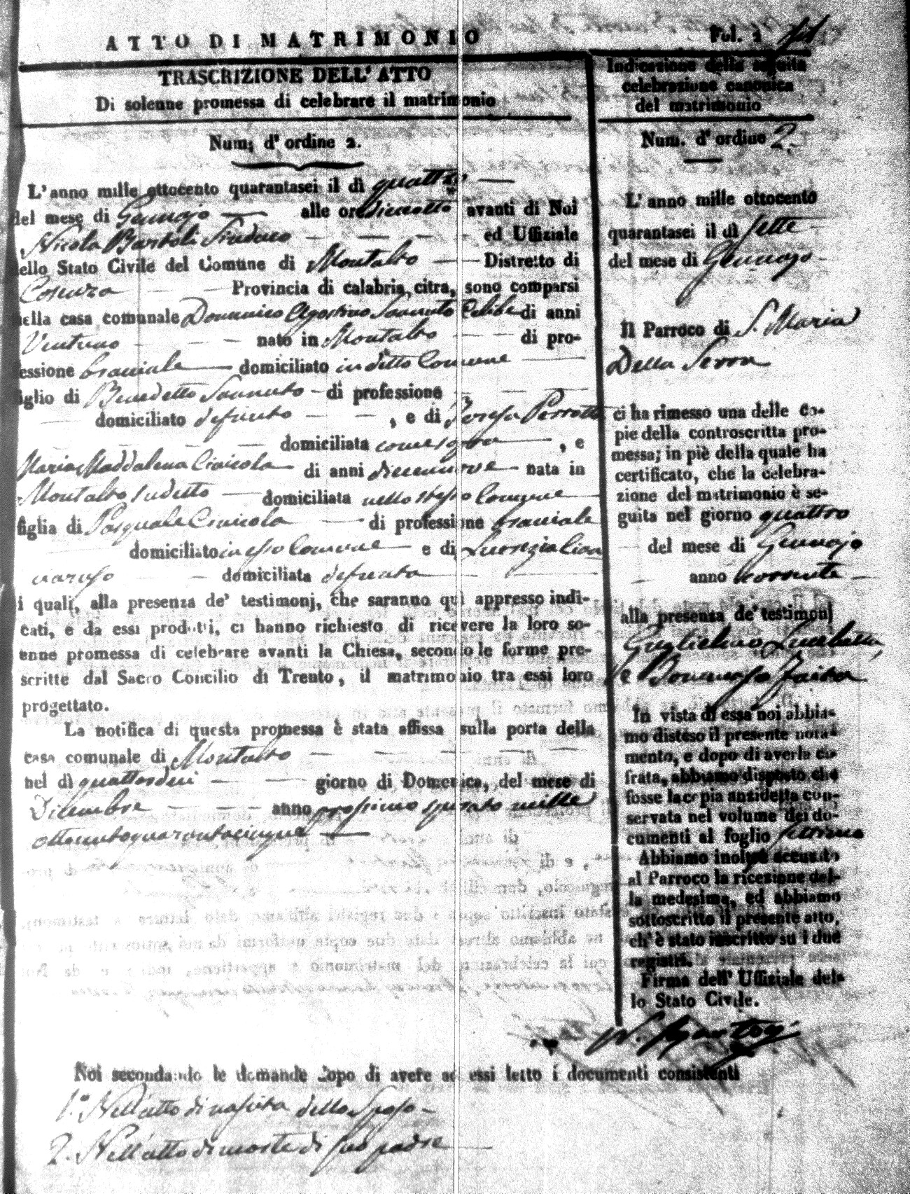 Here are the extractions for the marriage acts in 1846 for Montalto Uffugo. To save time we have only transcribed the names of the groom and bride. For more information, click on the groom's surname to view a copy of the original document.