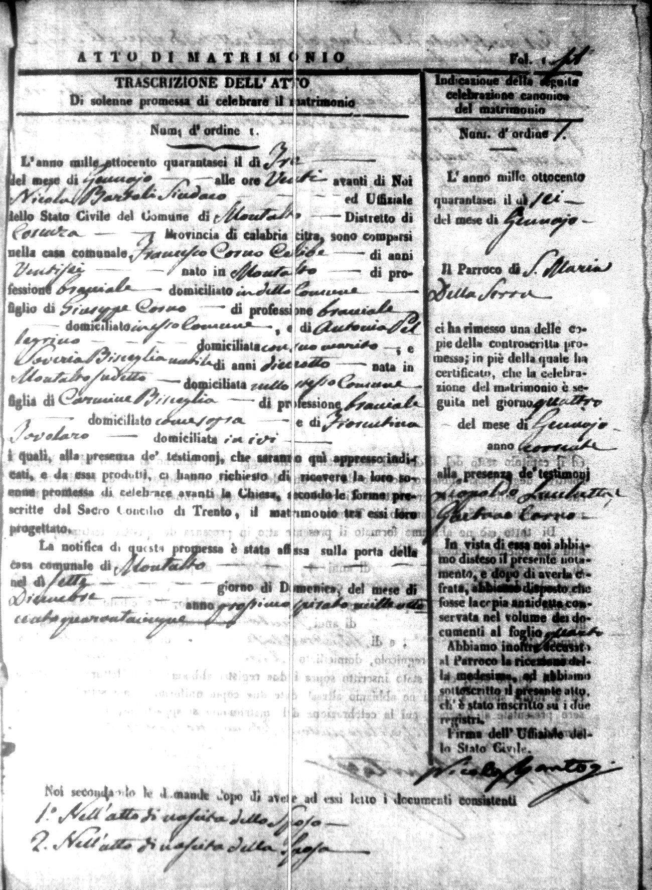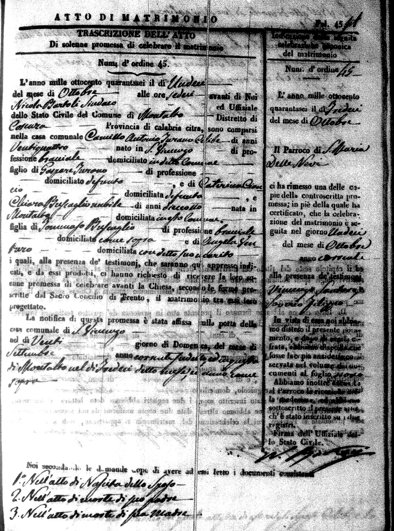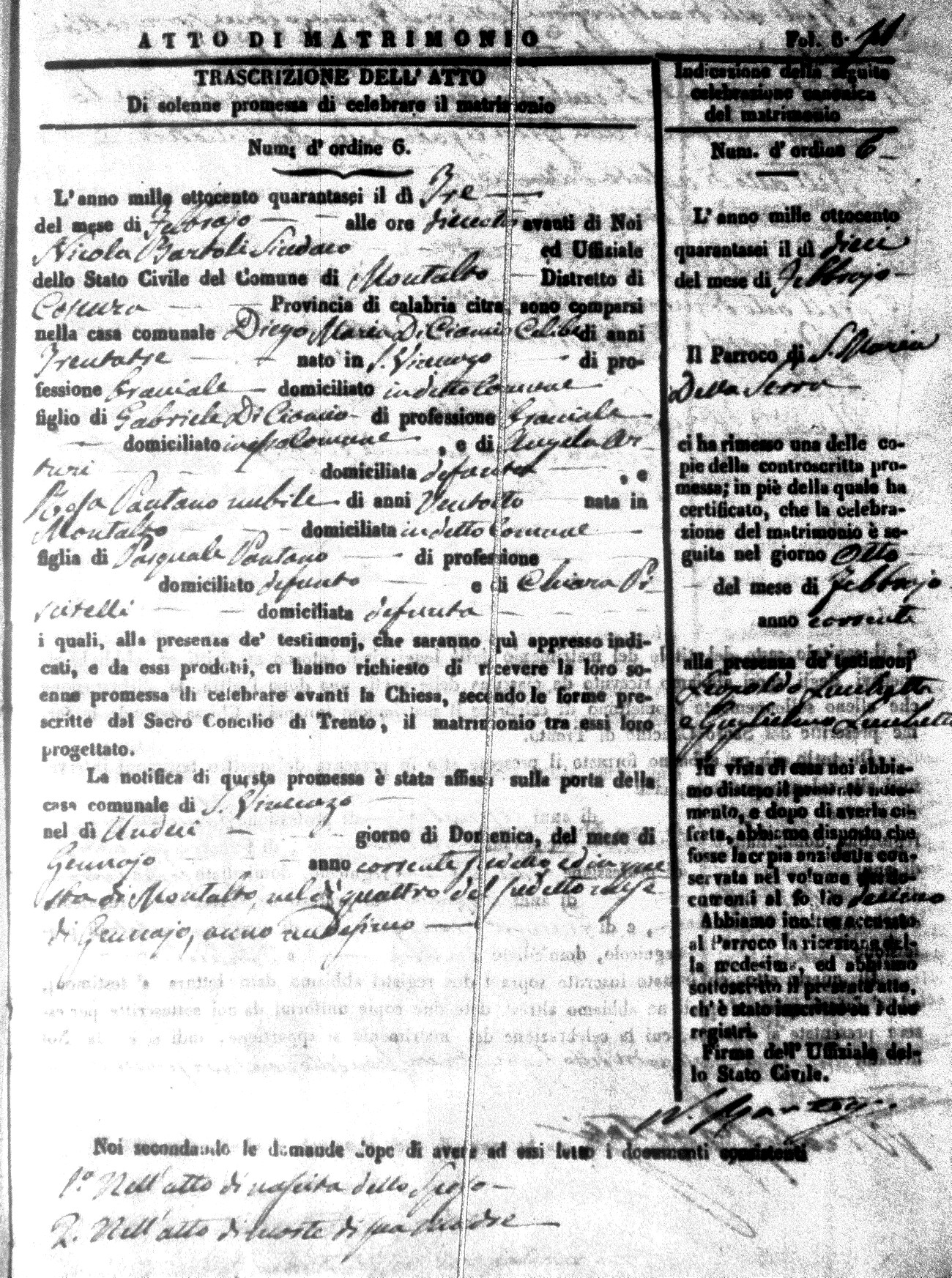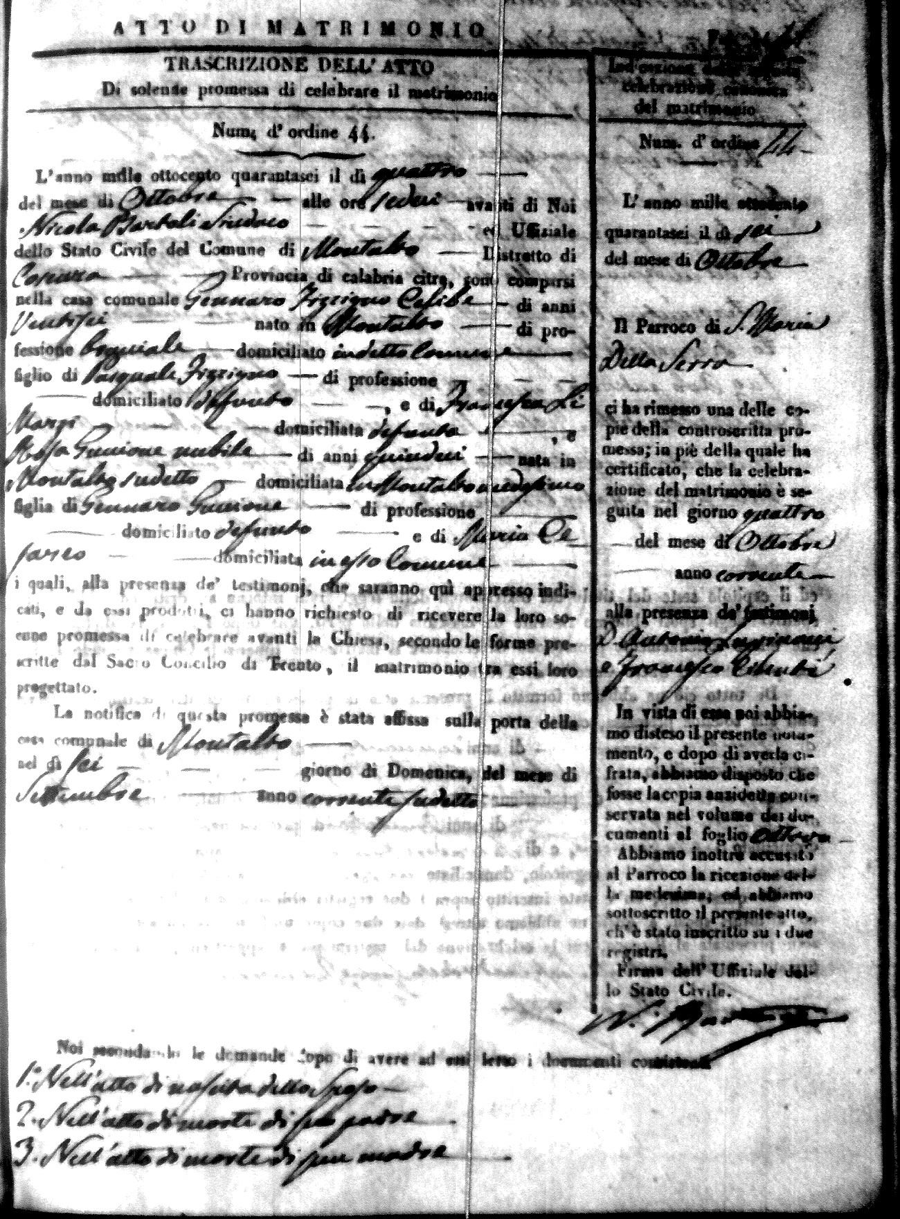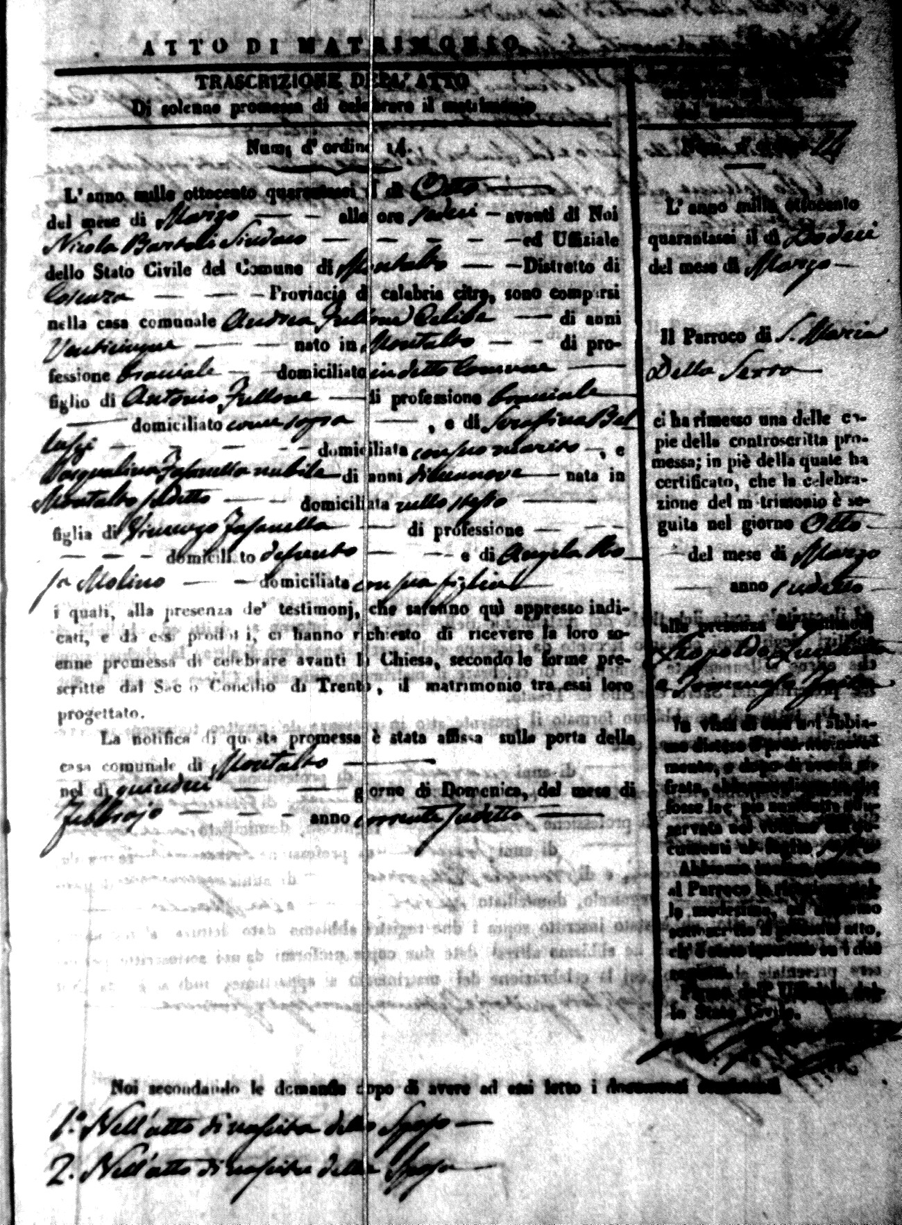 Here are the extractions for the marriage acts in 1846 for Montalto Uffugo. To save time we have only transcribed the names of the groom and bride. For more information, click on the groom's surname to view a copy of the original document.