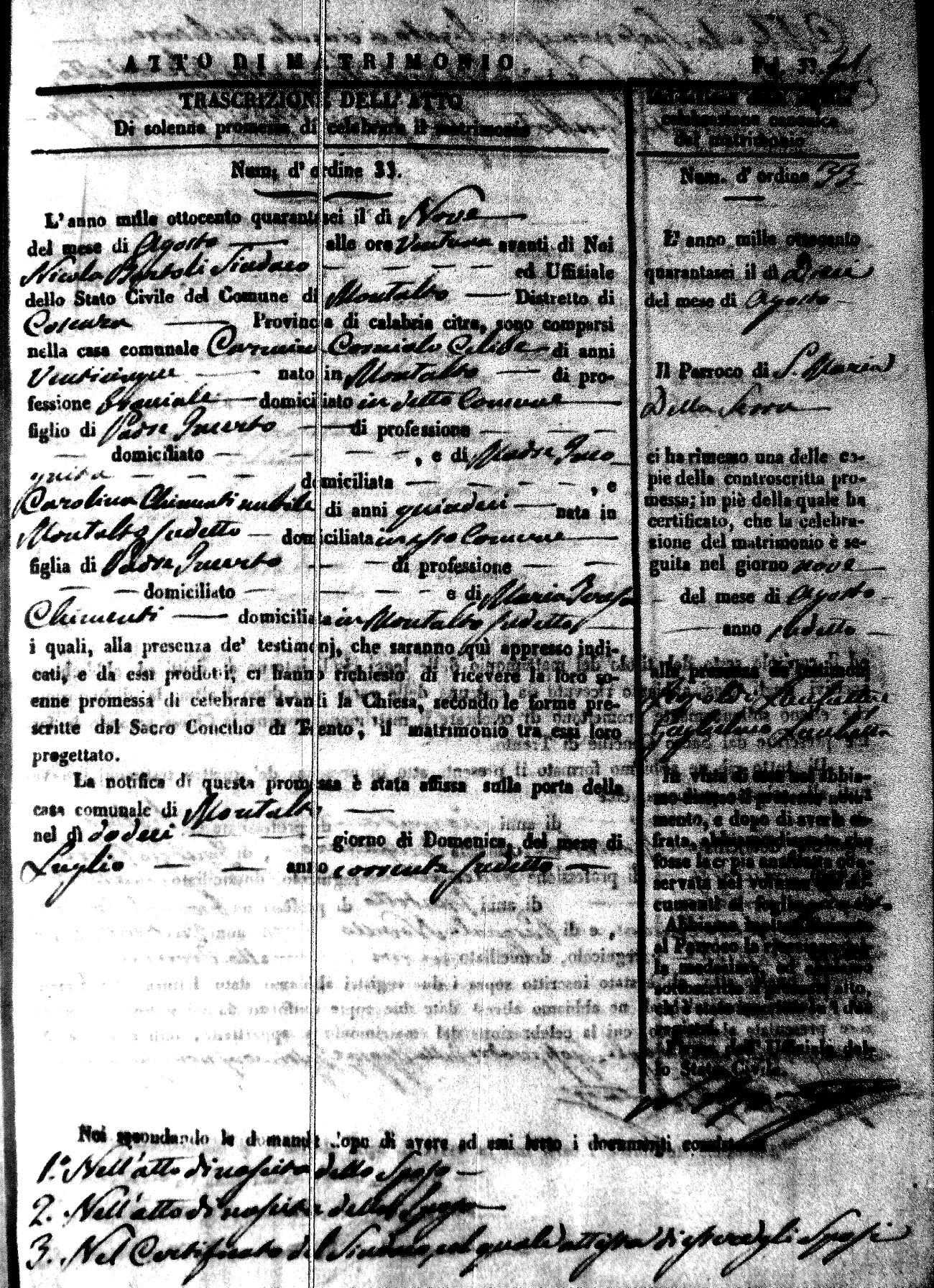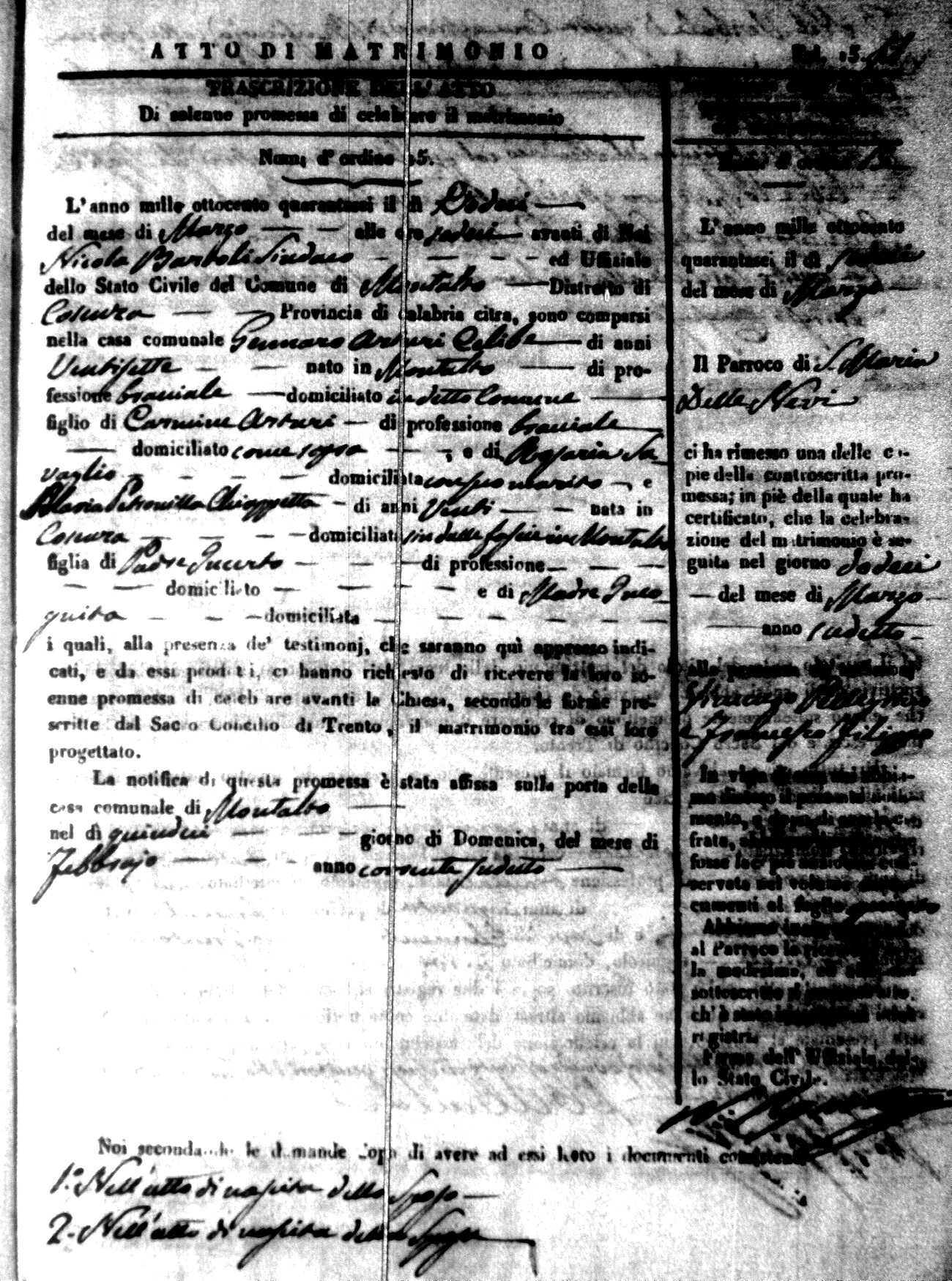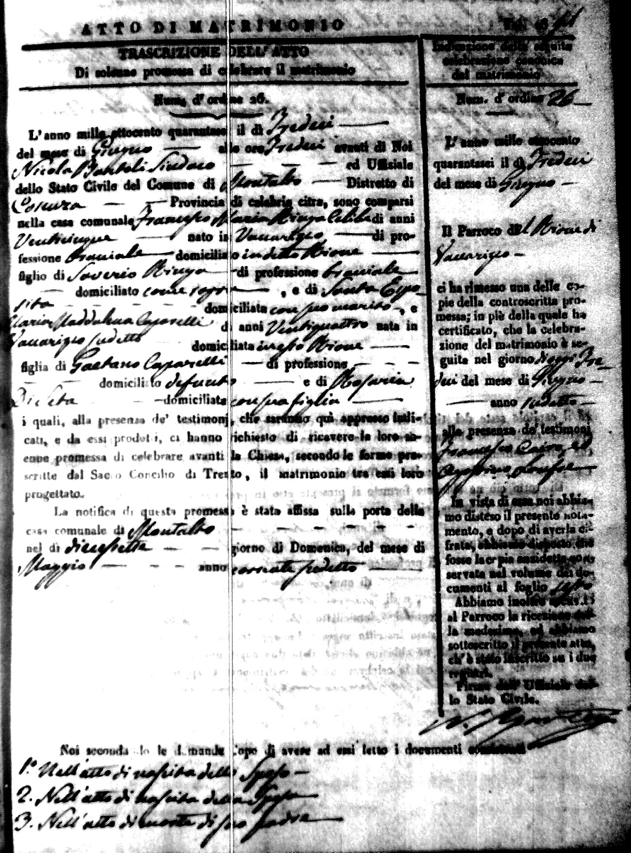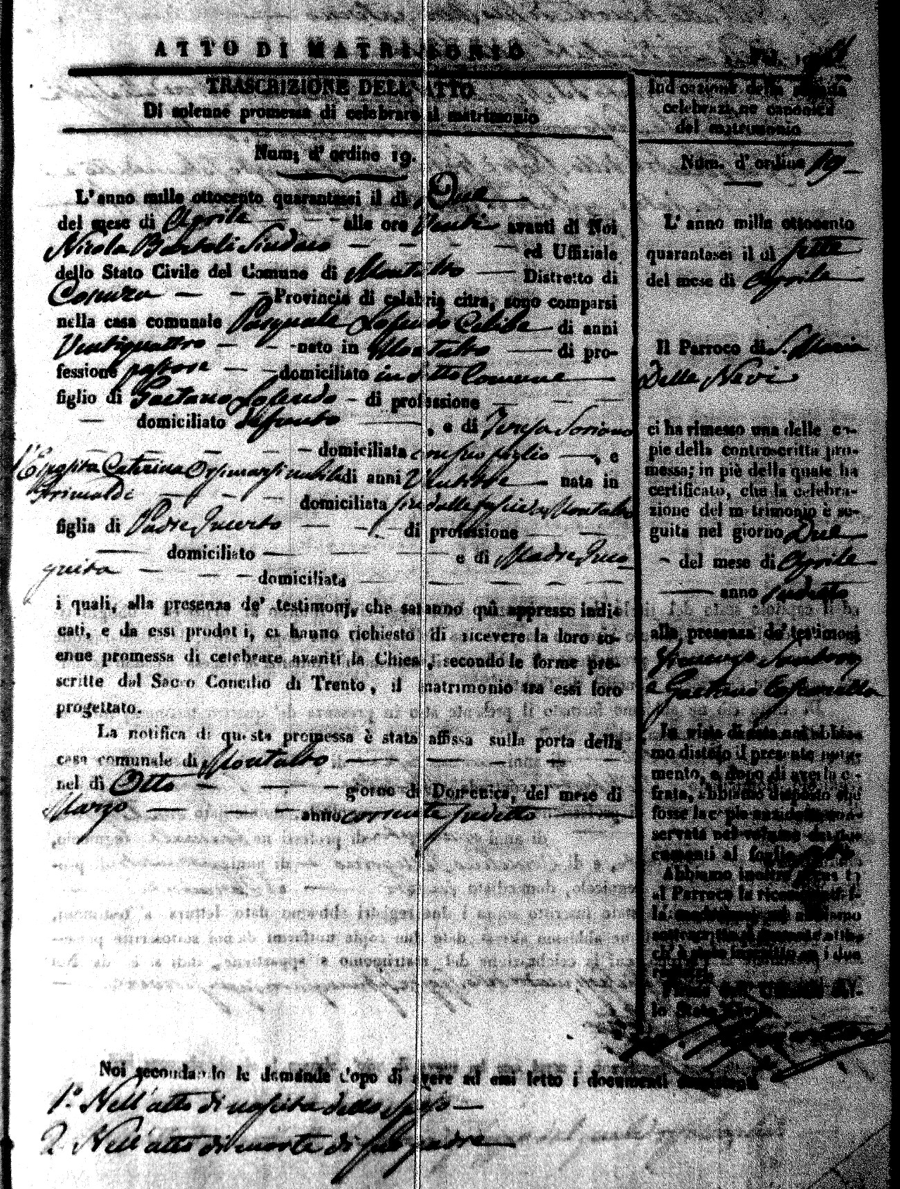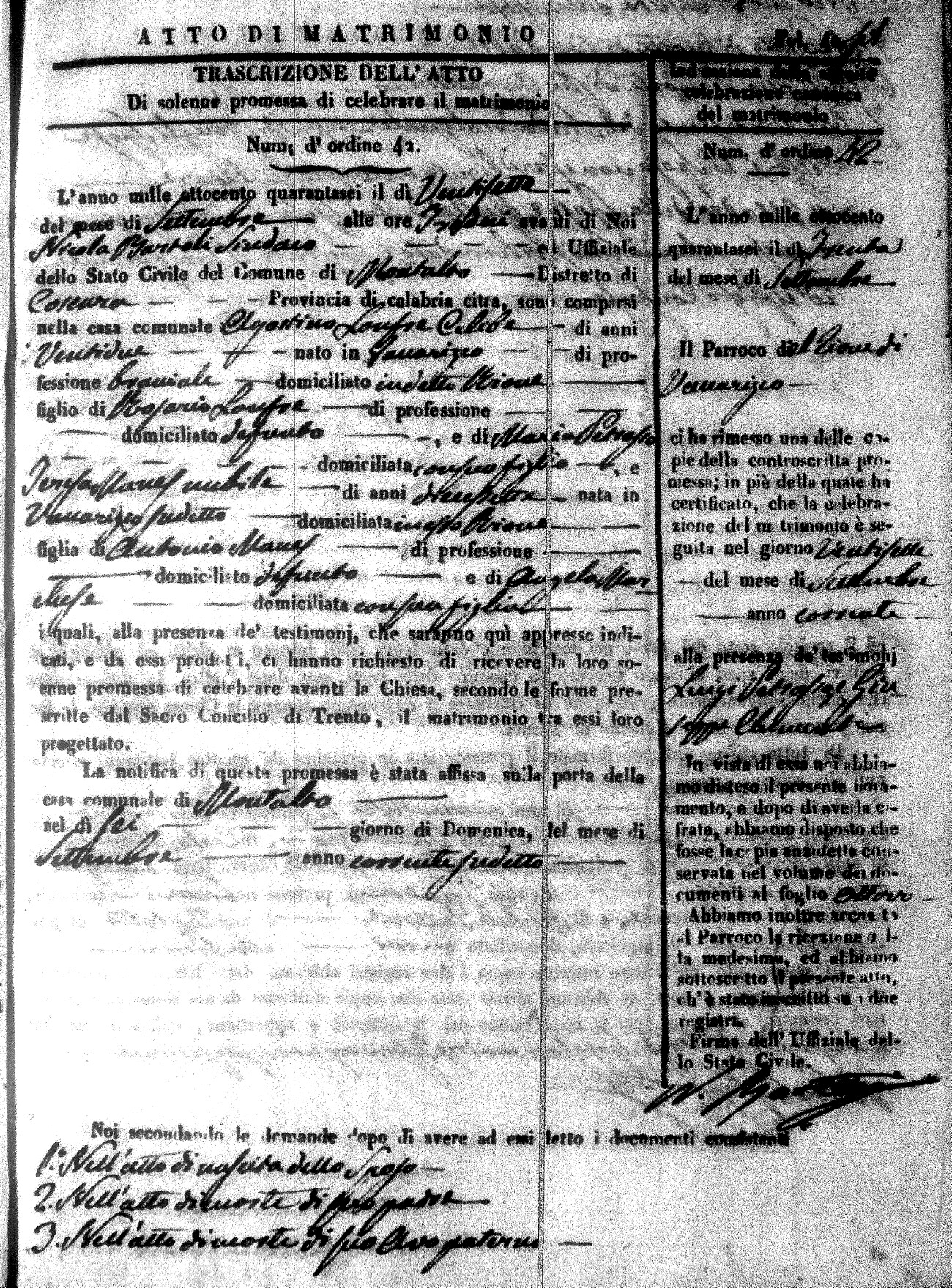 Here are the extractions for the marriage acts in 1846 for Montalto Uffugo. To save time we have only transcribed the names of the groom and bride. For more information, click on the groom's surname to view a copy of the original document.