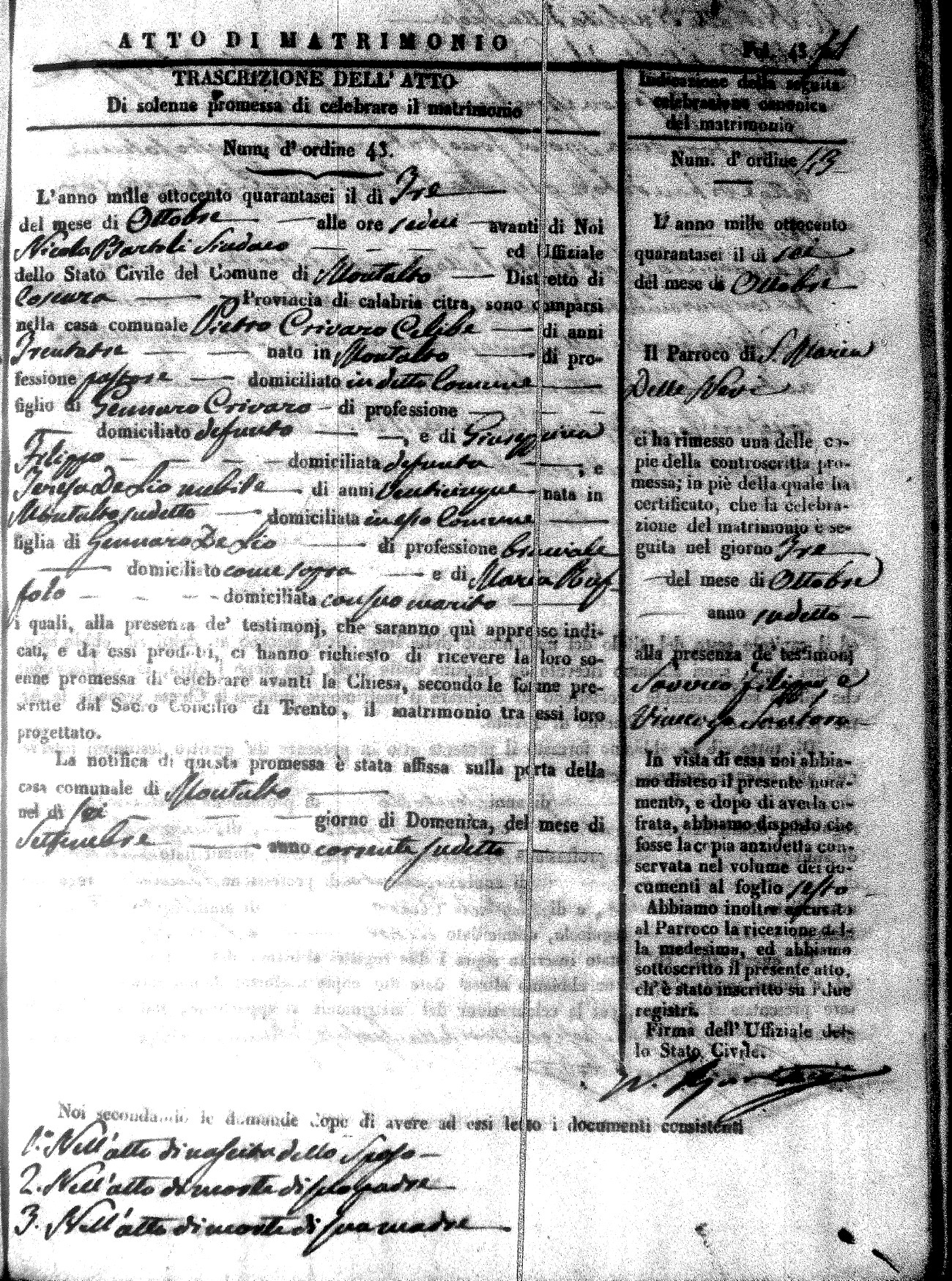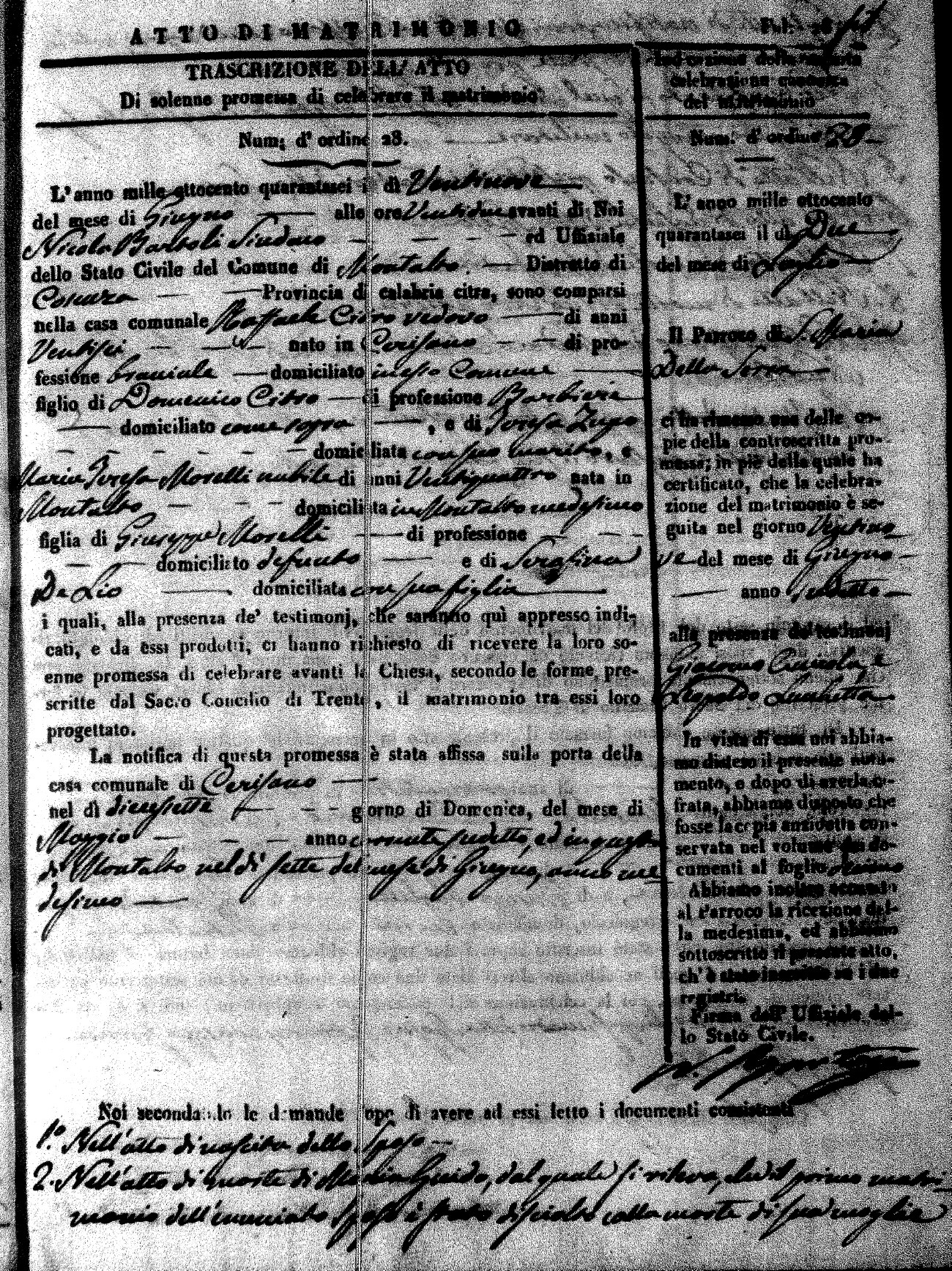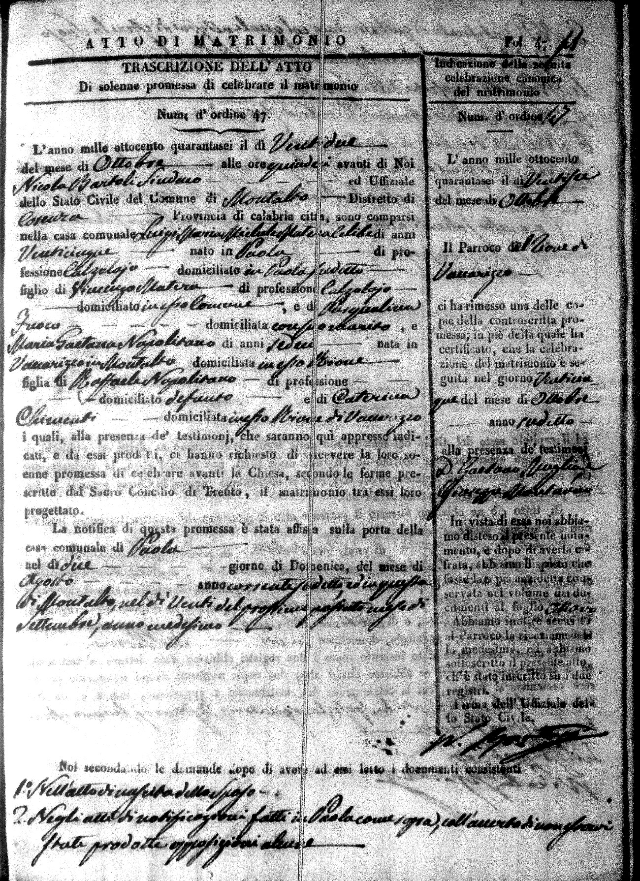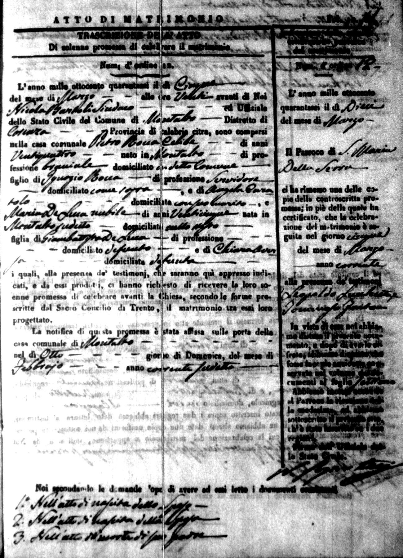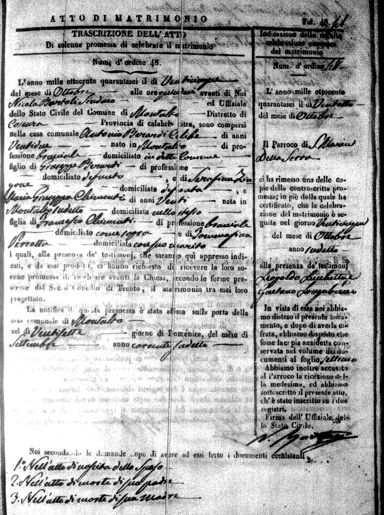 Here are the extractions for the marriage acts in 1846 for Montalto Uffugo. To save time we have only transcribed the names of the groom and bride. For more information, click on the groom's surname to view a copy of the original document.