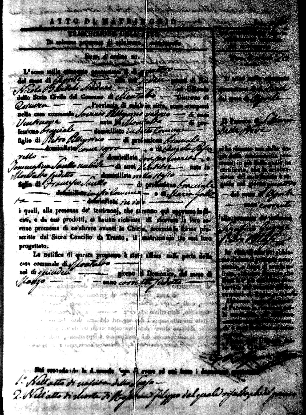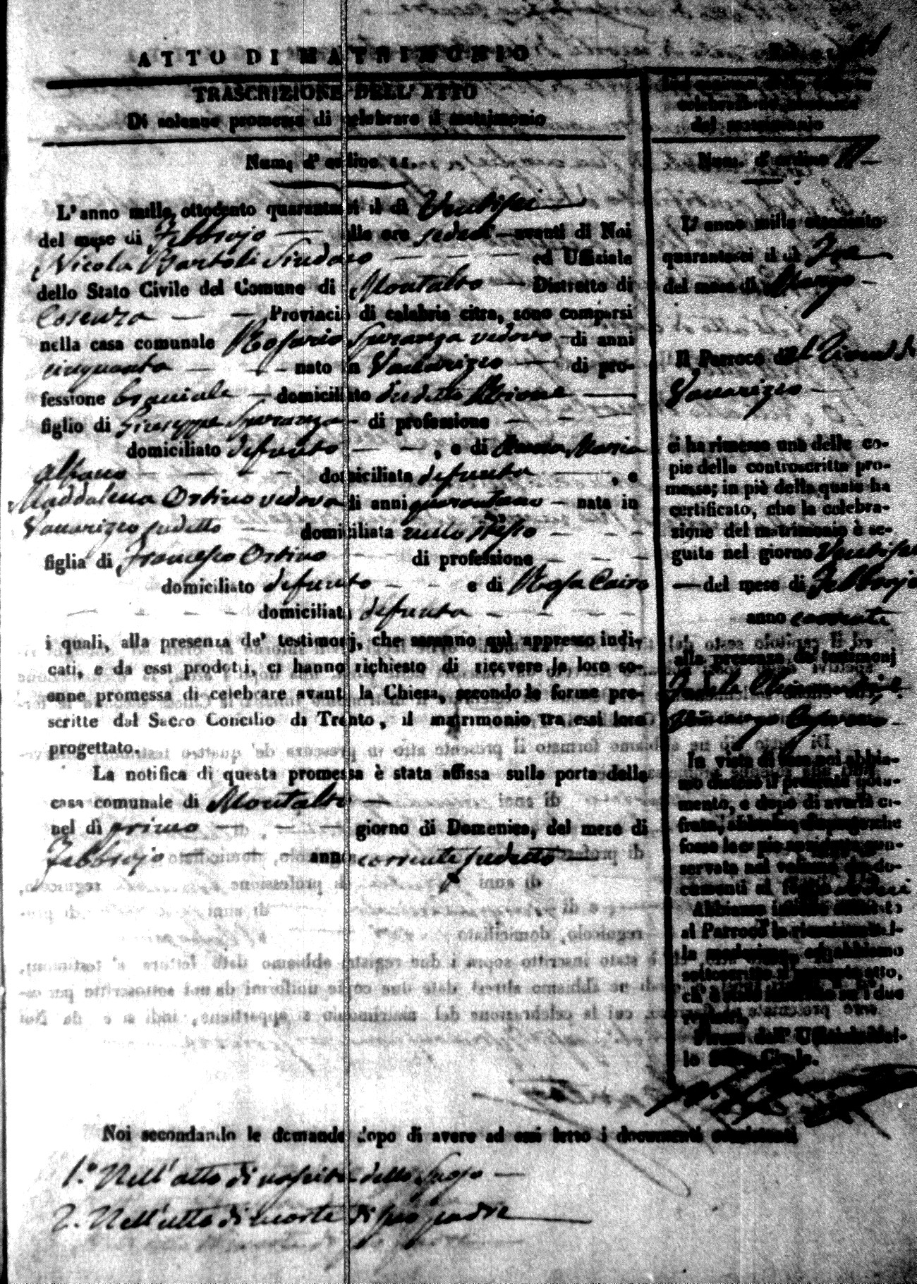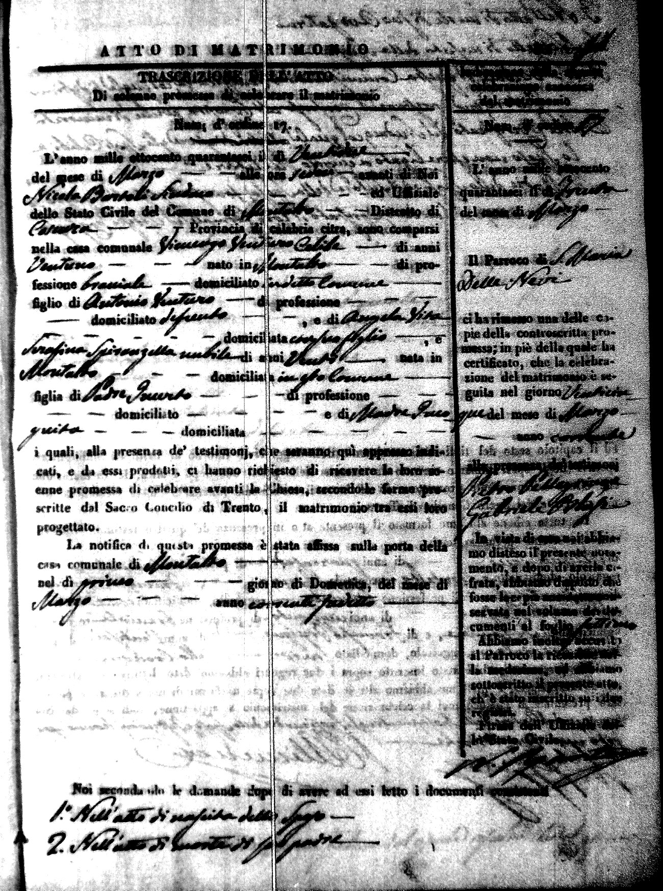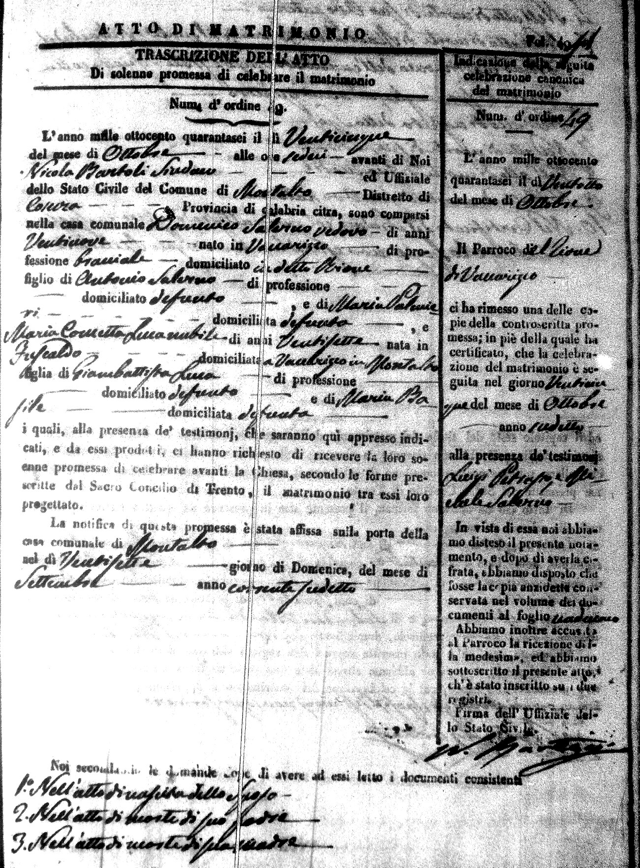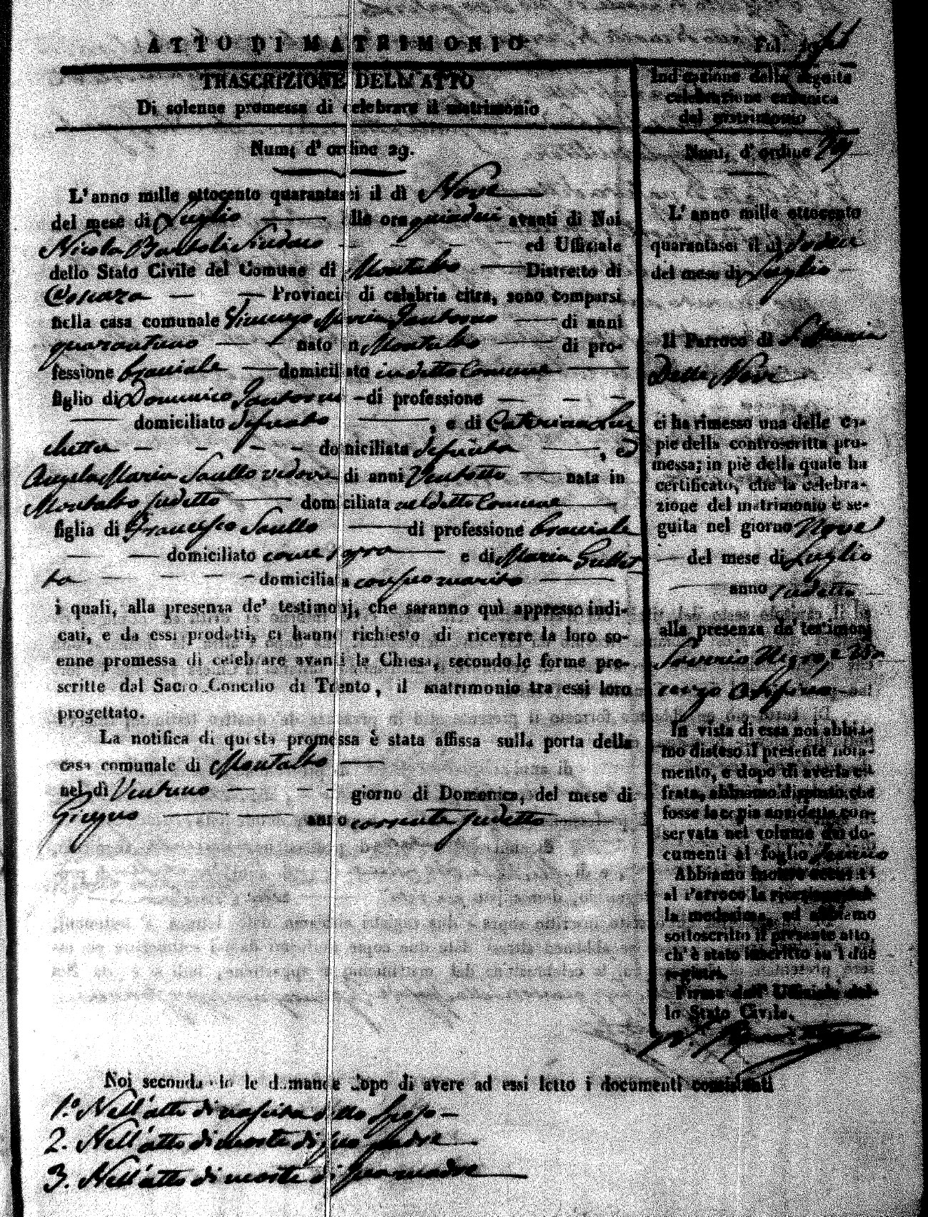 Here are the extractions for the marriage acts in 1846 for Montalto Uffugo. To save time we have only transcribed the names of the groom and bride. For more information, click on the groom's surname to view a copy of the original document.