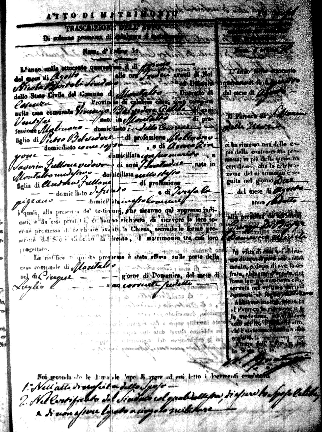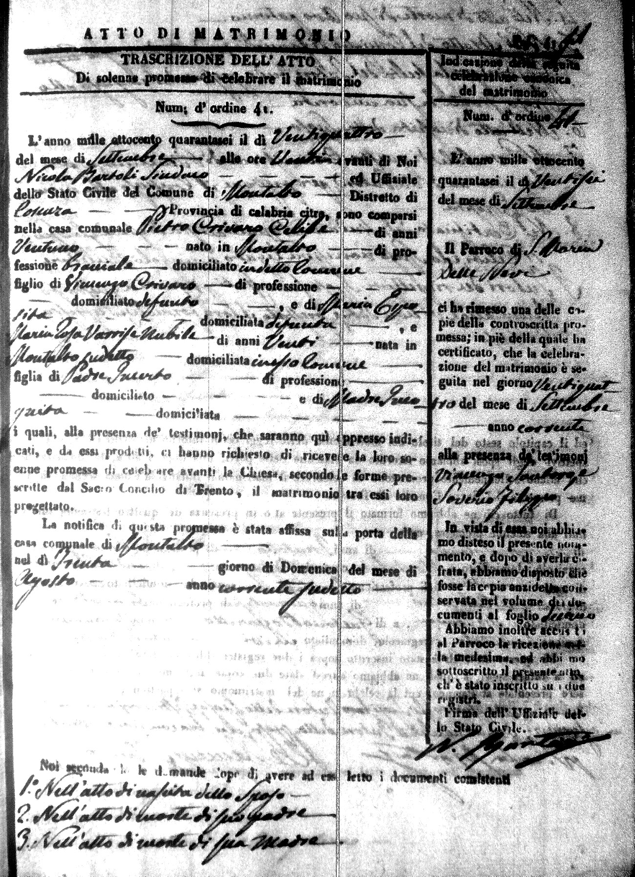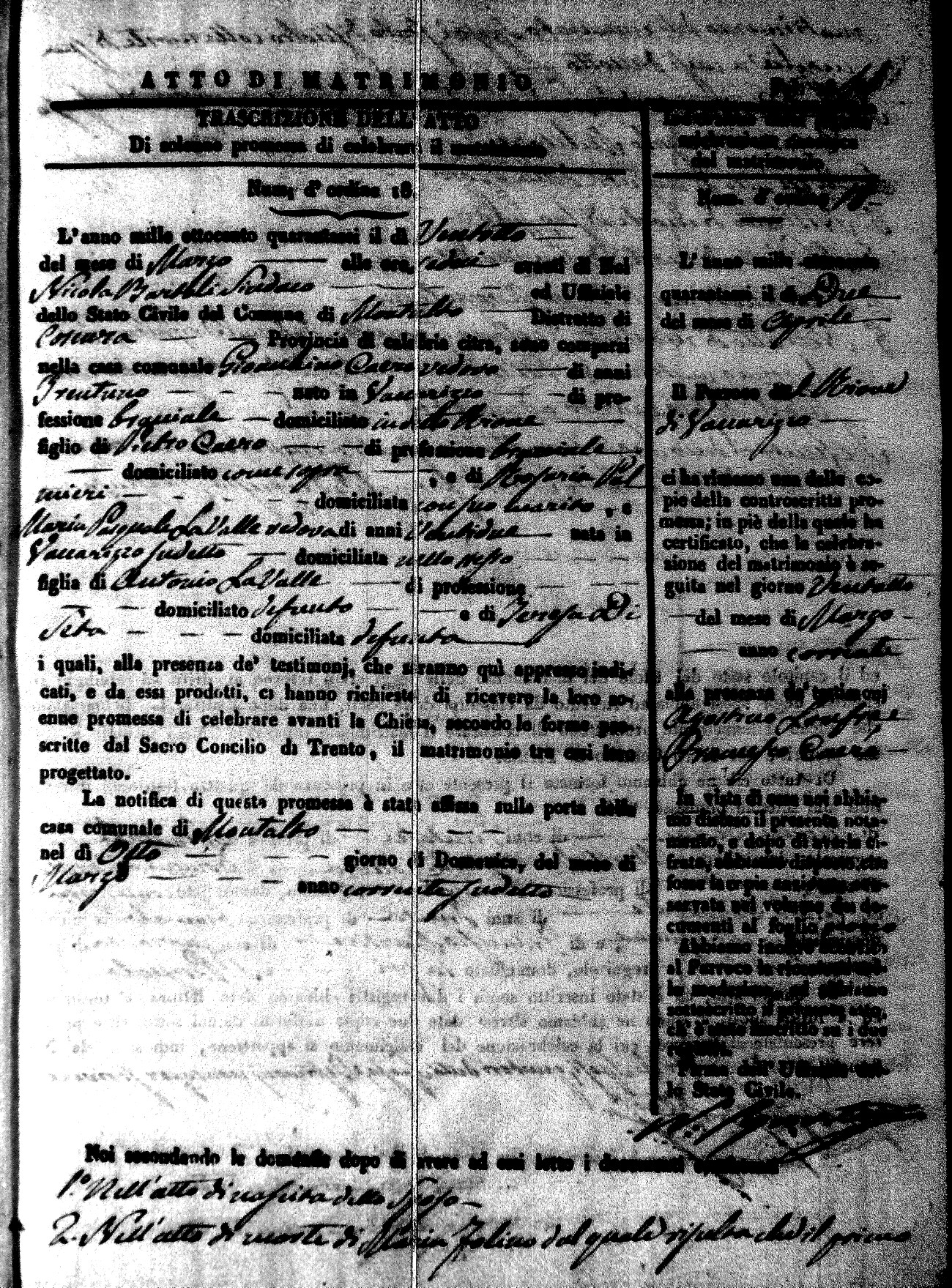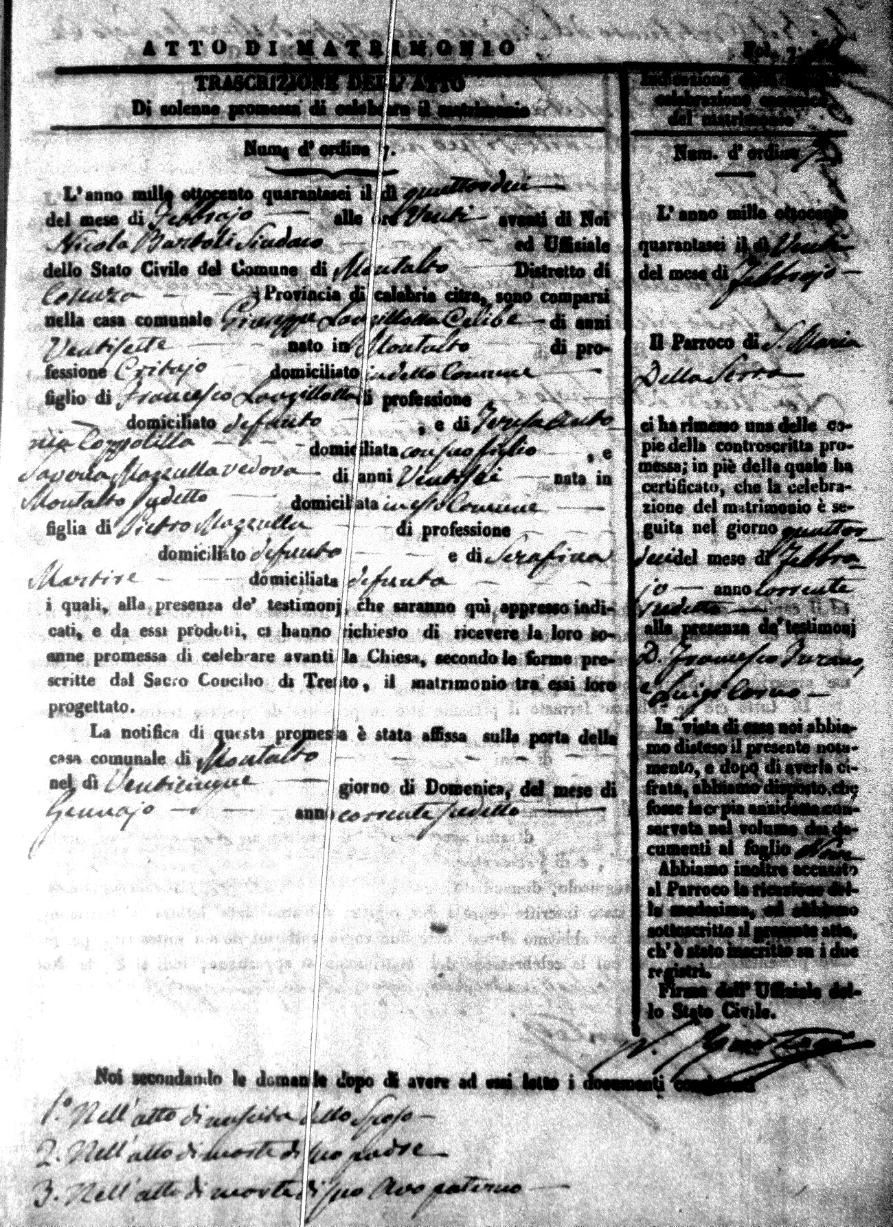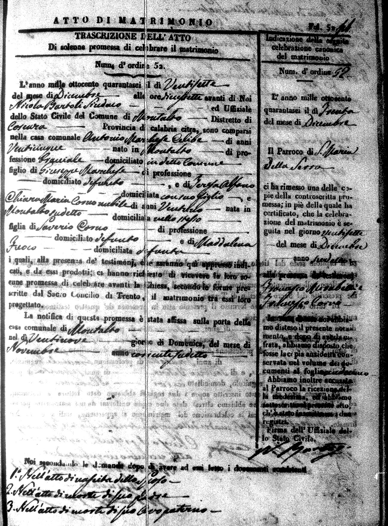 Here are the extractions for the marriage acts in 1846 for Montalto Uffugo. To save time we have only transcribed the names of the groom and bride. For more information, click on the groom's surname to view a copy of the original document.