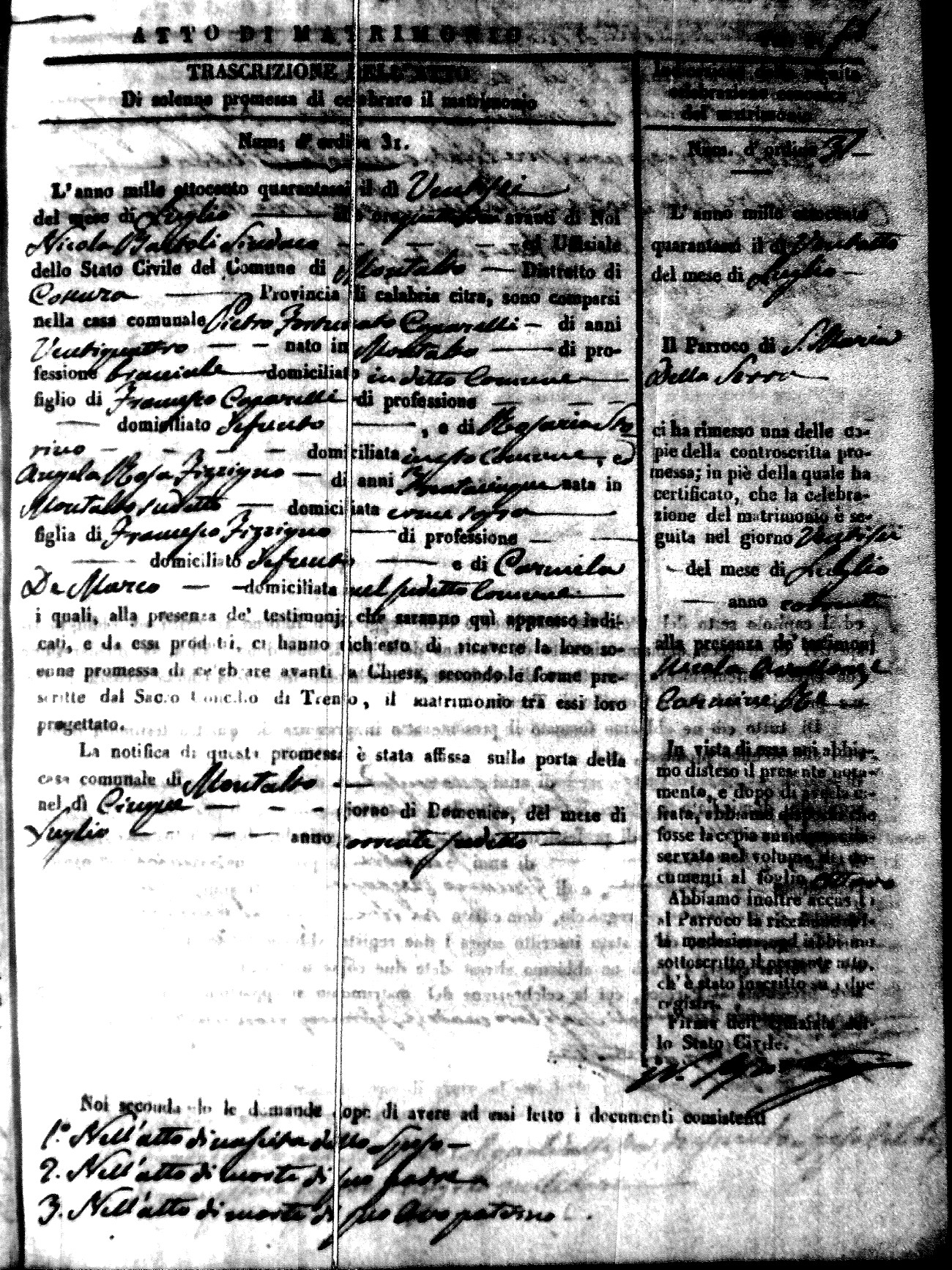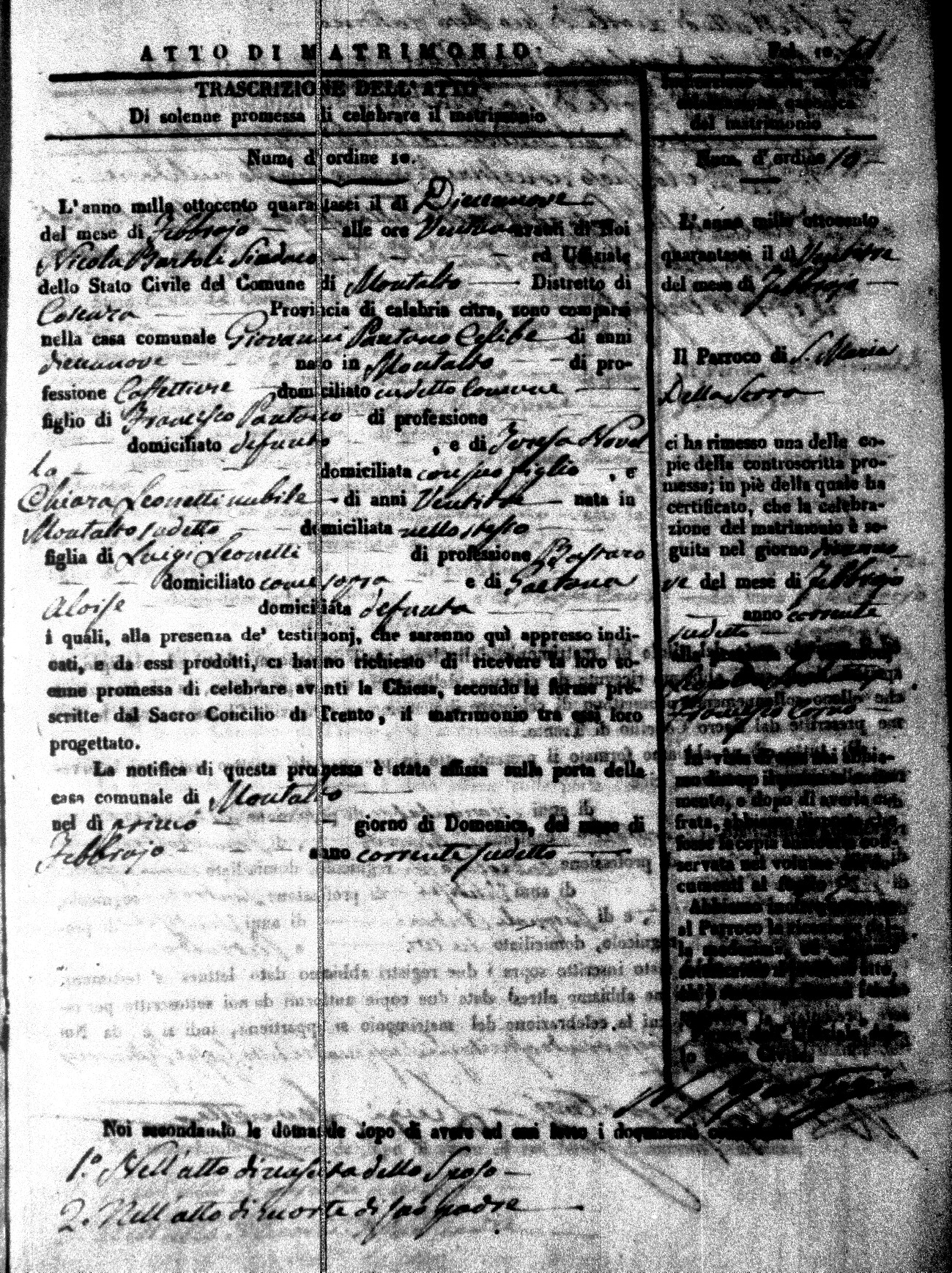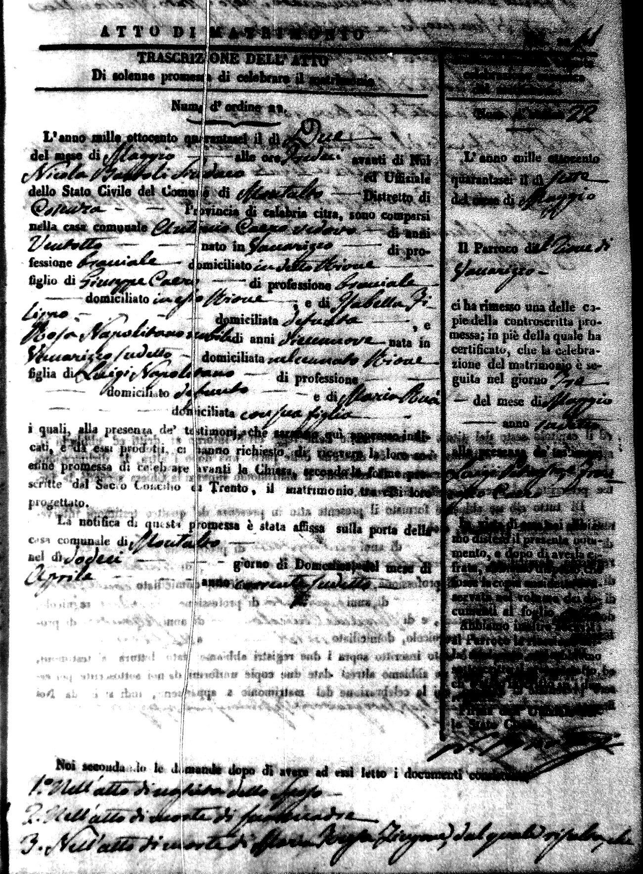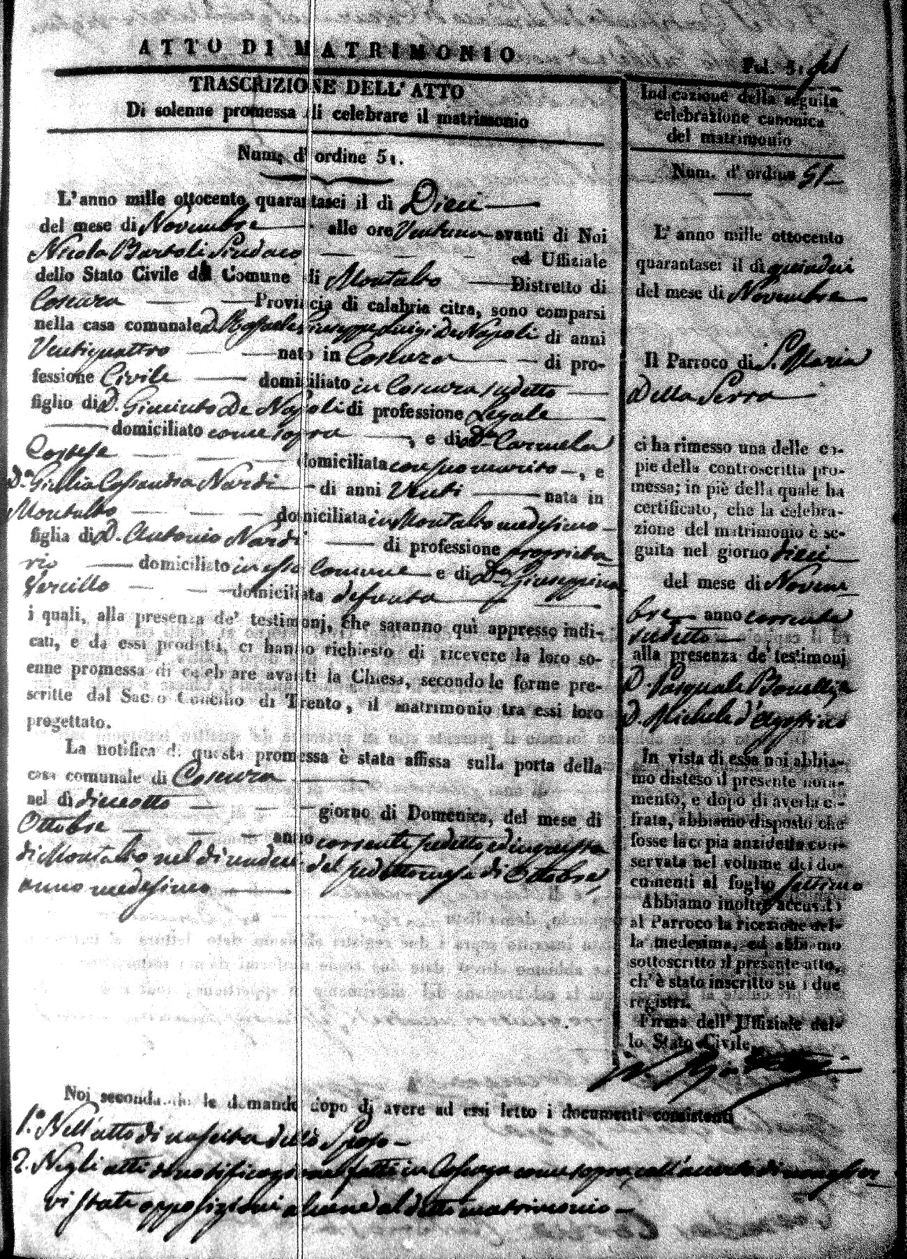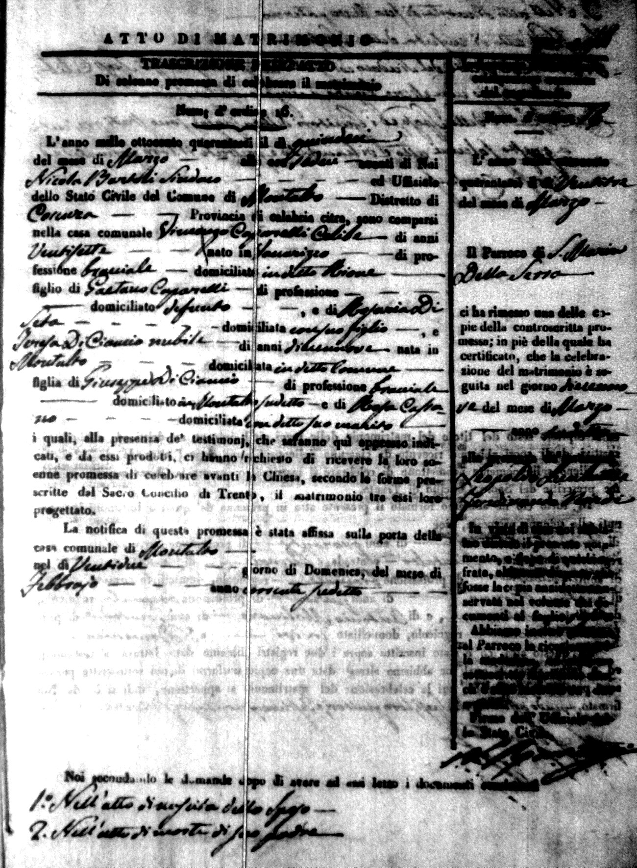Here are the extractions for the marriage acts in 1846 for Montalto Uffugo. To save time we have only transcribed the names of the groom and bride. For more information, click on the groom's surname to view a copy of the original document.