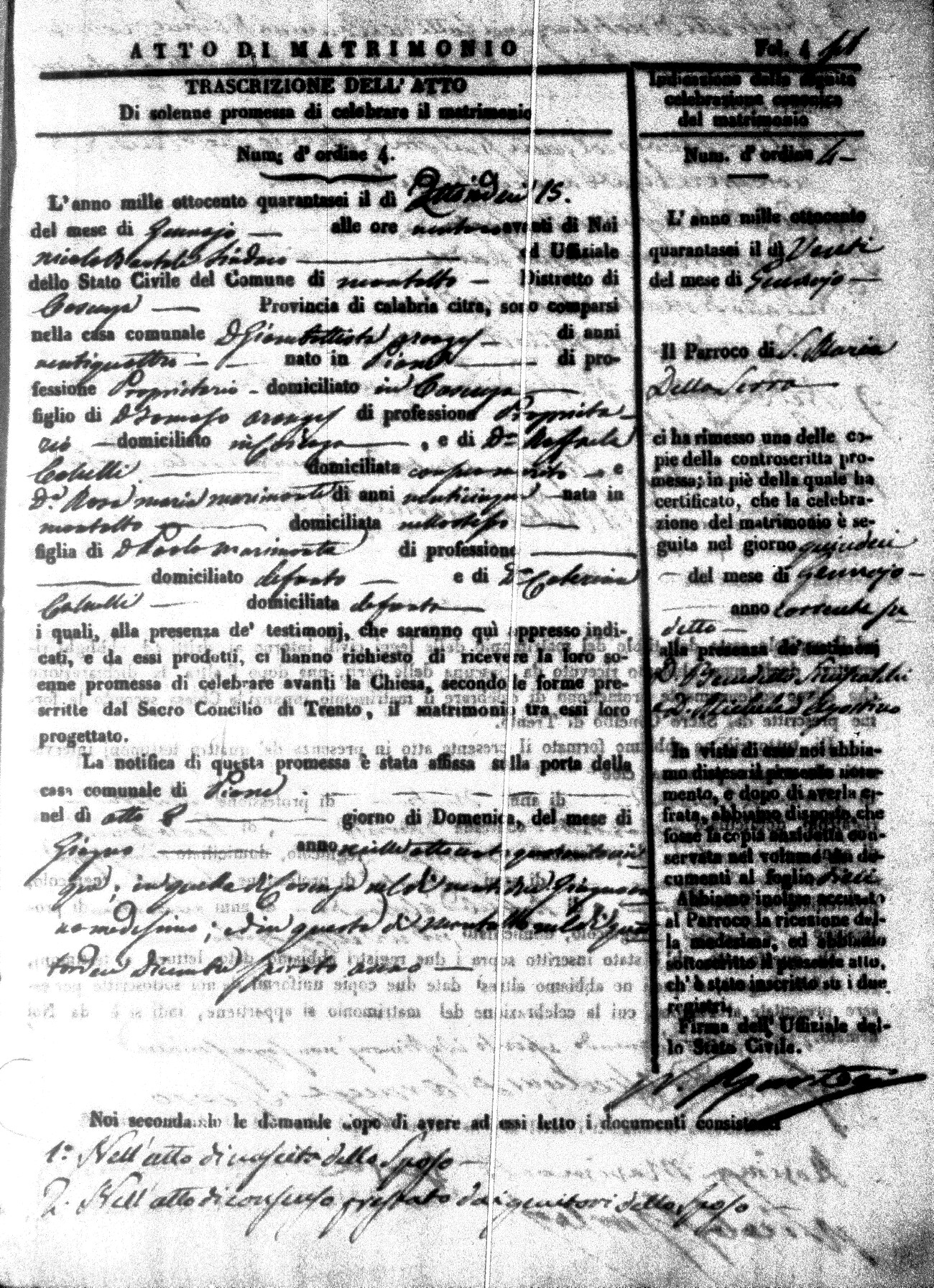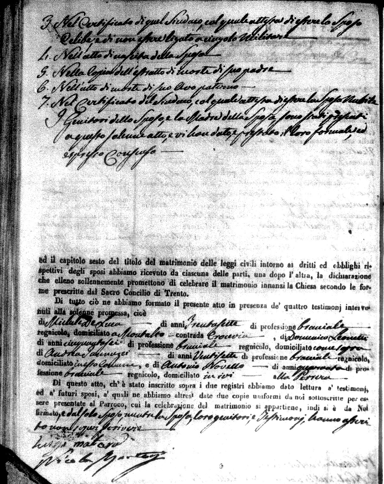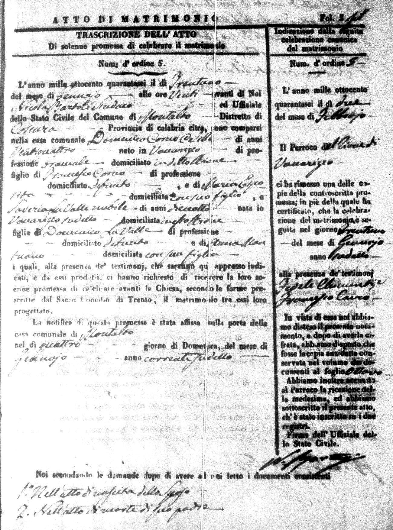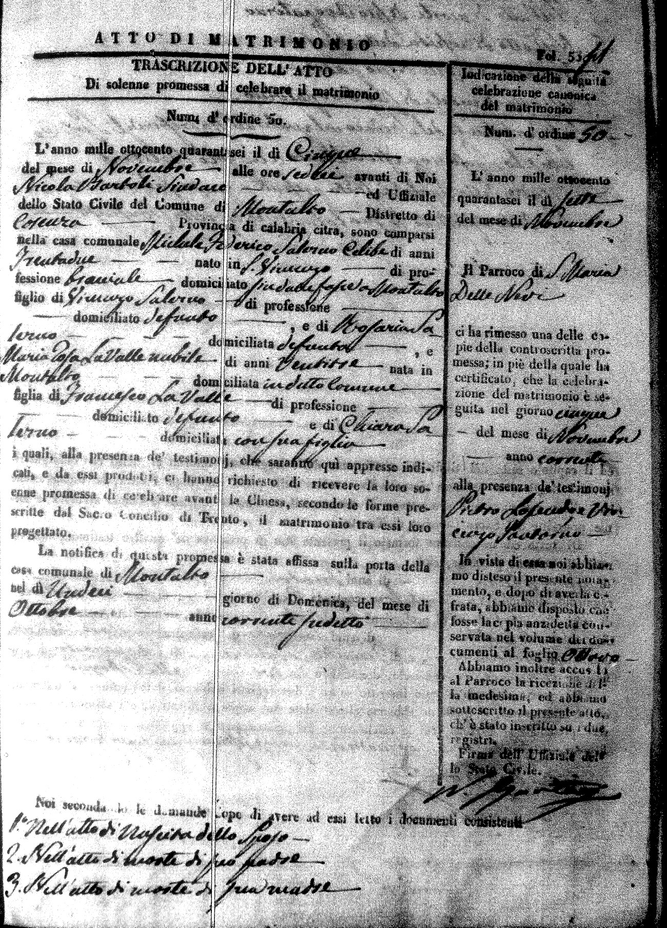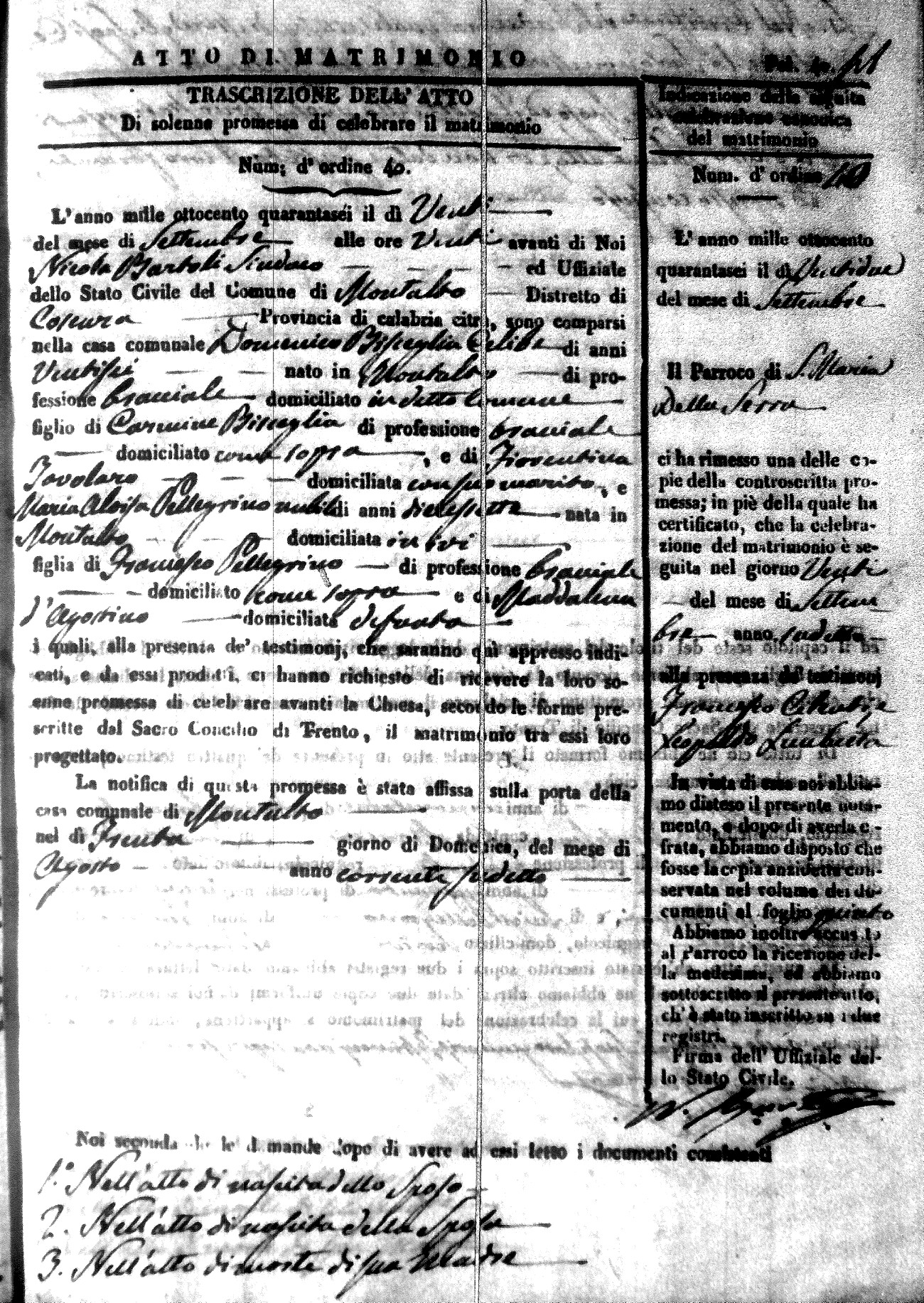 Here are the extractions for the marriage acts in 1846 for Montalto Uffugo. To save time we have only transcribed the names of the groom and bride. For more information, click on the groom's surname to view a copy of the original document.