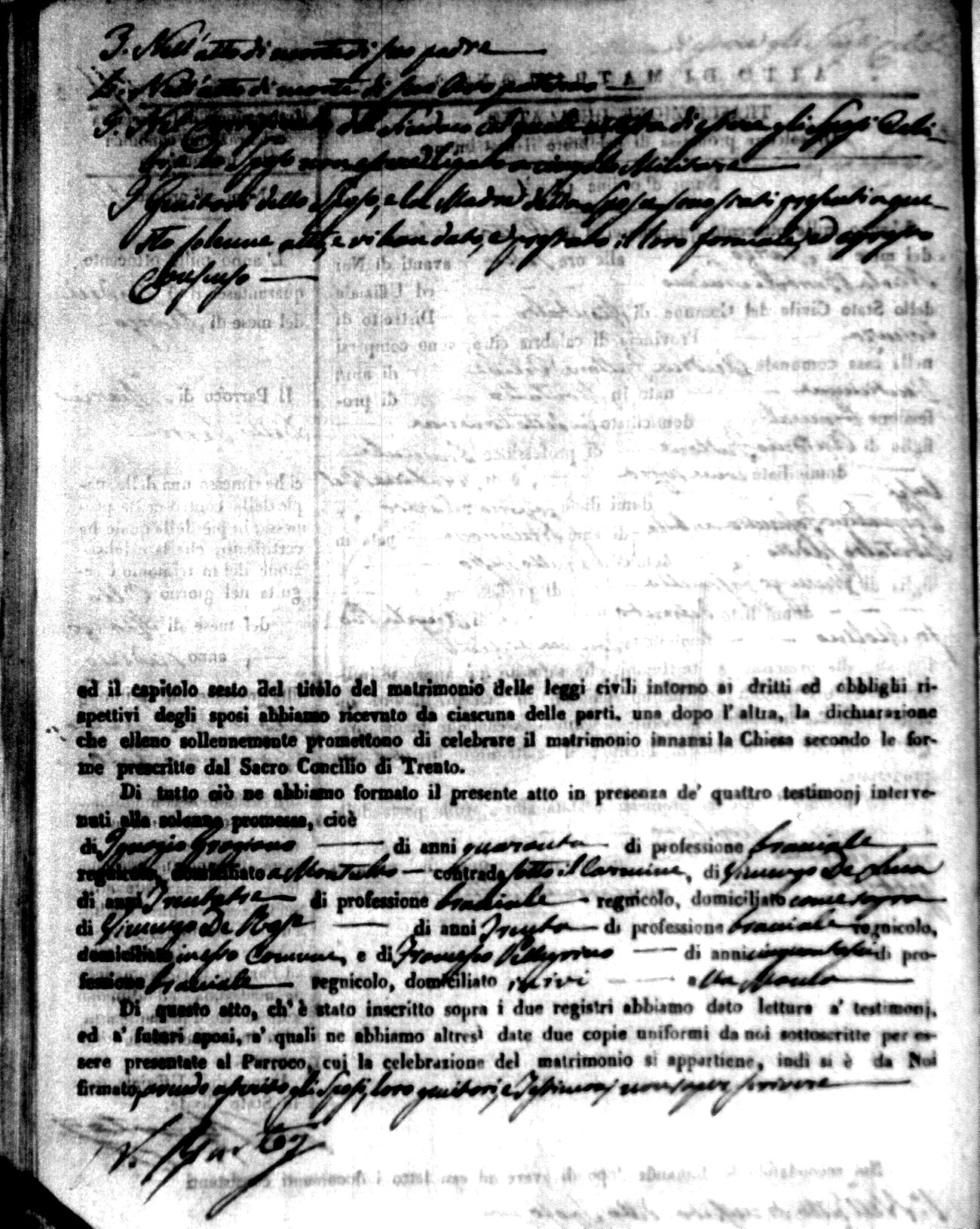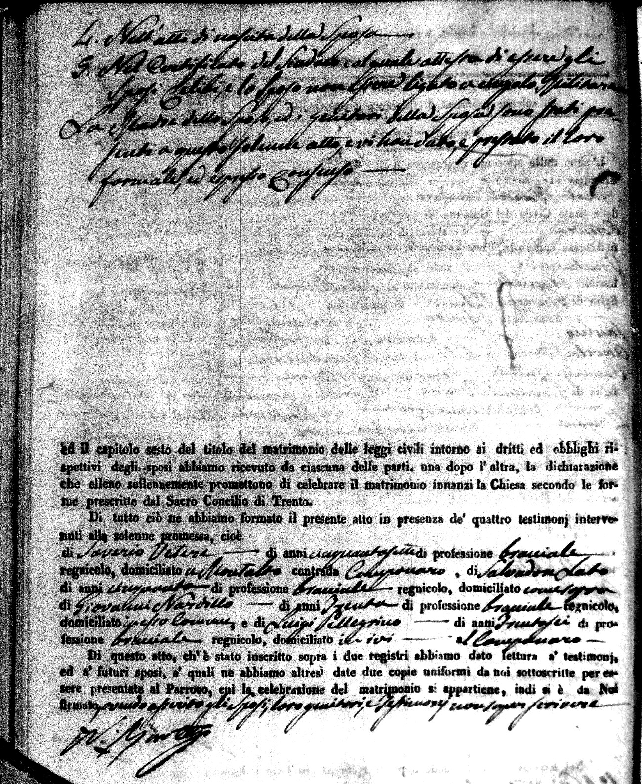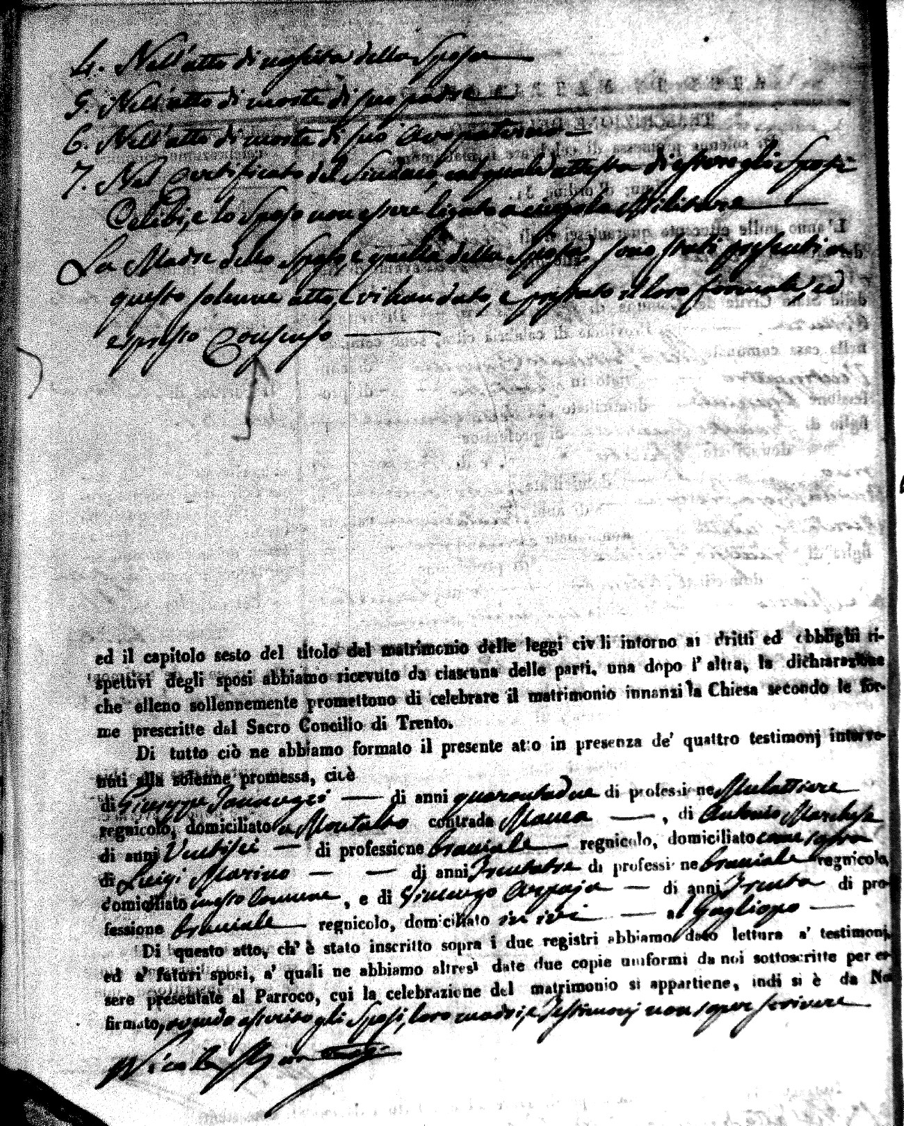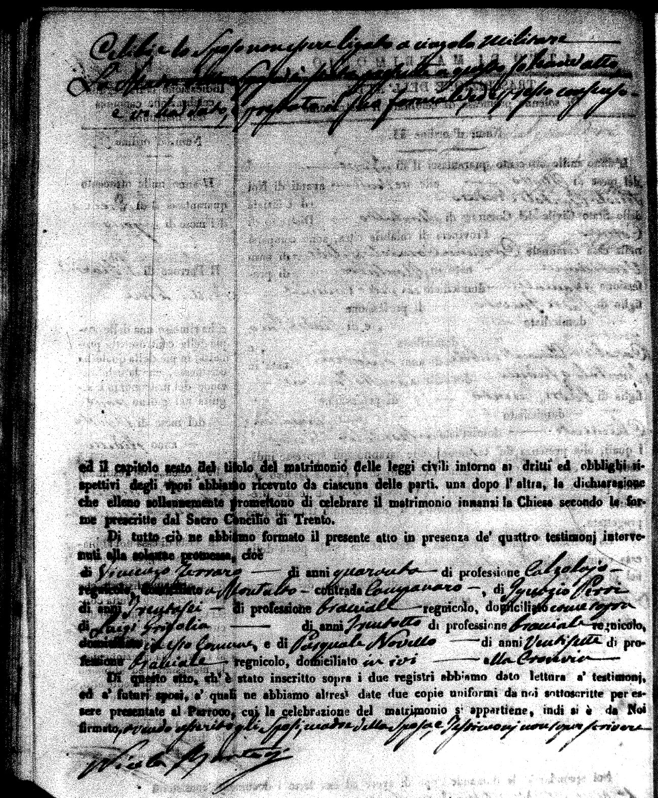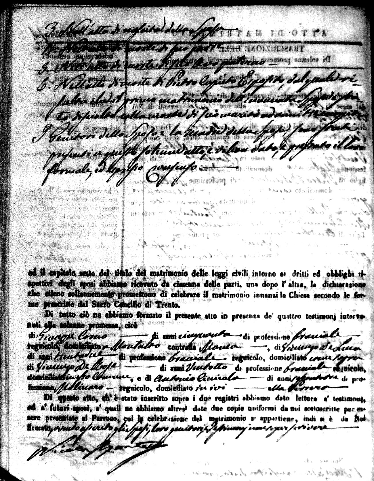 Here are the extractions for the marriage acts in 1846 for Montalto Uffugo. To save time we have only transcribed the names of the groom and bride. For more information, click on the groom's surname to view a copy of the original document.