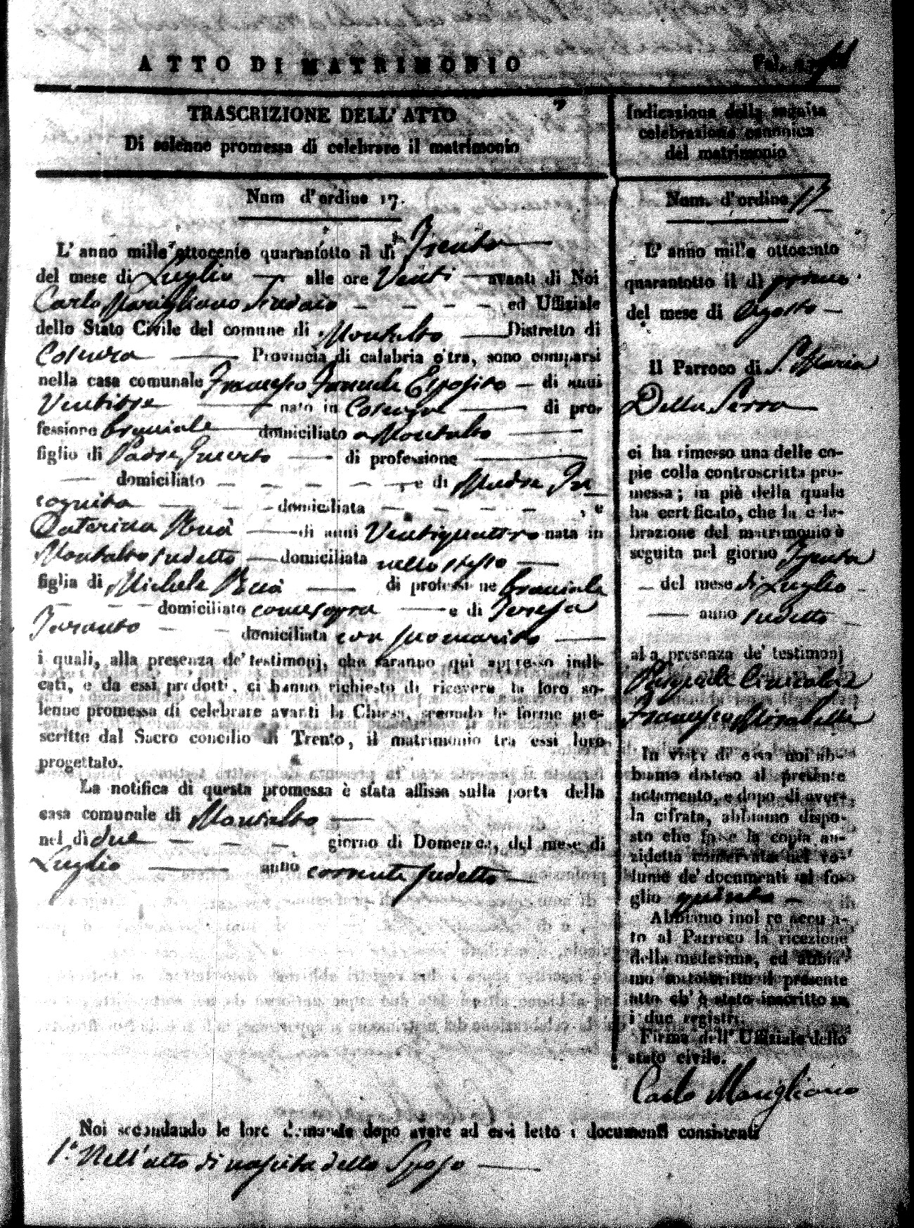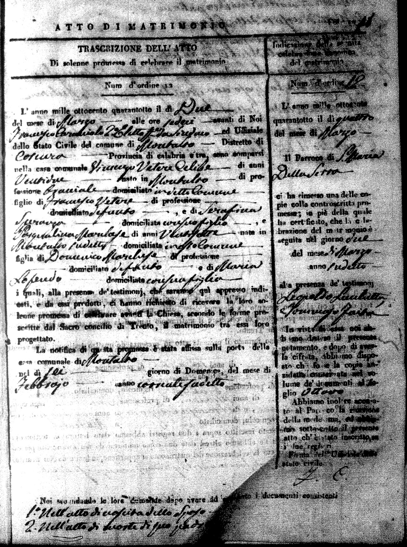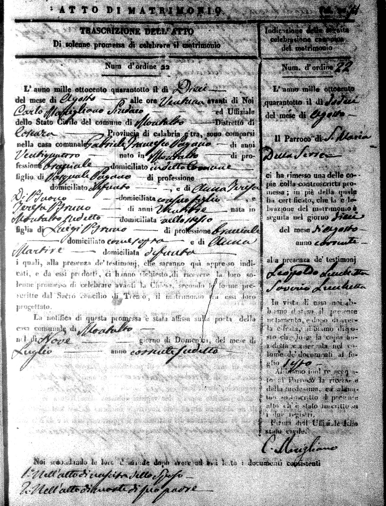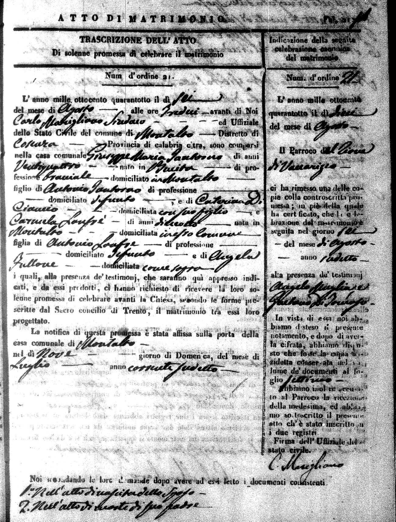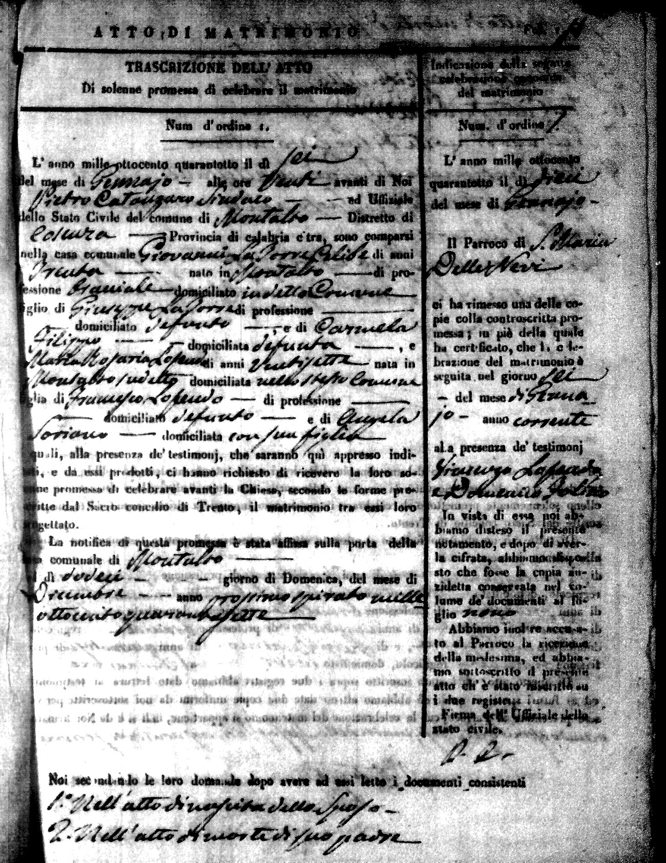 Here are the extractions for the marriage acts in 1848 for Montalto Uffugo. To save time we have only transcribed the names of the groom and bride. For more information, click on the groom's surname to view page 1 of the copy of the original document and his first name to view page 2.