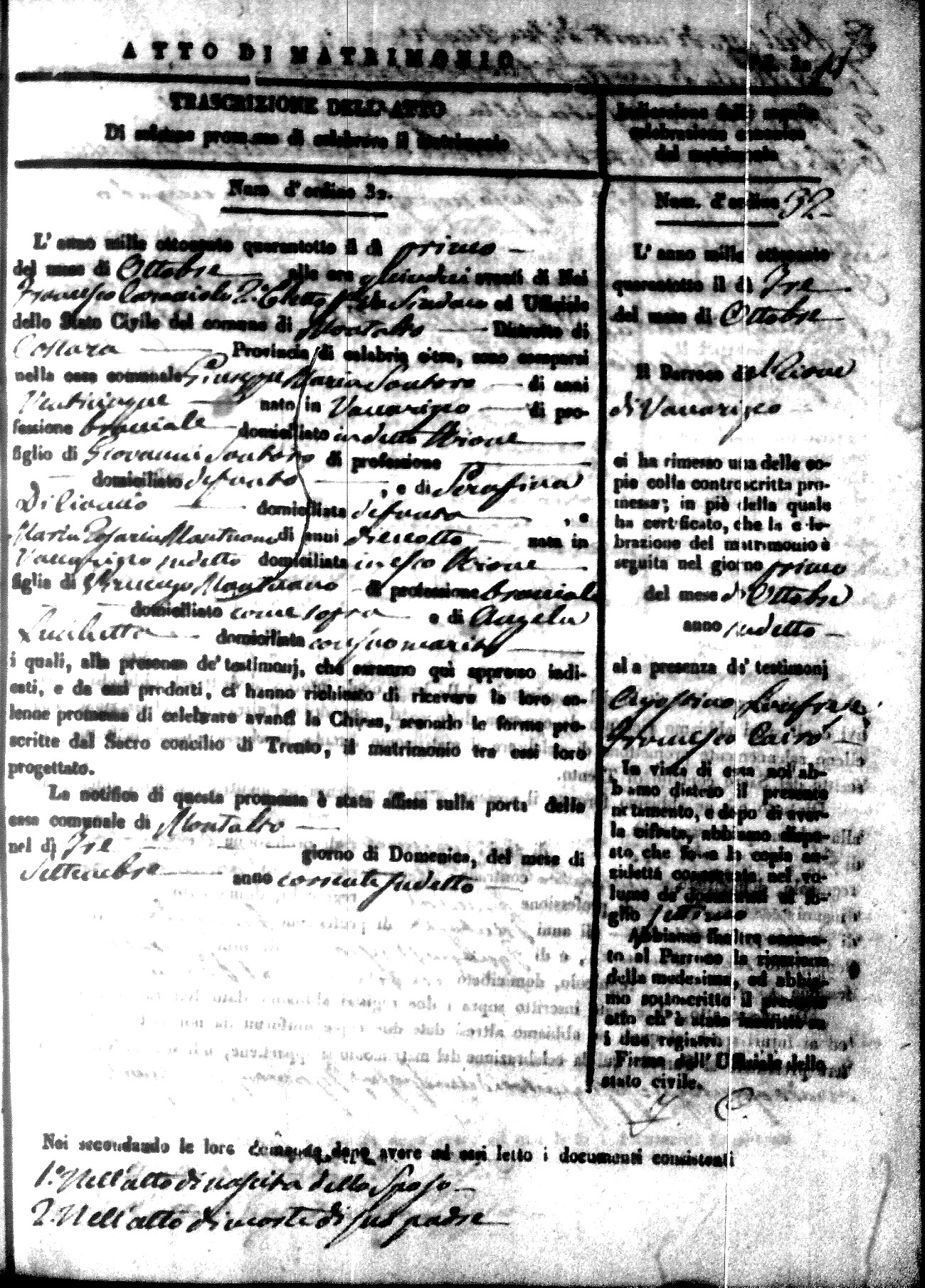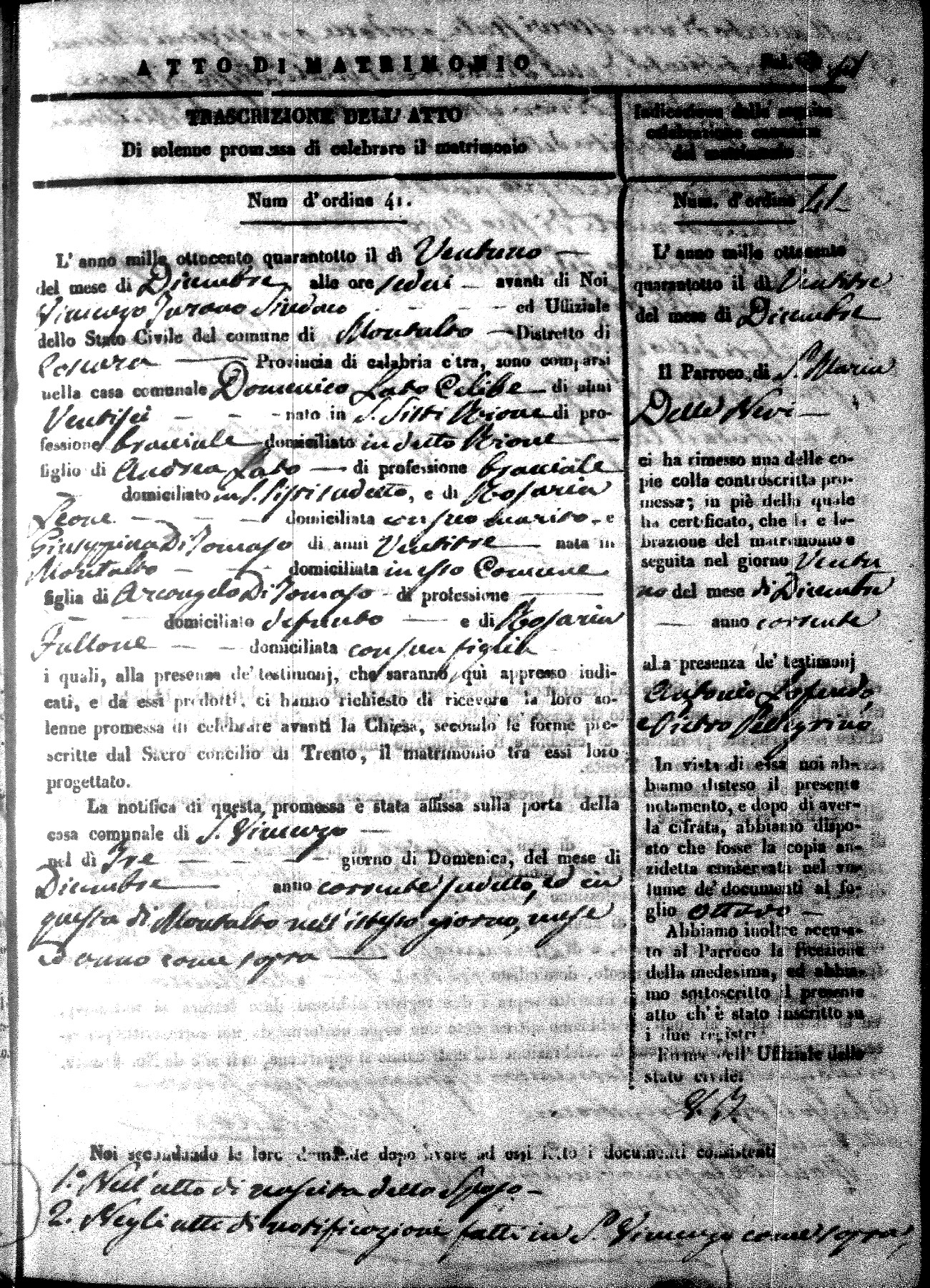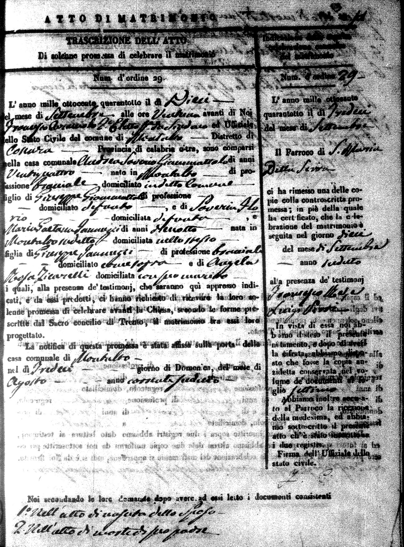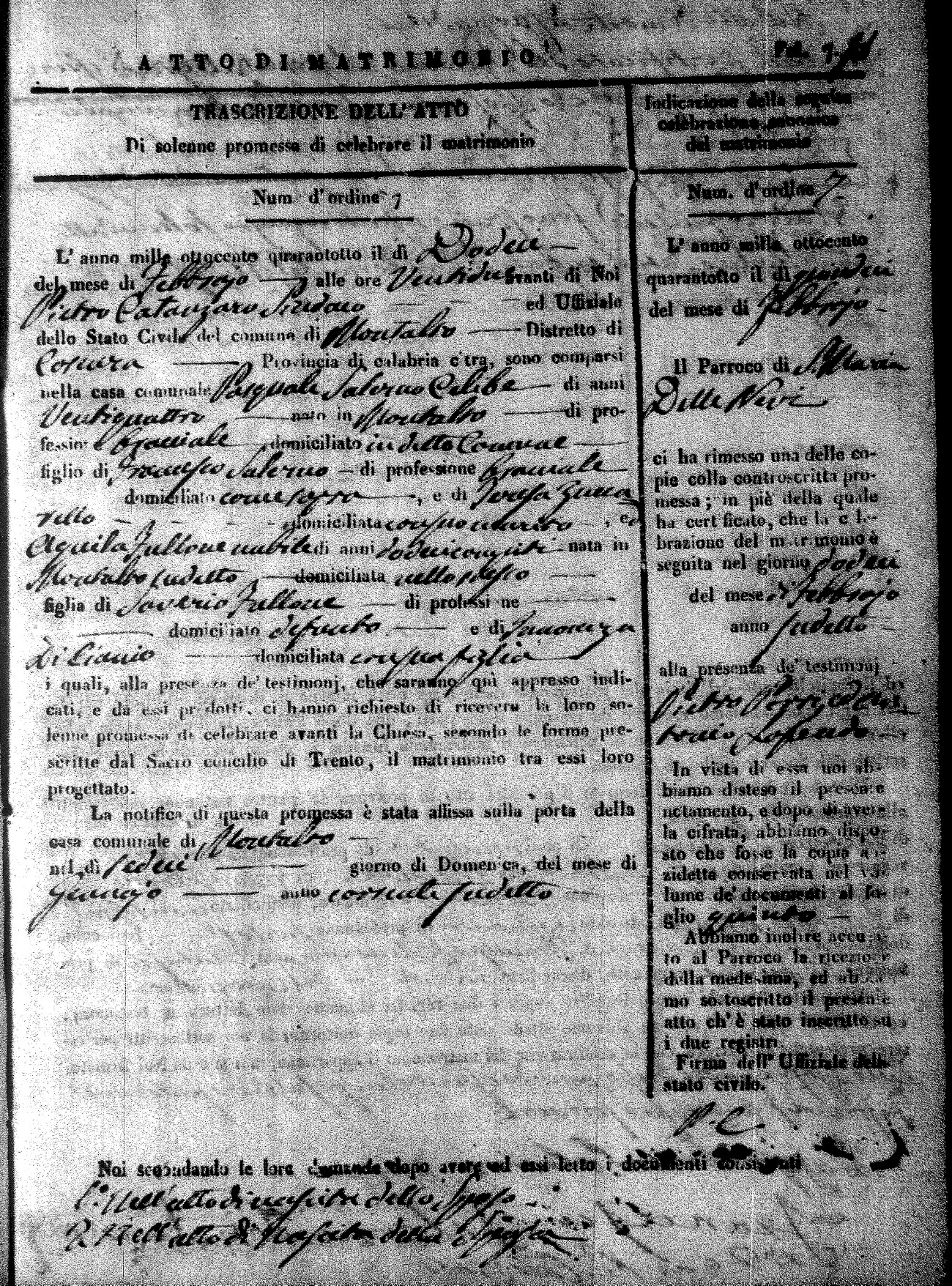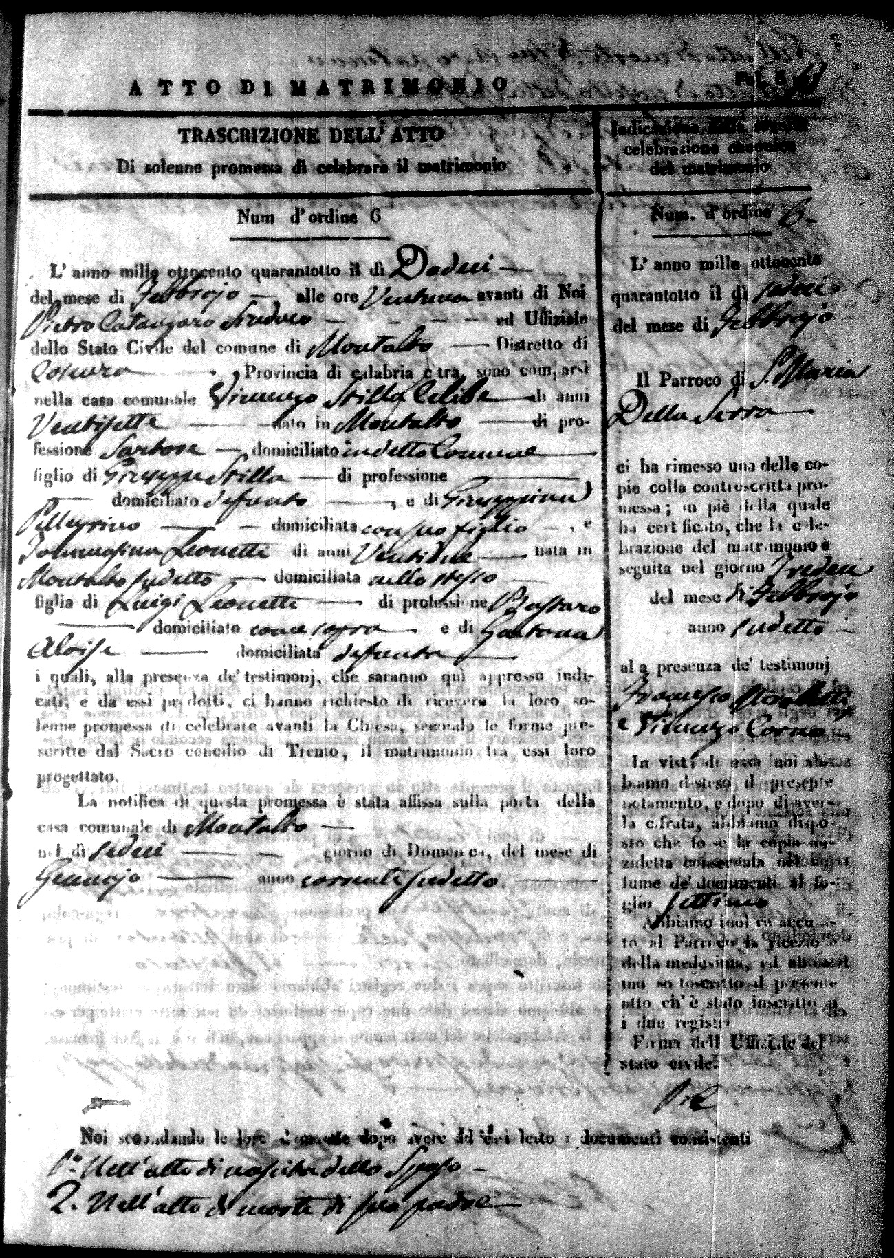 Here are the extractions for the marriage acts in 1848 for Montalto Uffugo. To save time we have only transcribed the names of the groom and bride. For more information, click on the groom's surname to view page 1 of the copy of the original document and his first name to view page 2.