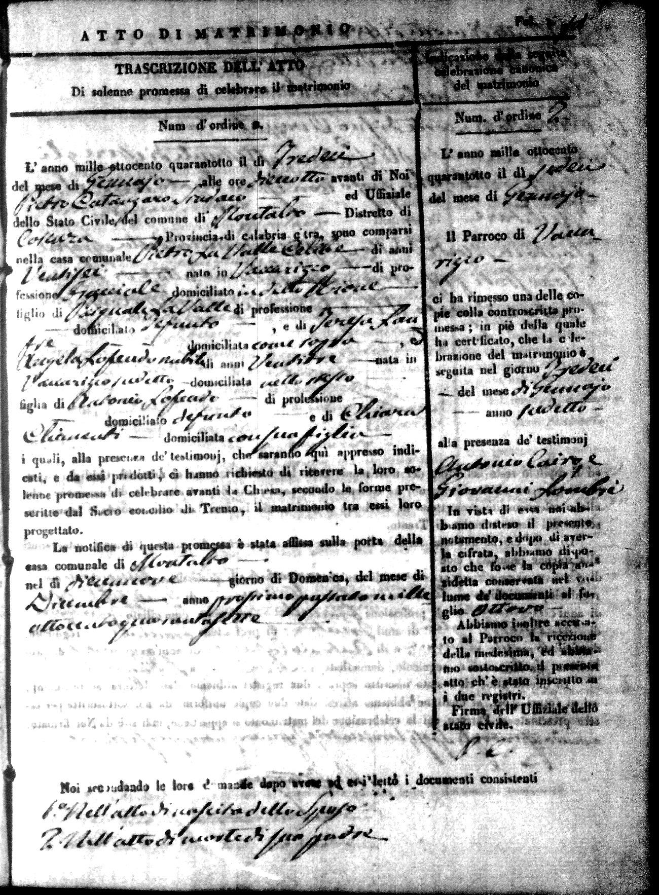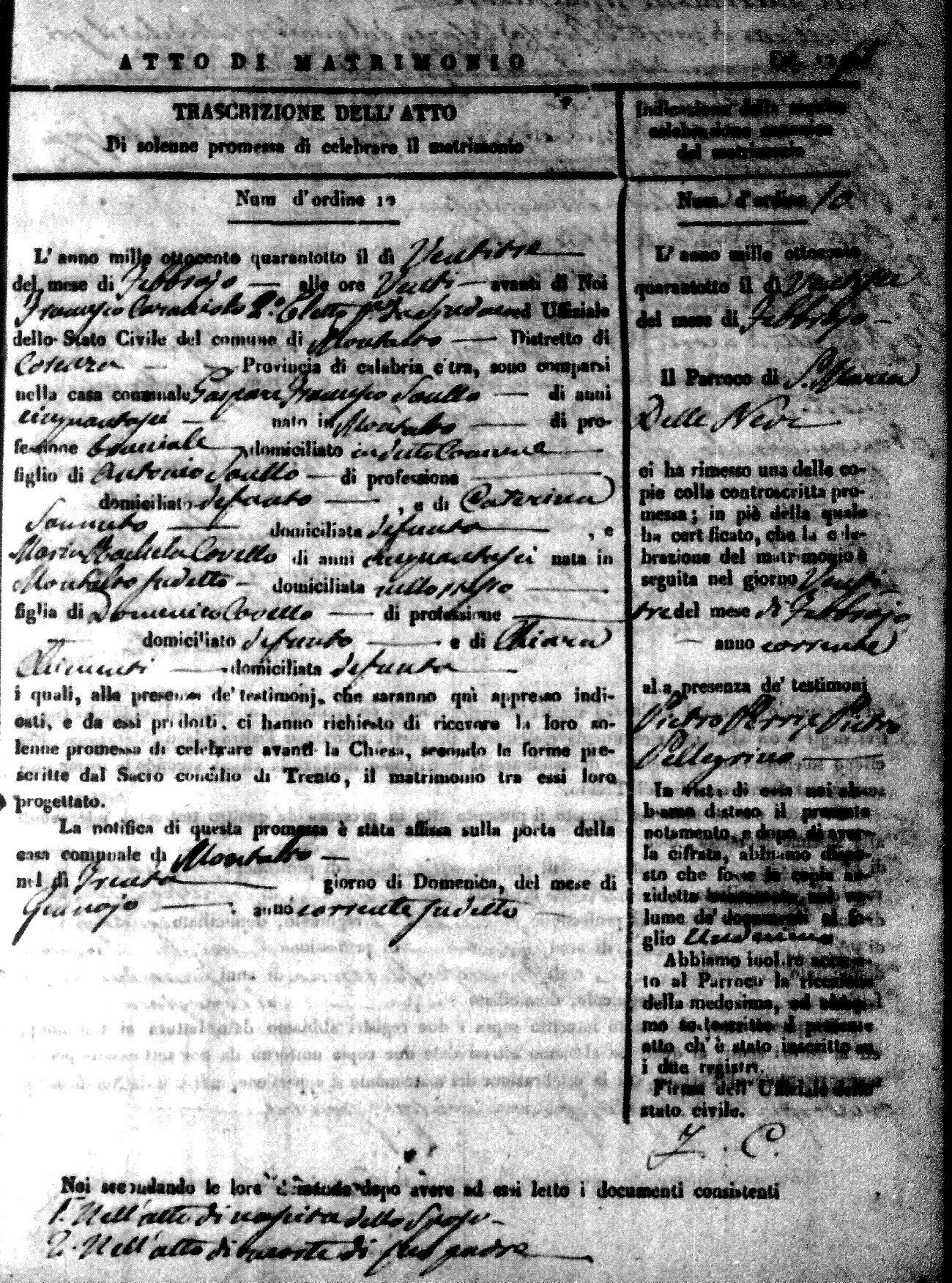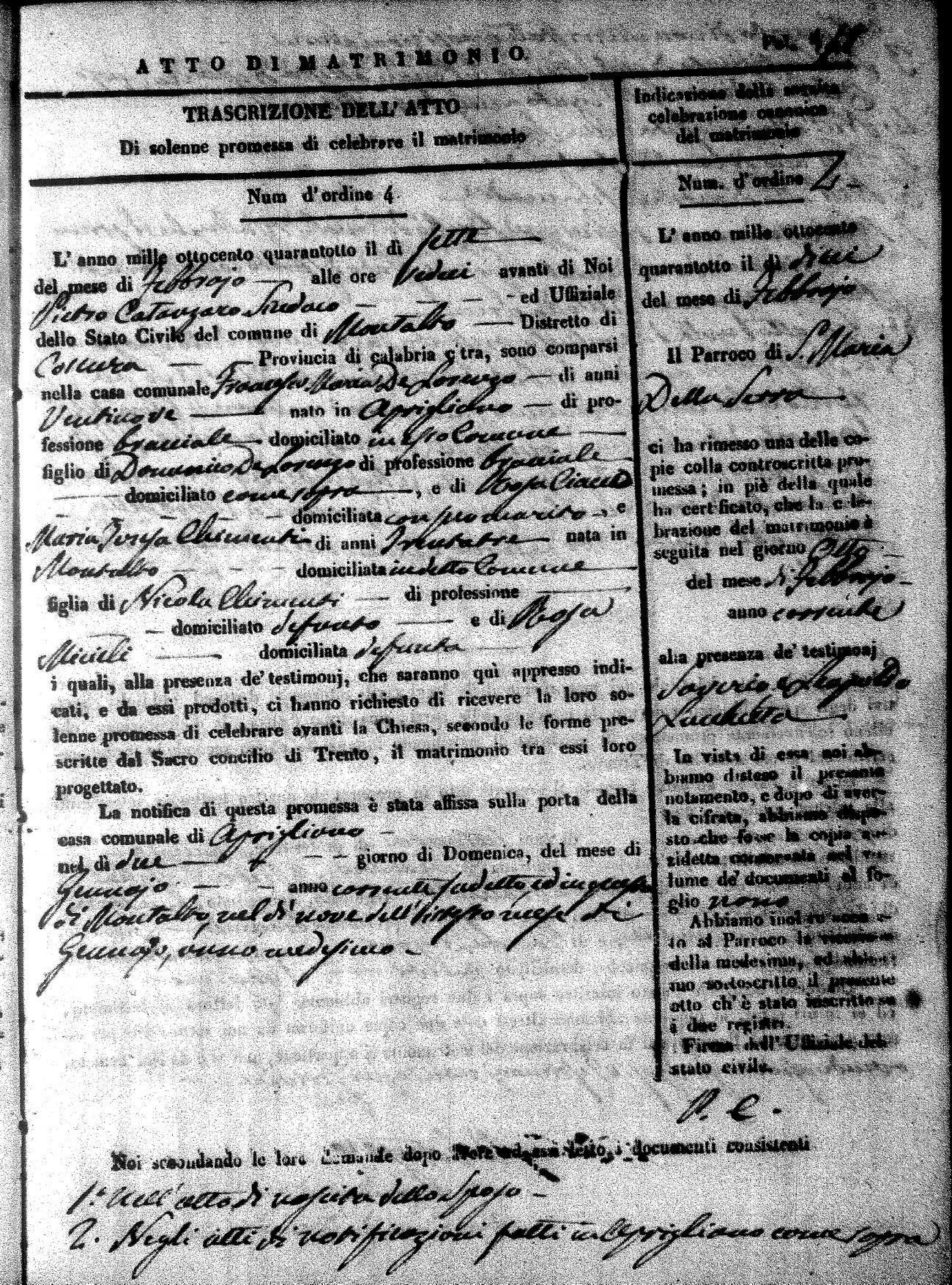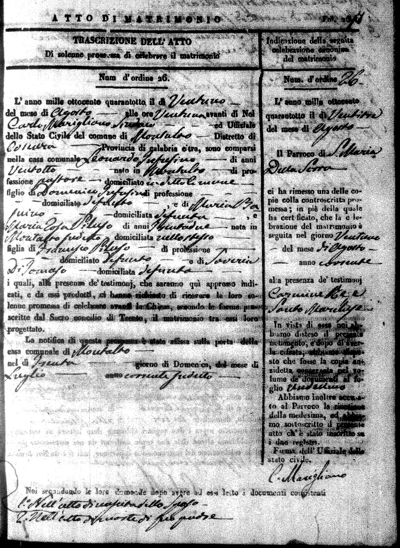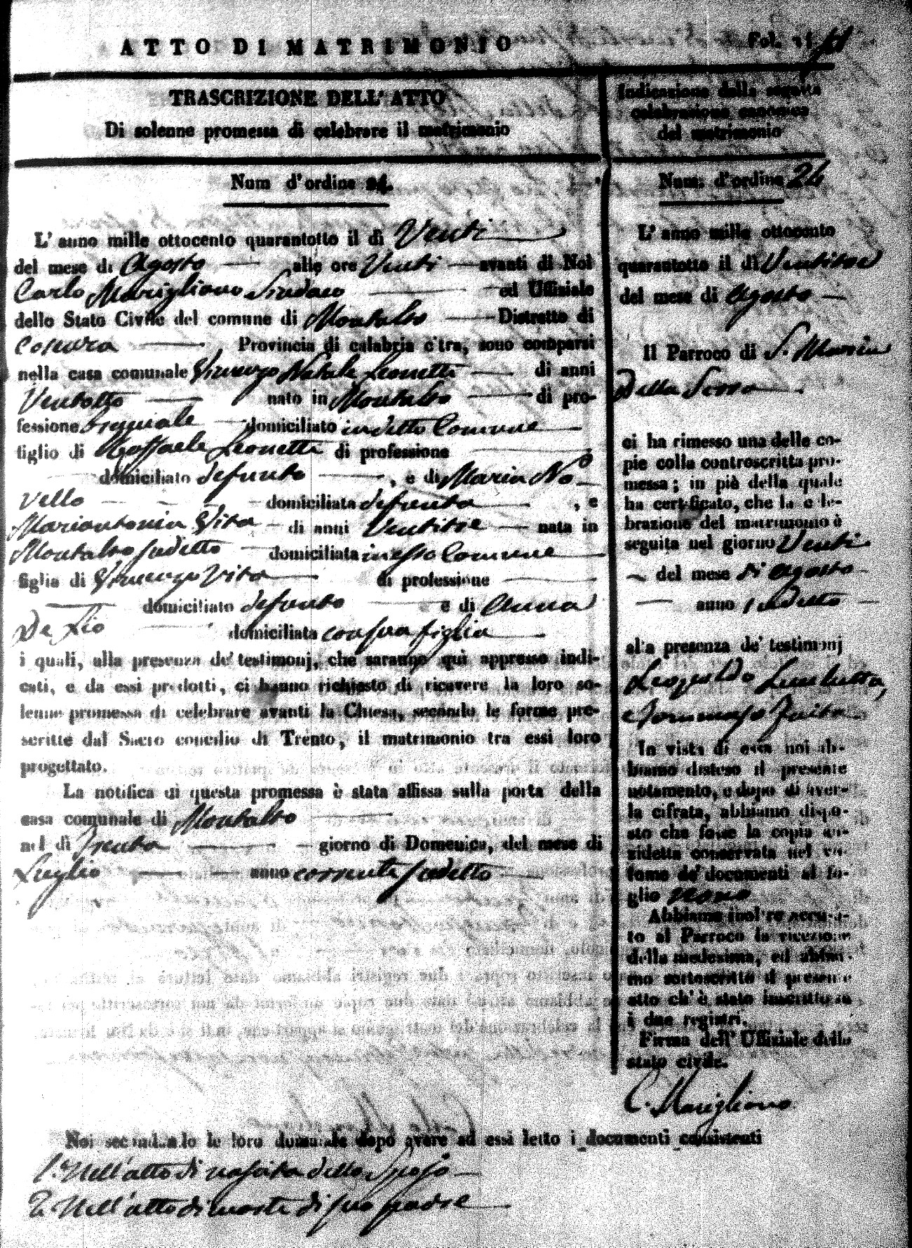 Here are the extractions for the marriage acts in 1848 for Montalto Uffugo. To save time we have only transcribed the names of the groom and bride. For more information, click on the groom's surname to view page 1 of the copy of the original document and his first name to view page 2.
