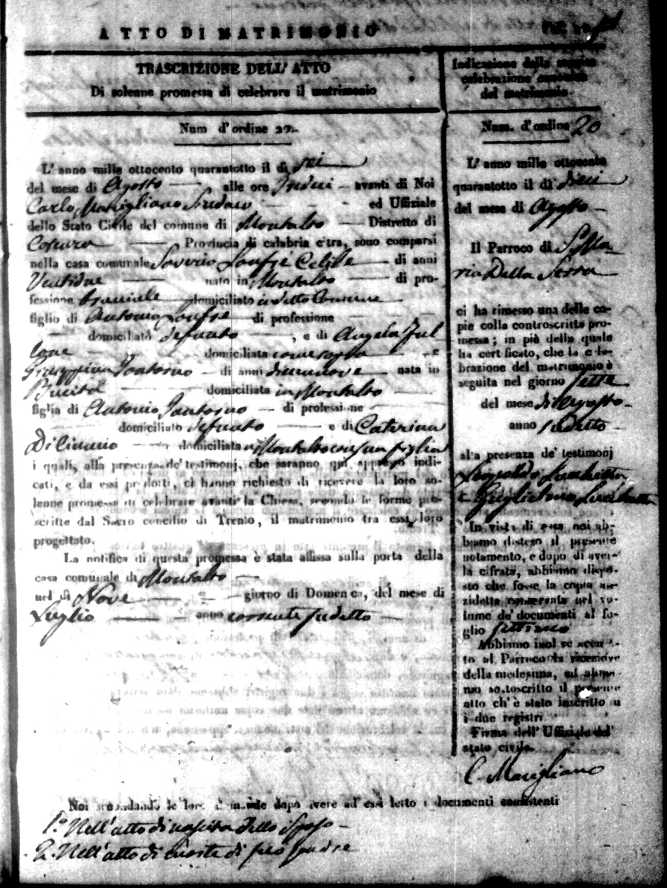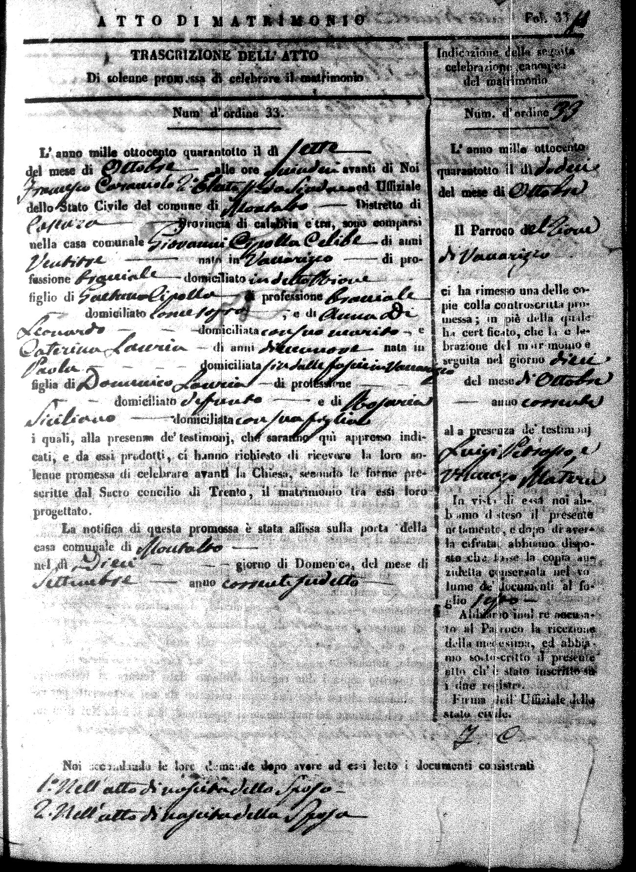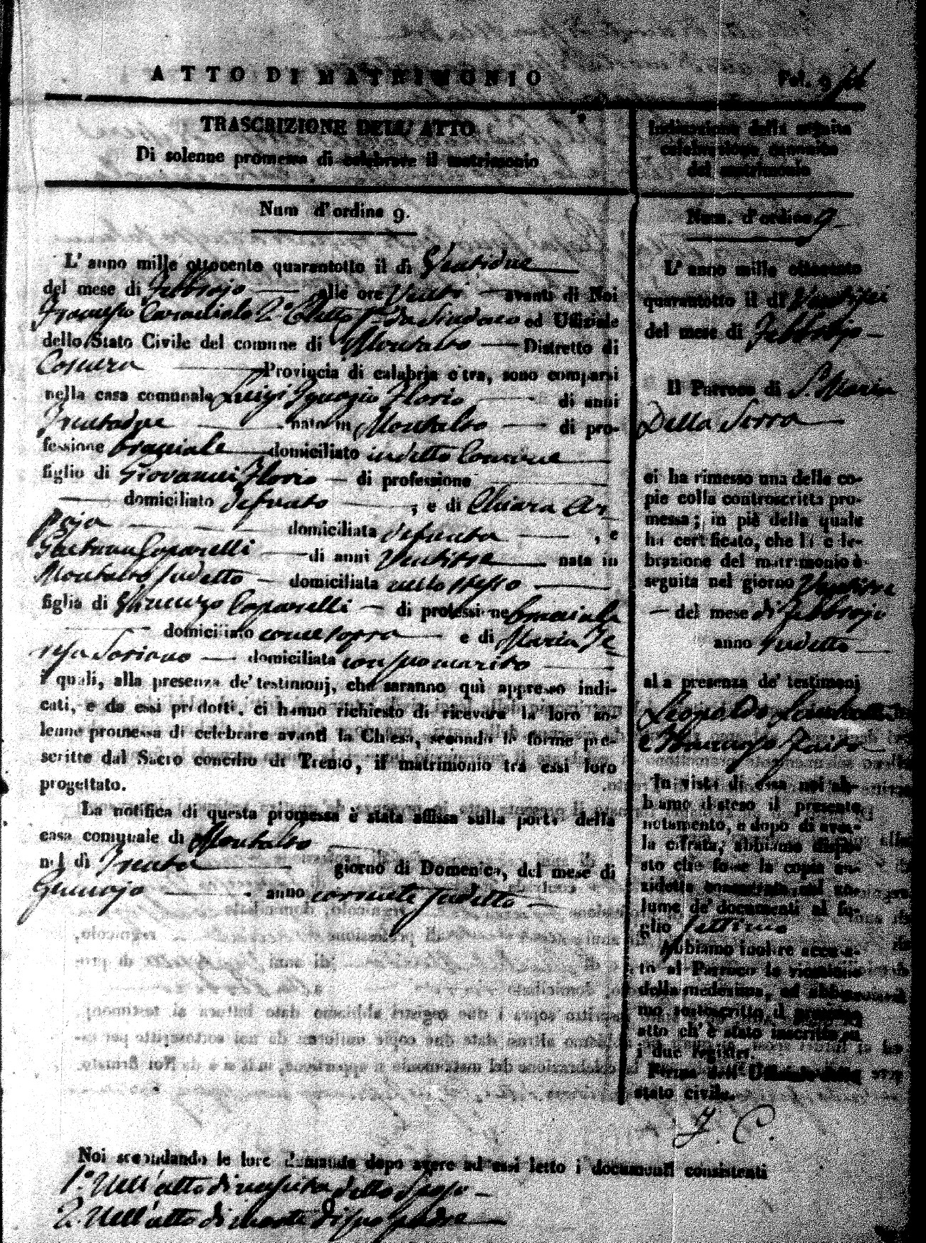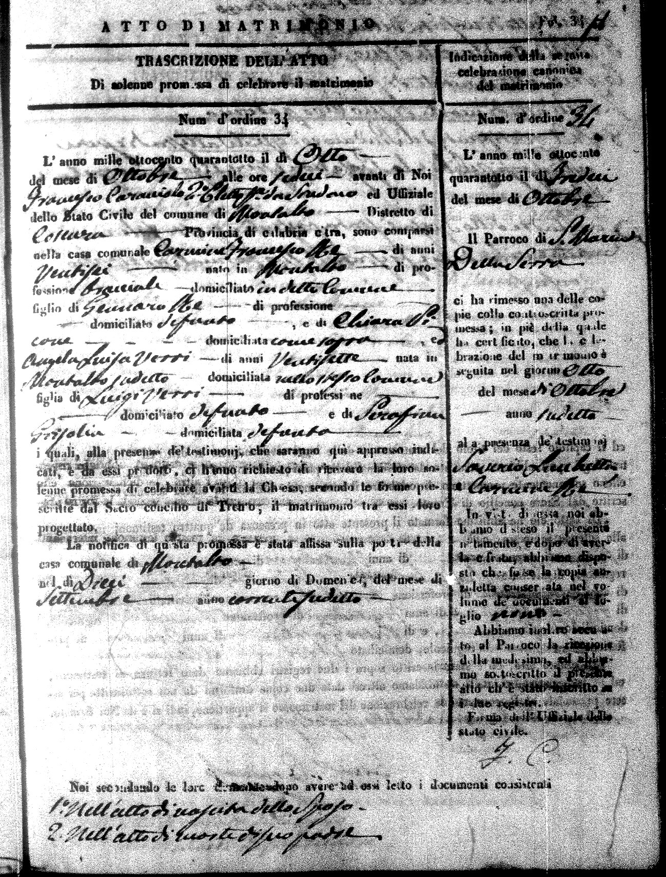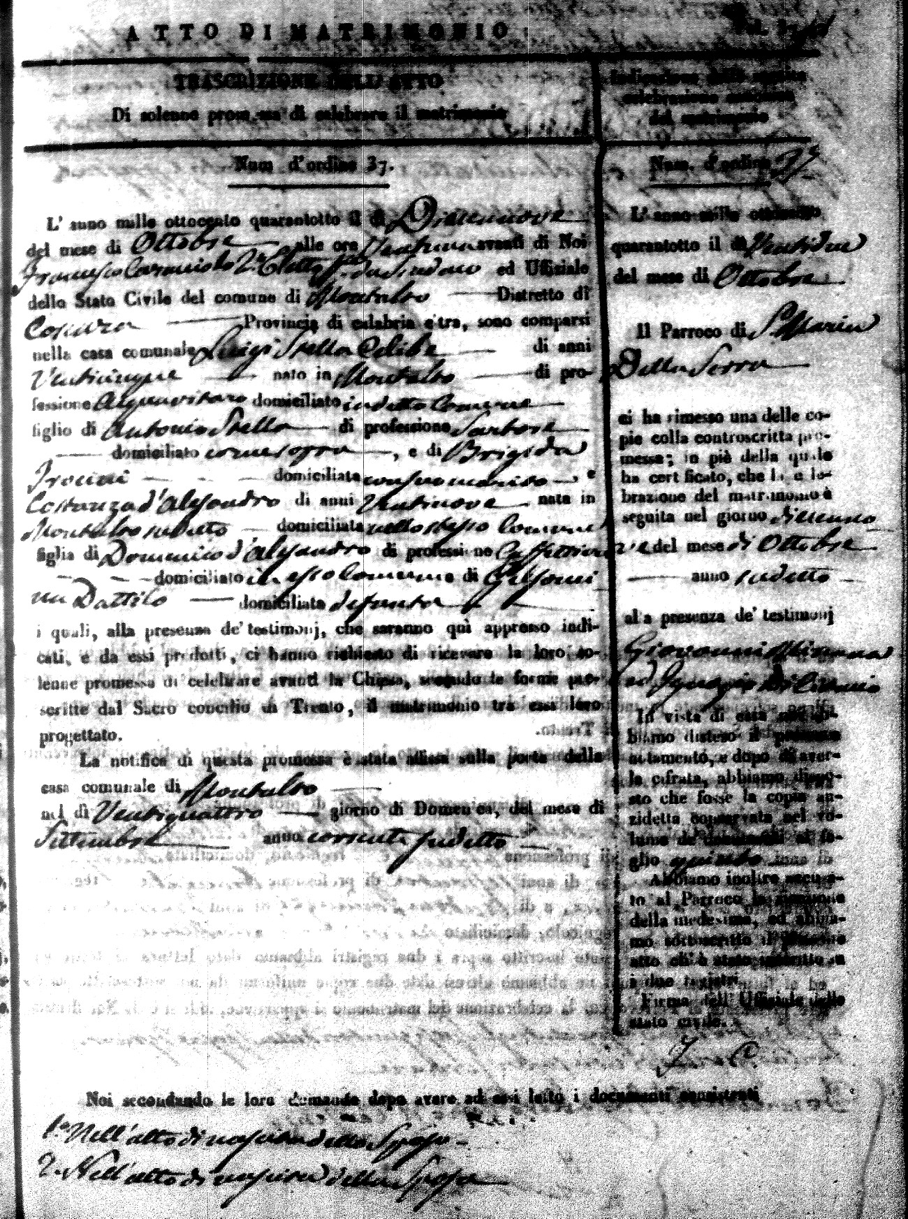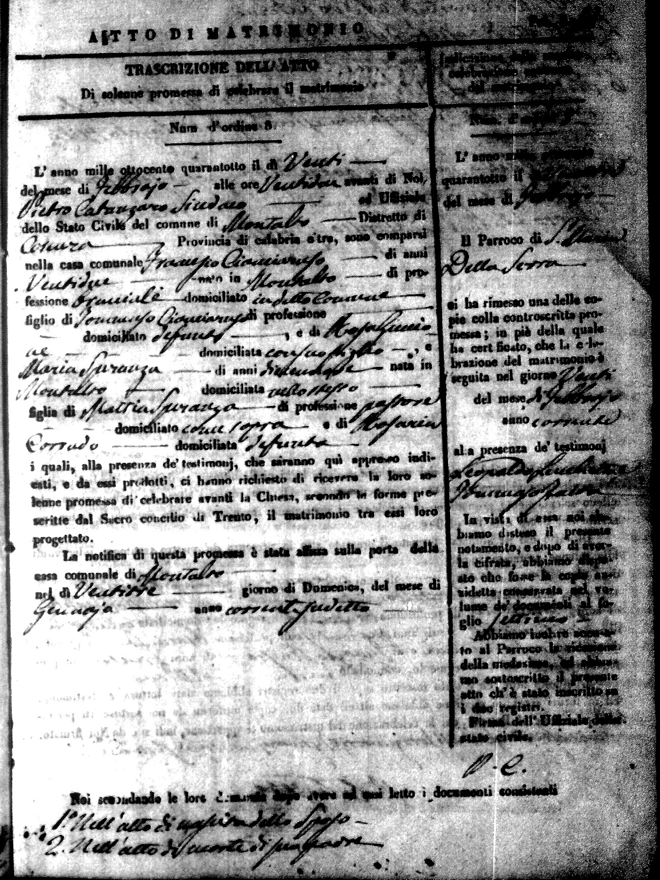 Here are the extractions for the marriage acts in 1848 for Montalto Uffugo. To save time we have only transcribed the names of the groom and bride. For more information, click on the groom's surname to view page 1 of the copy of the original document and his first name to view page 2.