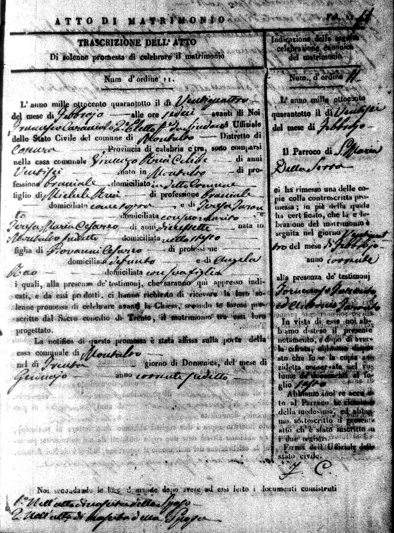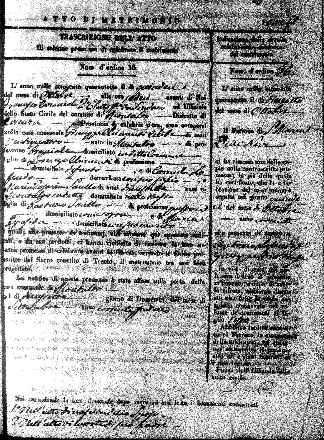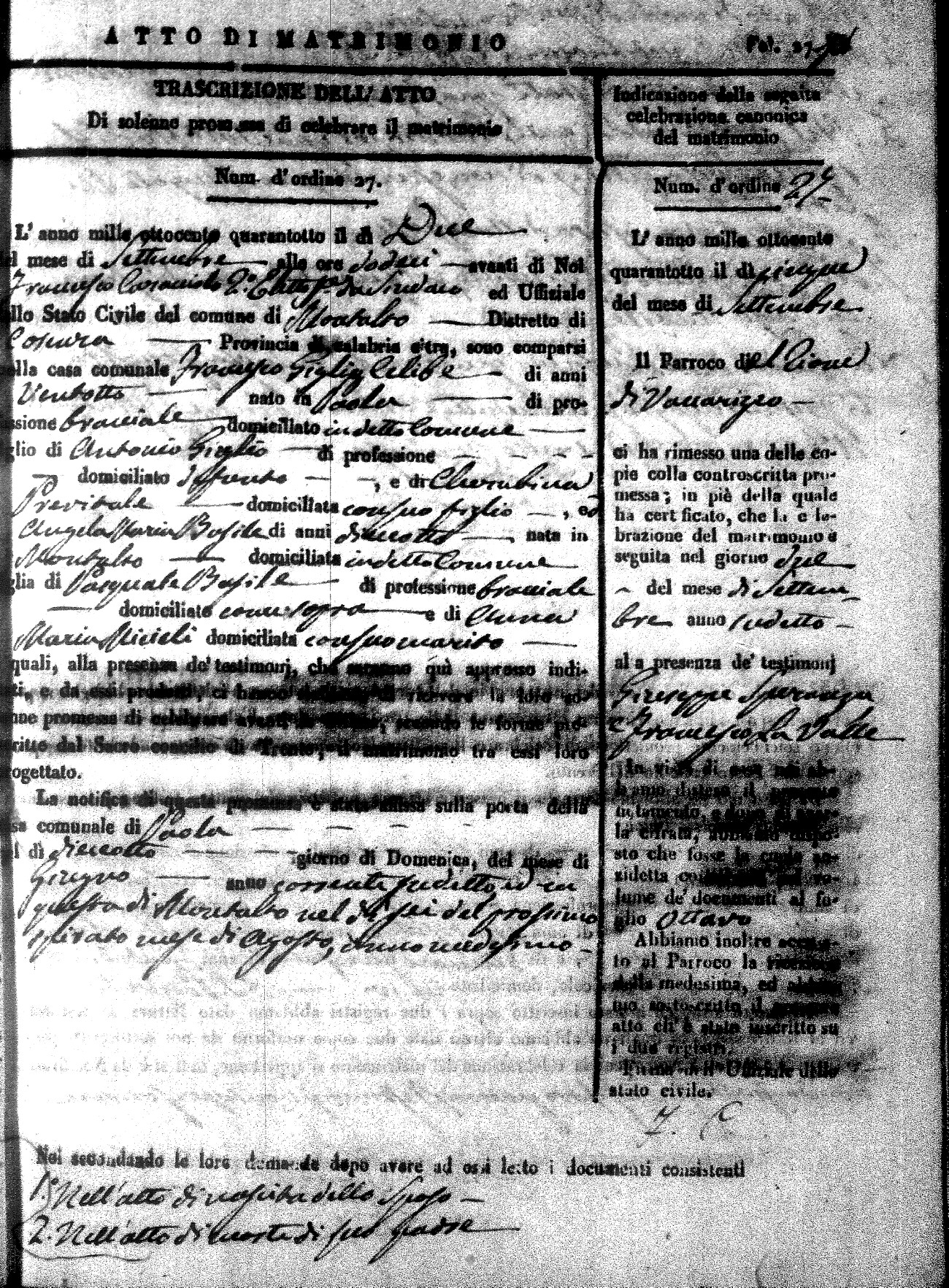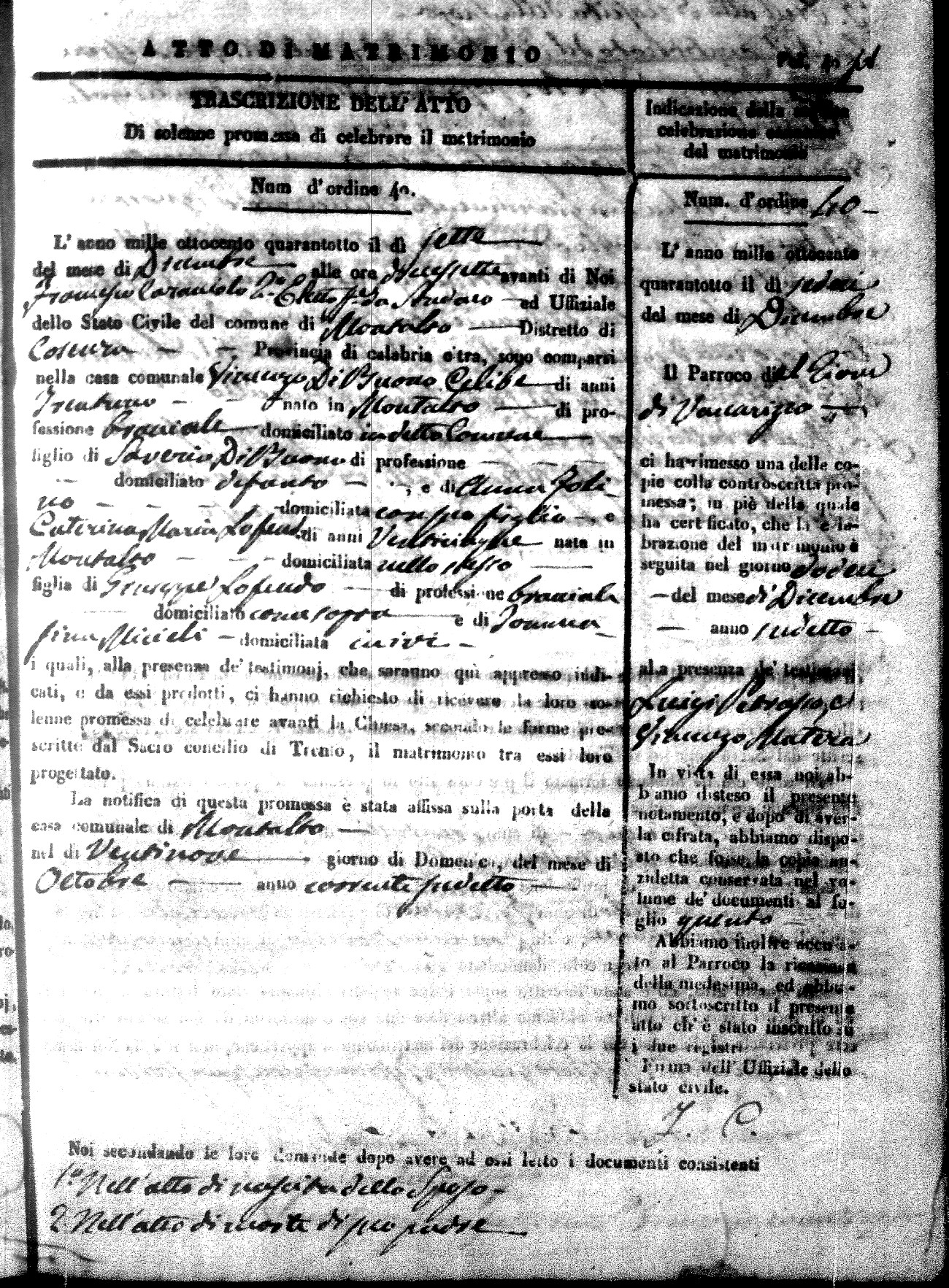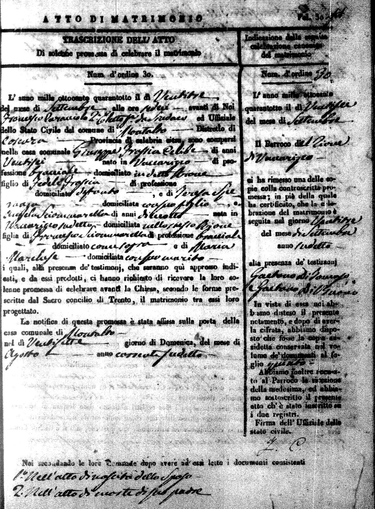 Here are the extractions for the marriage acts in 1848 for Montalto Uffugo. To save time we have only transcribed the names of the groom and bride. For more information, click on the groom's surname to view page 1 of the copy of the original document and his first name to view page 2.