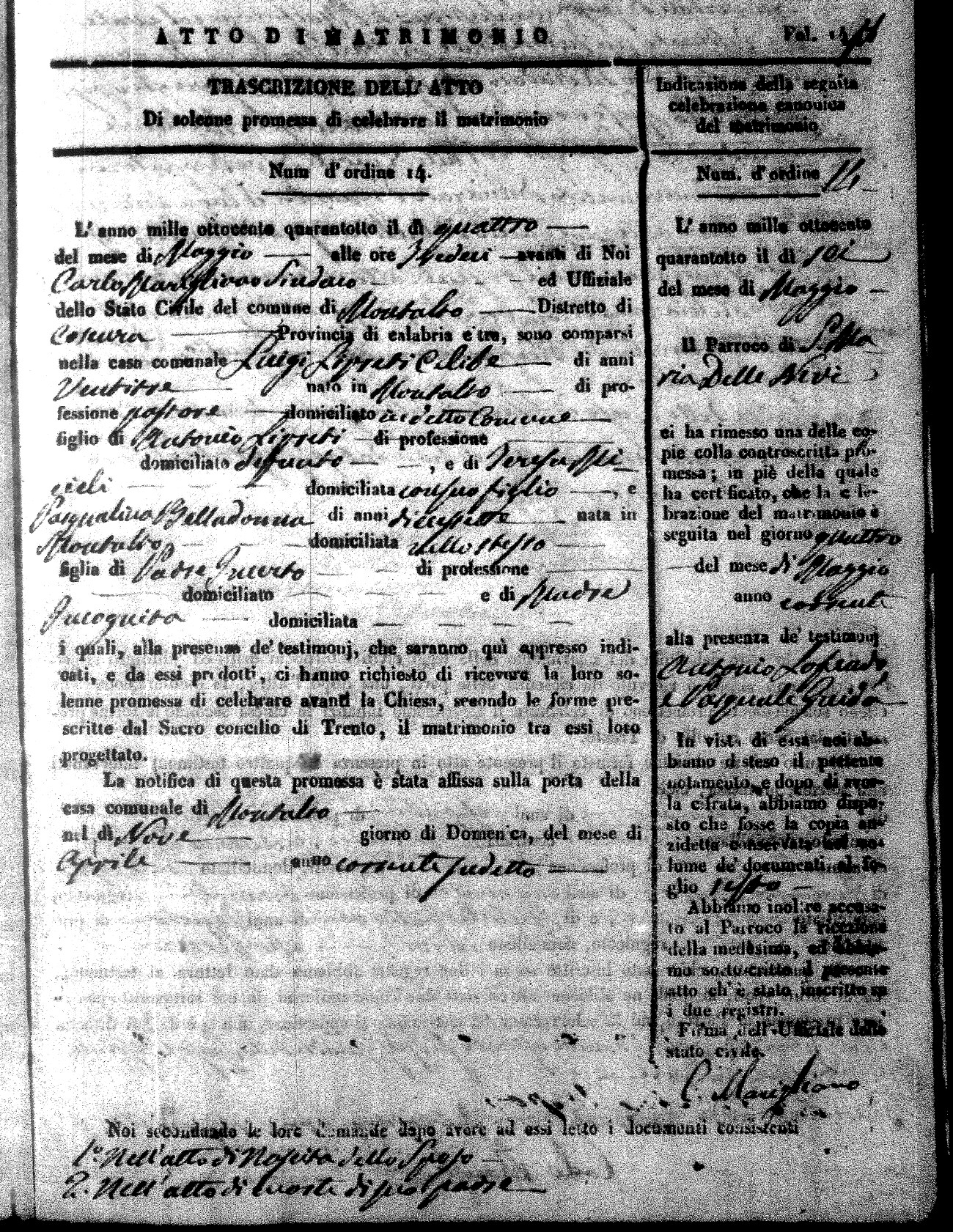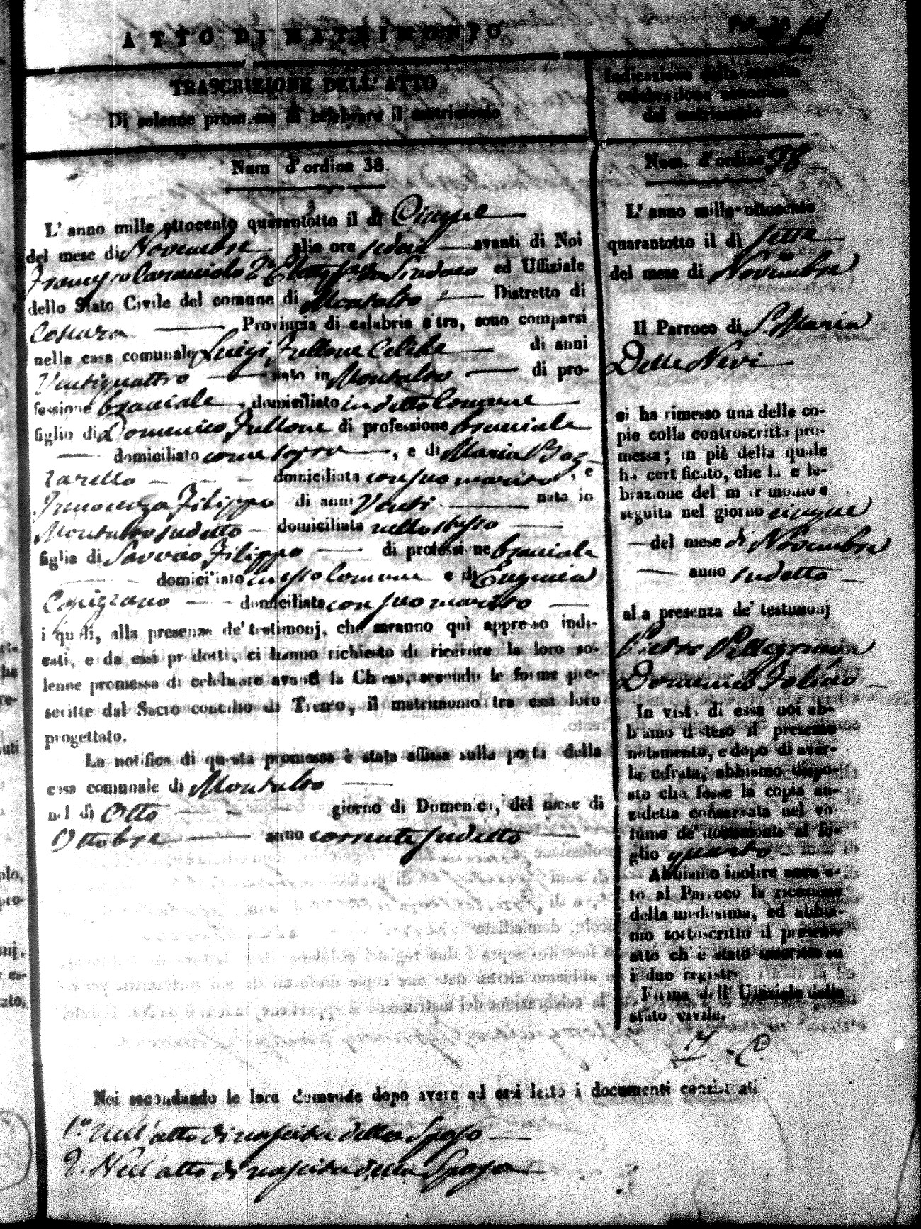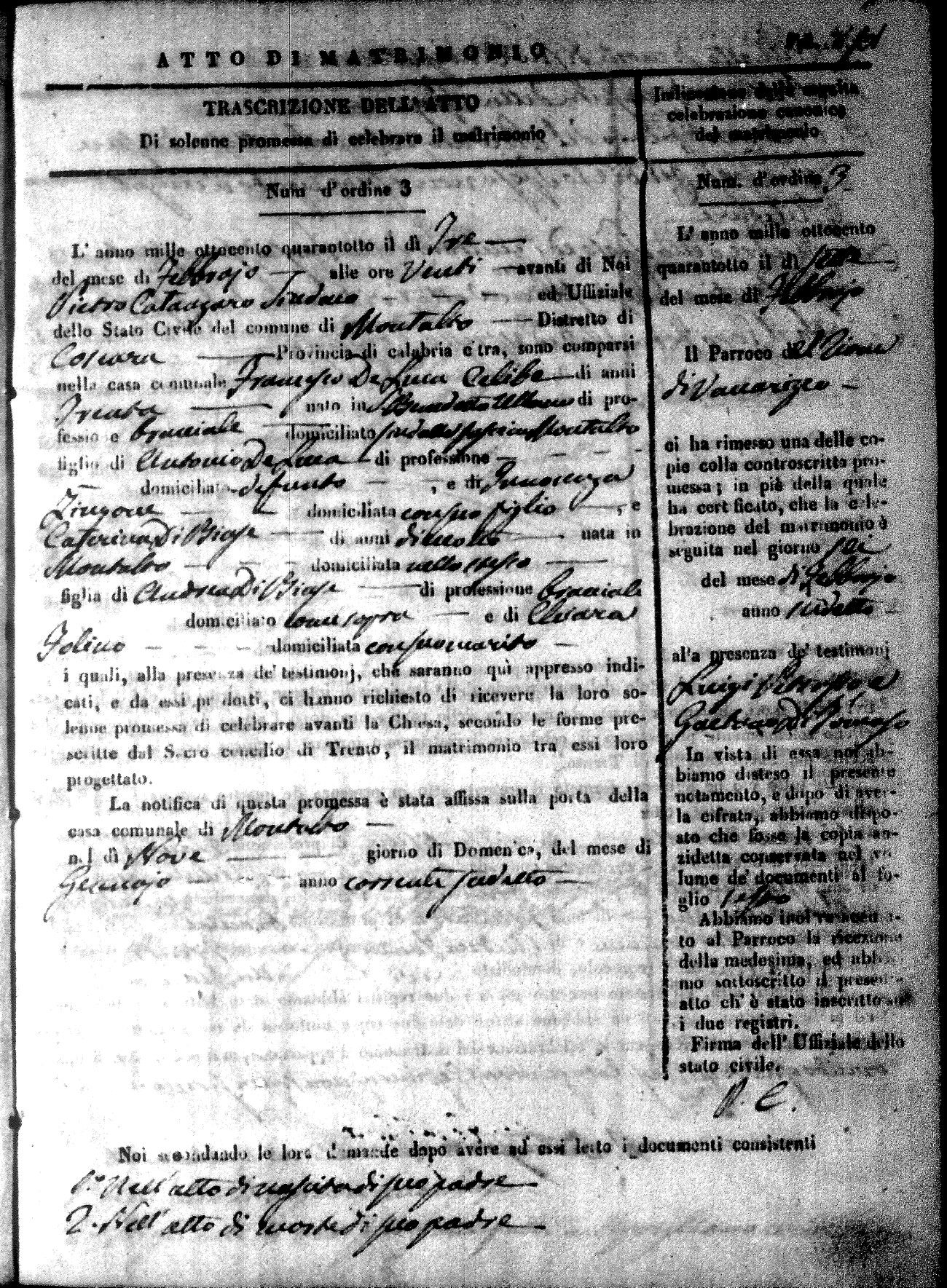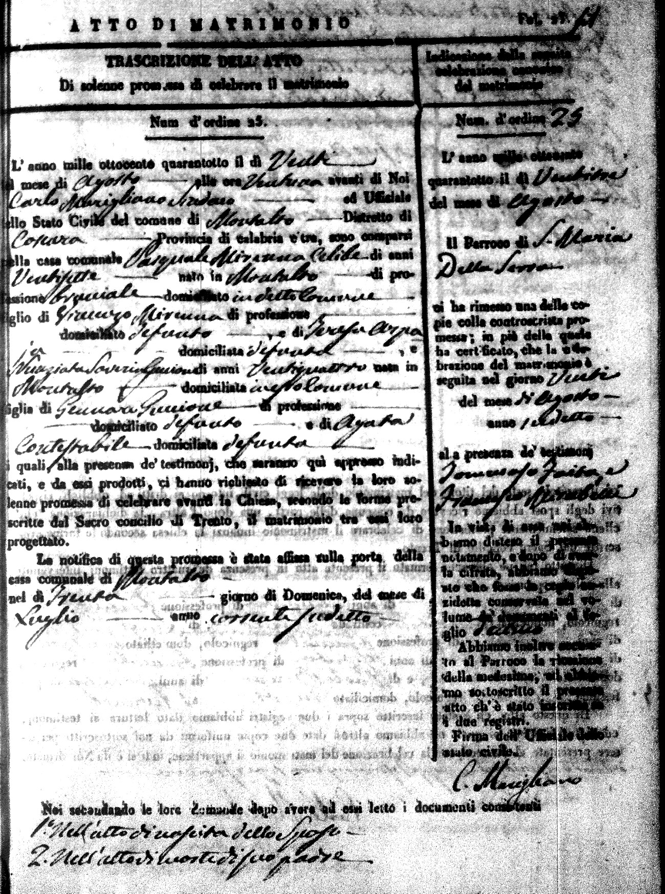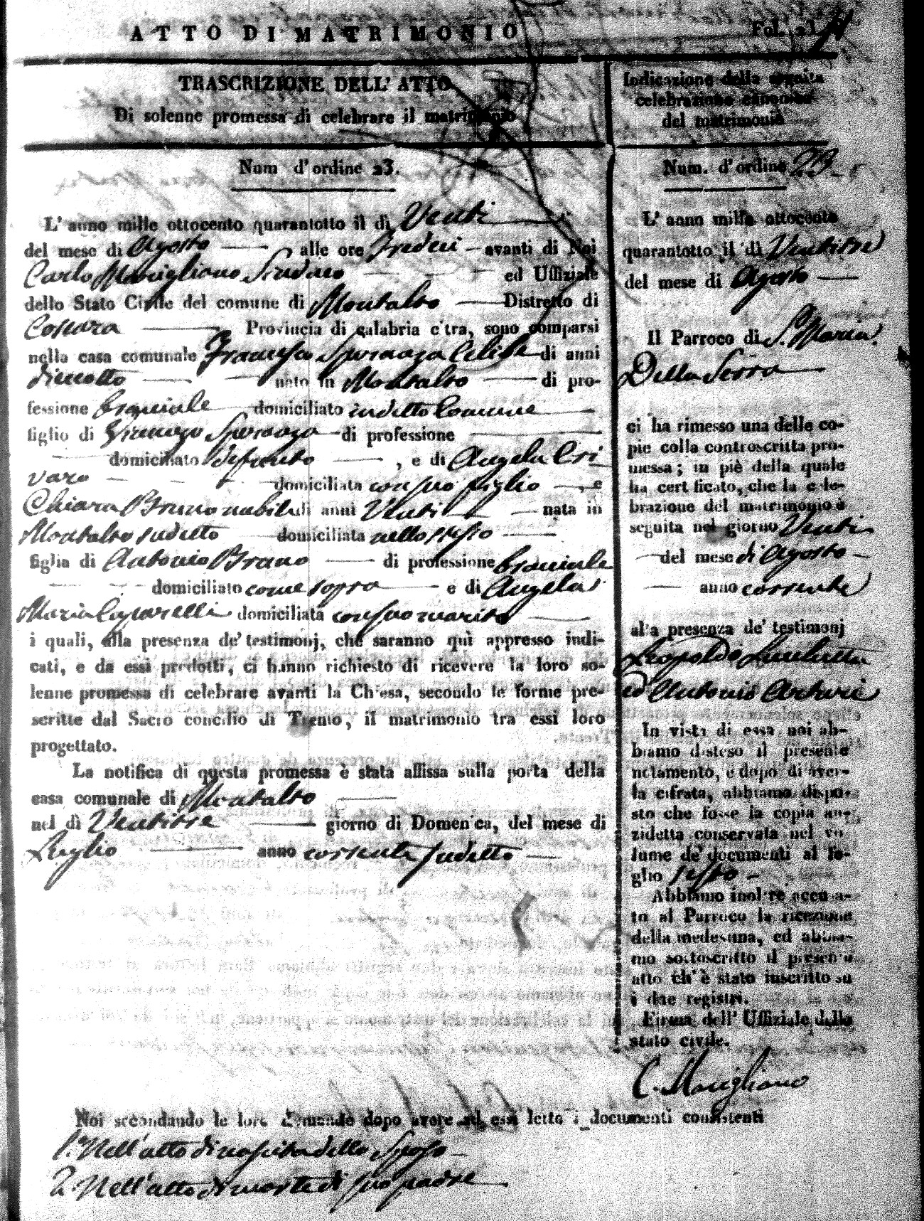 Here are the extractions for the marriage acts in 1848 for Montalto Uffugo. To save time we have only transcribed the names of the groom and bride. For more information, click on the groom's surname to view page 1 of the copy of the original document and his first name to view page 2.