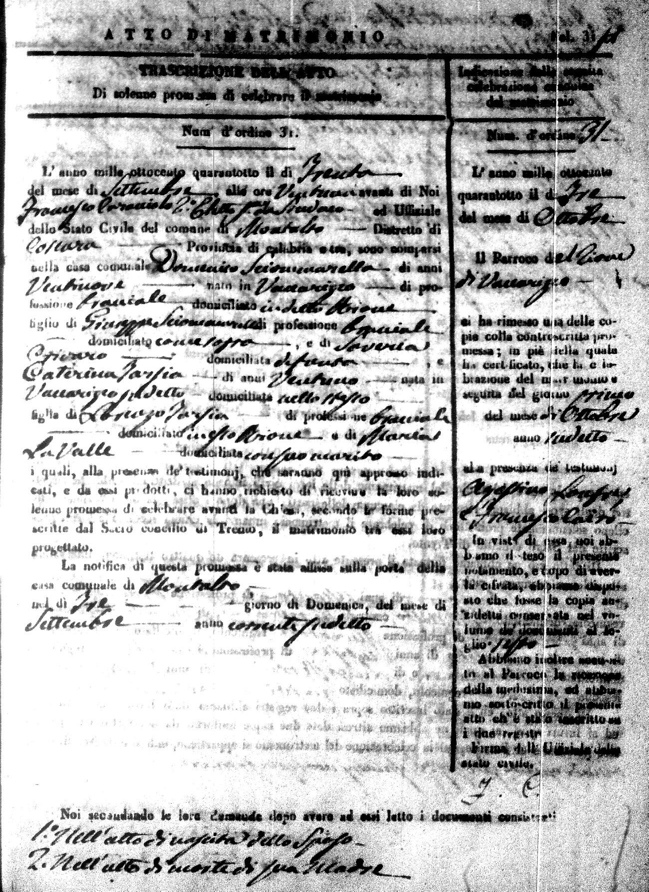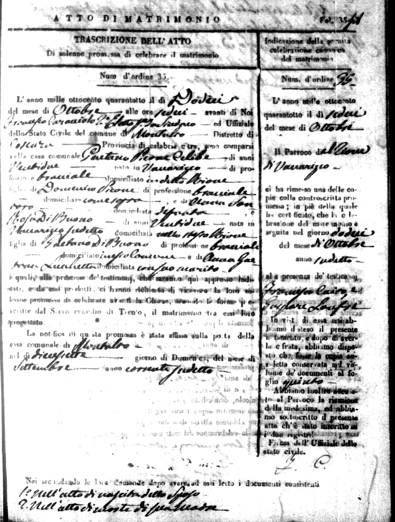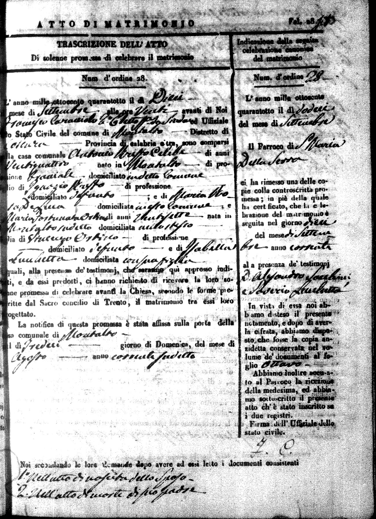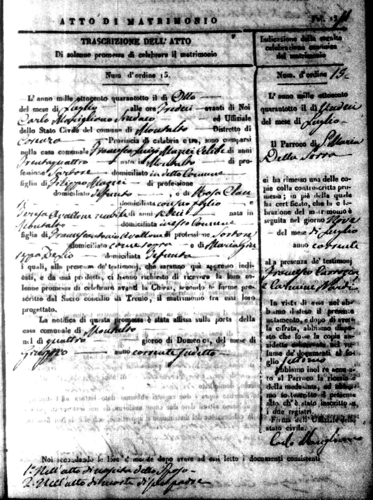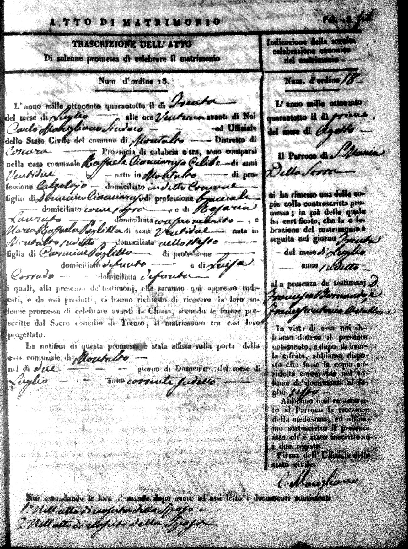 Here are the extractions for the marriage acts in 1848 for Montalto Uffugo. To save time we have only transcribed the names of the groom and bride. For more information, click on the groom's surname to view page 1 of the copy of the original document and his first name to view page 2.