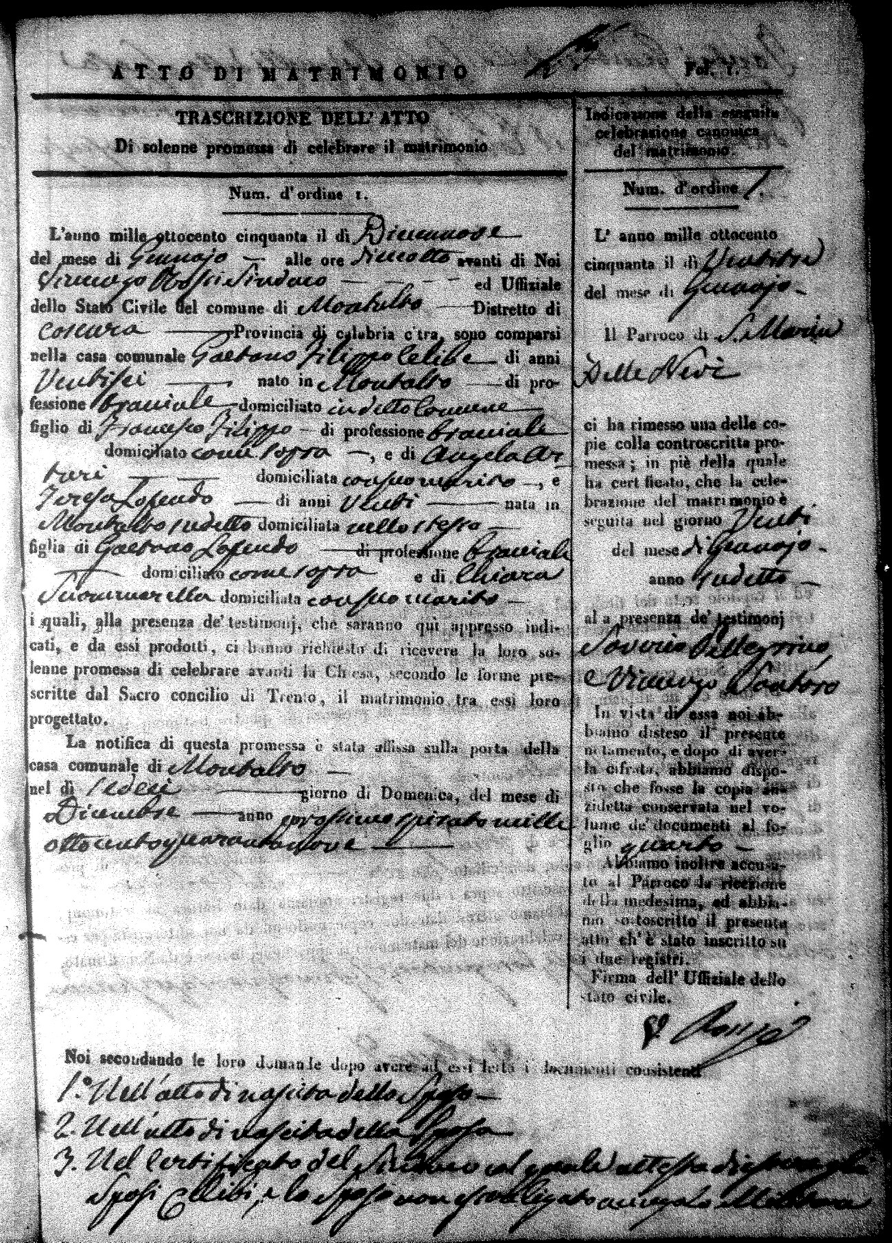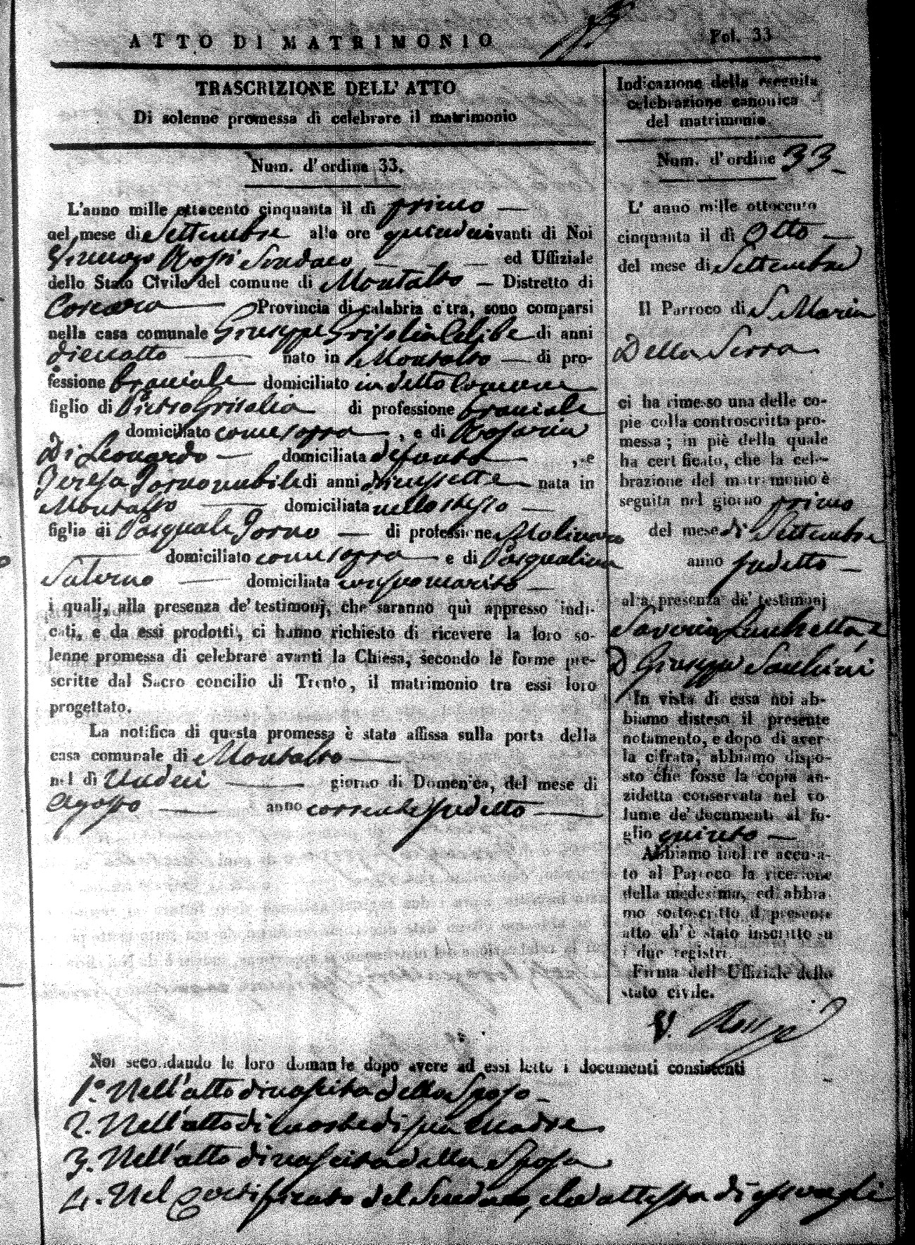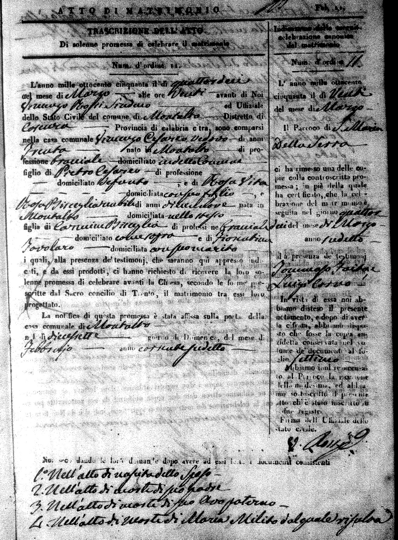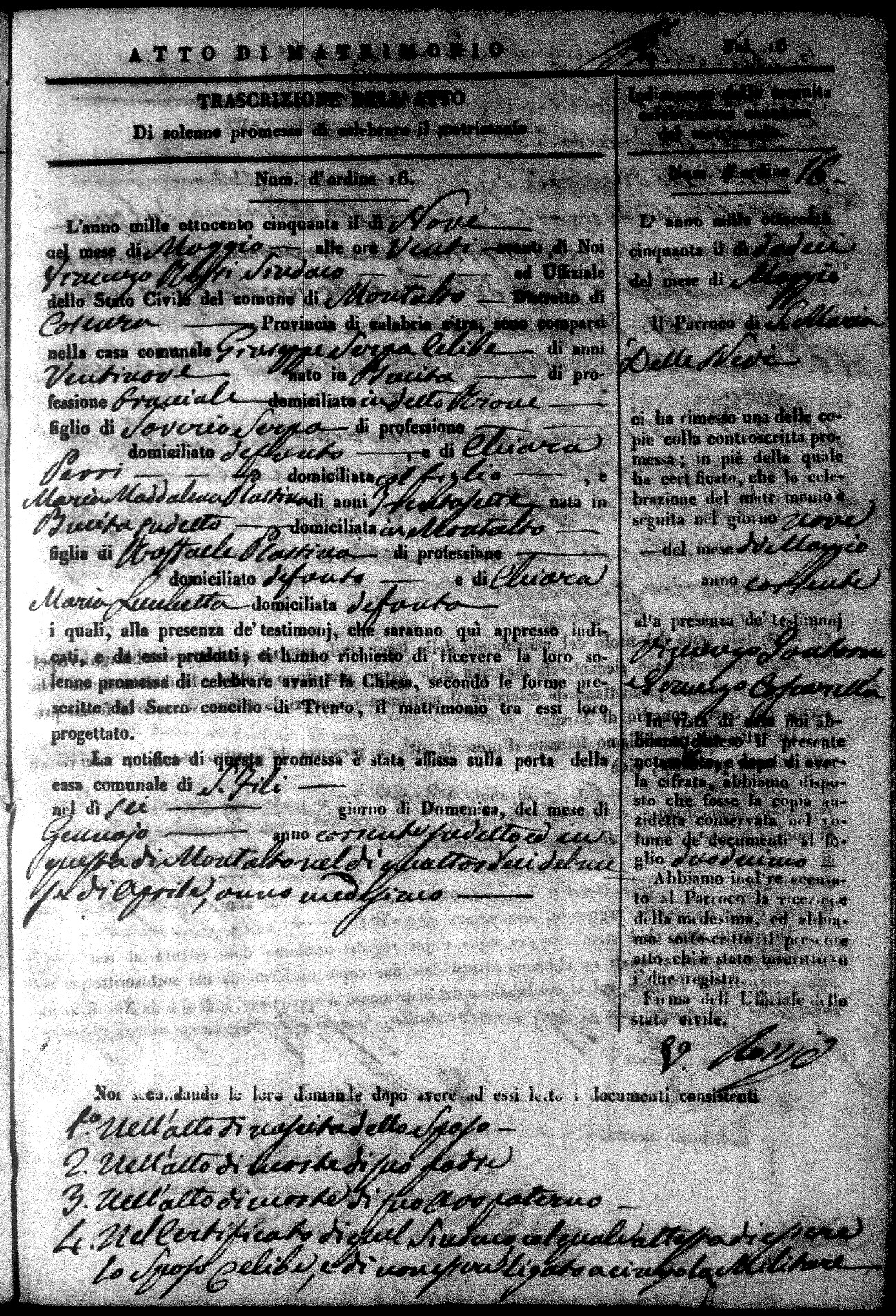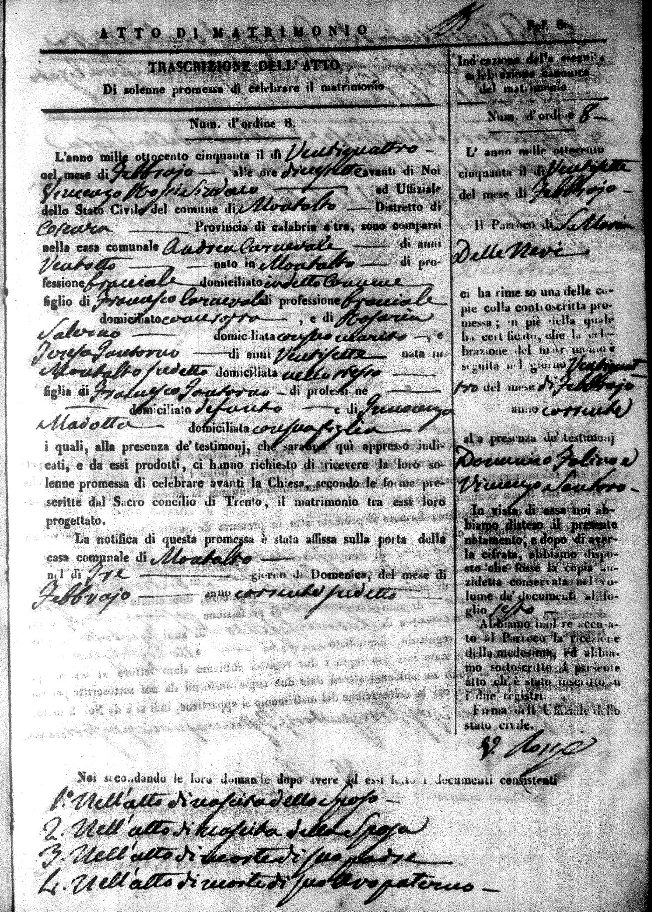 Here are the extractions for all the marriage acts in 1850 for Montalto Uffugo. For more information, click on the groom's surname to view a copy of the original document.