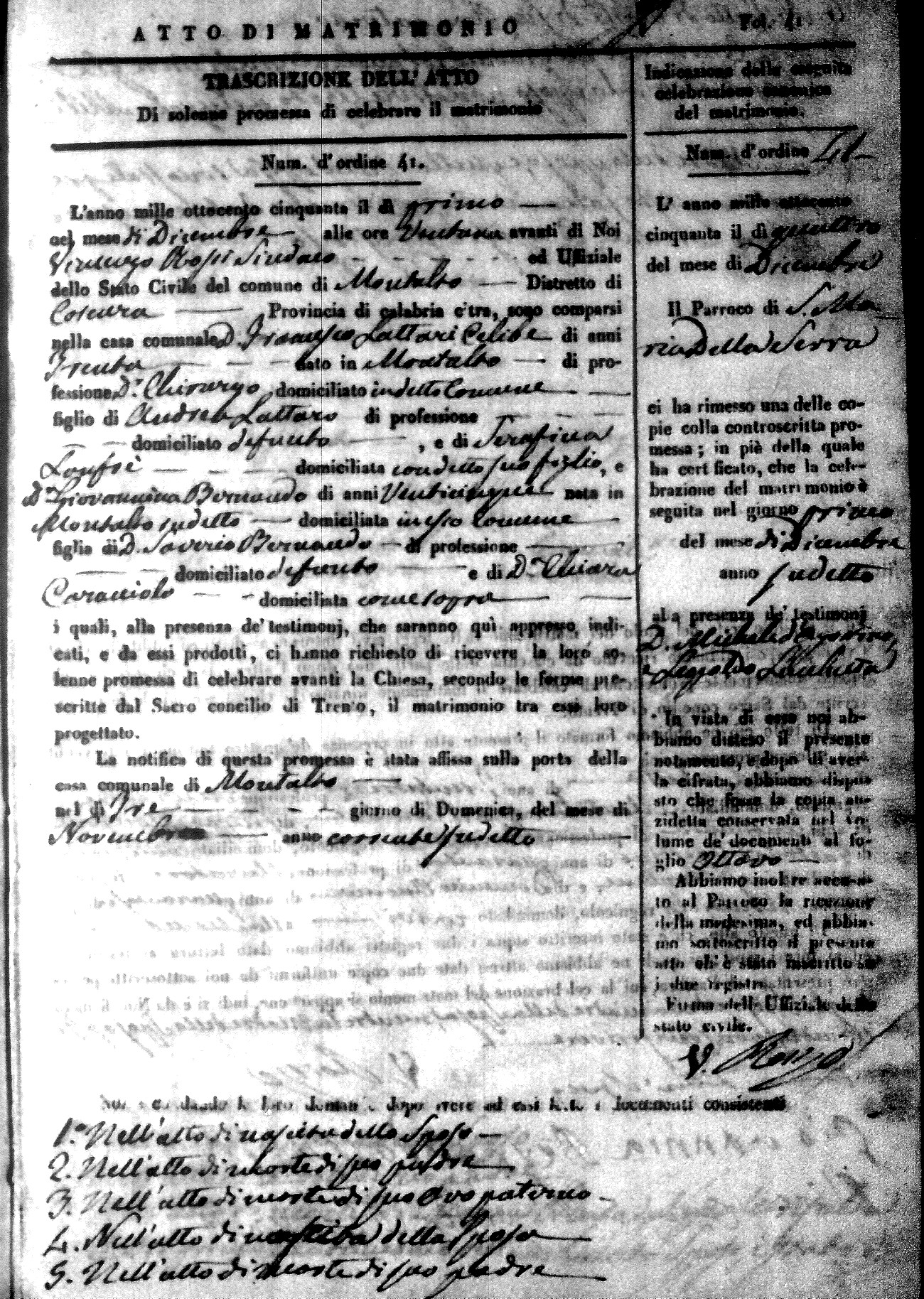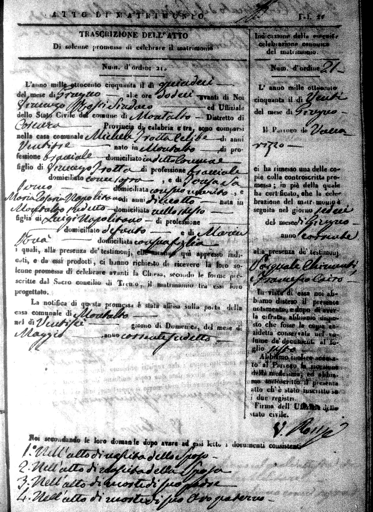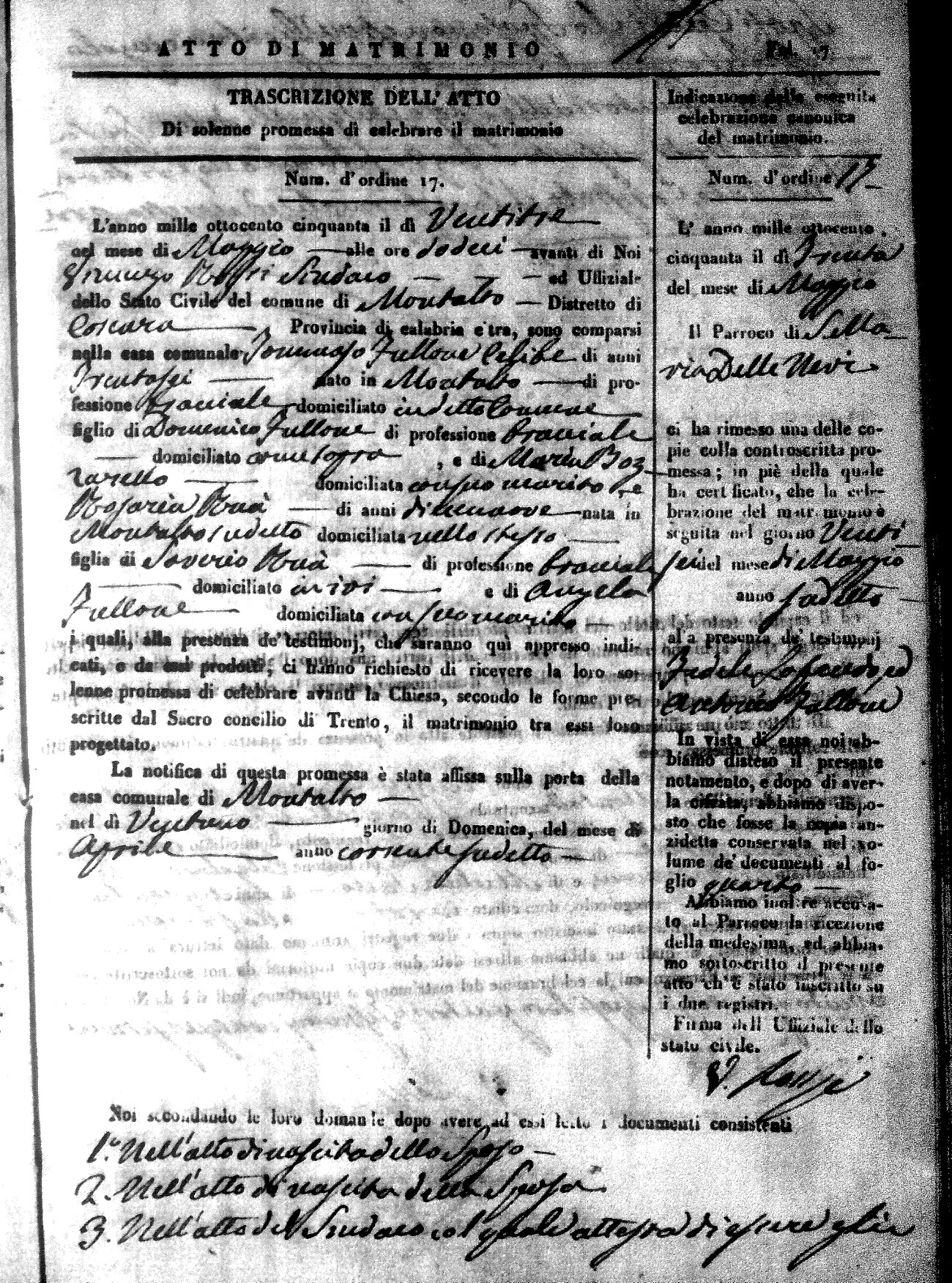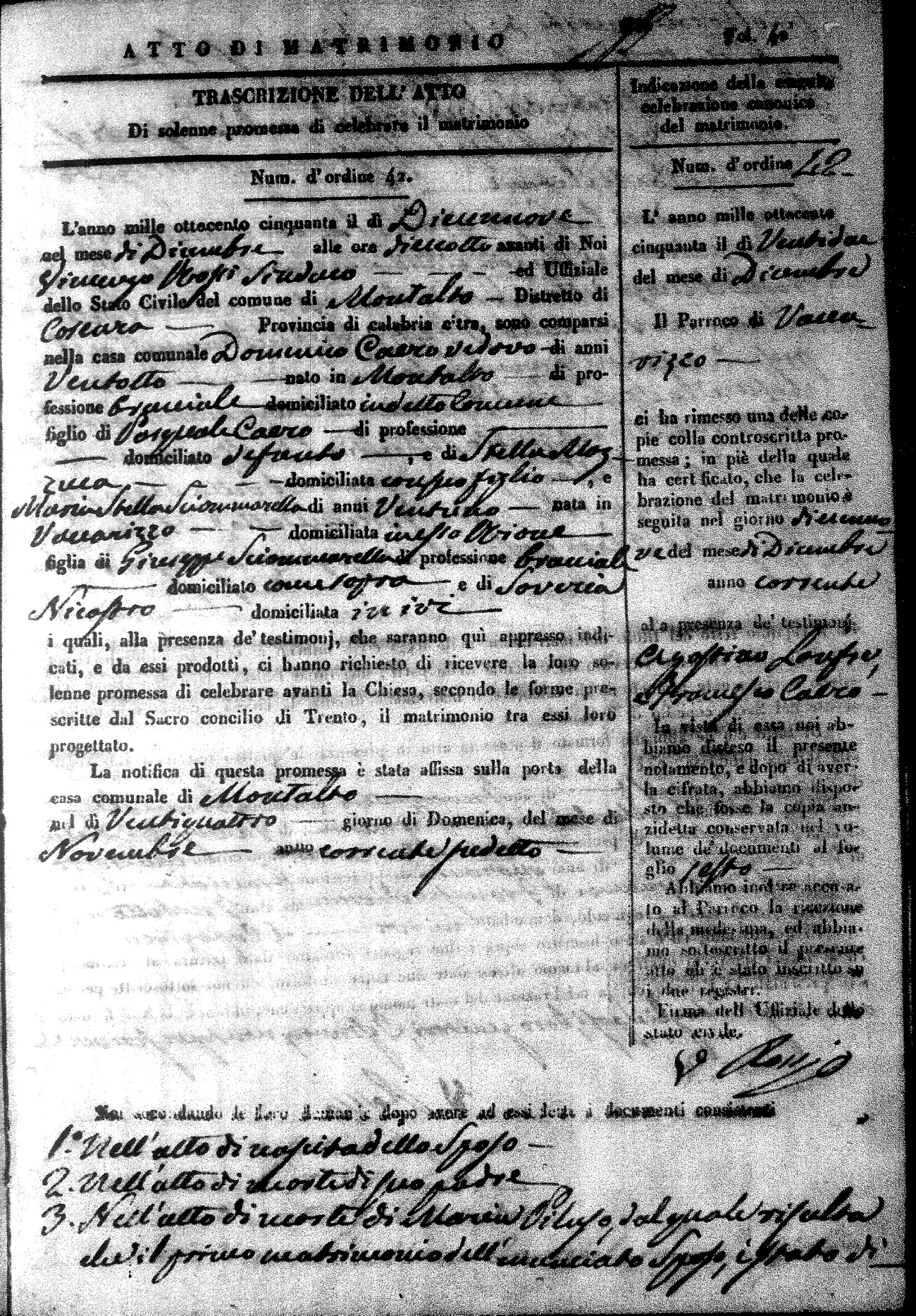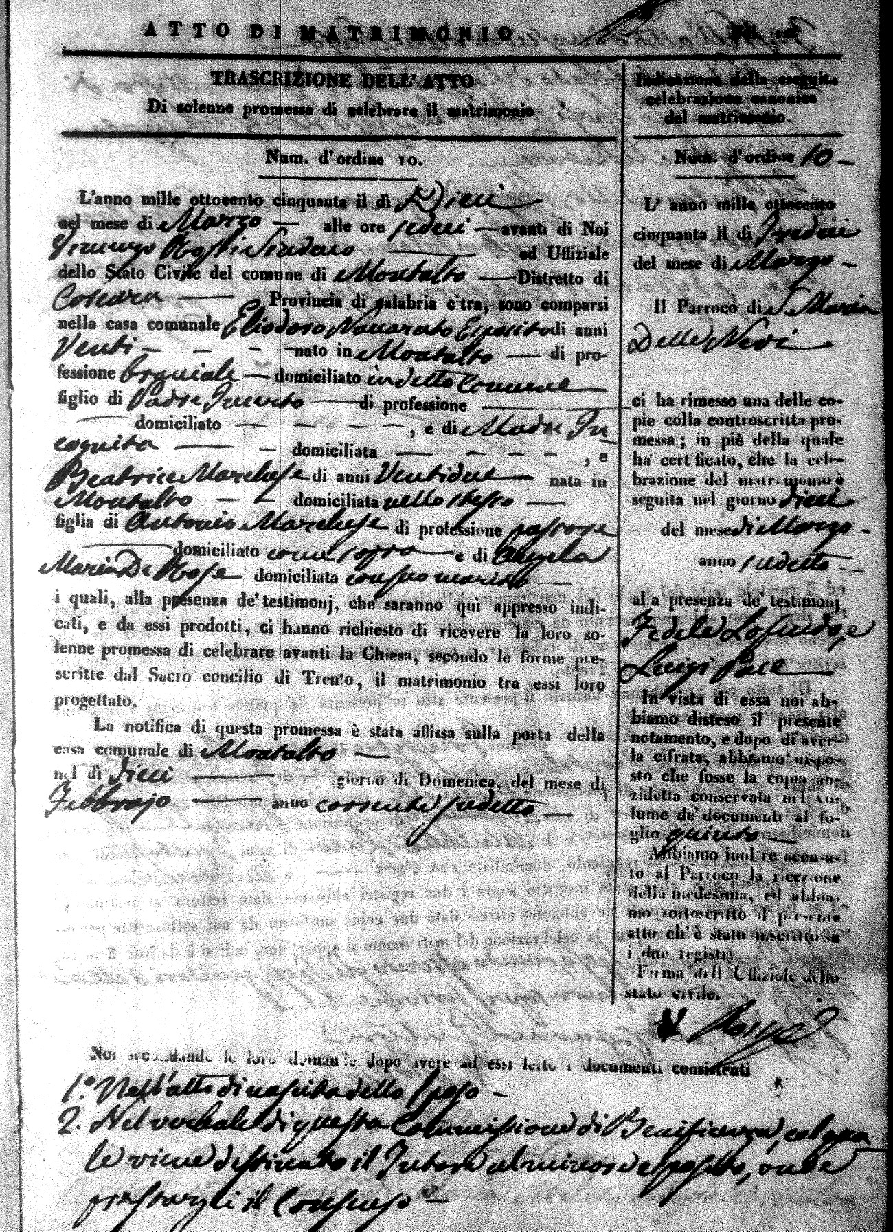 Here are the extractions for all the marriage acts in 1850 for Montalto Uffugo. For more information, click on the groom's surname to view a copy of the original document.