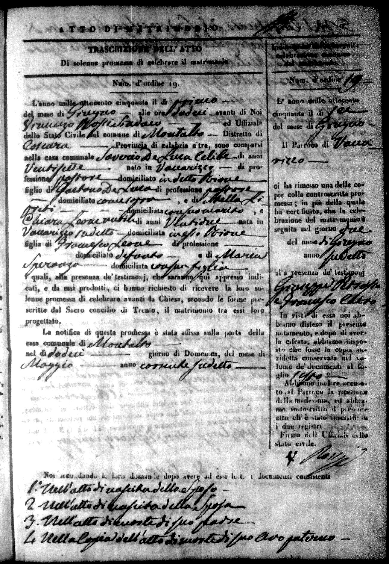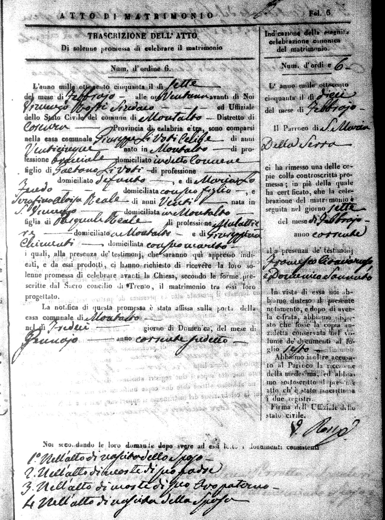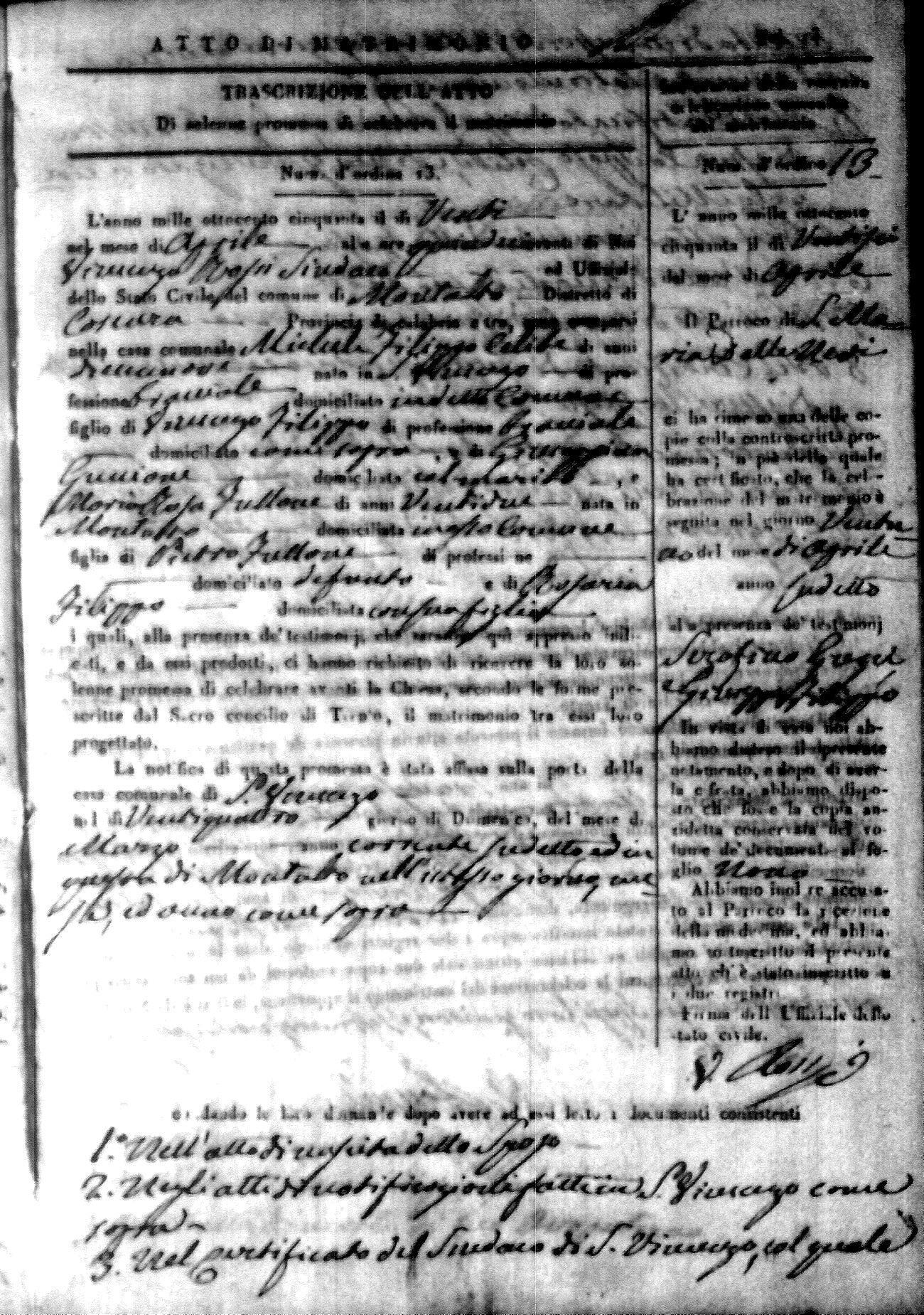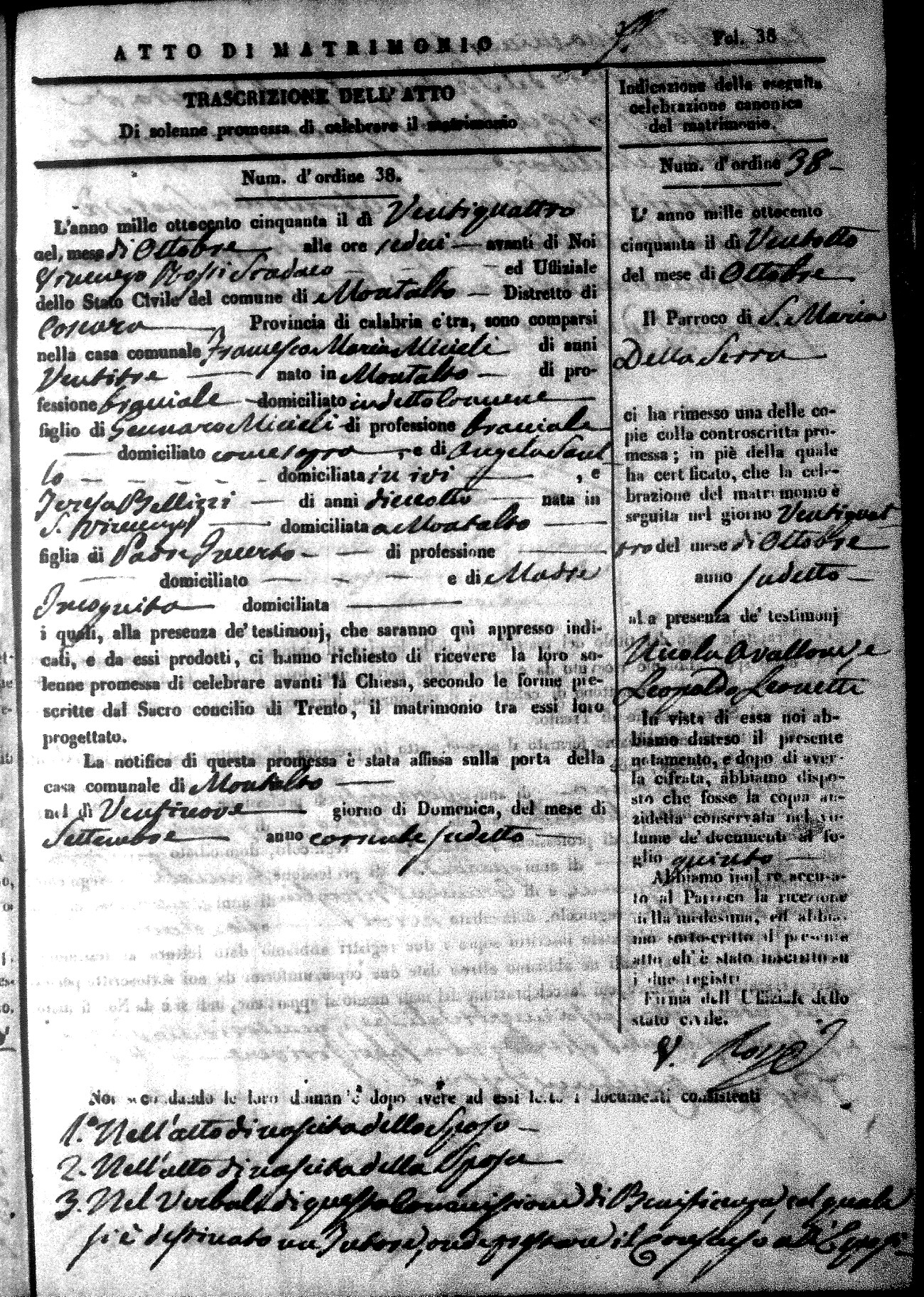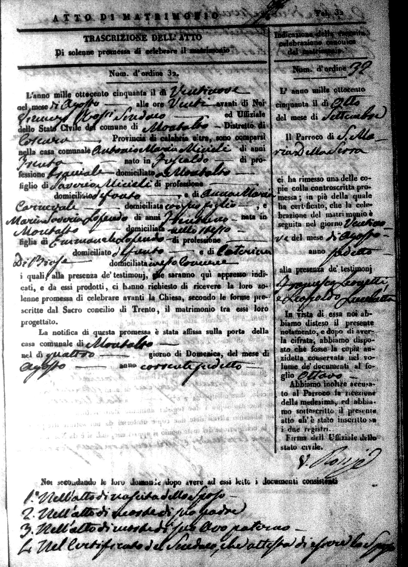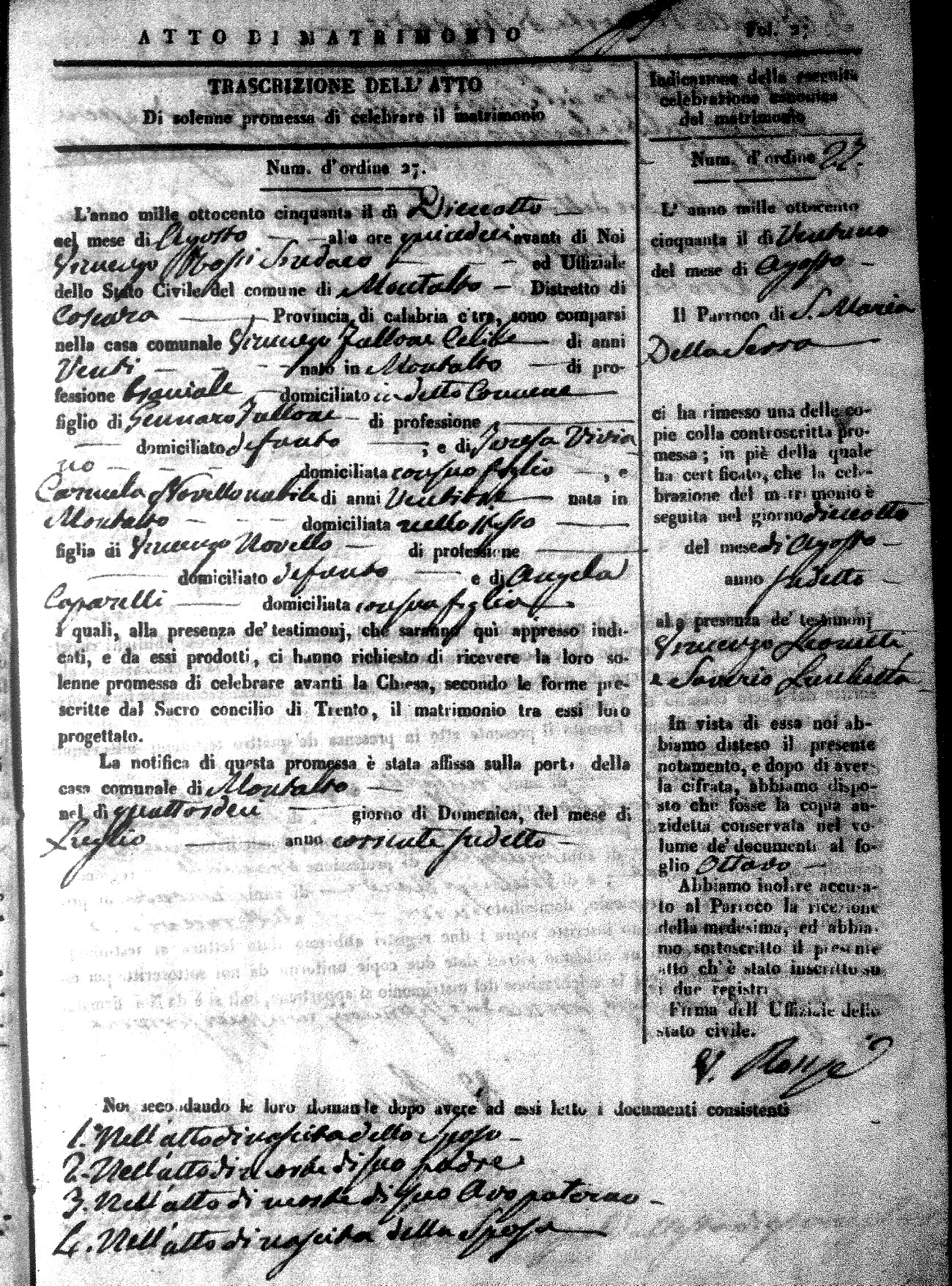 Here are the extractions for all the marriage acts in 1850 for Montalto Uffugo. For more information, click on the groom's surname to view a copy of the original document.