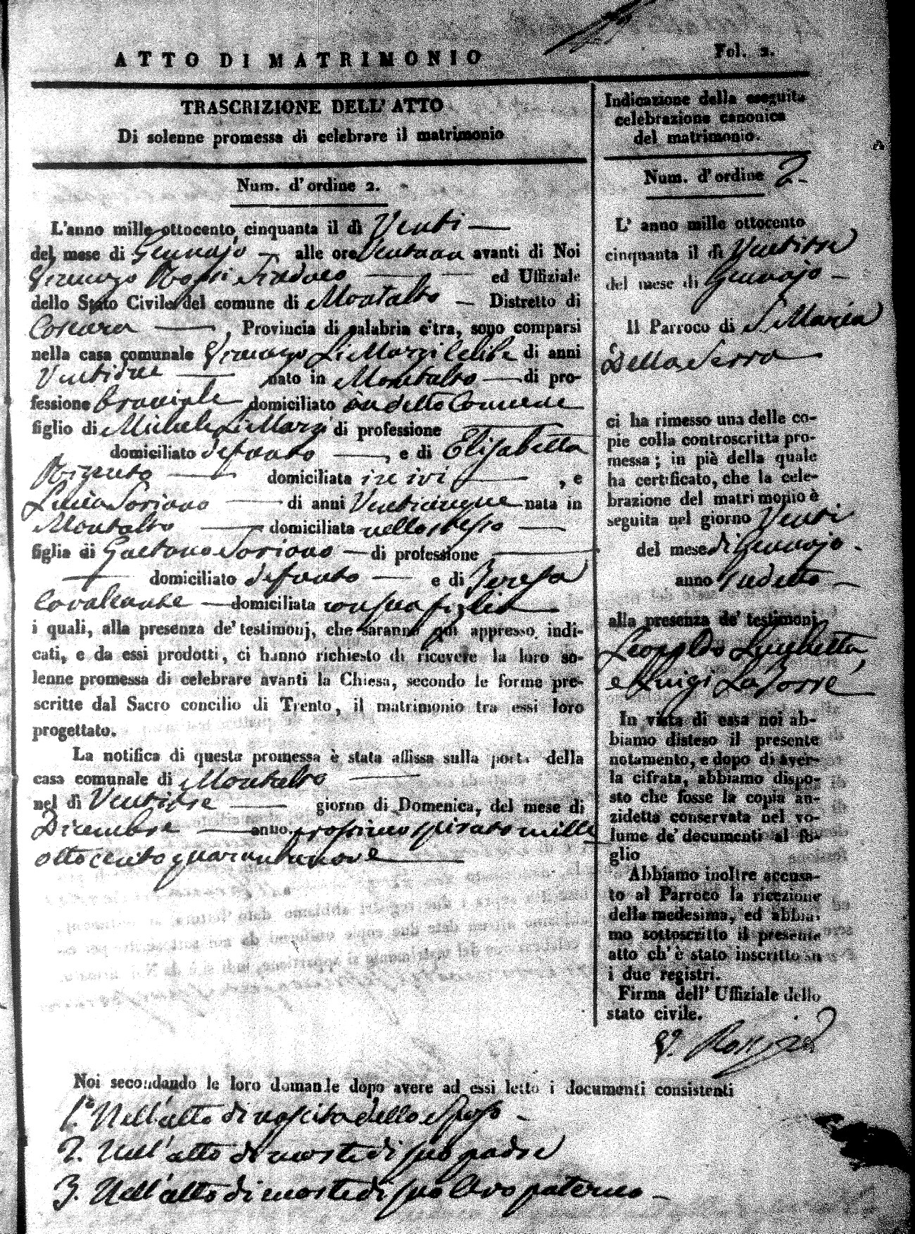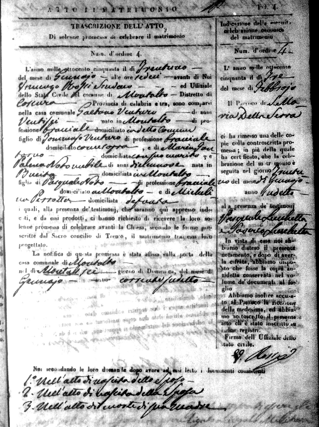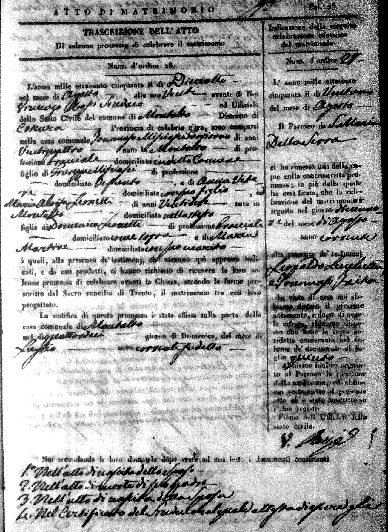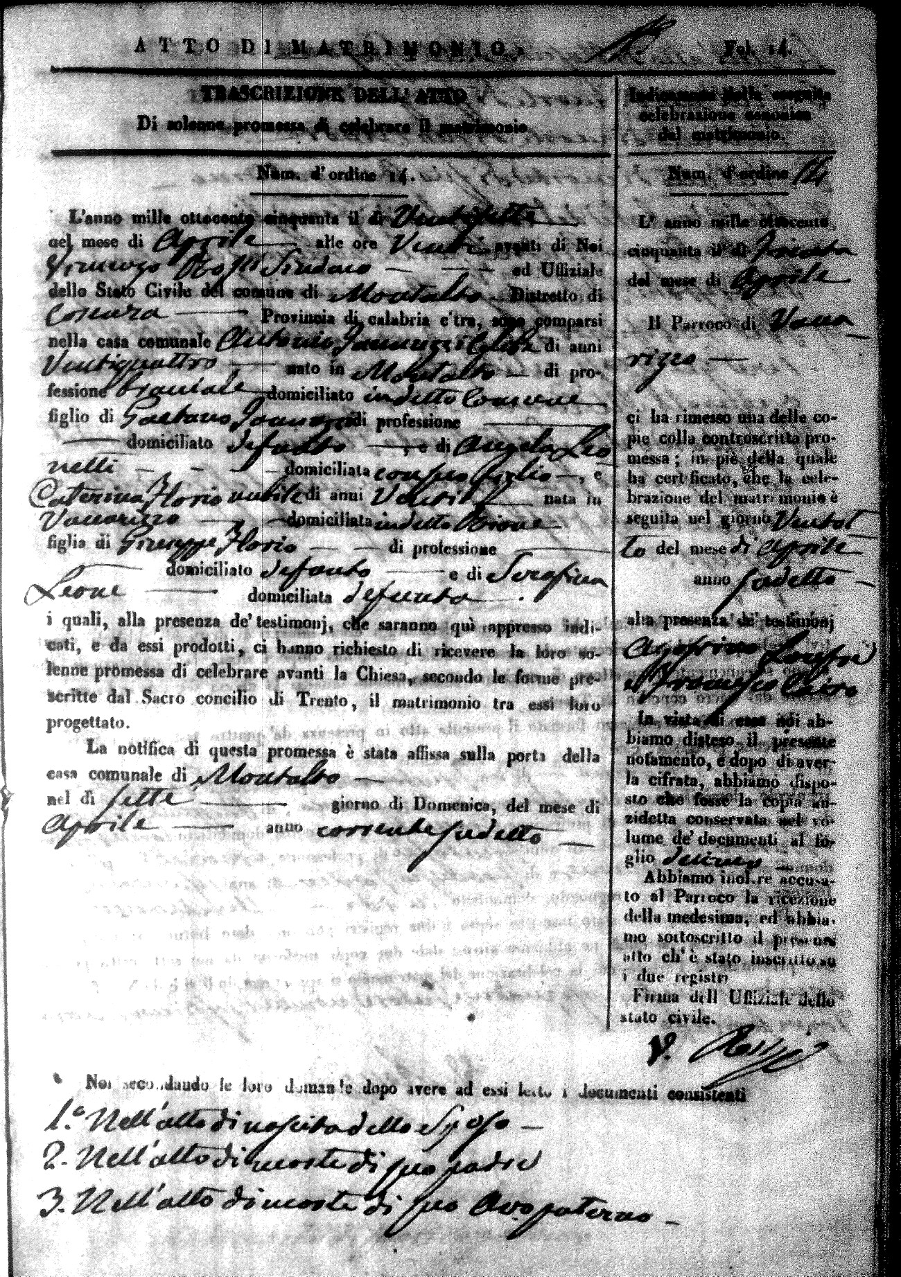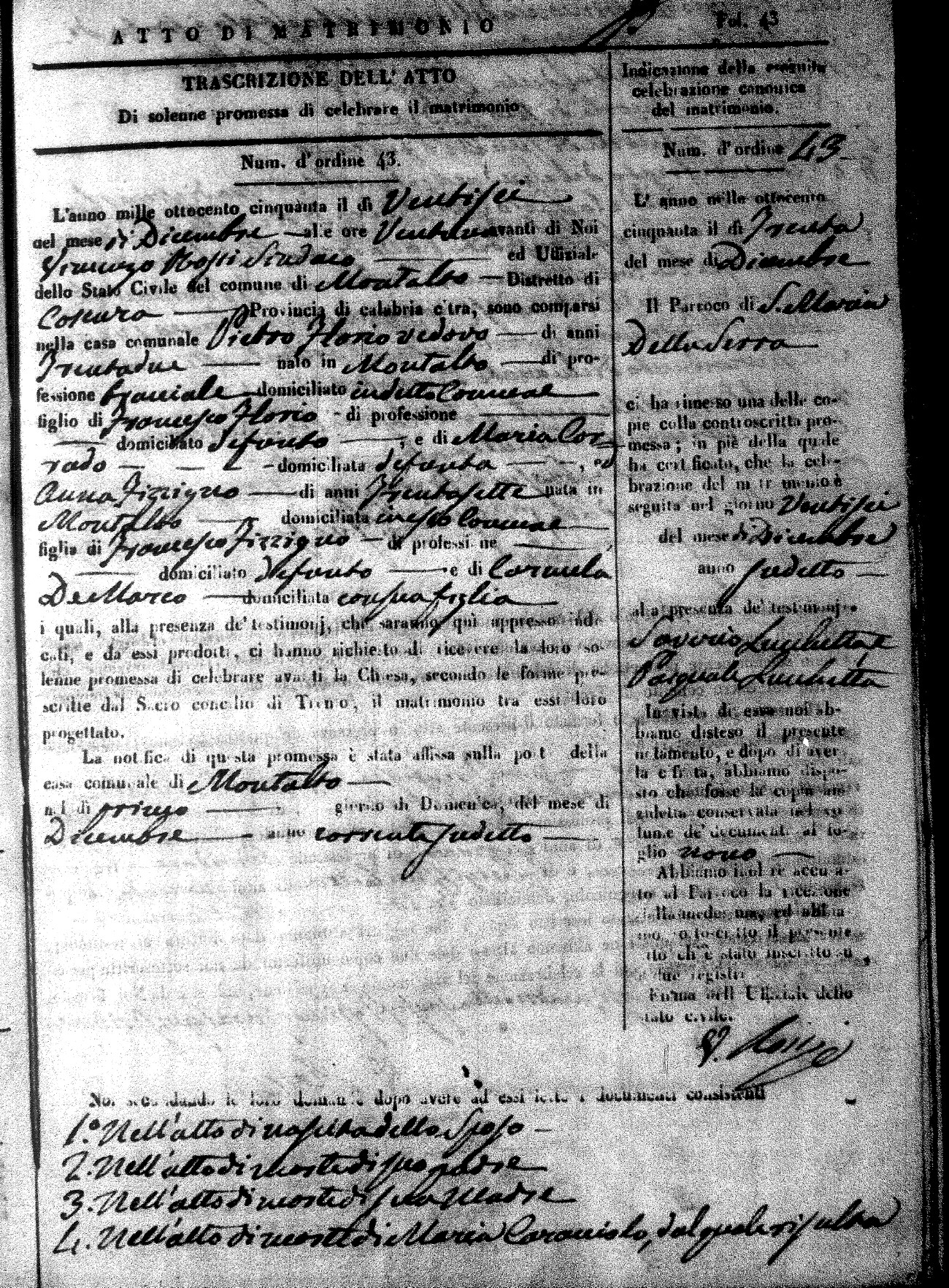 Here are the extractions for all the marriage acts in 1850 for Montalto Uffugo. For more information, click on the groom's surname to view a copy of the original document.