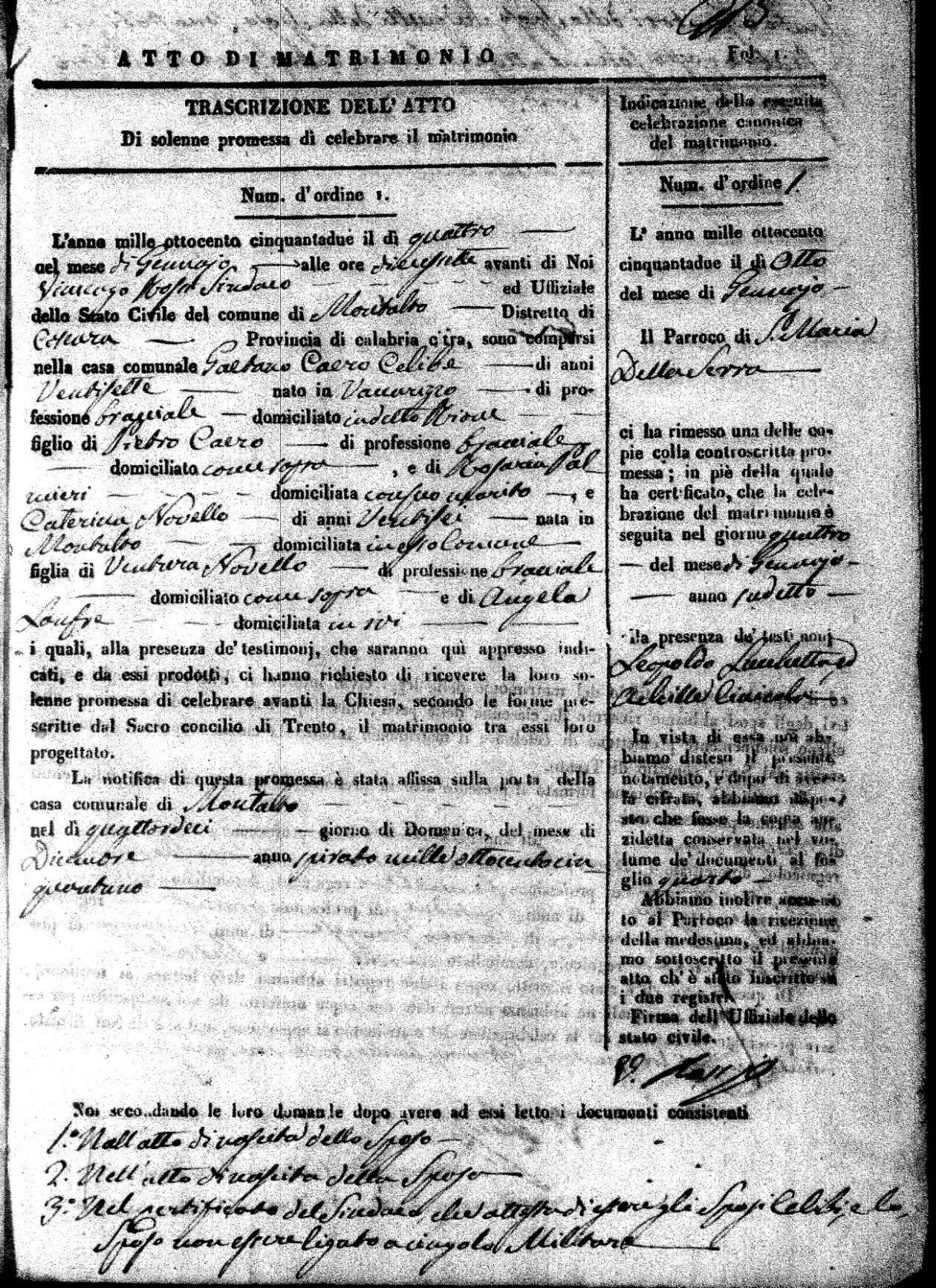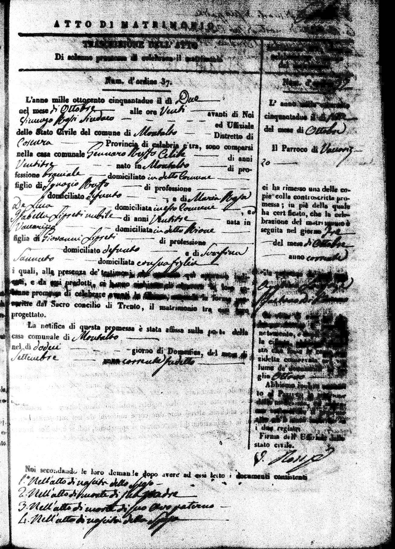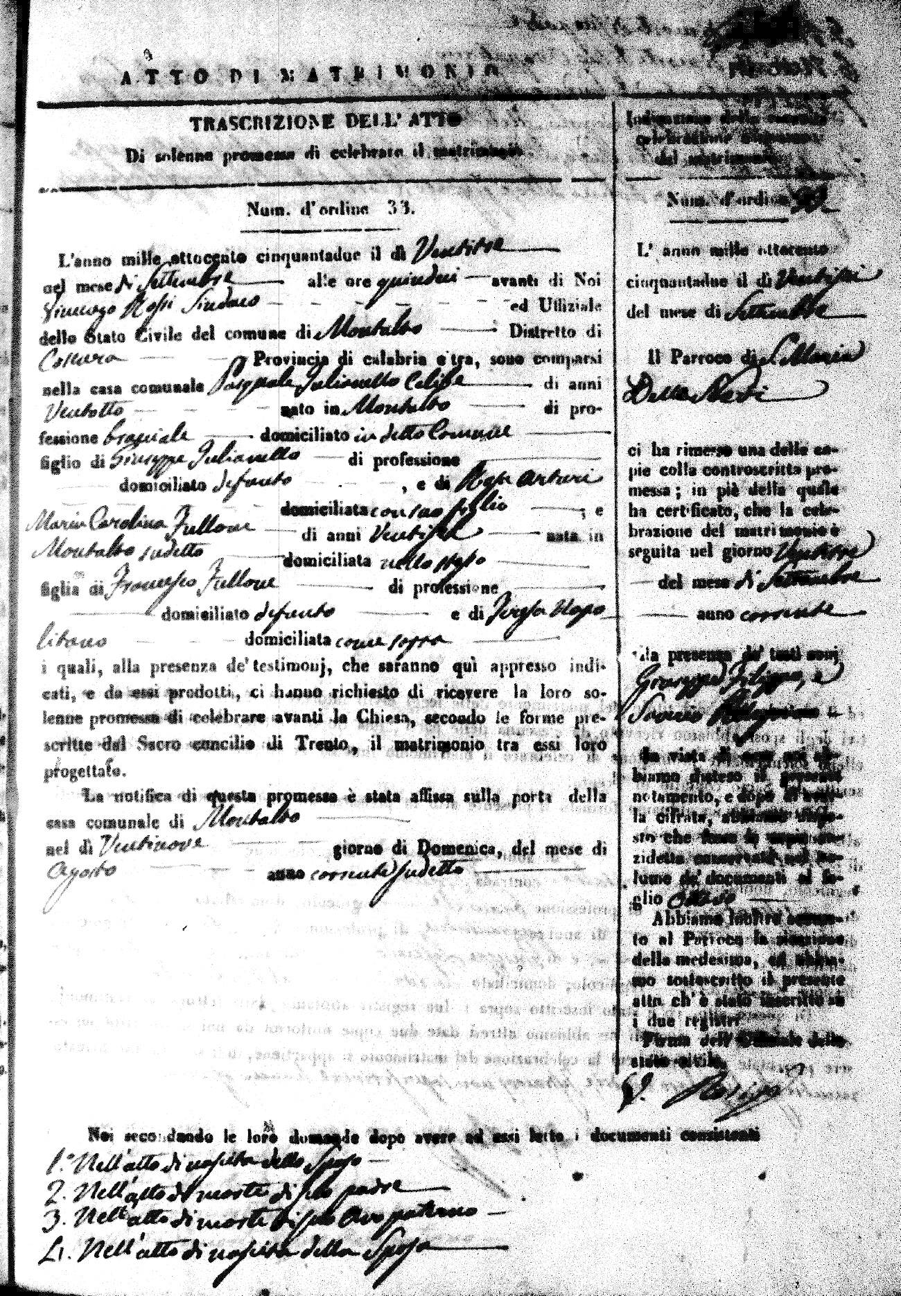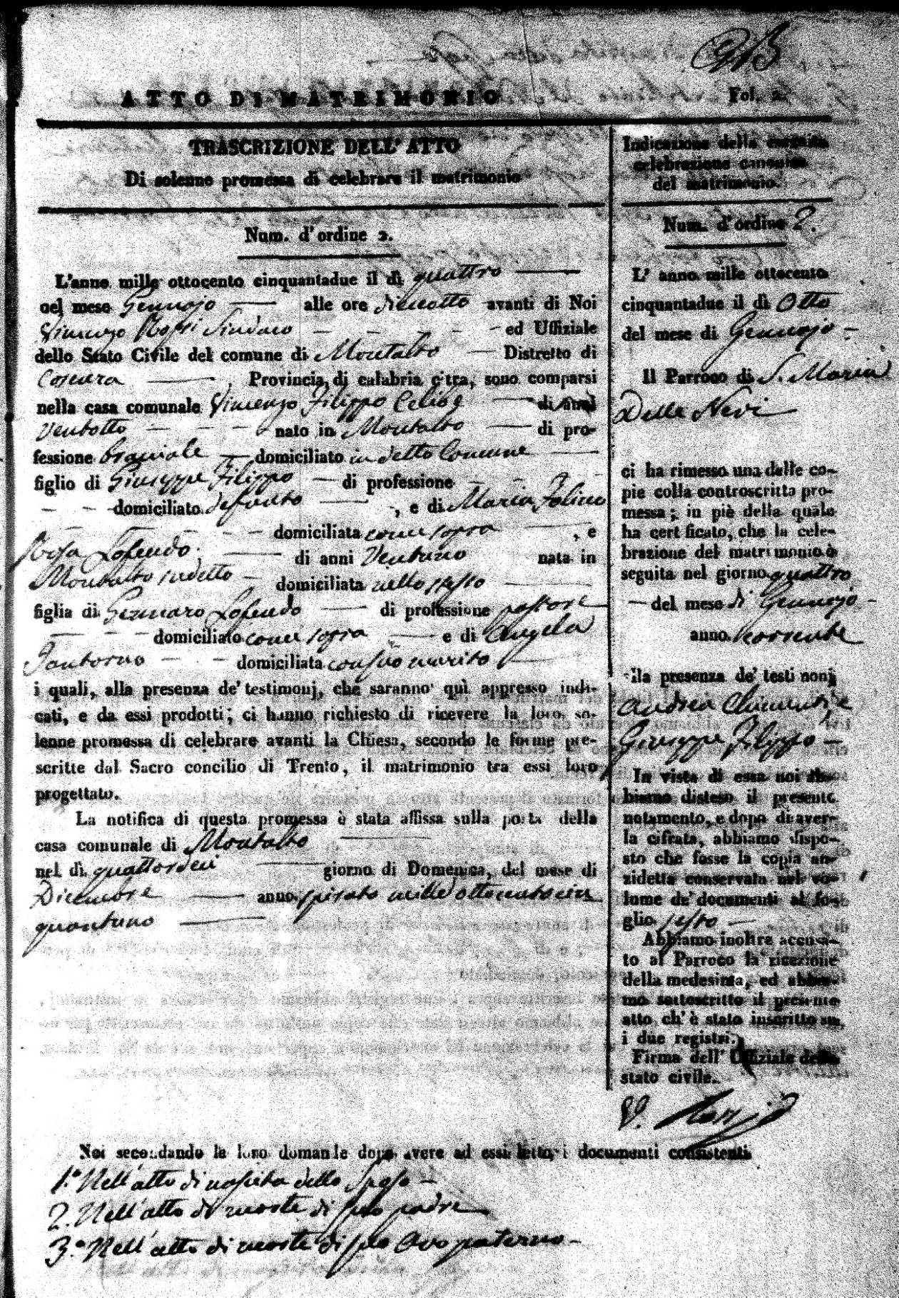 Here are the extractions for all the marriage acts in 1852 for Montalto Uffugo. For more information, click on the groom's surname to view a copy of the original document. Page 2 of the marriage record can be viewed by clicking on the groom's first name. If you see (fu) after a name, it means the person was deceased prior to the date of the marriage.